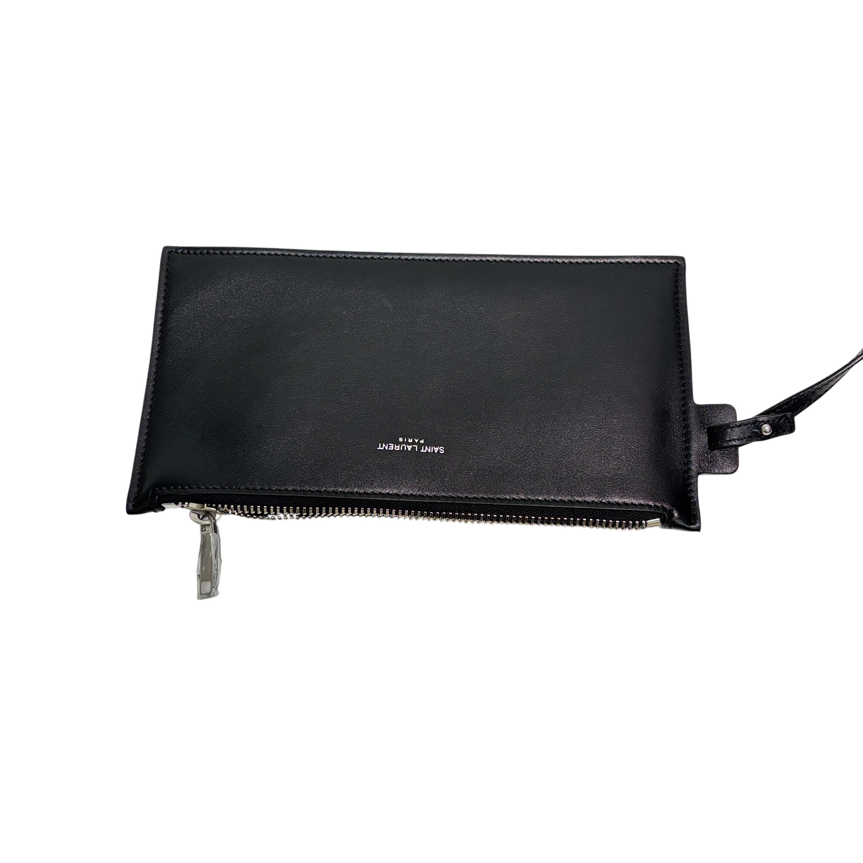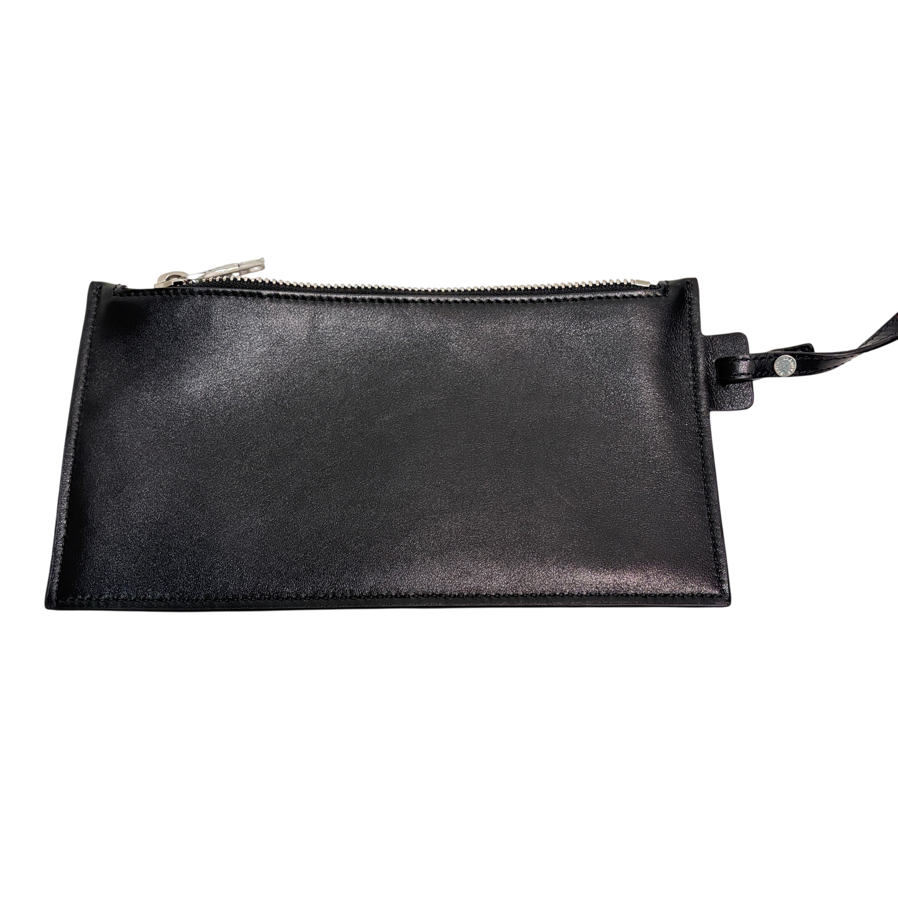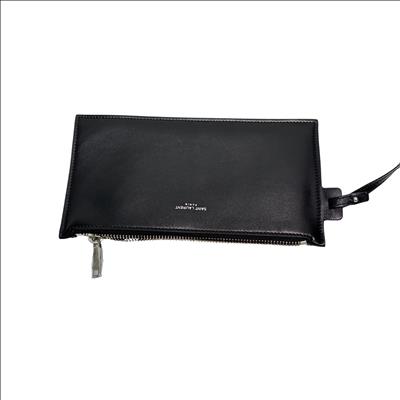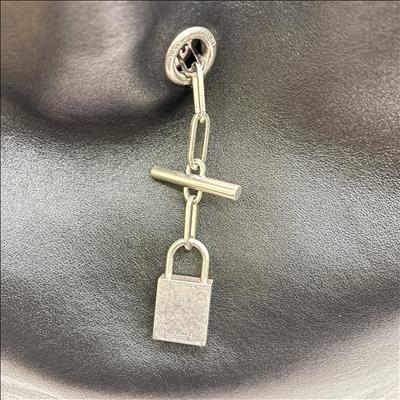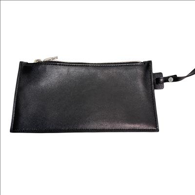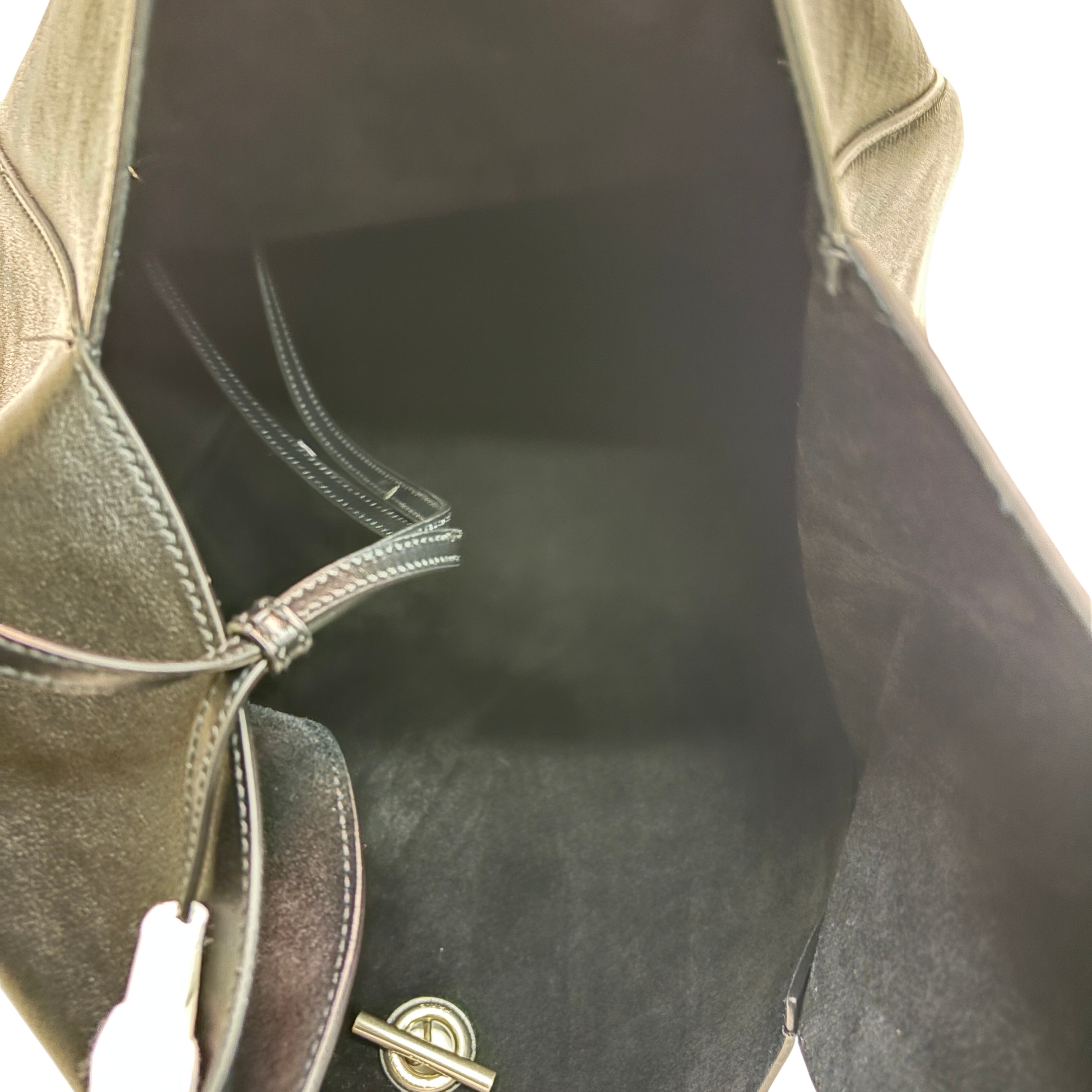A sleek black leather tote bag featuring a distinctive toggle and padlock closure for added security and style. Crafted from high-quality leather, this tote includes a removable zip pouch for versatile storage and comes with a branded dust bag for protection. Its spacious design and elegant finish make it an ideal accessory for everyday use or sophisticated occasions, combining functionality with luxury.