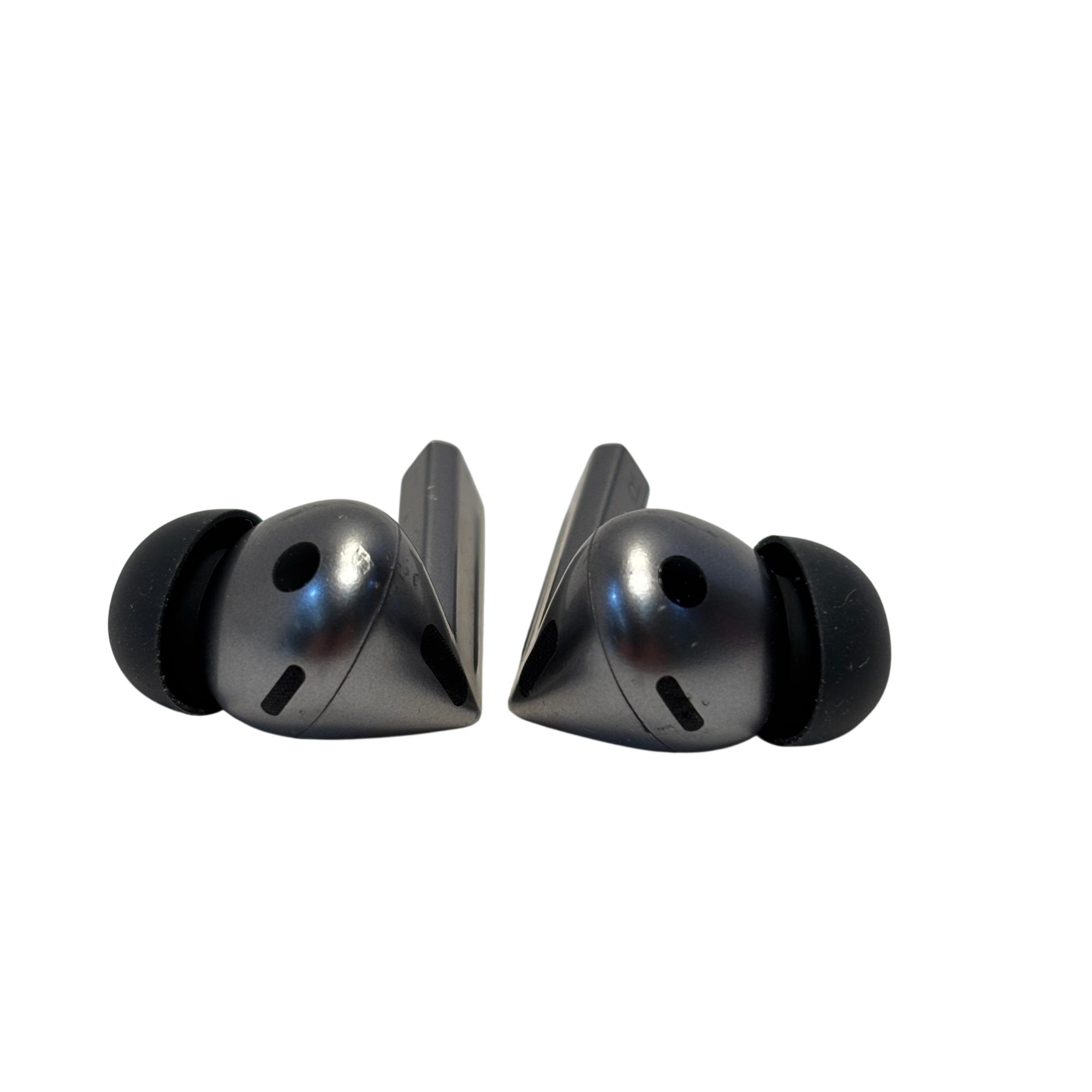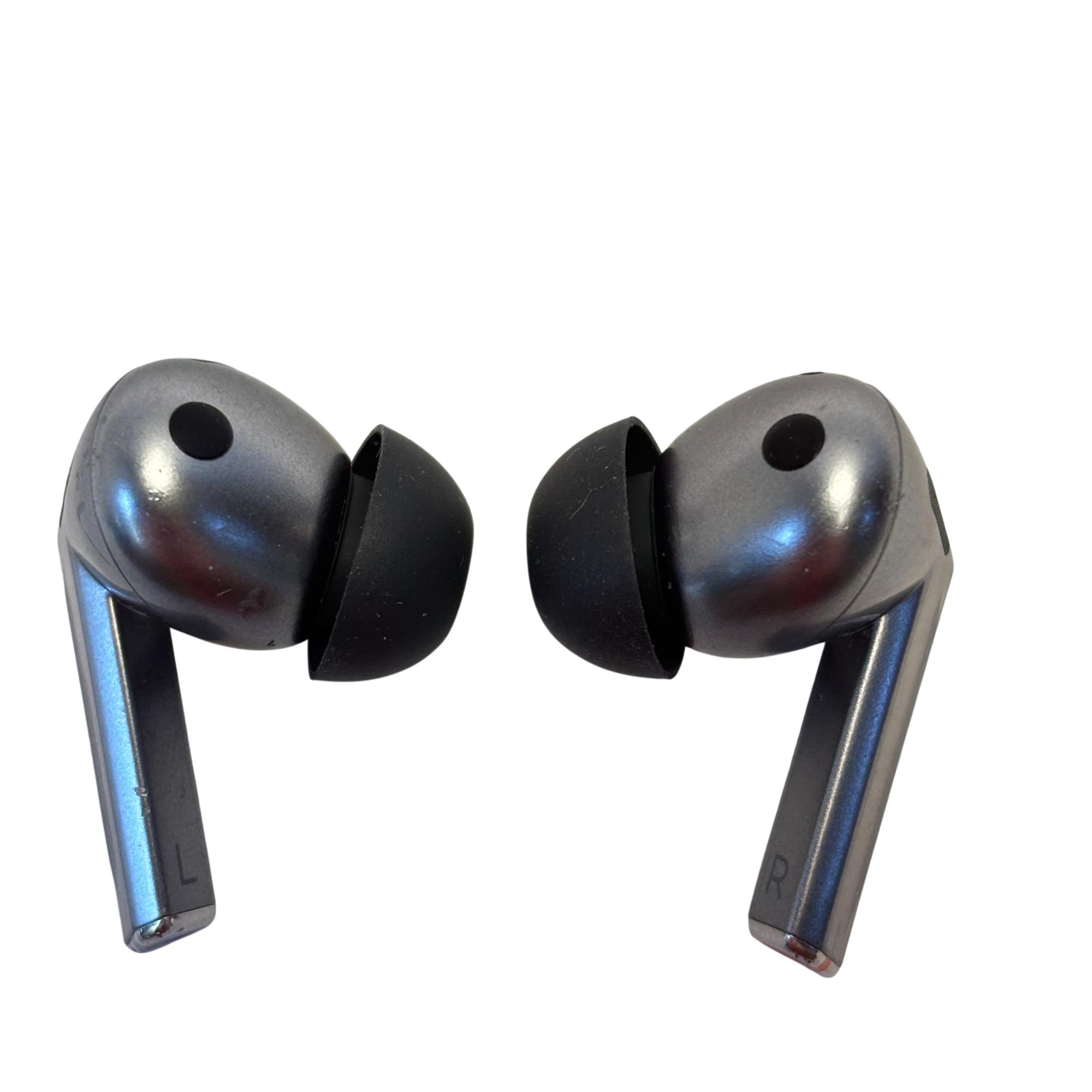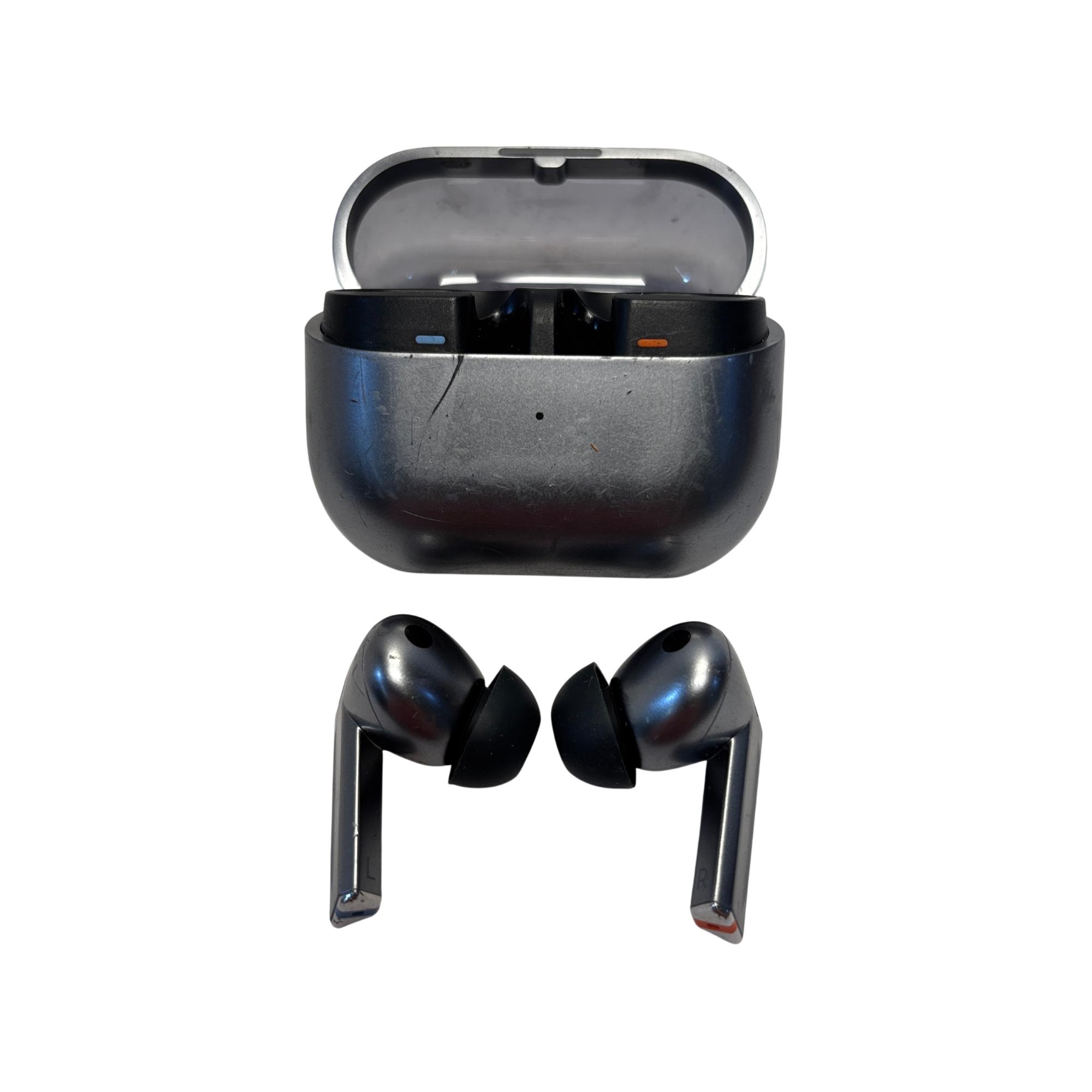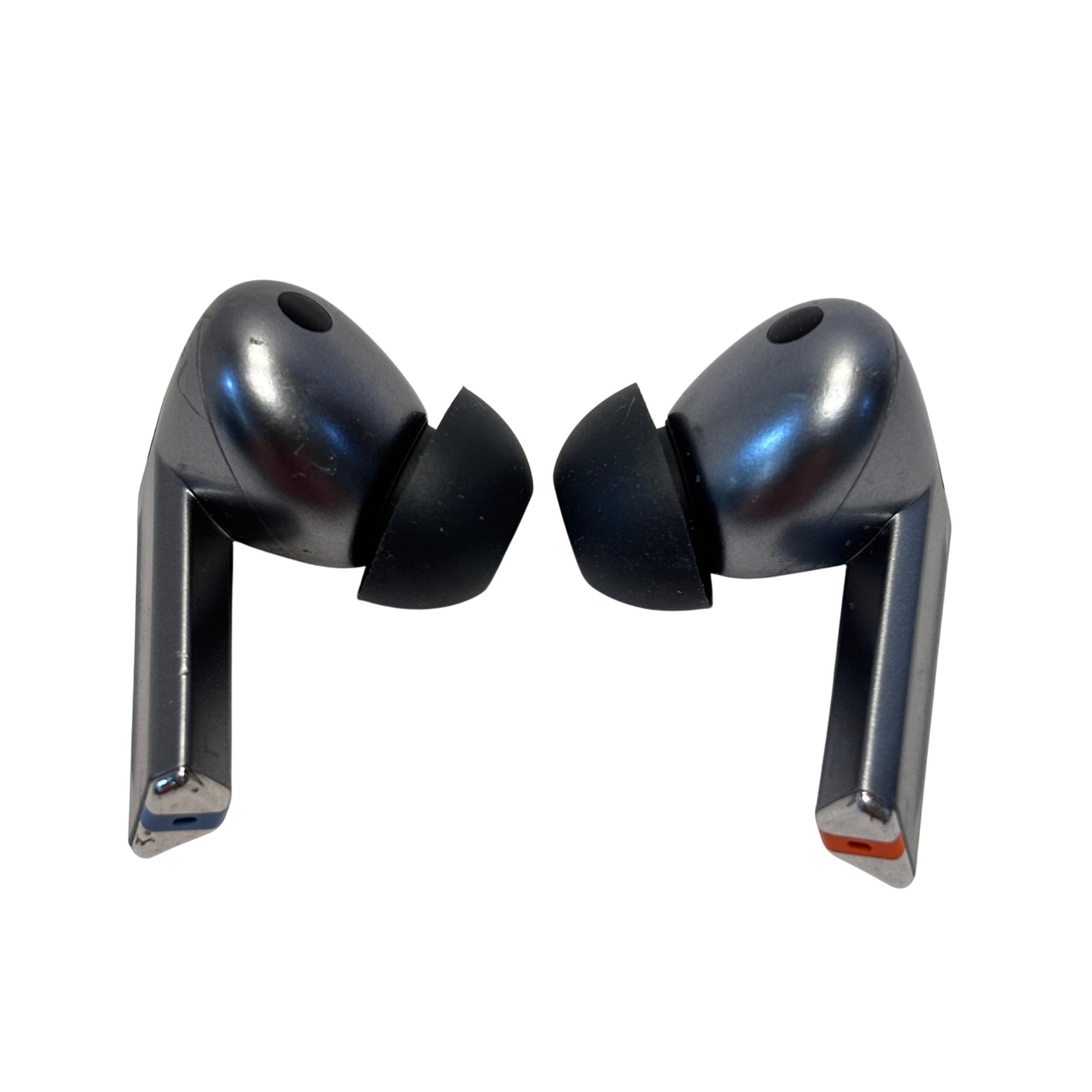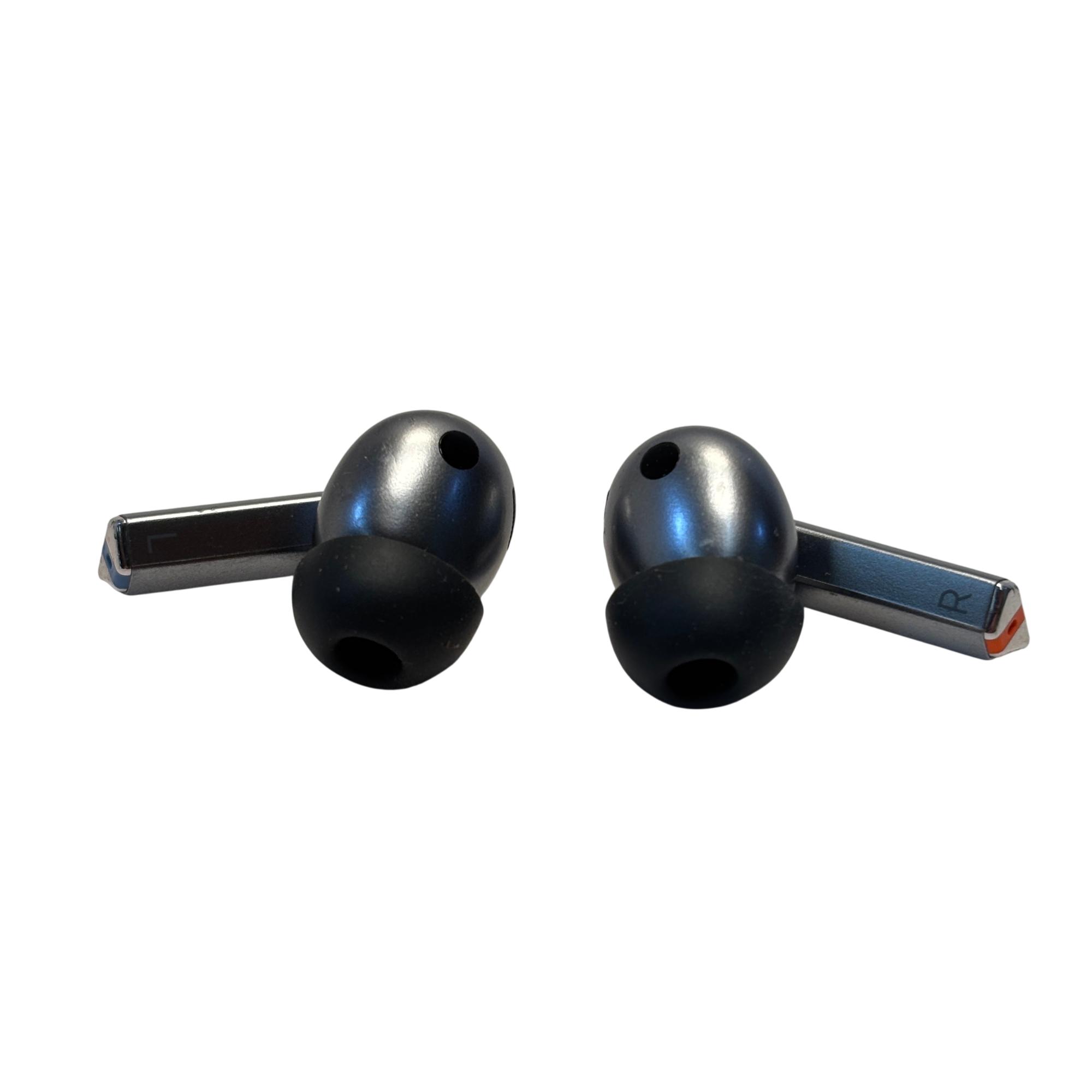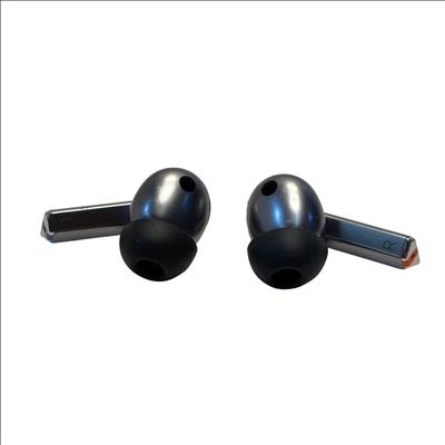 The Samsung Galaxy Buds3 Pro wireless Bluetooth earbuds deliver high-quality sound with advanced active noise cancellation technology. Featuring a sleek black and silver design, these earbuds provide a comfortable, secure fit and seamless connectivity for an immersive audio experience on the go.