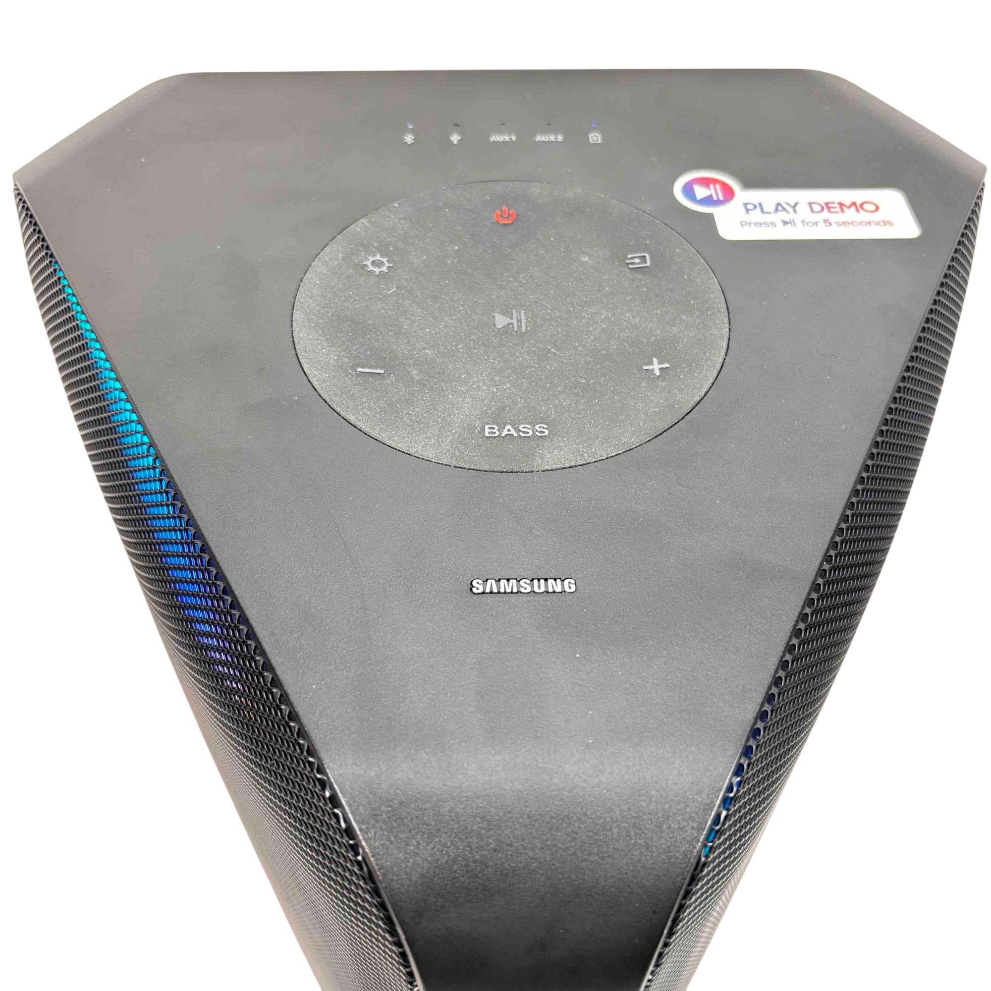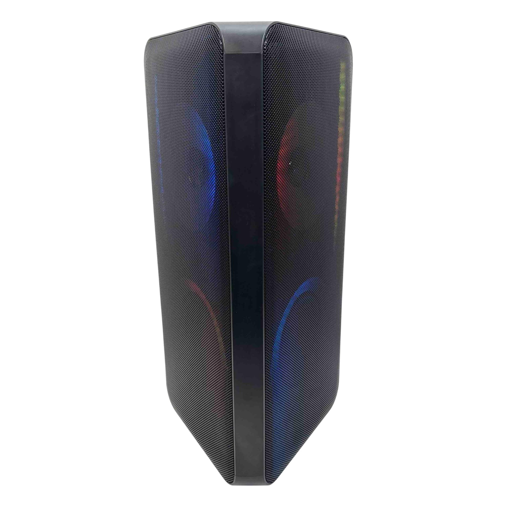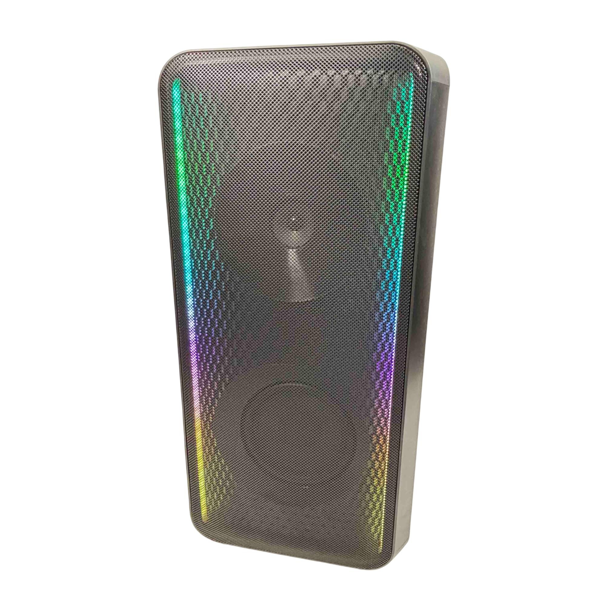 Elevate your parties with the Samsung MX-ST50B/ZA Sound Tower, a powerful 240W portable Bluetooth speaker. Featuring vibrant rainbow LED lights and an impressive built-in battery, this speaker delivers dynamic sound and a visually captivating experience, perfect for any event.