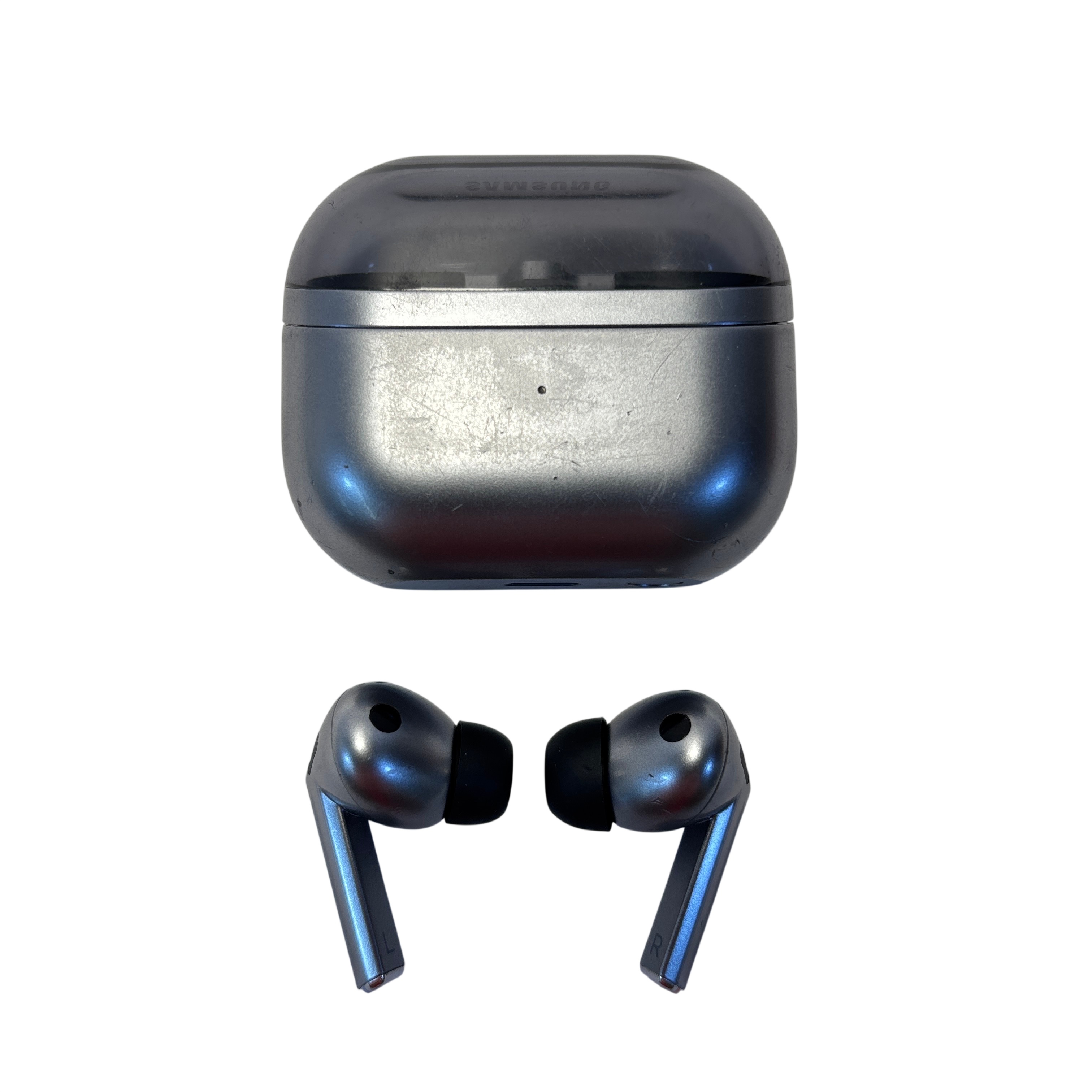 Samsung SMR630 True Wireless Earbuds offer a compact and stylish audio solution with a metallic gray finish and comfortable in-ear silicone tips. These Bluetooth-enabled earbuds come with a portable charging case, providing convenient storage and power on the go. Ideal for hands-free calls and music listening, the SMR630 delivers clear sound and a secure fit for daily use. The lightweight design and included charging case make these earbuds perfect for travel and active lifestyles.