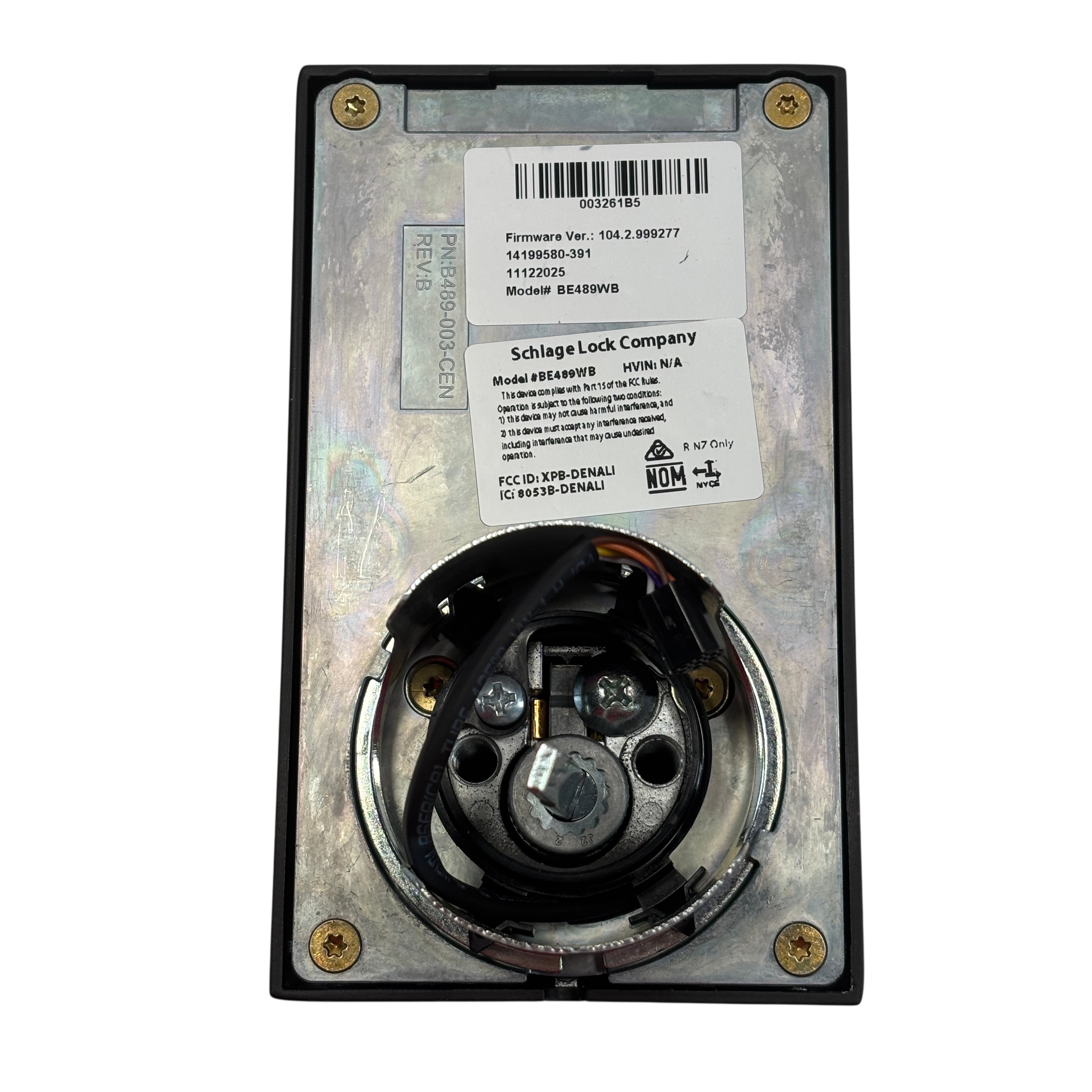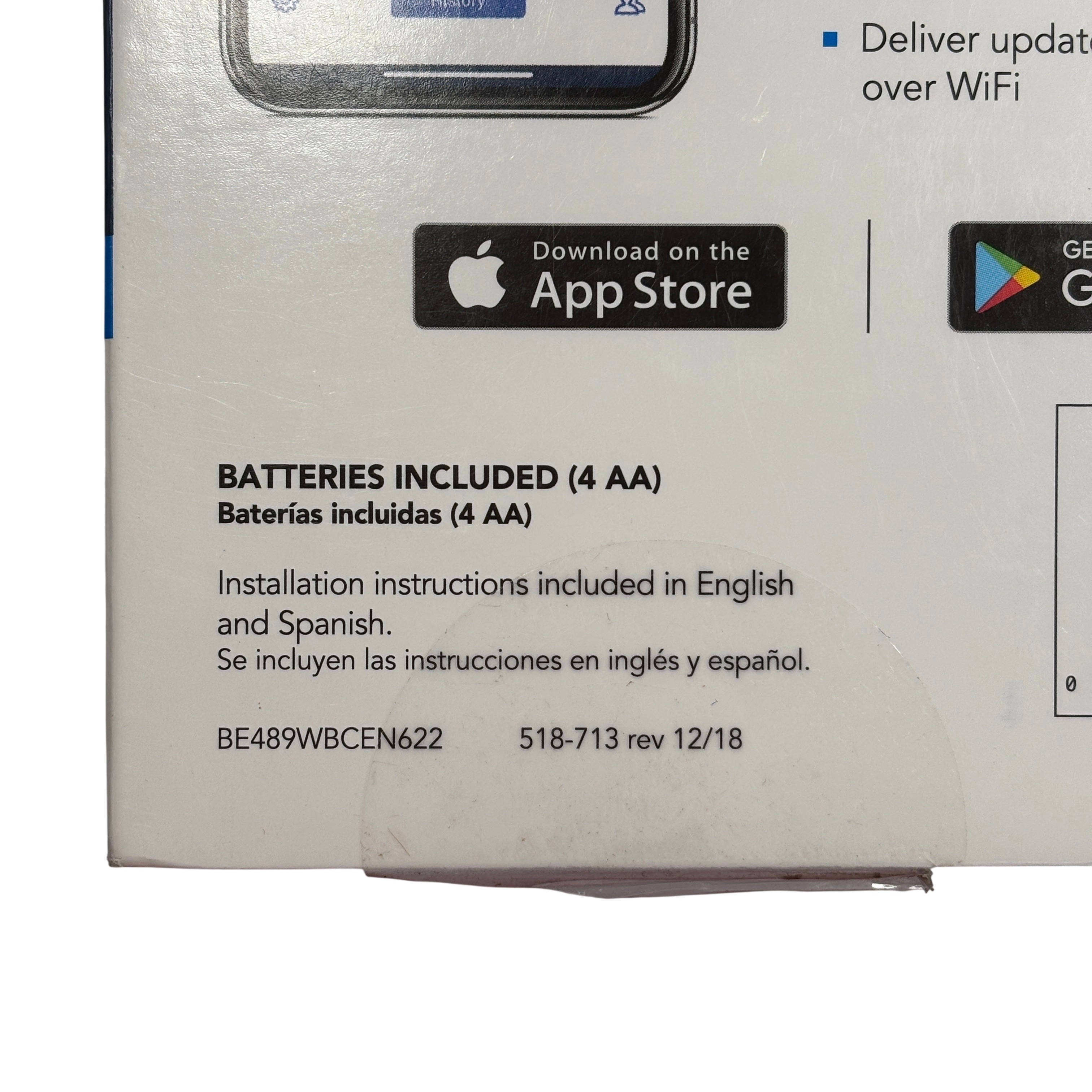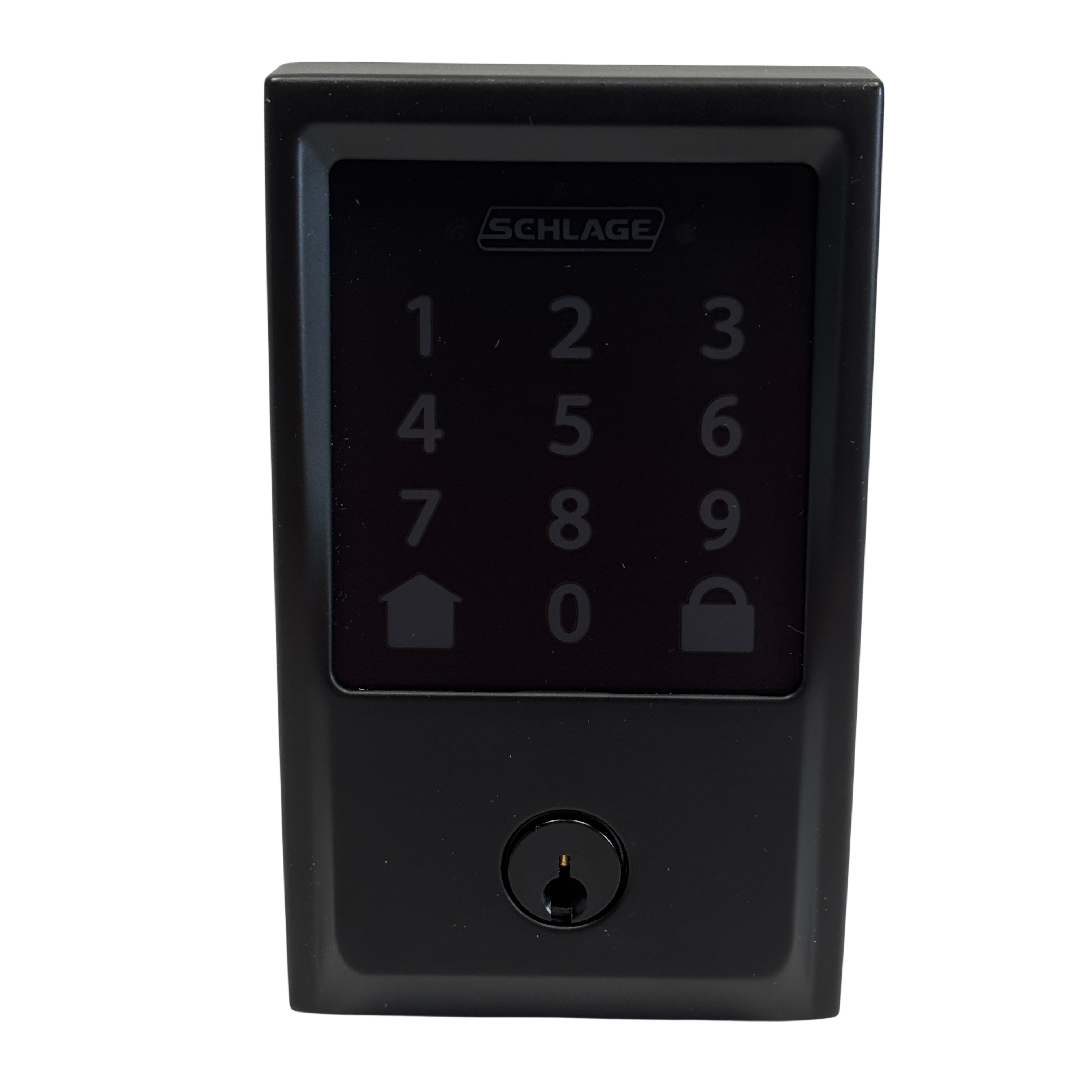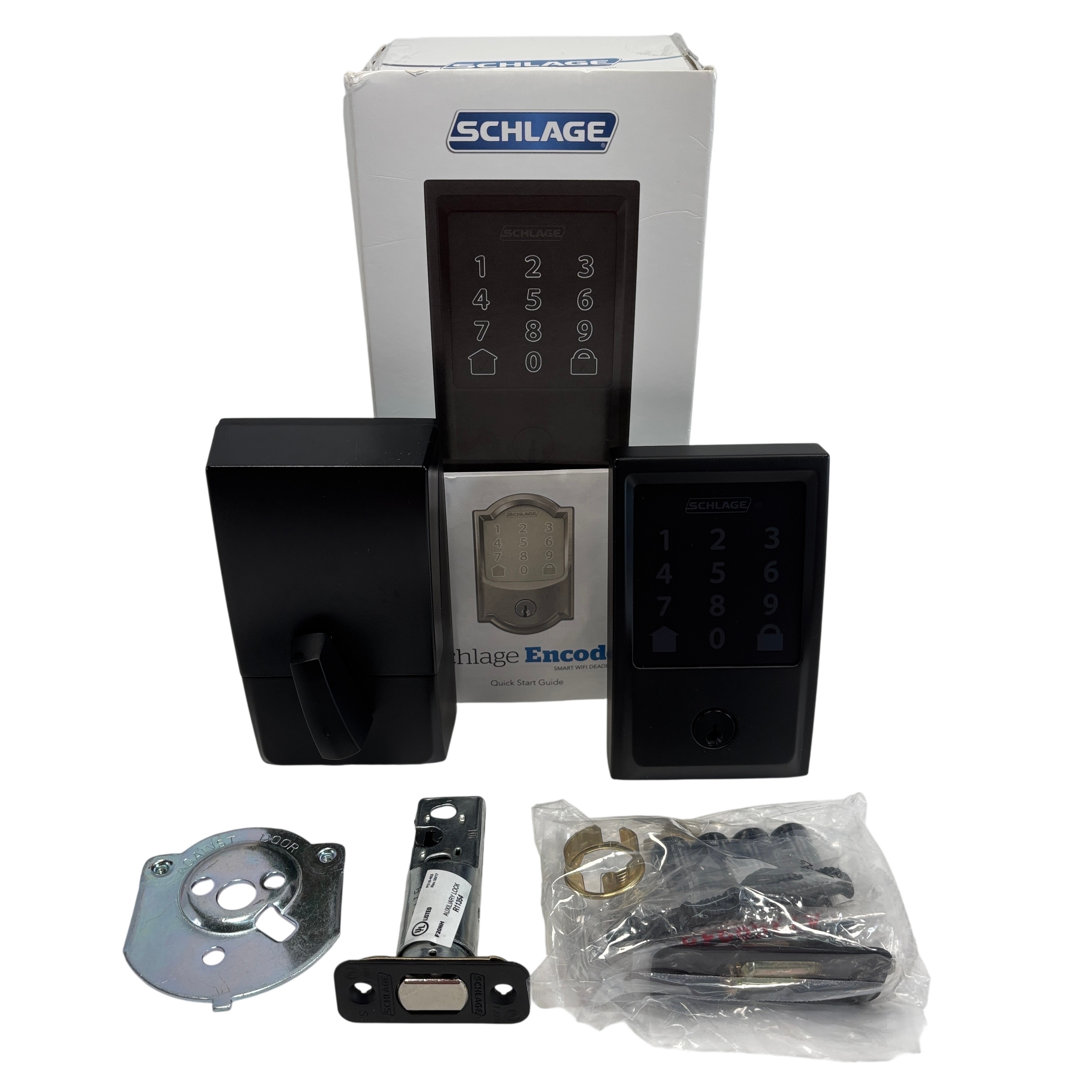 The Schlage Encode Black Electronic Smart Wi-Fi Deadbolt Lock BE489WBCAM619 offers secure keyless entry with a sleek black keypad and Wi-Fi connectivity for remote access. Powered by 4 included AA batteries, this smart lock allows you to control and monitor your door from anywhere using the Schlage app. The package includes both interior and exterior lock units, installation hardware, and a quick start guide, making setup straightforward. Ideal for enhancing home security with modern convenience, this lock supports firmware updates over Wi-Fi and features a responsive touchscreen keypad for easy code entry.