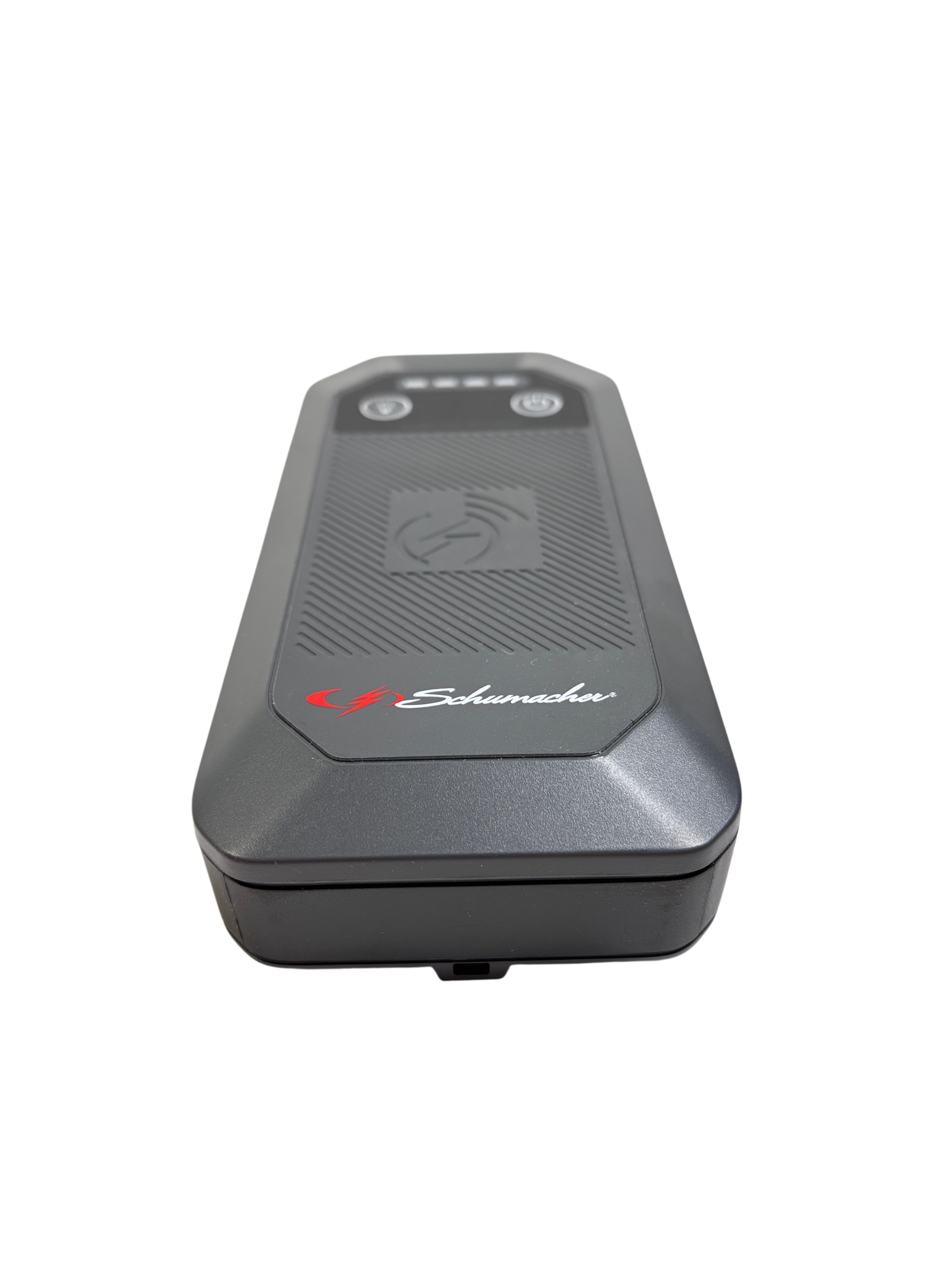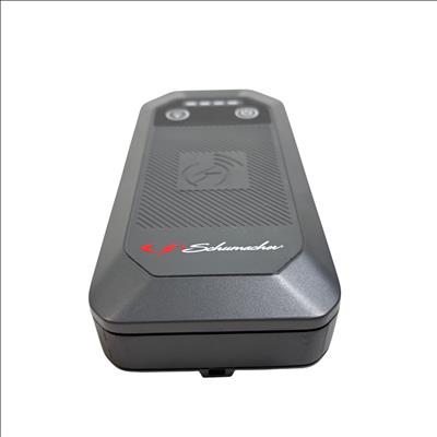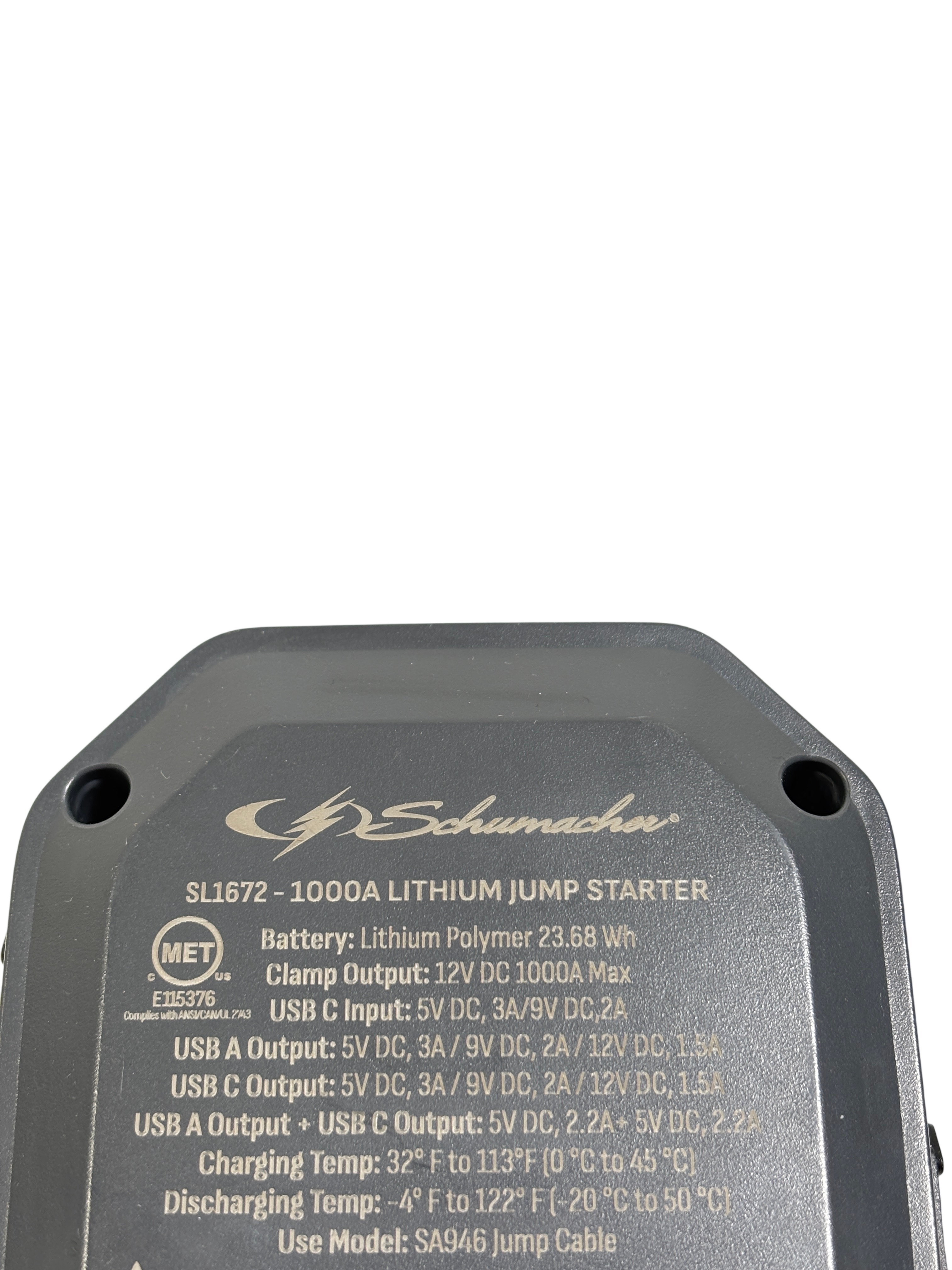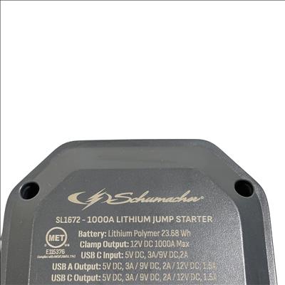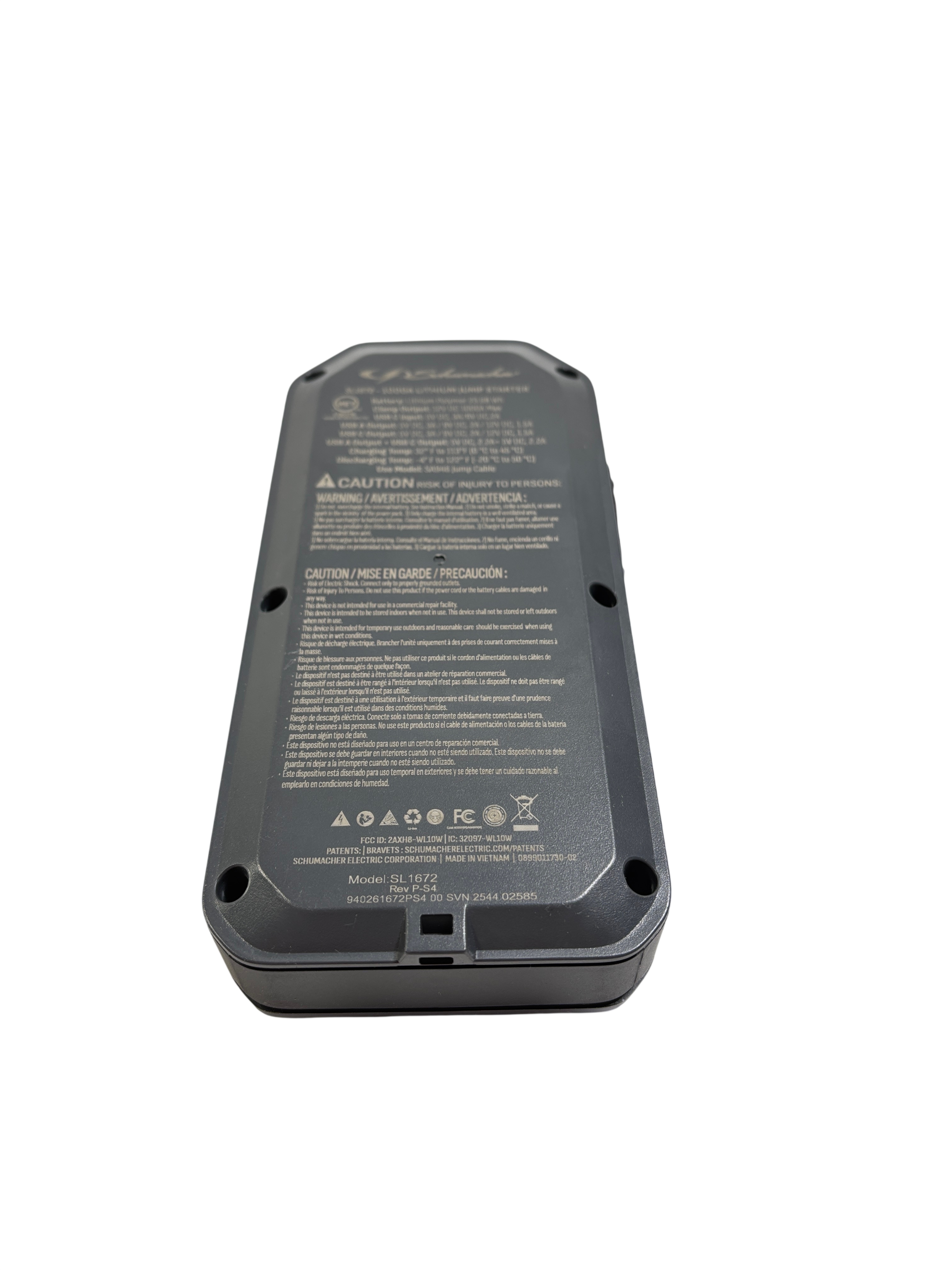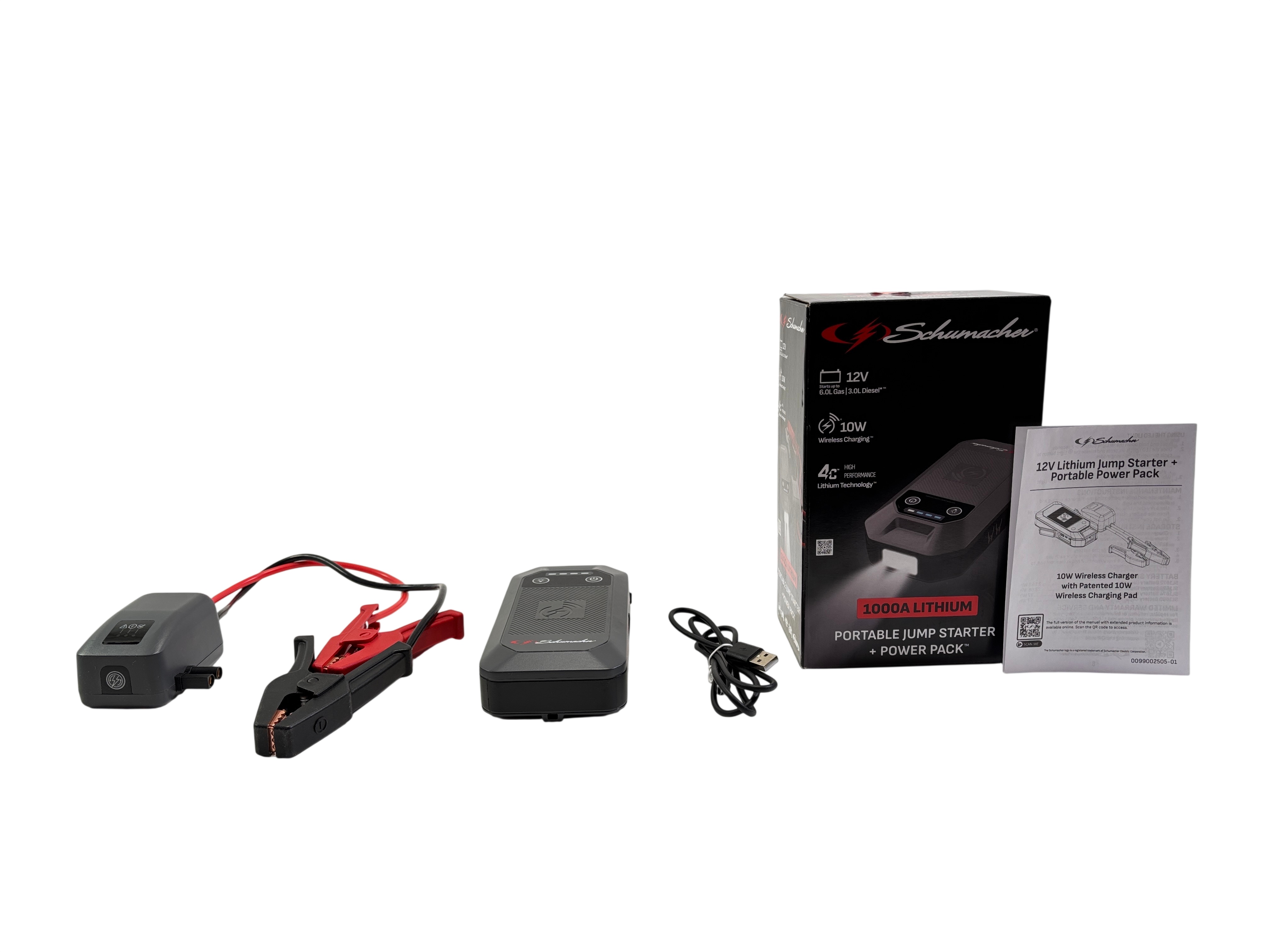 The Schumacher SL1672 1000A Lithium Jump Starter is a compact and powerful portable power pack designed to jump start 12V vehicles with up to 6.0L gas or 3.0L diesel engines. Featuring a 23.68 Wh lithium polymer battery, it delivers a maximum clamp output of 1000 amps for reliable starting power. This model includes versatile USB A and USB C ports for charging multiple devices, along with a 10W wireless charging pad. The kit comes complete with the jump starter unit, jump cables, USB charging cable, and user manual. Its lightweight and compact design make it perfect for emergency roadside assistance and everyday power needs.