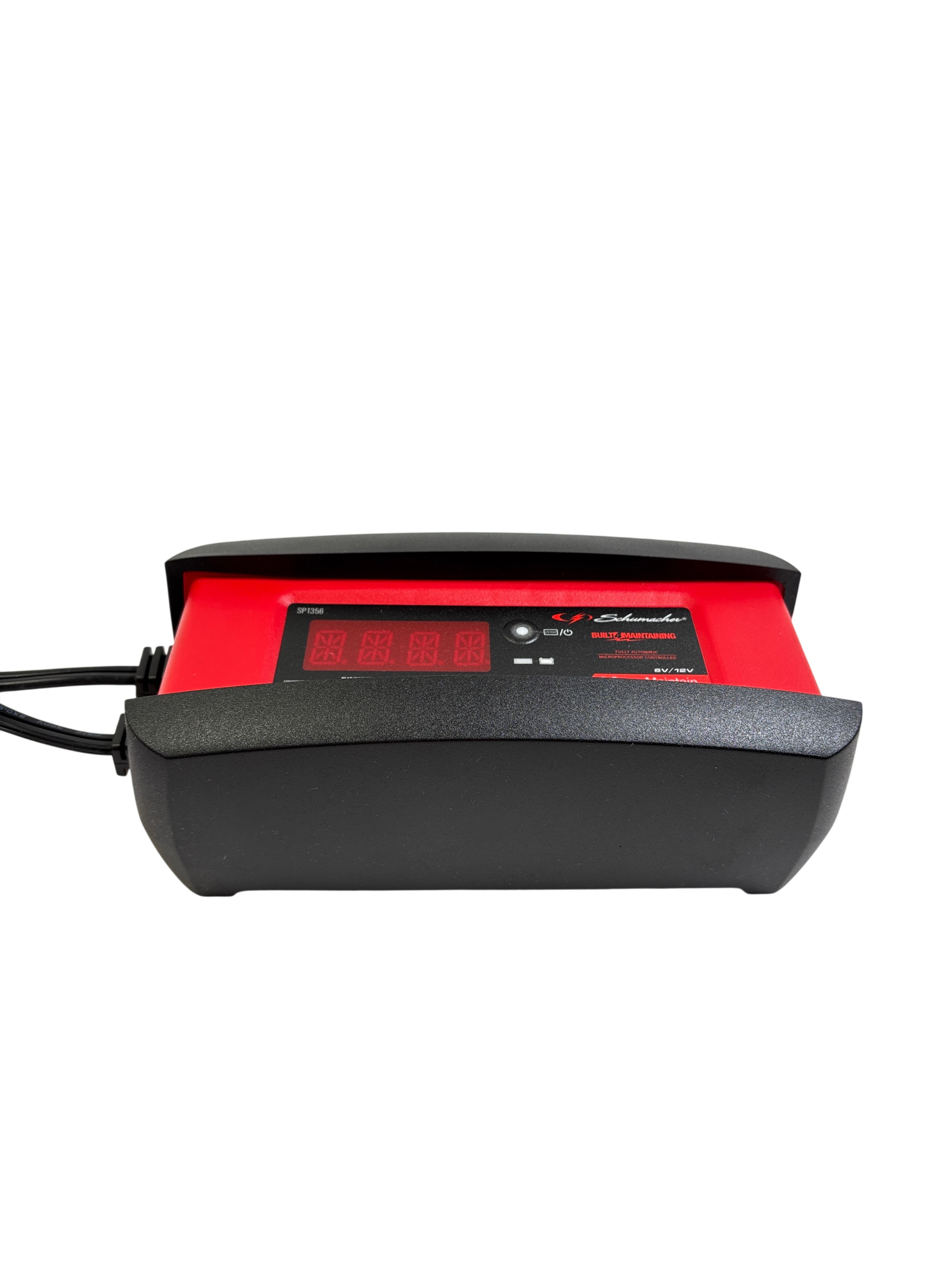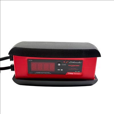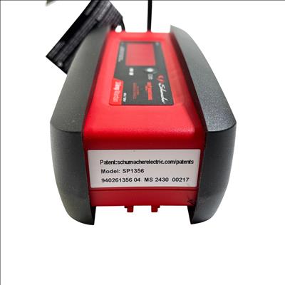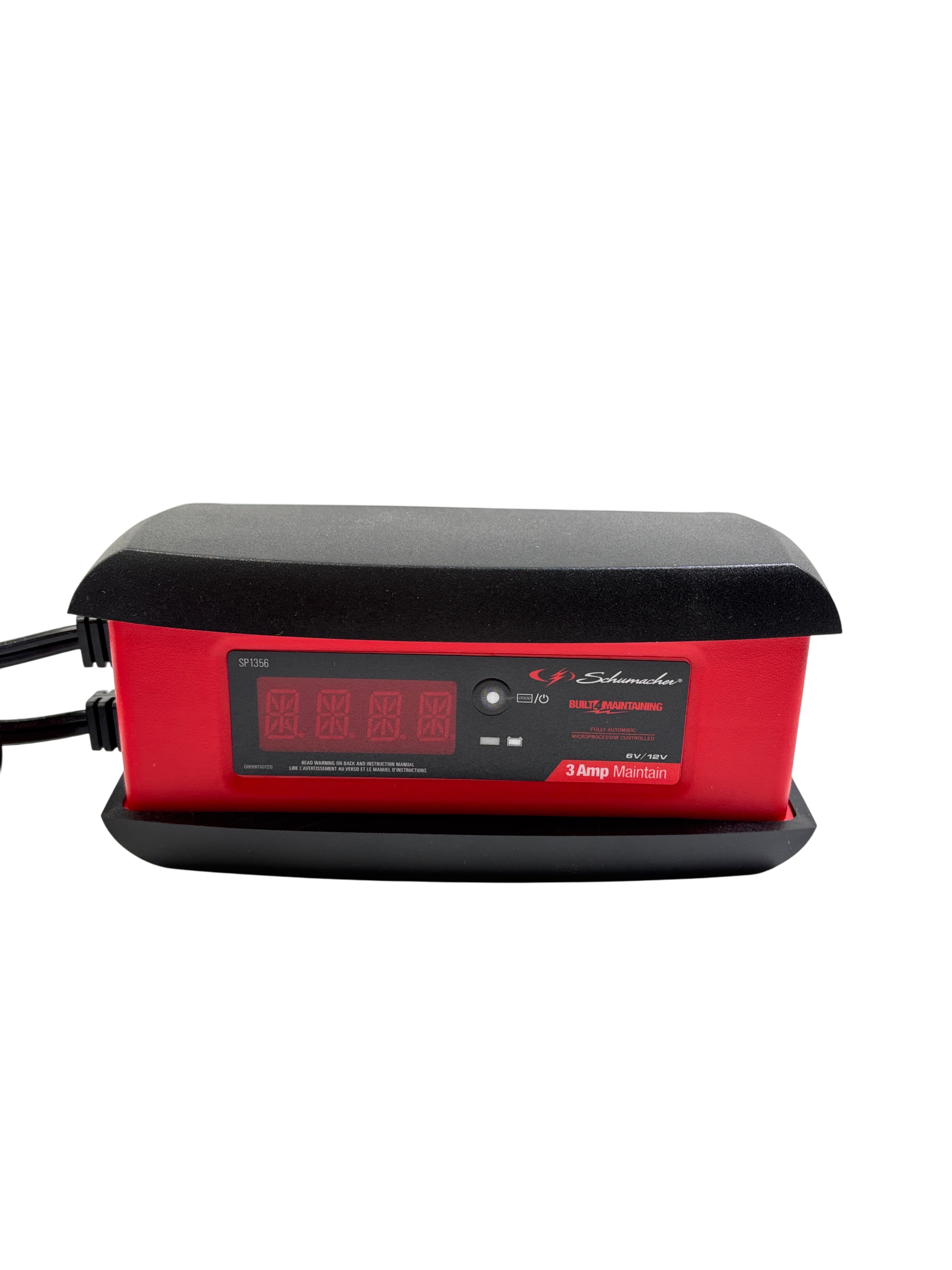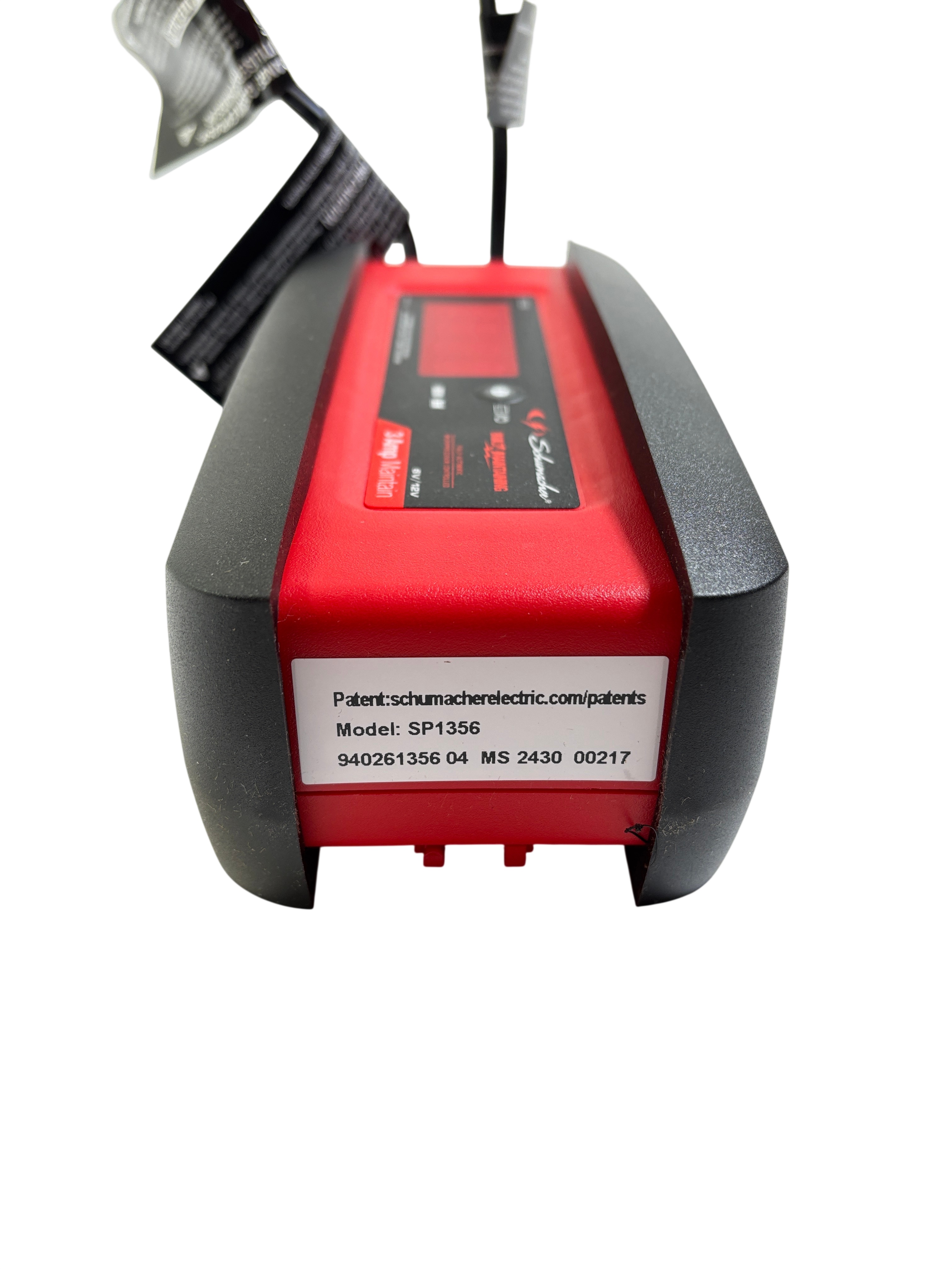 The Schumacher SP1356 3 Amp Battery Charger and Maintainer is designed for 6V and 12V batteries, providing a fully automatic and microprocessor controlled charging experience. This compact charger features a 3 Amp charging current ideal for maintaining battery health and extending battery life. Included are versatile connection options such as battery clamps, a ring terminal adapter, and a cigarette lighter adapter, making it convenient for various charging scenarios. Its durable red and black housing and lightweight design make it a practical choice for automotive battery maintenance.