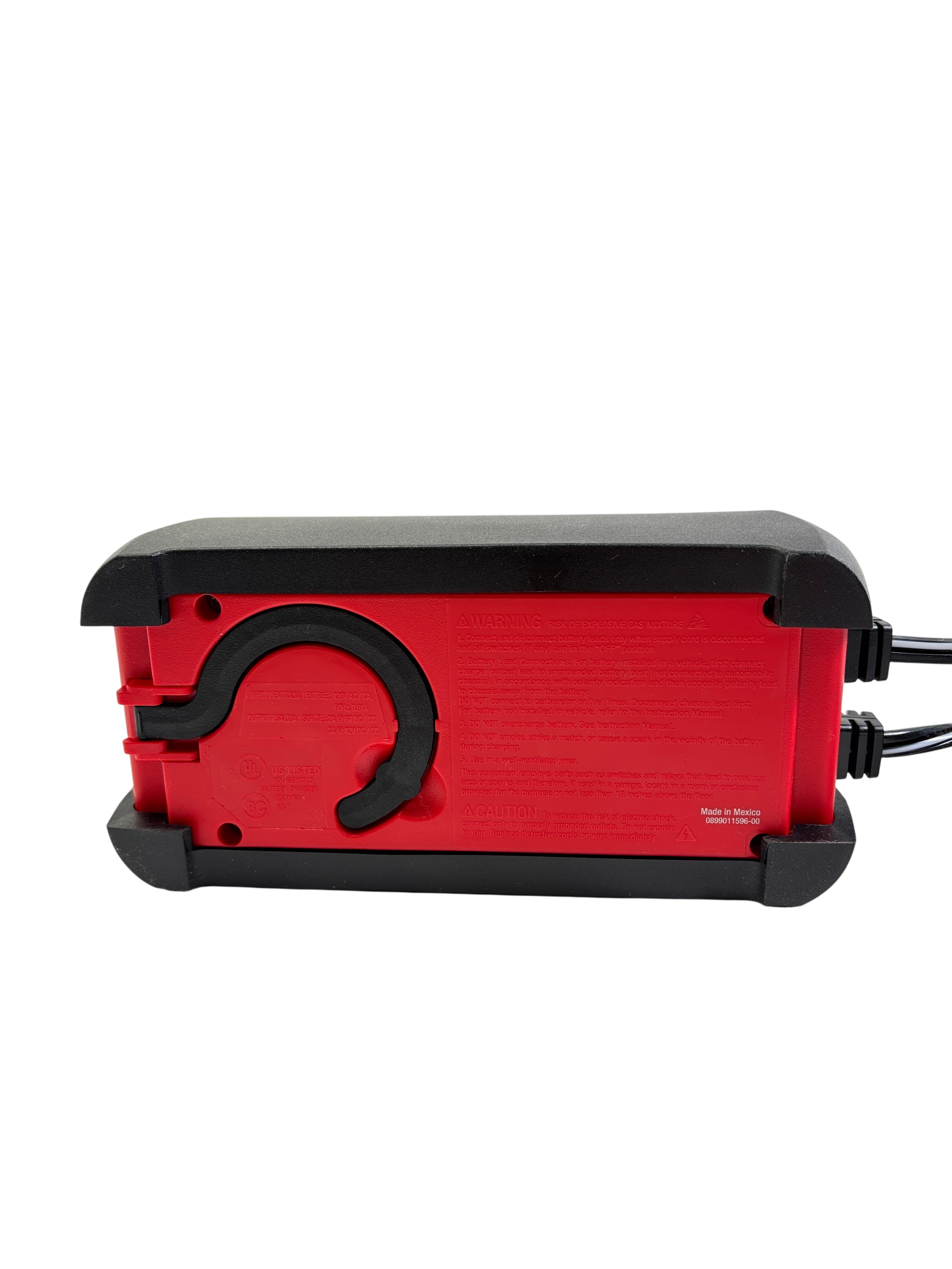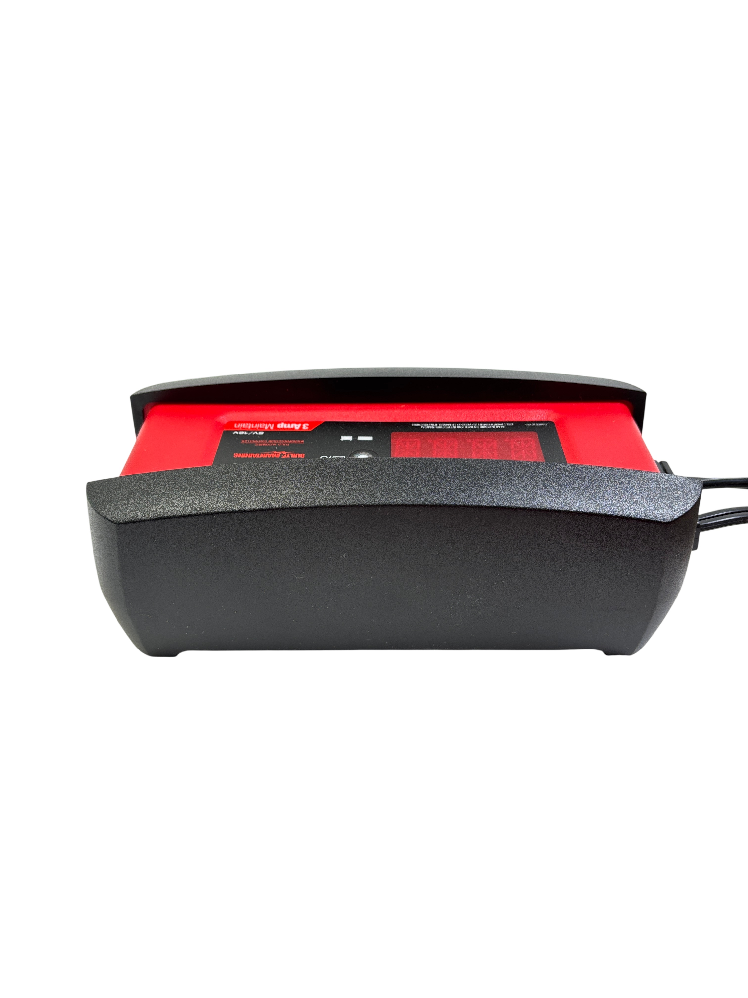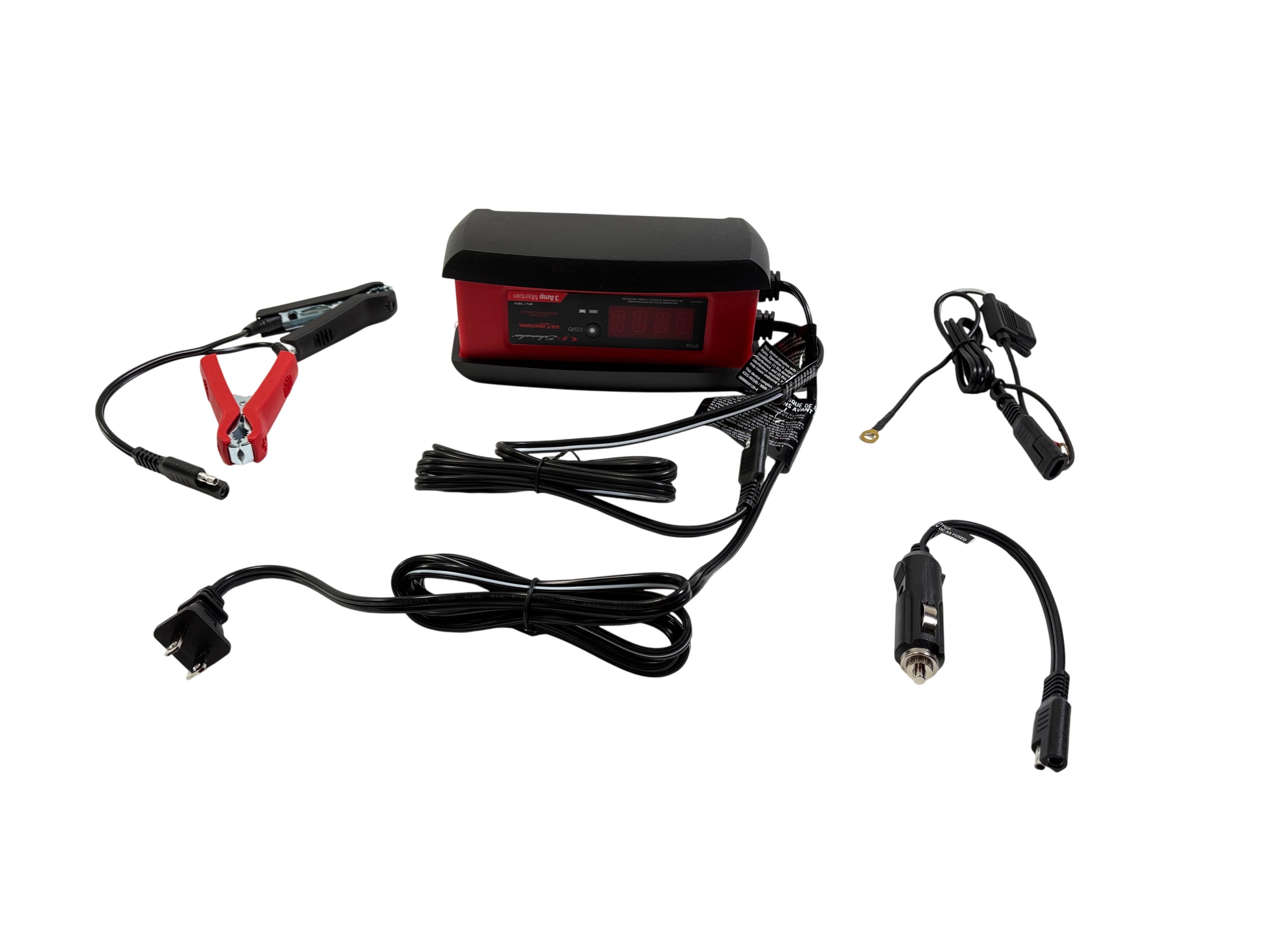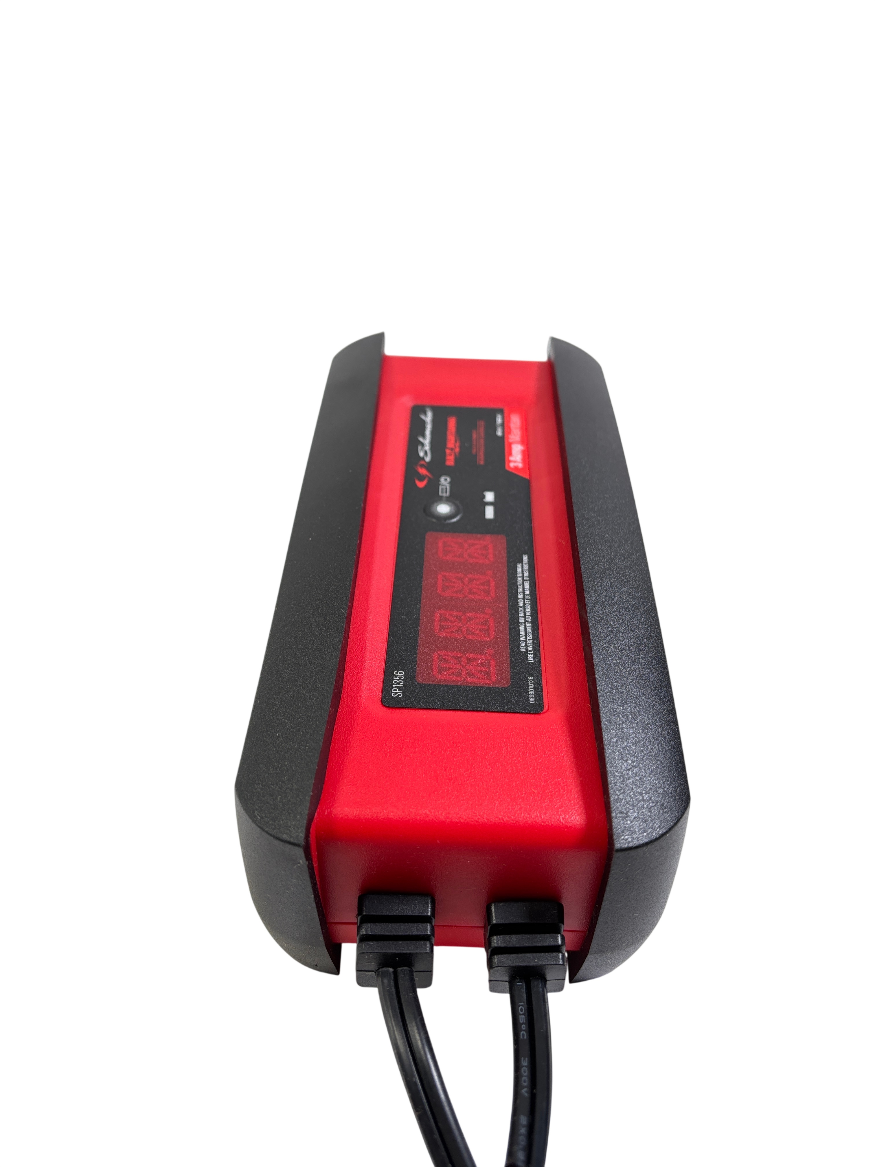 The Schumacher SP1356 3 Amp Battery Charger and Maintainer is designed for 6V and 12V batteries, providing a fully automatic and microprocessor controlled charging experience. This compact charger features a 3 Amp charging current ideal for maintaining battery health and extending battery life. Included are versatile connection options such as battery clamps, a ring terminal adapter, and a cigarette lighter adapter, making it convenient for various charging scenarios. Its durable red and black housing and lightweight design make it a practical choice for automotive battery maintenance.