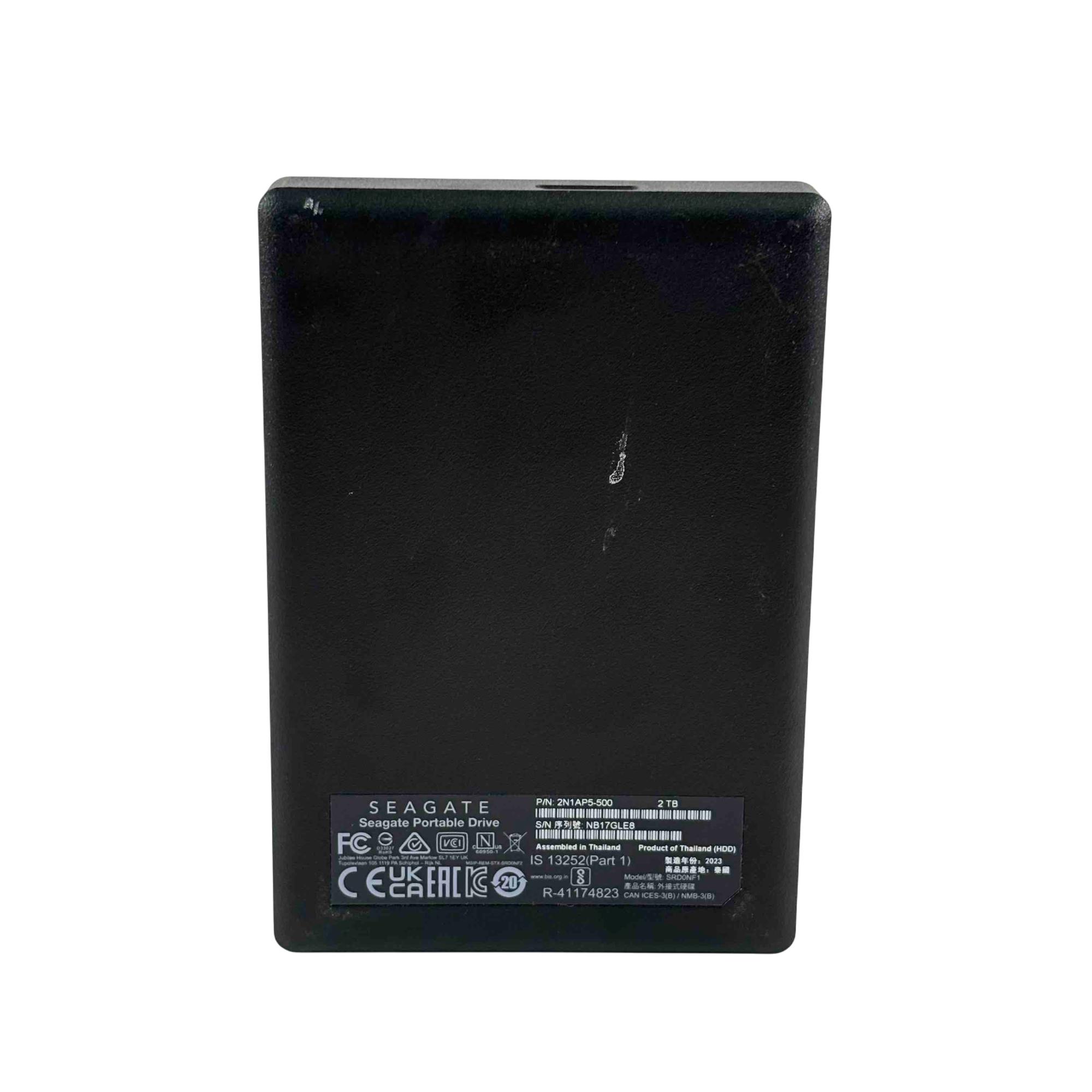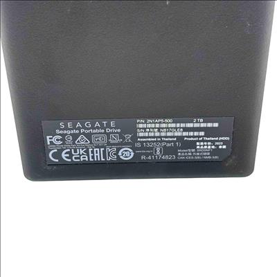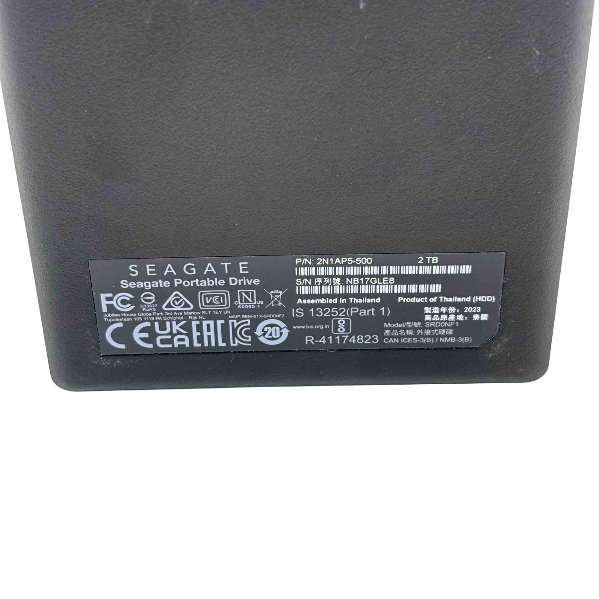 Seagate Portable Drive 2TB External Hard Drive (Model: SRD0NF1, P/N: 2N1AP5-500) offers 2 terabytes of portable storage in a sleek black rectangular design. This external hard drive features a durable build with compliance certifications including ROHS and is assembled in Thailand. Ideal for expanding storage capacity, it supports fast data transfer and seamless connectivity for backup and file management needs.