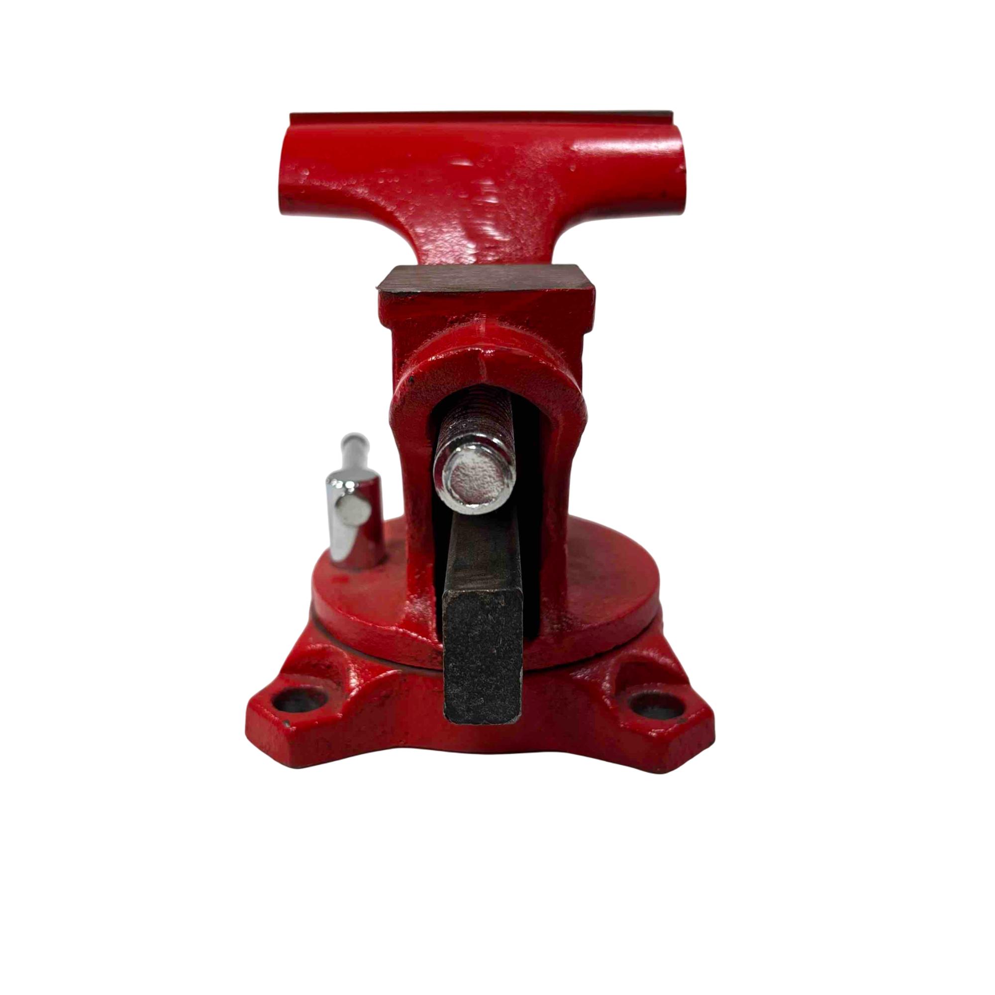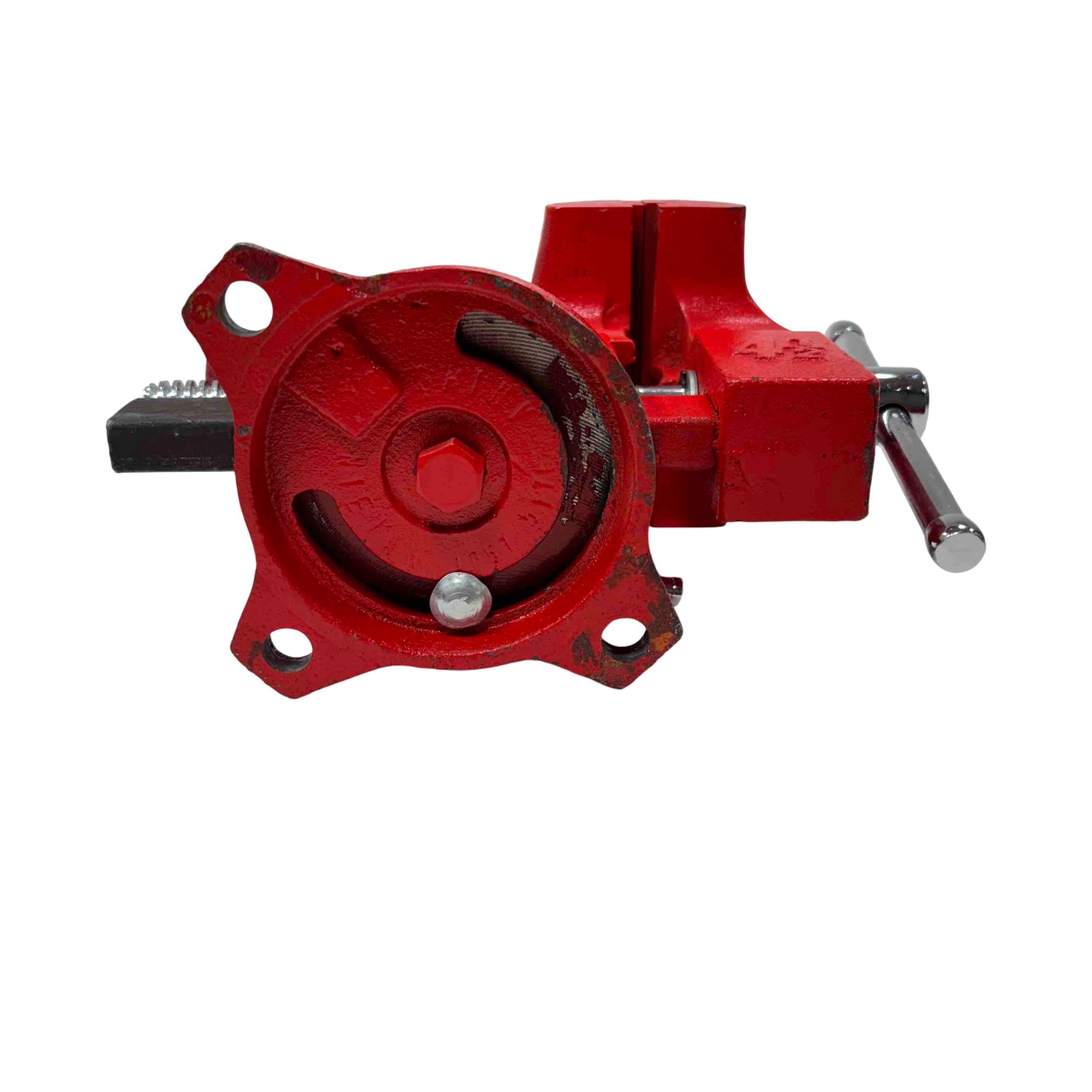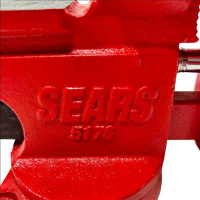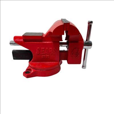 Sears 4 1/2” Swivel Bench Vise 5176 – Red features a durable red metal construction with a 4-1/2 inch jaw width , ideal for securing various materials during work. Equipped with a swivel base and a black handle for easy adjustments, this utility vise offers versatility and stability for workshop tasks.