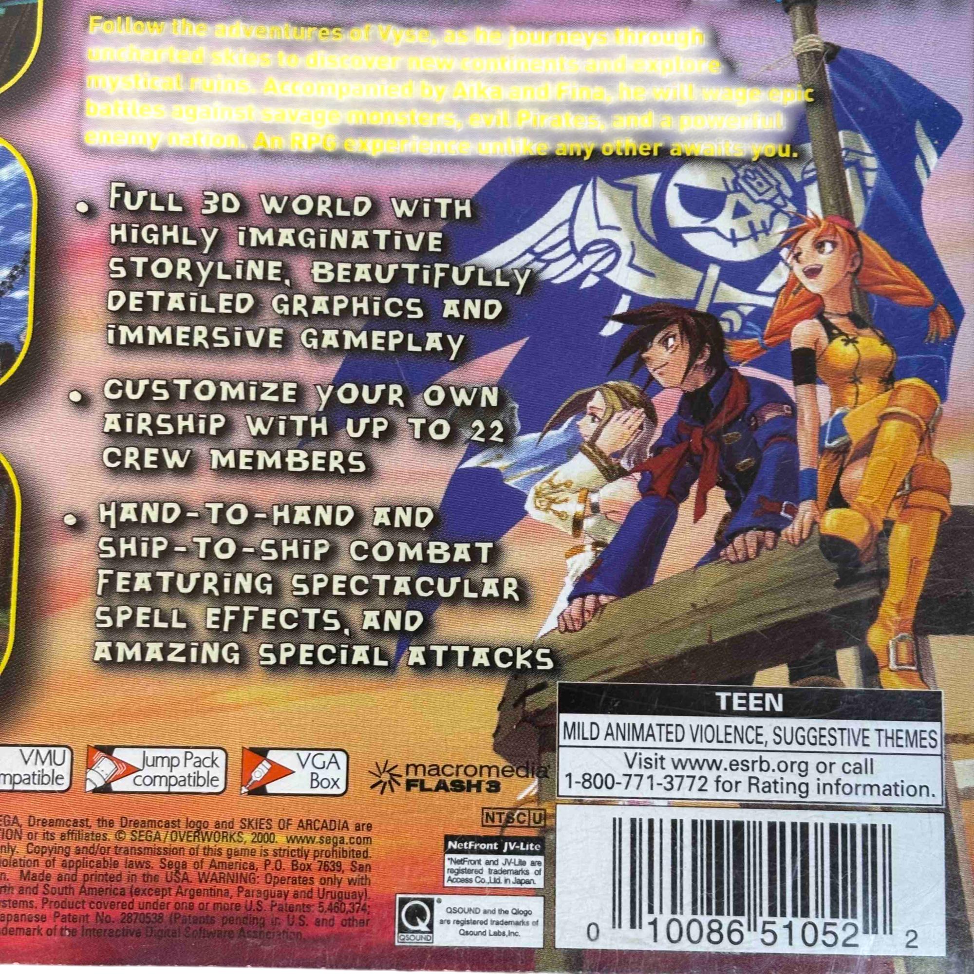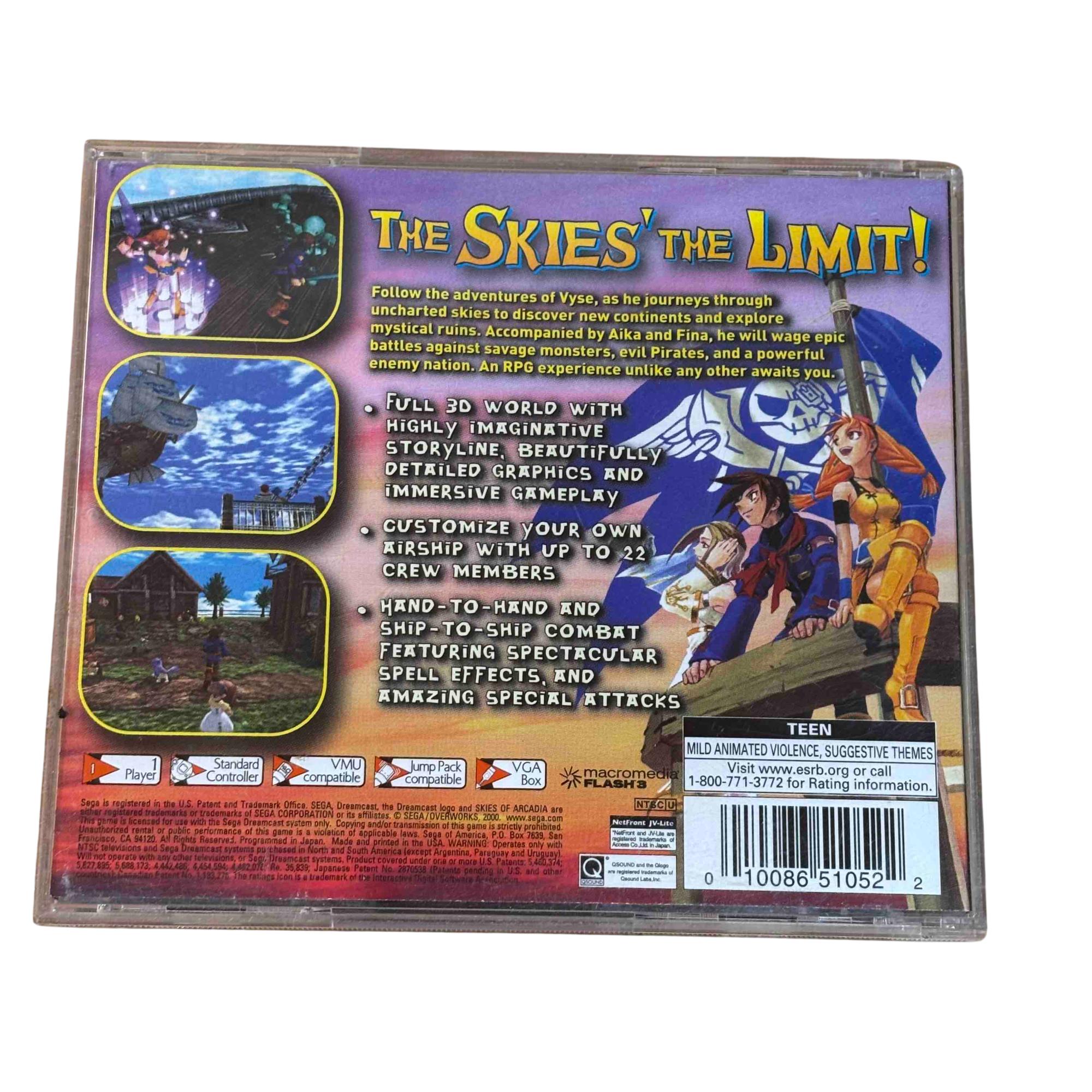 Embark on an epic RPG adventure in Skies of Arcadia for the Sega Dreamcast! Explore vast 3D skies, customize your airship, and battle foes in a richly detailed world as Vyse, Aika, and Fina. This classic teen-rated JRPG comes complete with original case and both discs, perfect for collectors or fans of timeless, imaginative adventures.