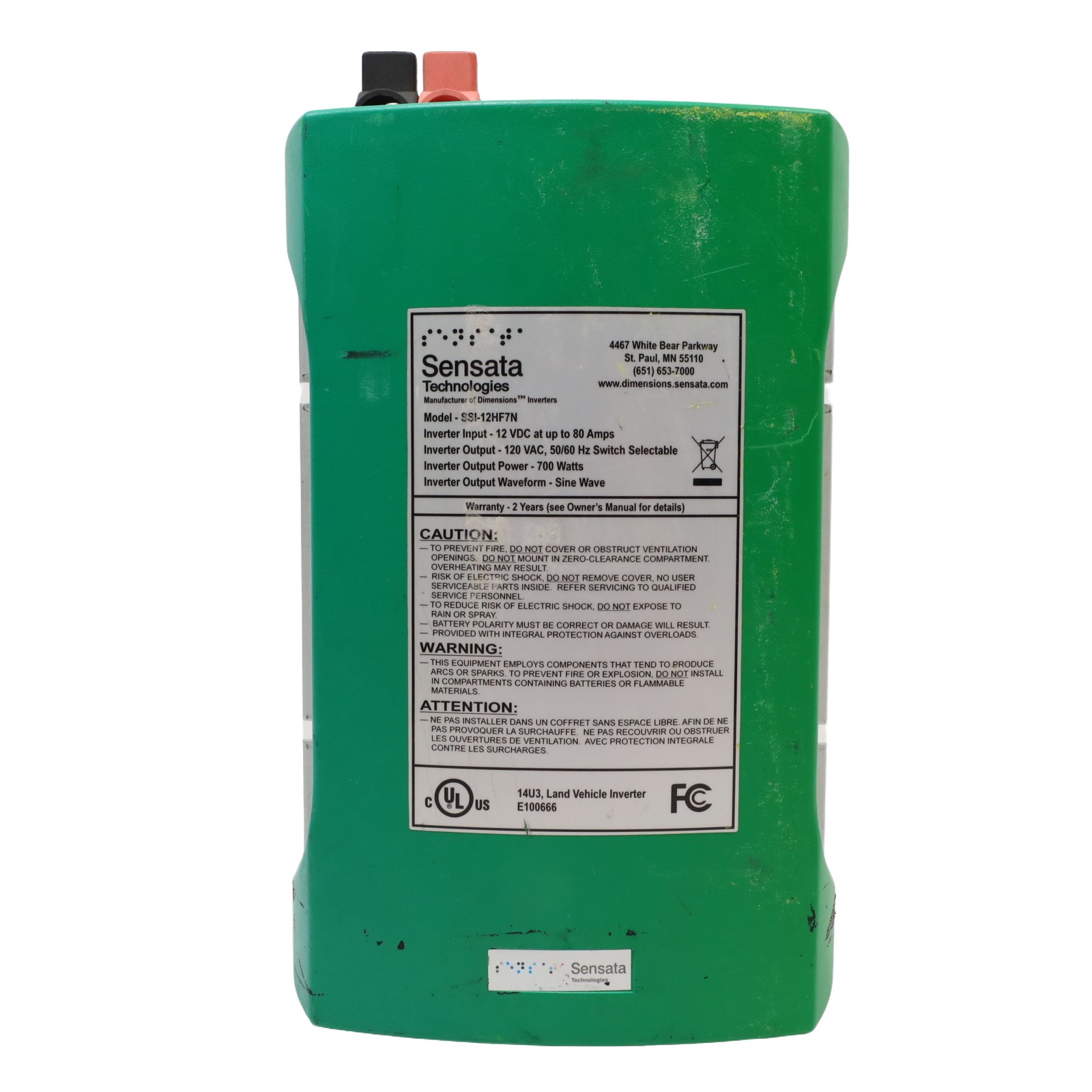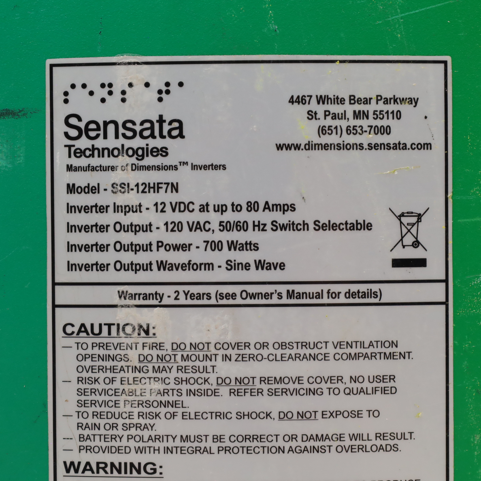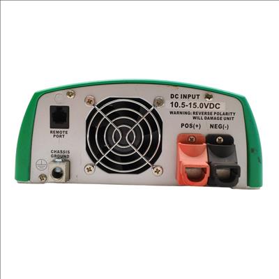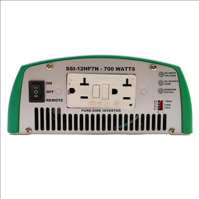 A pure sine wave inverter designed to convert 12VDC input into alternating current output. This unit supports a continuous output power of 700 watts with a maximum output of 770 watts and a surge rating of 1400 watts. The device draws up to 70 amps of input current and features switch selectable frequency output. Efficiency reaches a maximum of 89.00% under full load conditions. It includes a power saving mode that allows the unit to enter sleep mode until the minimum set load is met to begin inverting. The inverter continuously monitors the DC input voltage, output load level, and inverter status for faults.