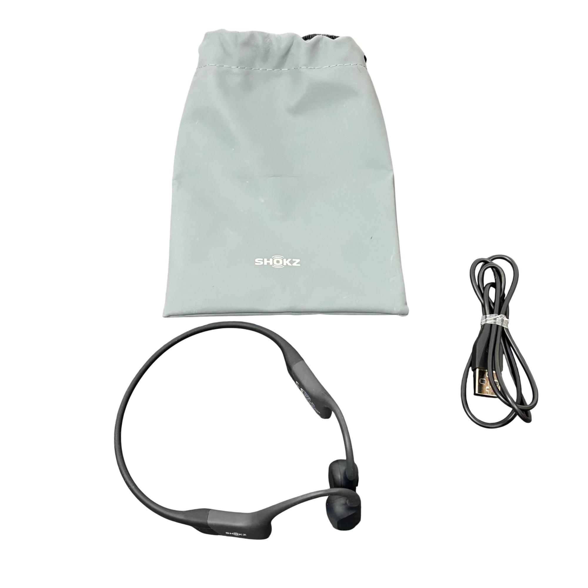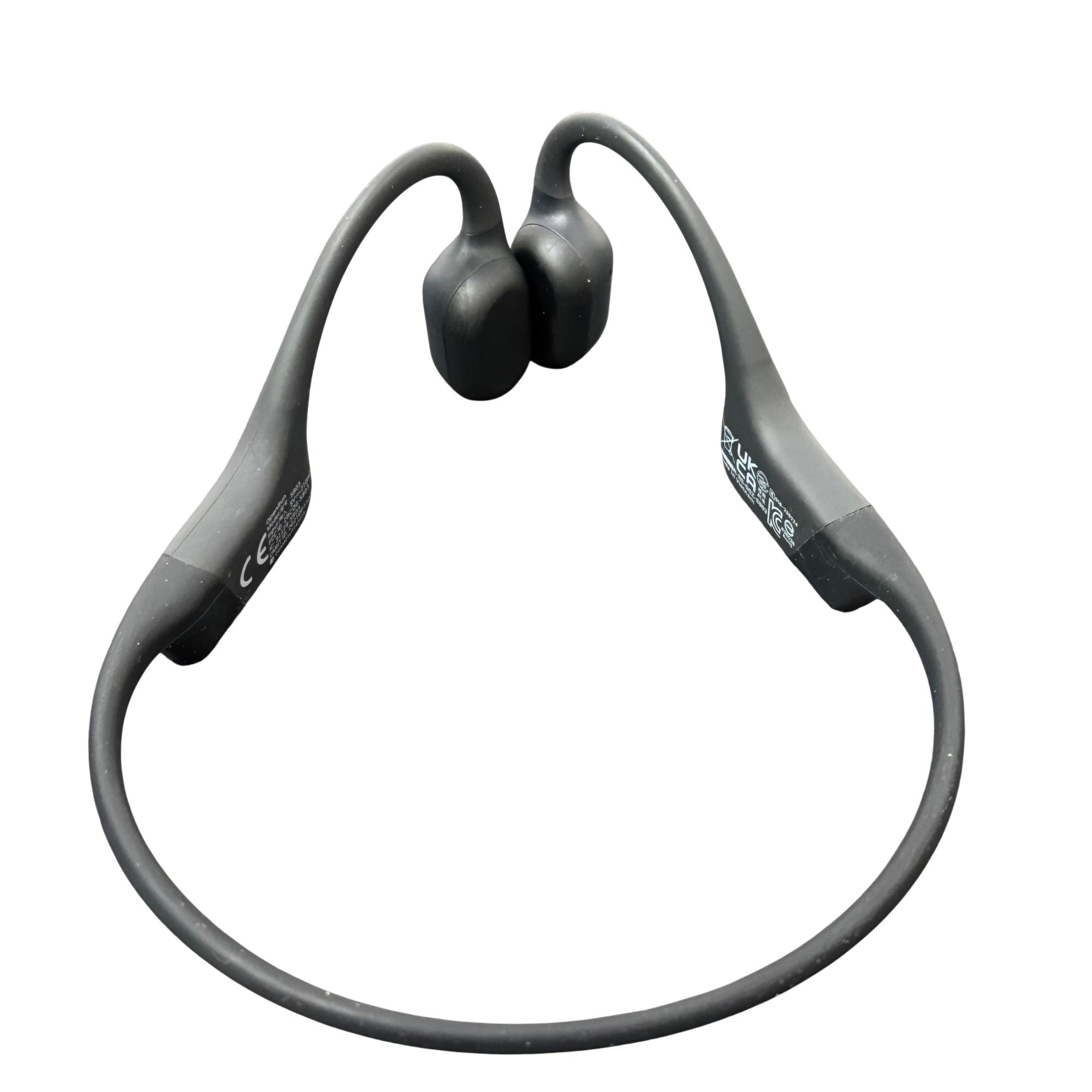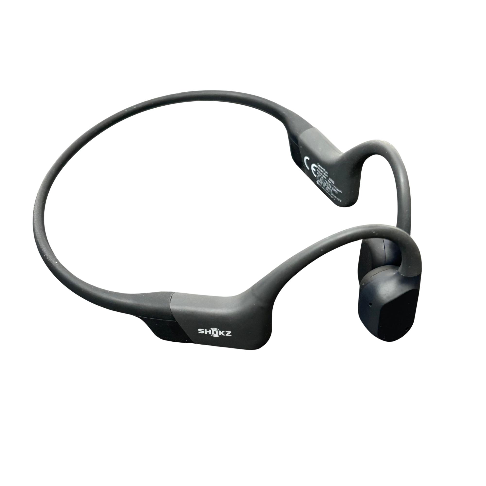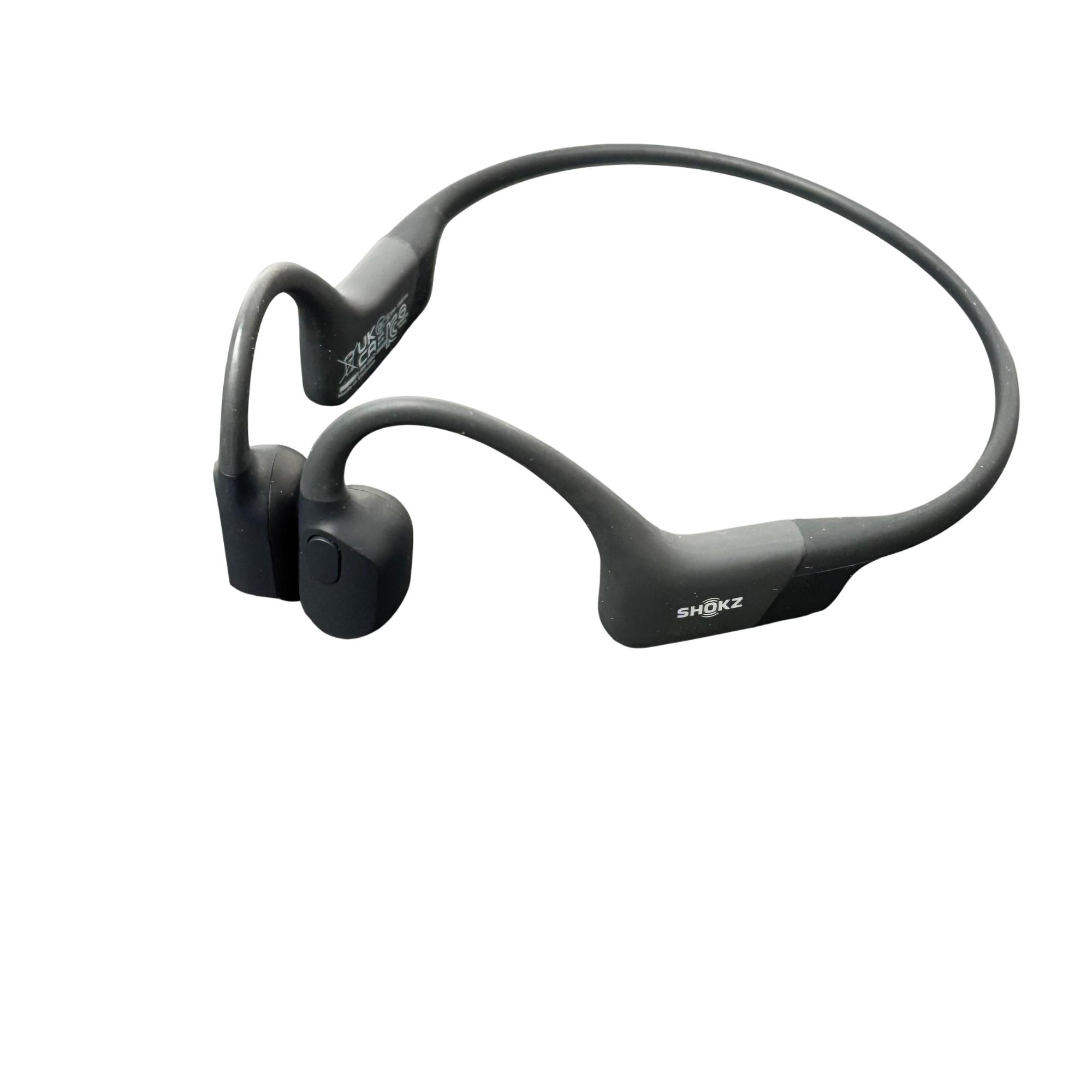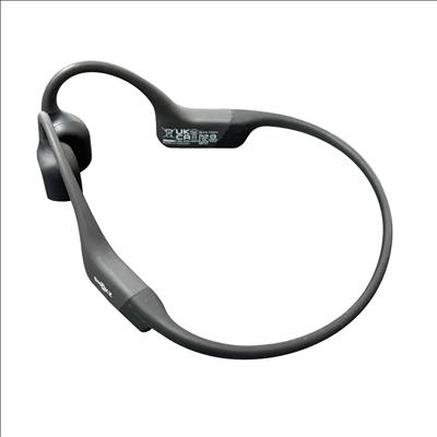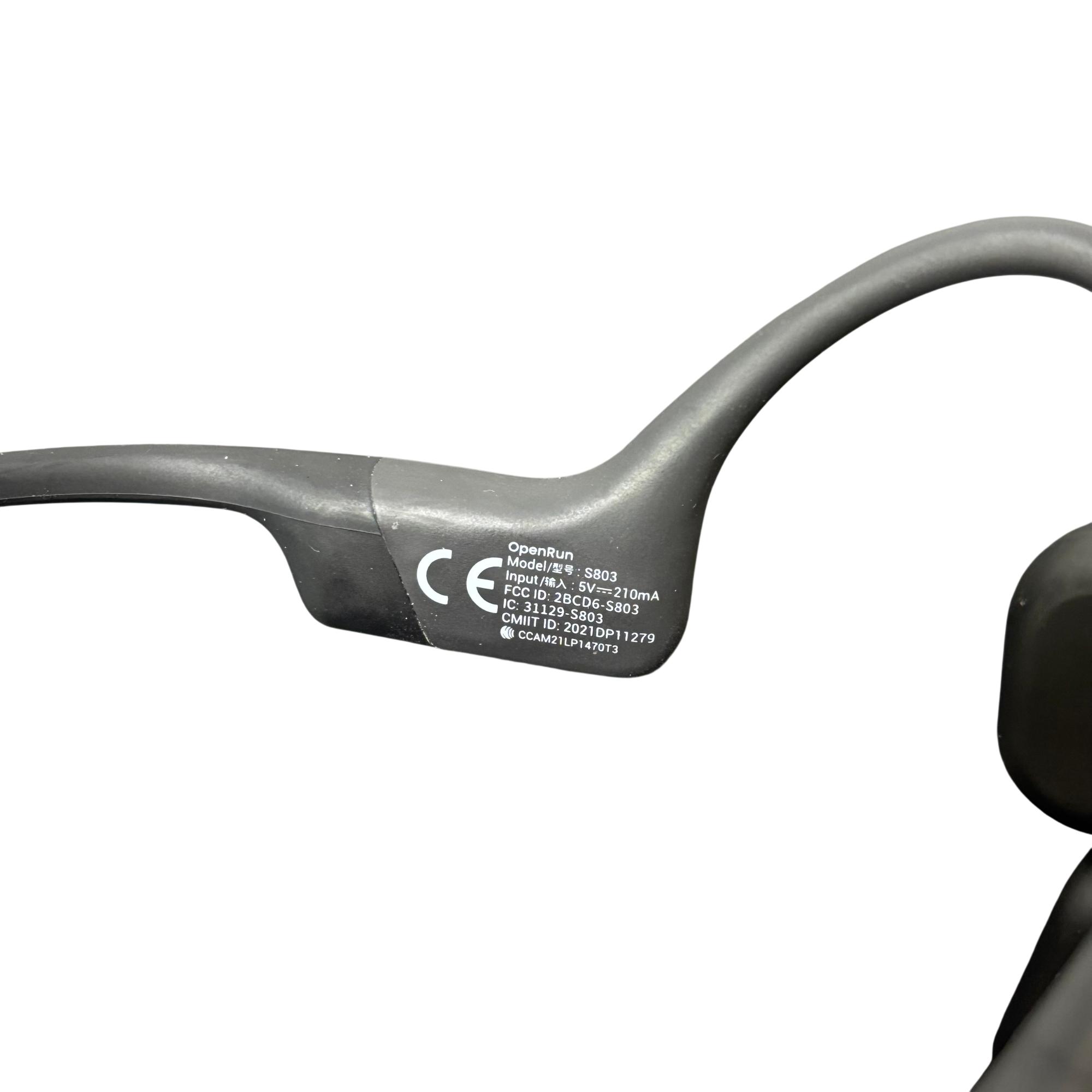 Shokz OpenRun S803 Open-Ear Bone Conduction Headphones in black deliver a lightweight and comfortable audio experience by transmitting sound through bone conduction technology, leaving ears open to ambient sounds. Designed for active use, these headphones feature an ergonomic fit with a durable black band and cable, making them ideal for sports and outdoor activities.