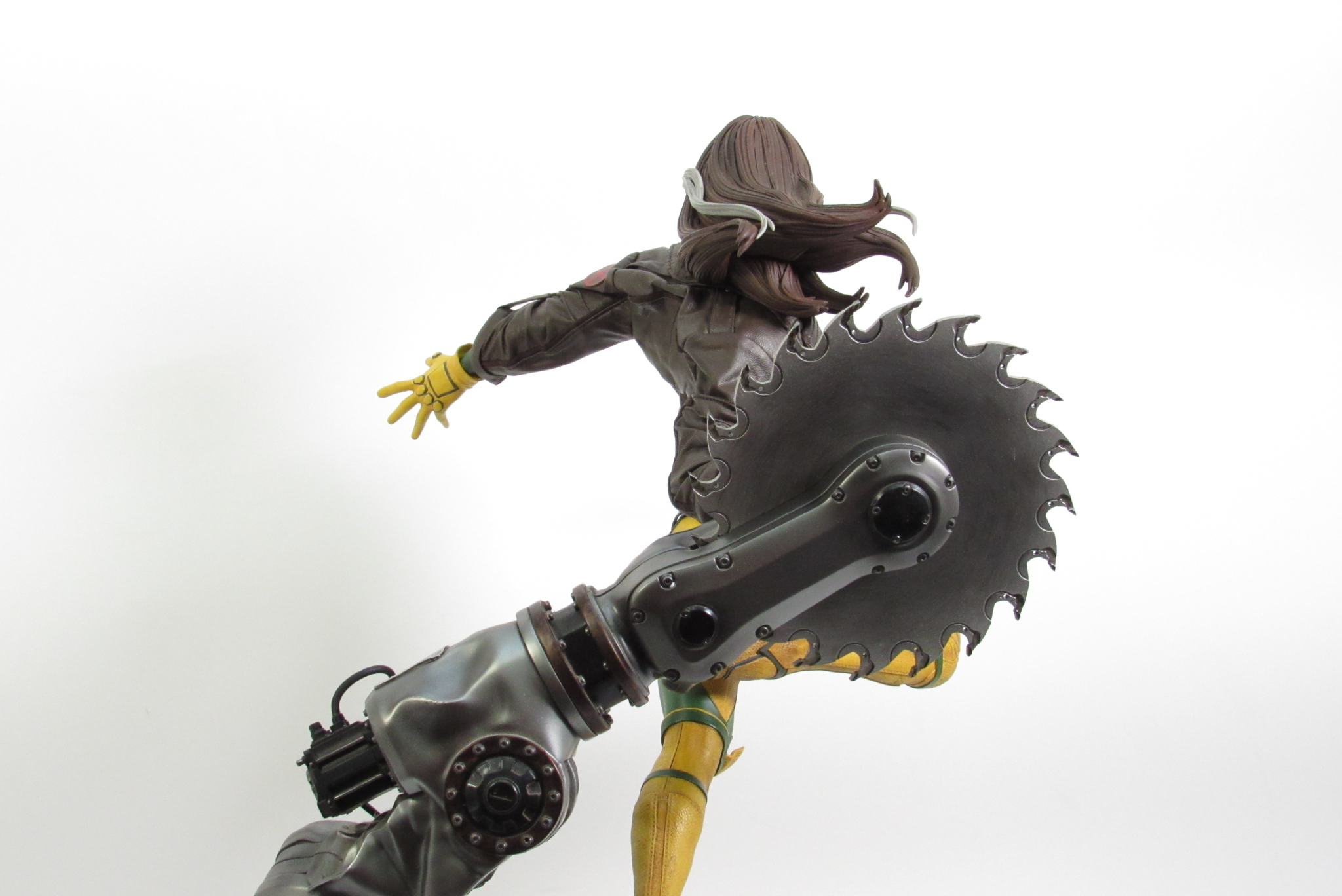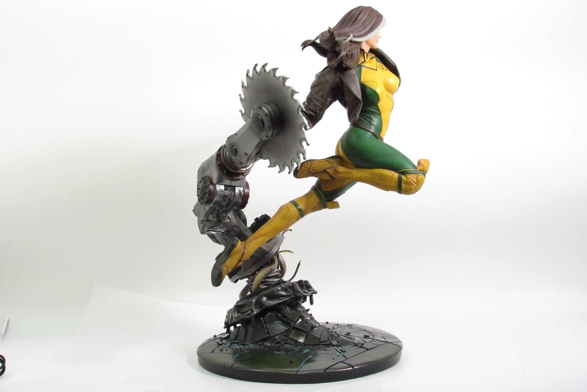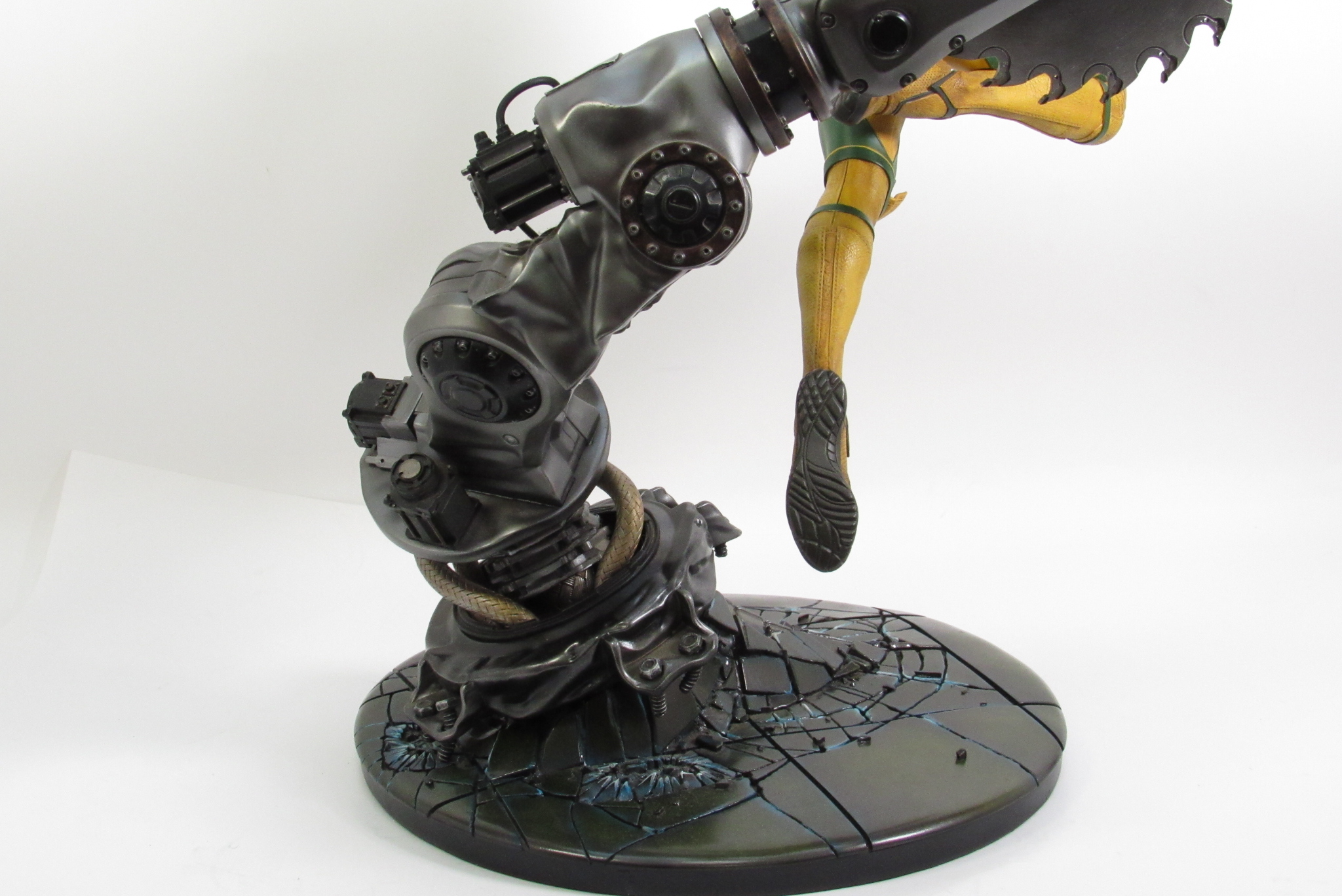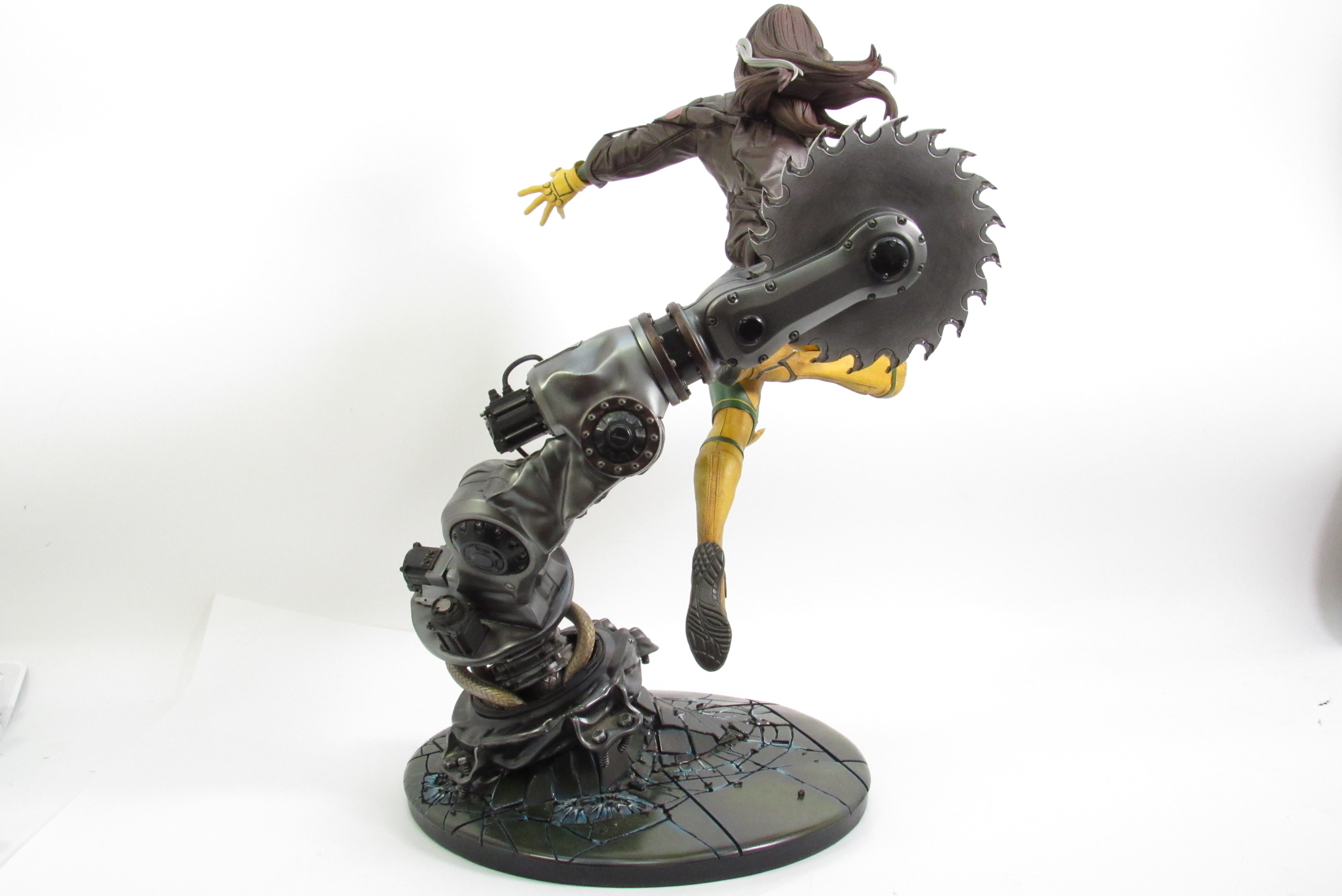 Measuring just over 22” tall, the Rogue Maquette defies gravity in this dynamic and exciting composition that features the mutant’s marvelous powers on display. Flying over a detailed Danger Room environment base, Rogue wrenches an intricate mechanical buzz saw from the floor, ready to take a swing at any unwelcome X-Mansion guests.