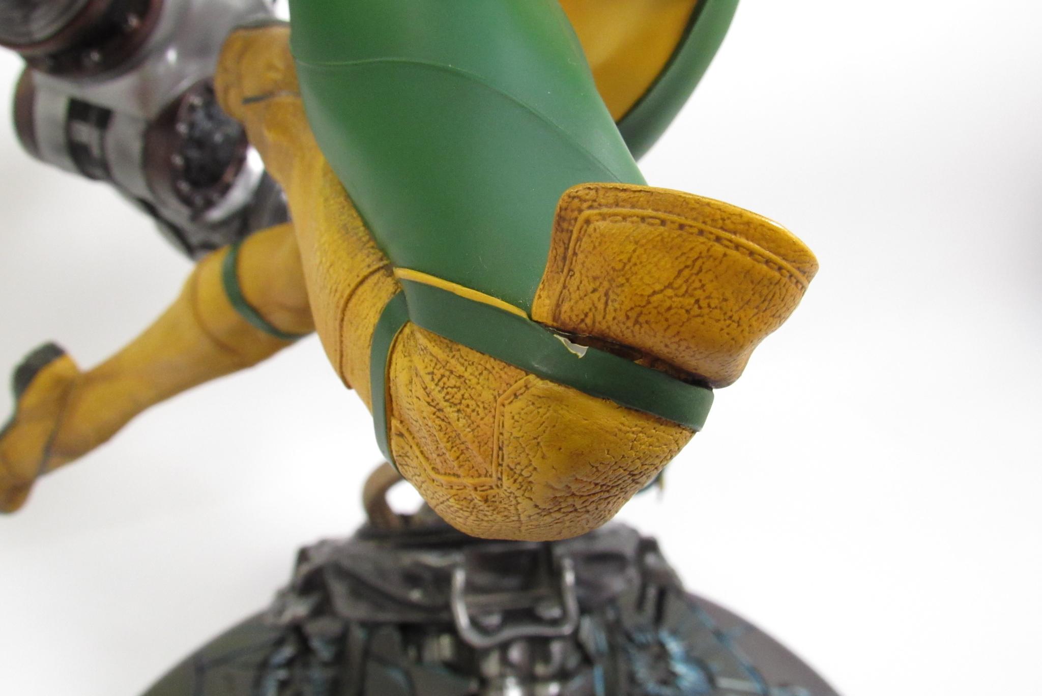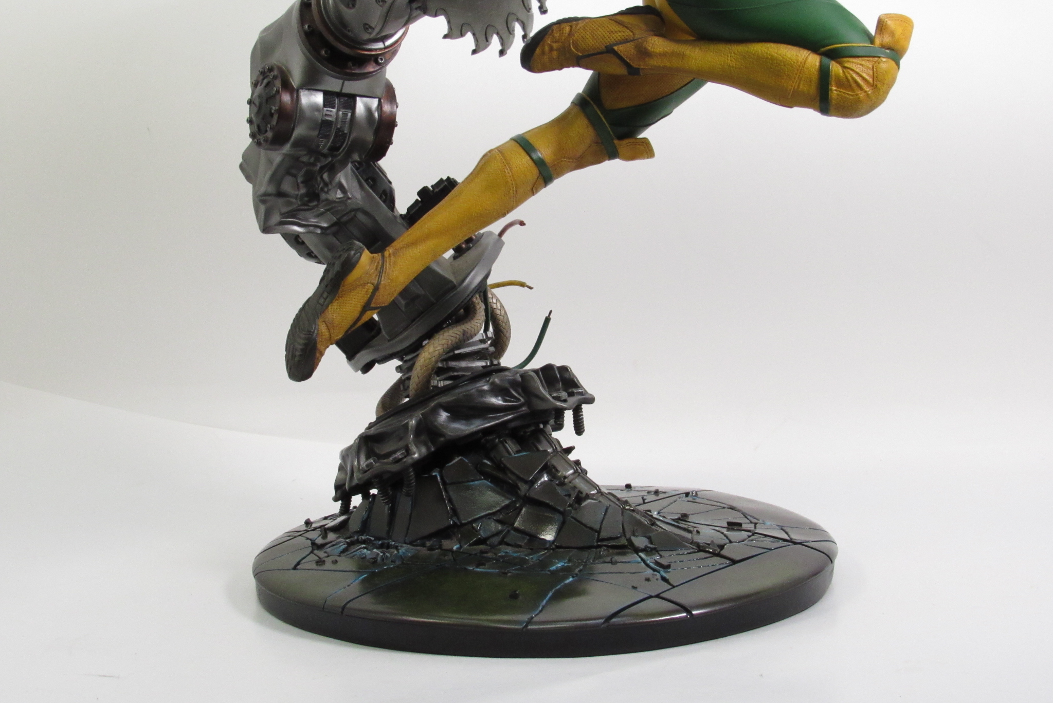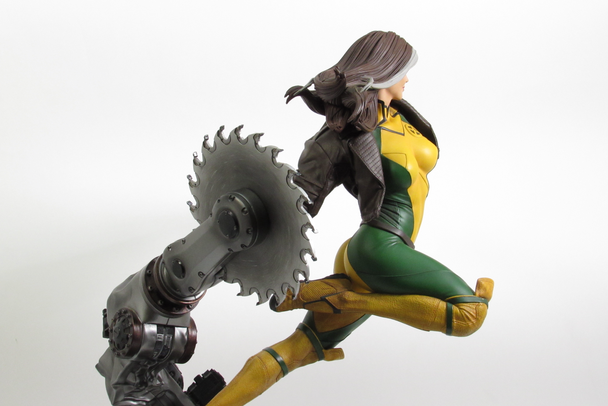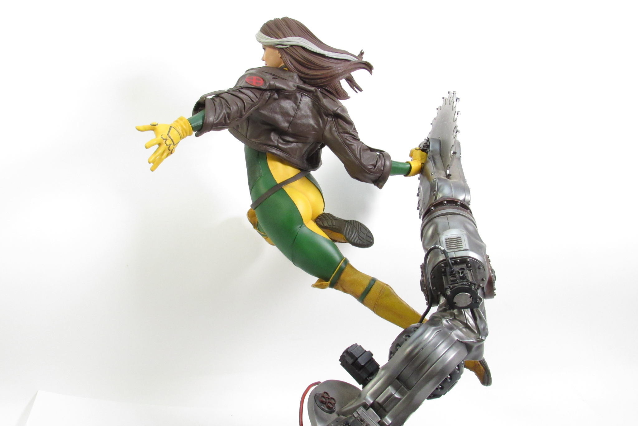 Measuring just over 22” tall, the Rogue Maquette defies gravity in this dynamic and exciting composition that features the mutant’s marvelous powers on display. Flying over a detailed Danger Room environment base, Rogue wrenches an intricate mechanical buzz saw from the floor, ready to take a swing at any unwelcome X-Mansion guests.