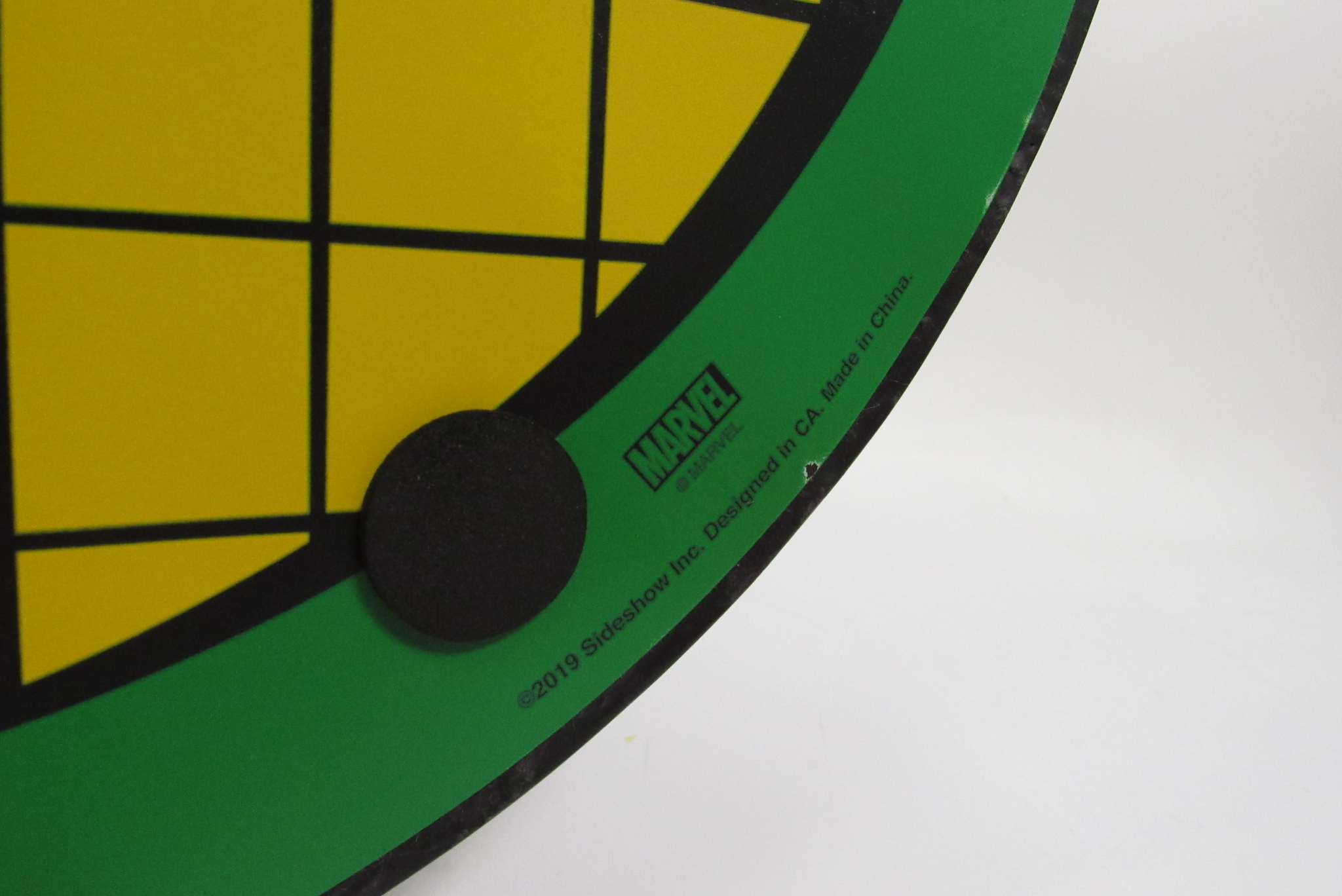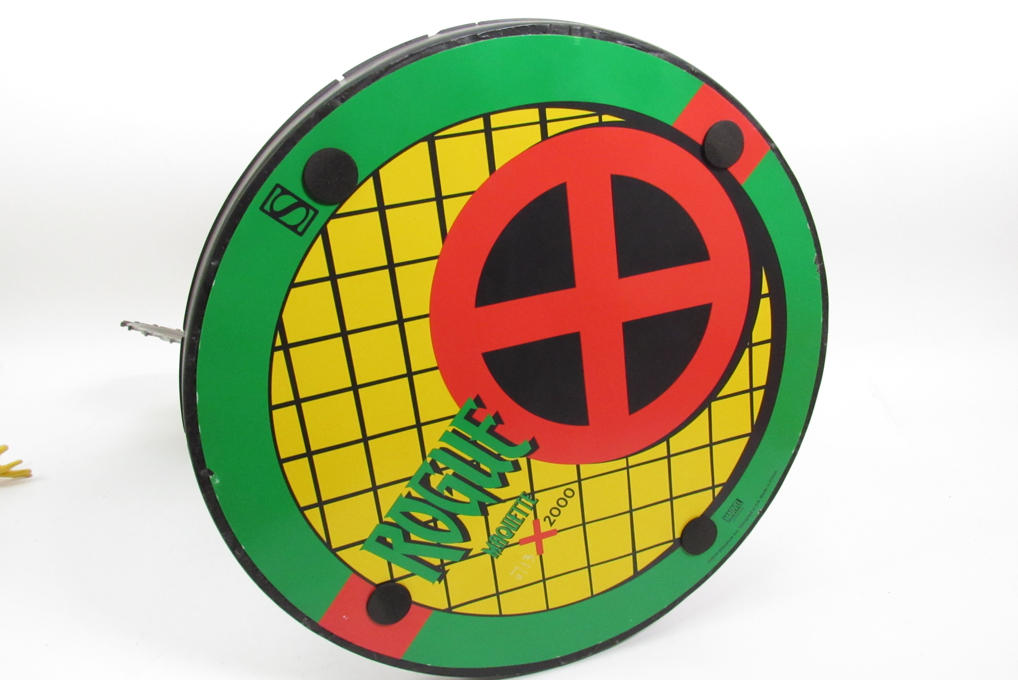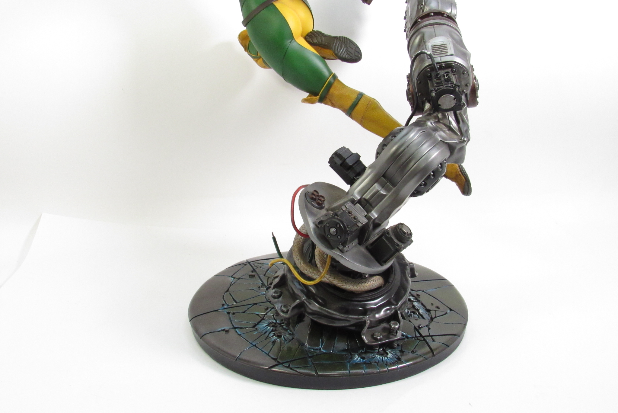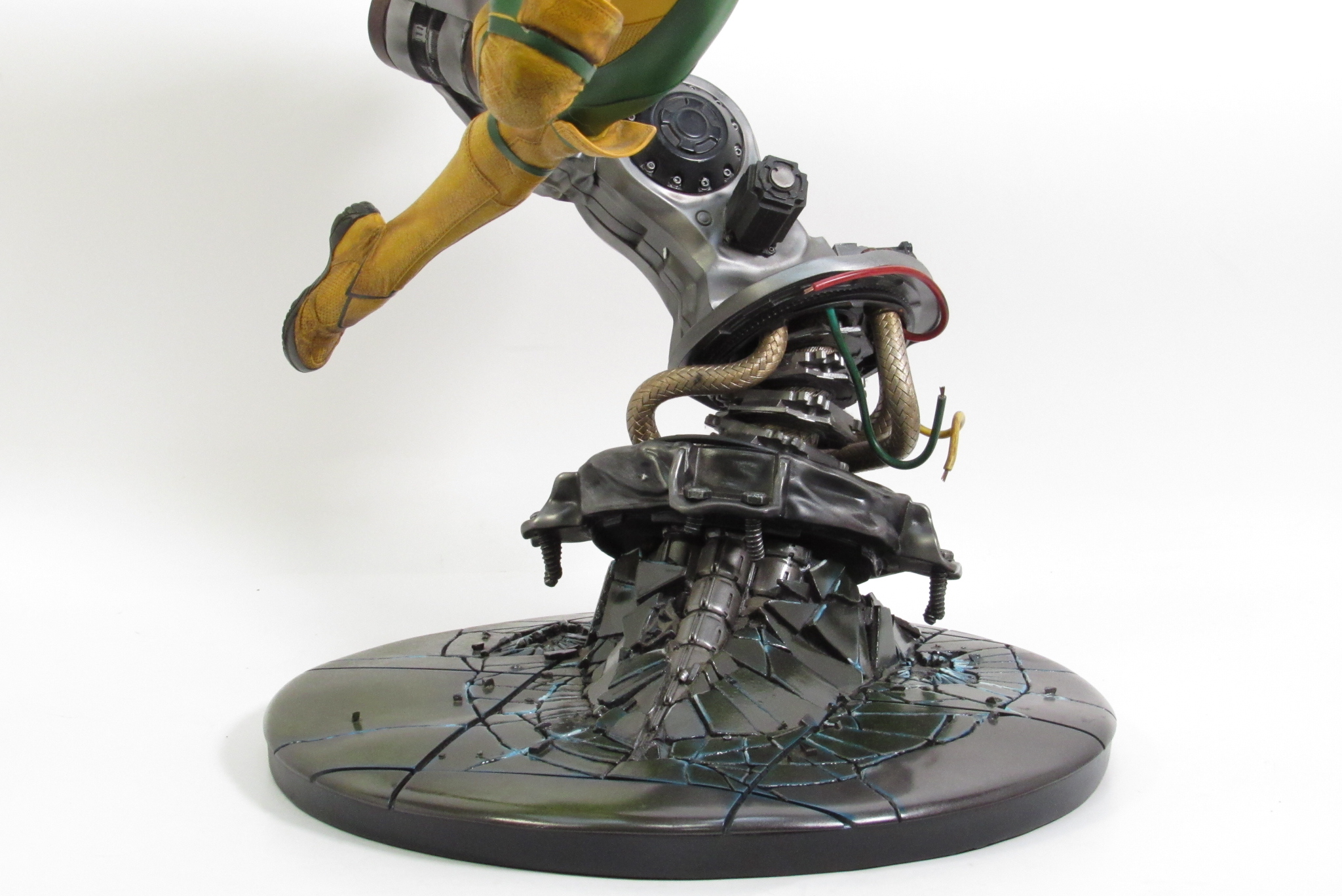 Measuring just over 22” tall, the Rogue Maquette defies gravity in this dynamic and exciting composition that features the mutant’s marvelous powers on display. Flying over a detailed Danger Room environment base, Rogue wrenches an intricate mechanical buzz saw from the floor, ready to take a swing at any unwelcome X-Mansion guests.