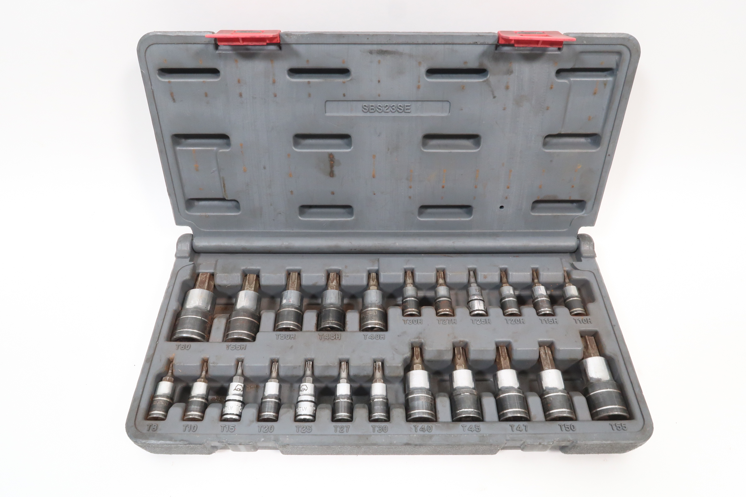 Comprehensive TORX bit socket set includes 1/4", 3/8" and 1/2" drive sizes without duplicate sizes.