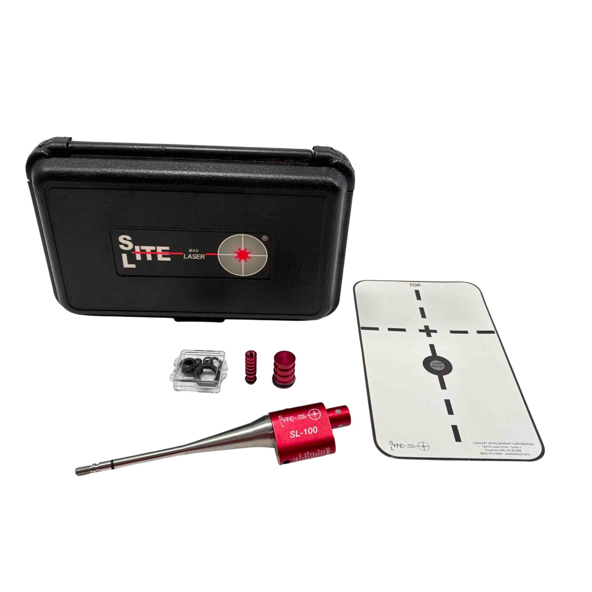 The SiteLite SL-100 Laser Boresighter System is a premium bore sighting tool designed for precision alignment of rifle and shotgun scopes. This kit includes the SL-100 laser device, assorted adapters, O-rings, a target, and a durable carrying case—everything you need for quick, accurate sighting without using up valuable ammunition. Perfect for hunters, shooters, and gunsmiths seeking reliable performance and easy setup.