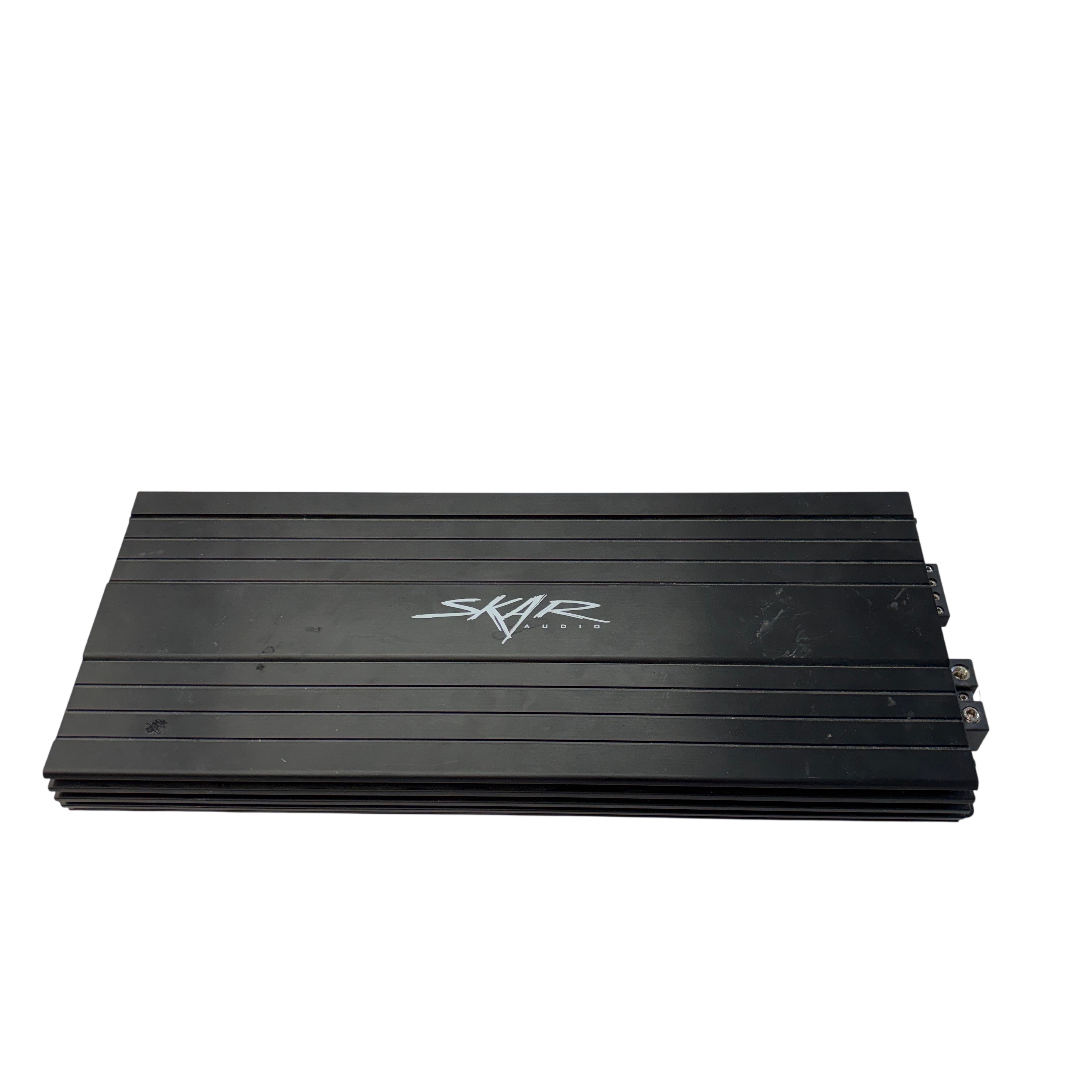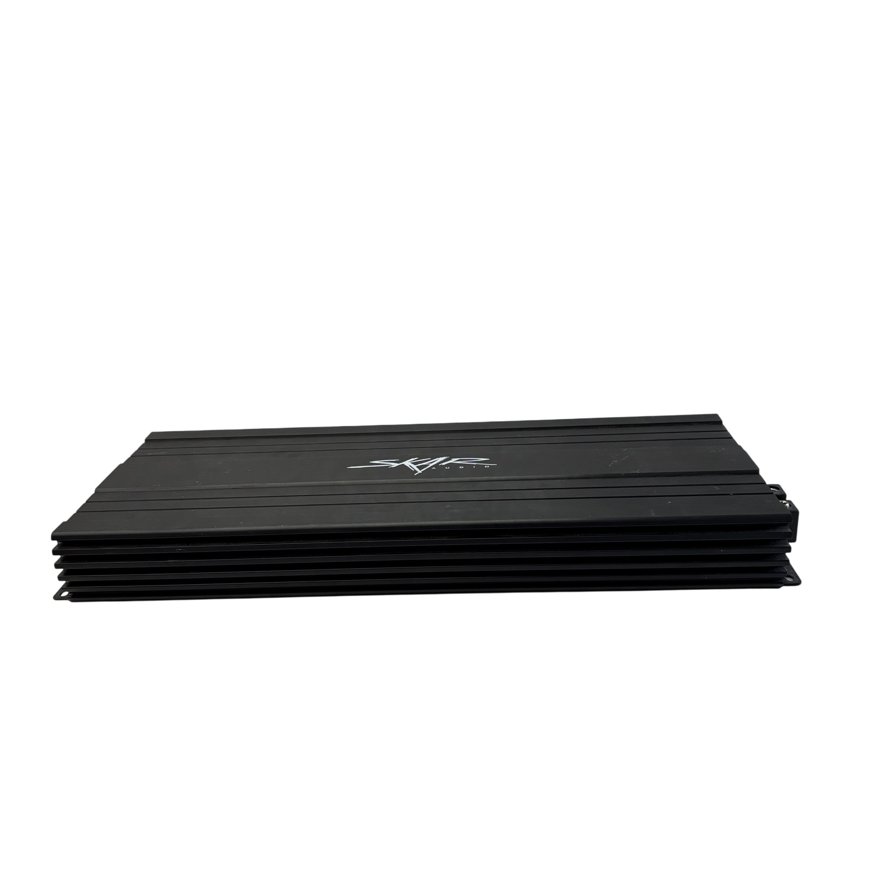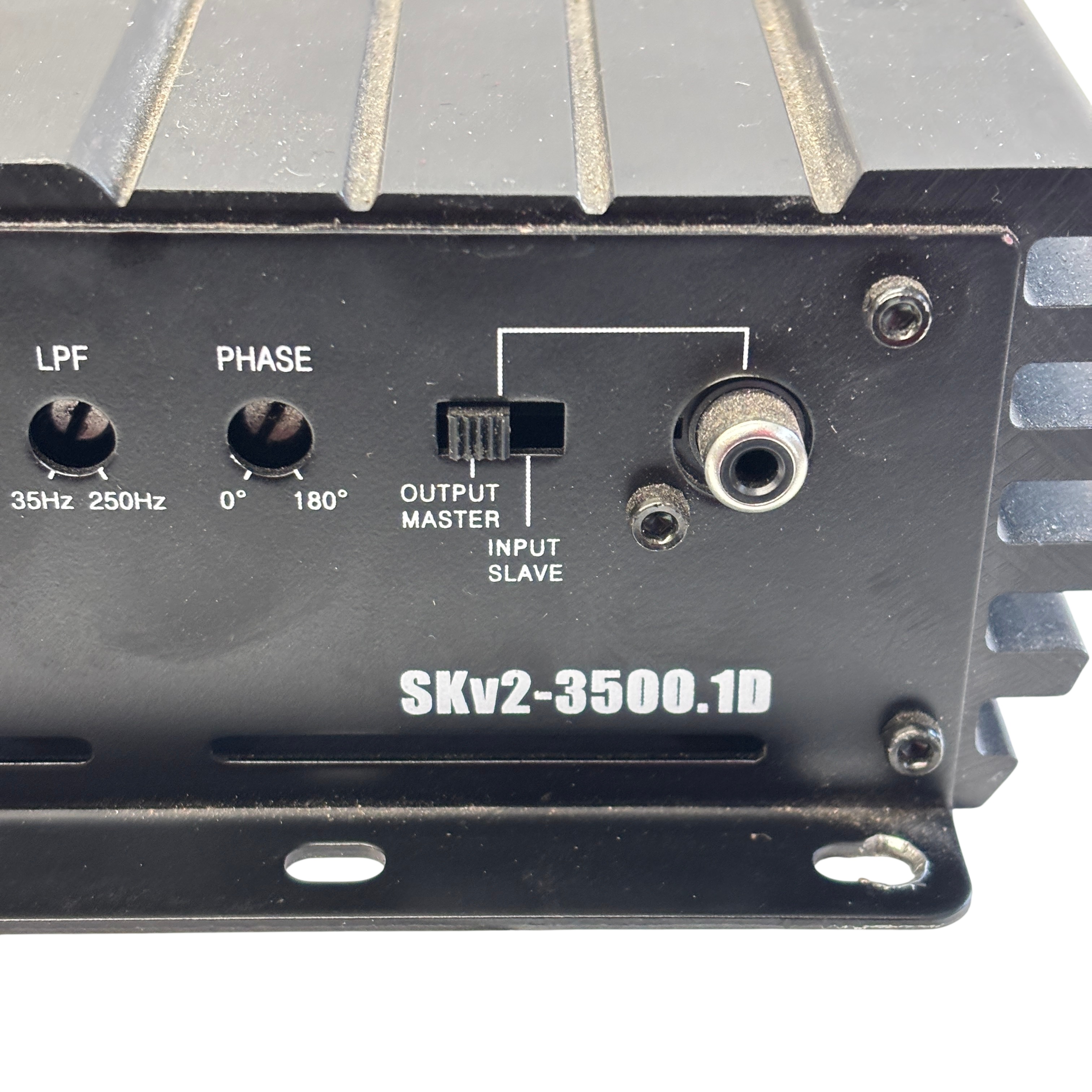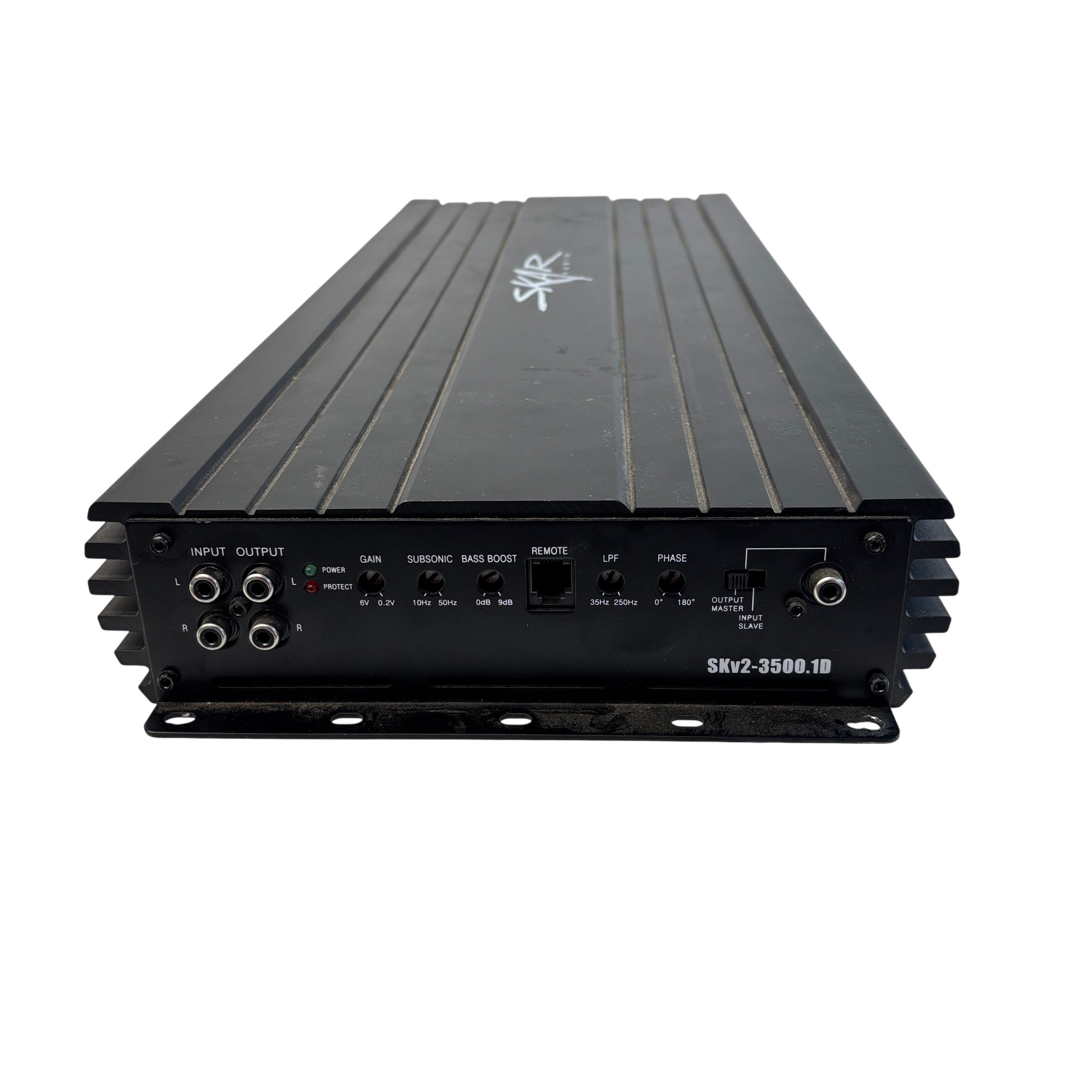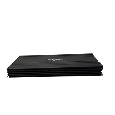 The Skar Audio SKv2-3500.1D Amplifier is a high-power mono amplifier designed for car audio subwoofer systems. Delivering up to 3500 watts peak power, it features adjustable low pass filters from 35Hz to 250Hz, phase control from 0° to 180°, and a bass boost of up to 9dB to enhance low-frequency output. The amplifier includes a subsonic filter to protect your subwoofer and a master/slave switch for easy integration with multiple amplifiers. Its compact black metal chassis measures approximately 14 inches in length, 7 inches in width, and 2 inches in height, making it suitable for various installation spaces. Ideal for car audio enthusiasts seeking powerful, customizable bass performance.