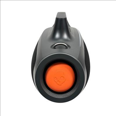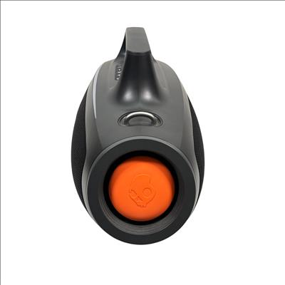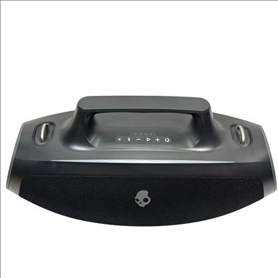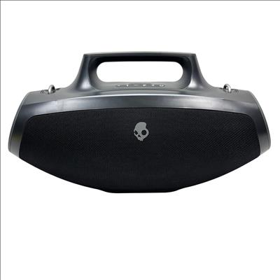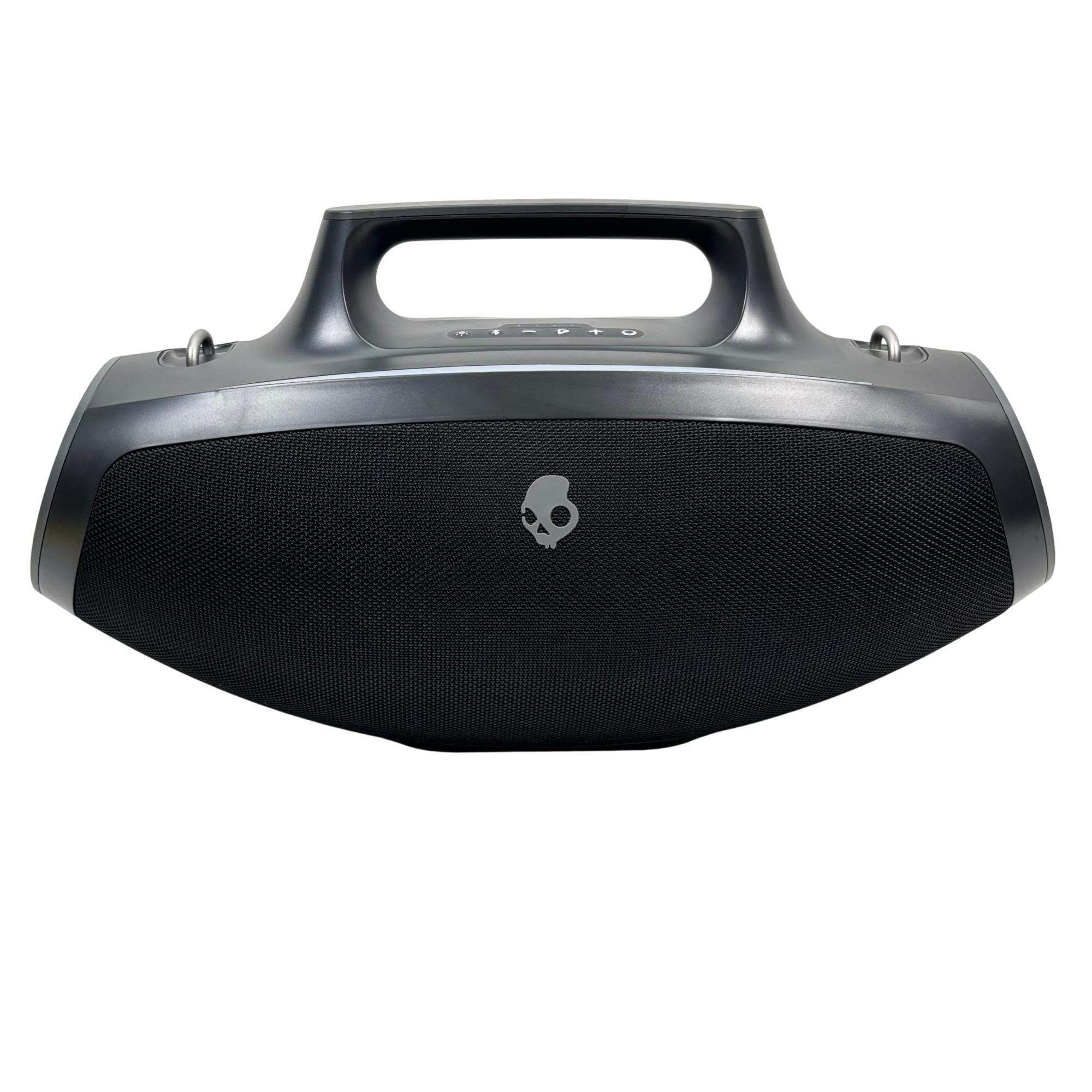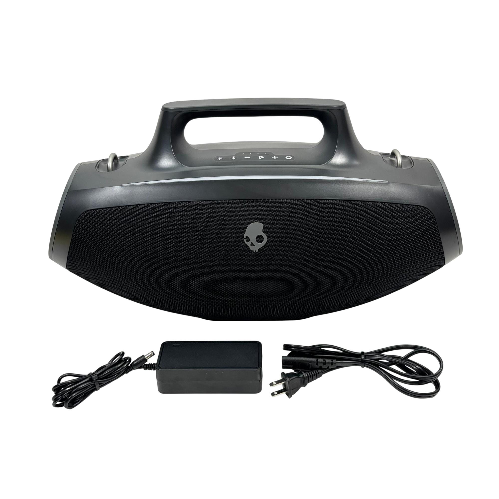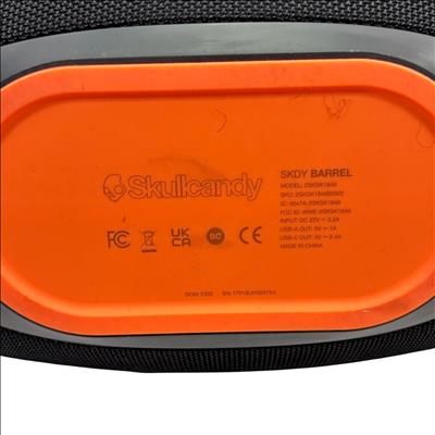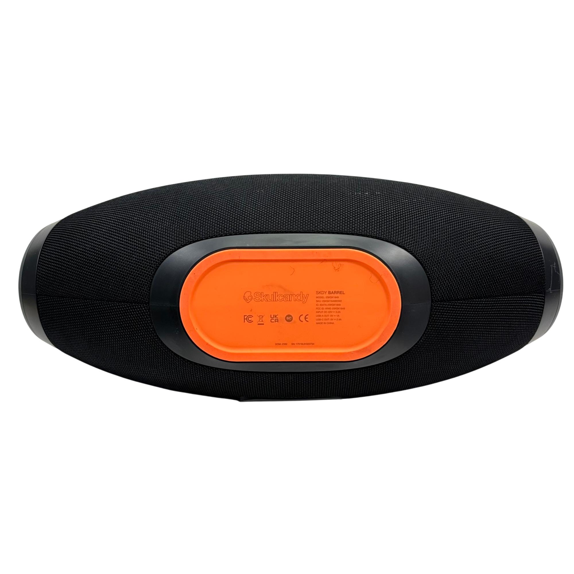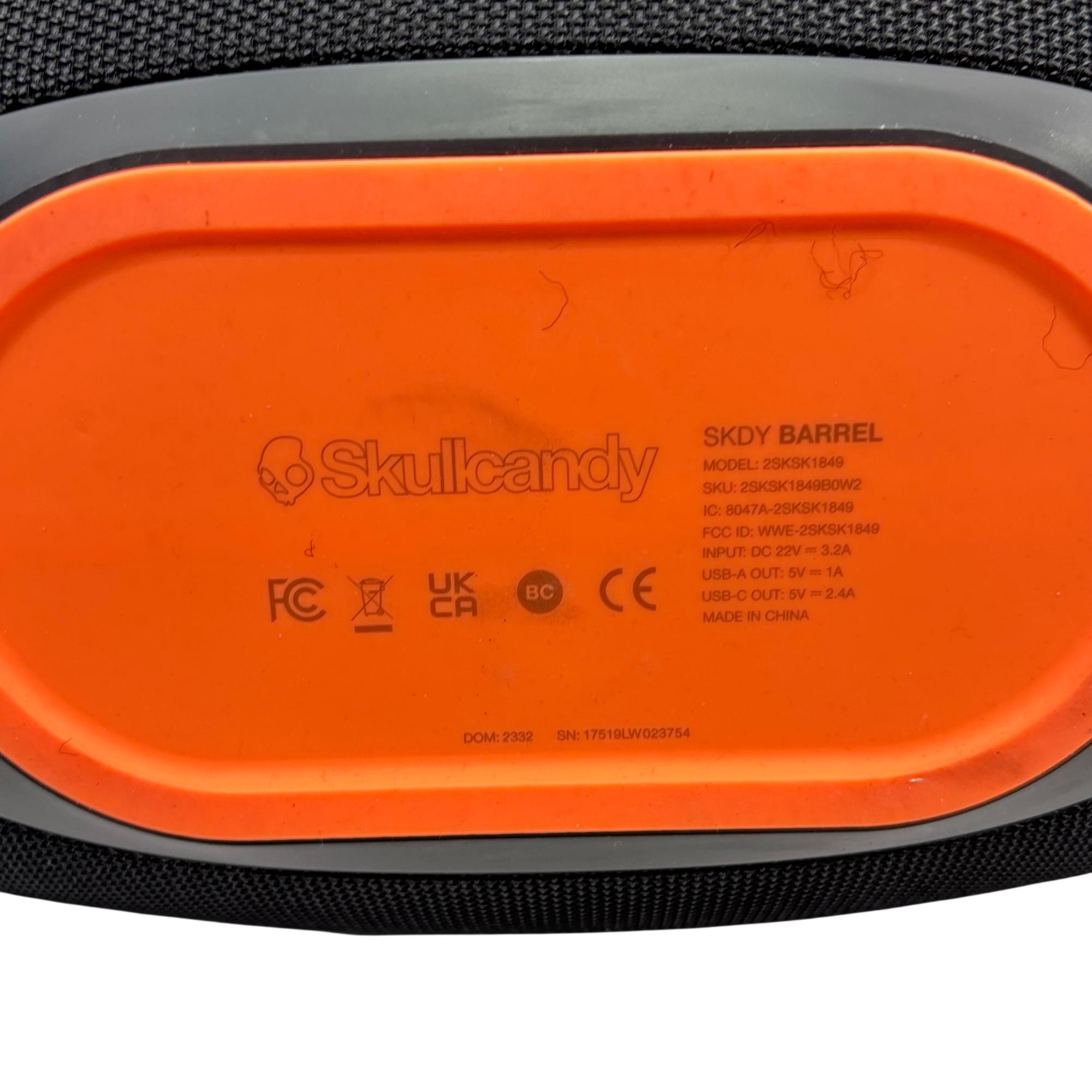 Skullcandy Barrel XT Bluetooth Boombox Speaker (Model: 2SKSK1849) offers powerful wireless audio with a rugged design featuring a distinctive white skull logo on a black finish. This portable speaker includes multiple charging outputs, water resistance, and a sturdy handle for easy transport, making it ideal for both indoor and outdoor use.