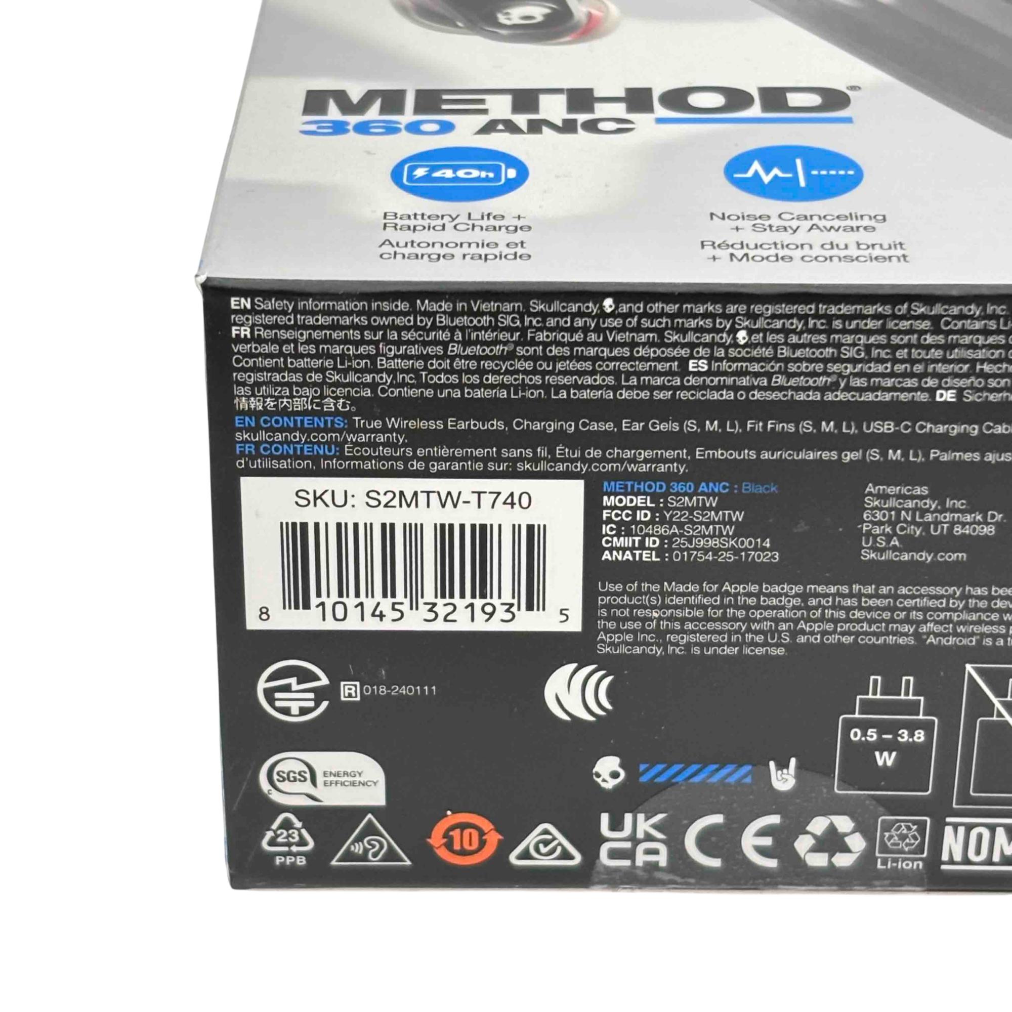 Skullcandy Method 360 ANC True Wireless Earbuds (Model: S2MTW-T740, Sound by Bose) feature advanced active noise cancellation, up to 40 hours of battery life with rapid charging, and Stay Aware mode for situational awareness. These earbuds deliver premium sound quality co-engineered with Bose and offer customizable settings via the Skull-iQ app. Designed for comfort and performance, they come with multiple ear tips and fit fins for a secure fit.