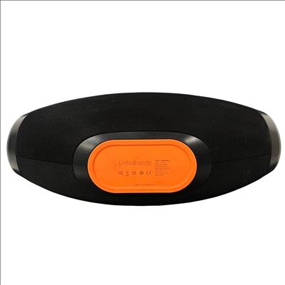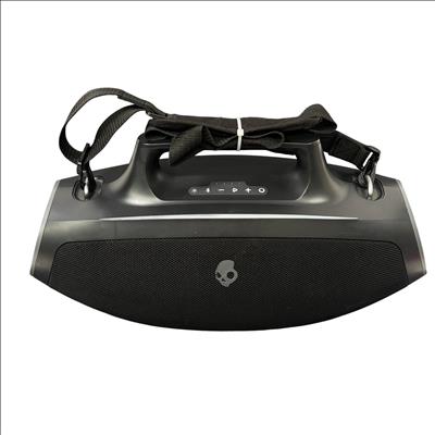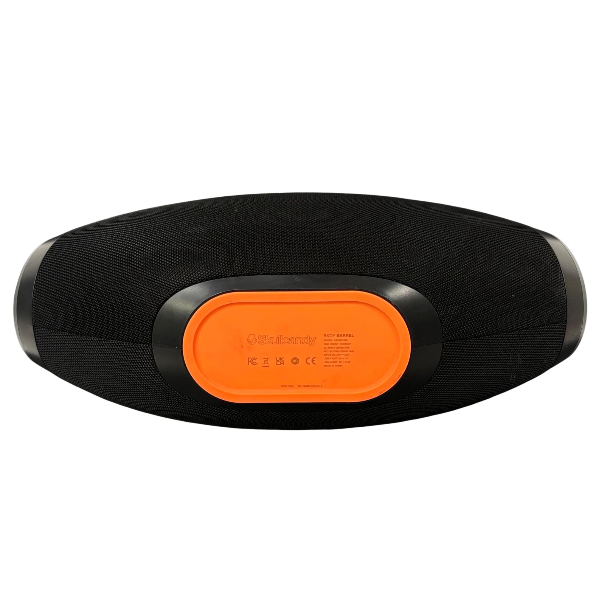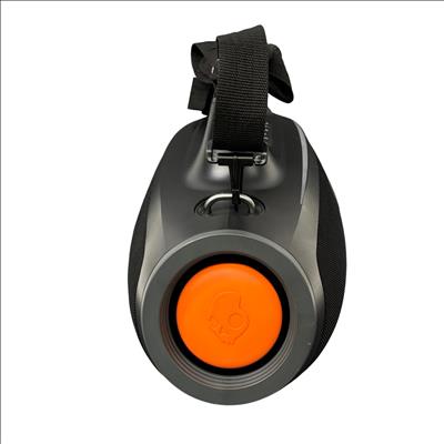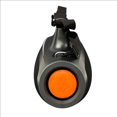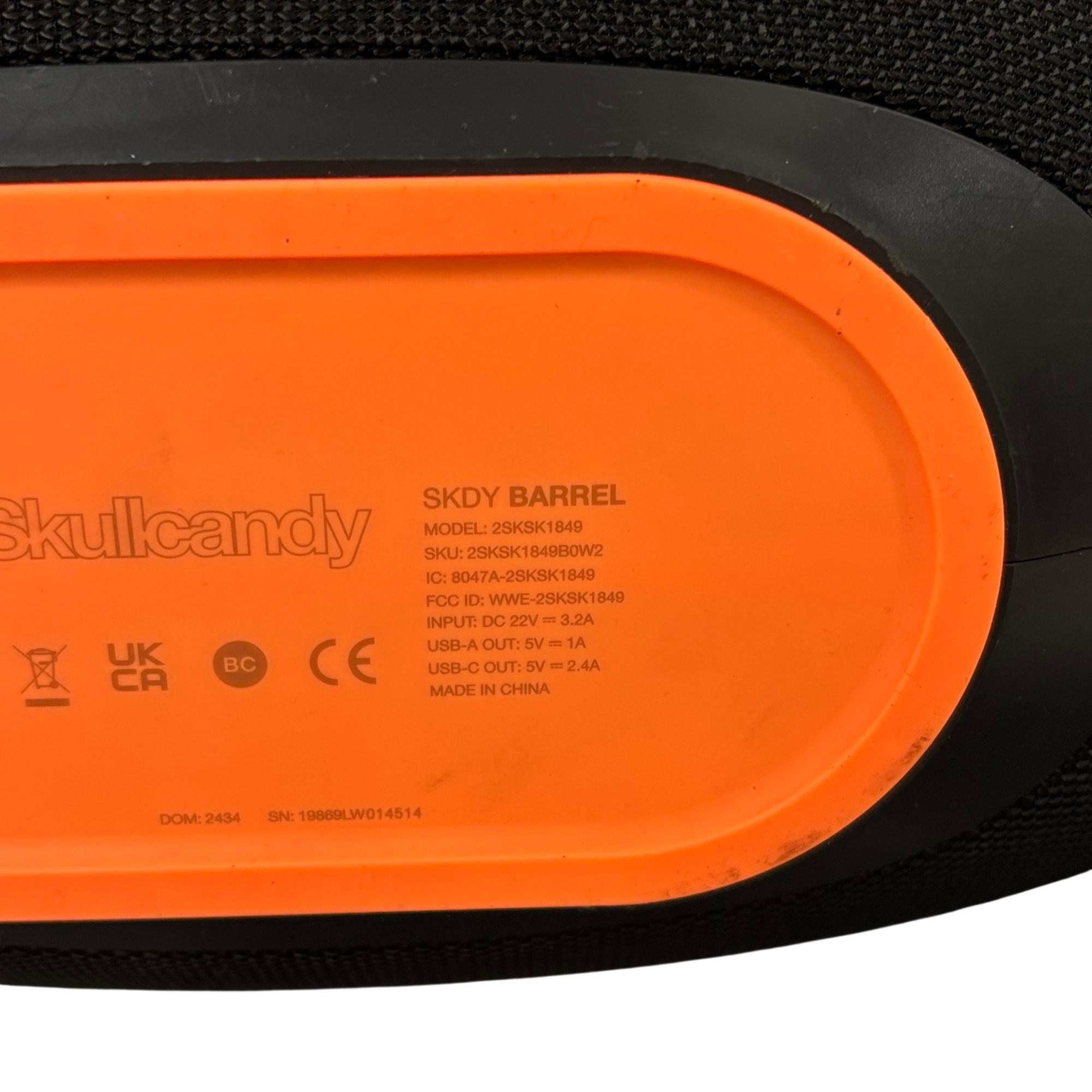 Skullcandy SKDY Barrel IPX5 Bluetooth Portable Boombox Speaker offers powerful wireless audio with a robust black and orange design featuring a convenient strap for easy portability. This speaker supports multiple USB outputs and water-resistant construction, making it ideal for outdoor use and extended playback in various environments.