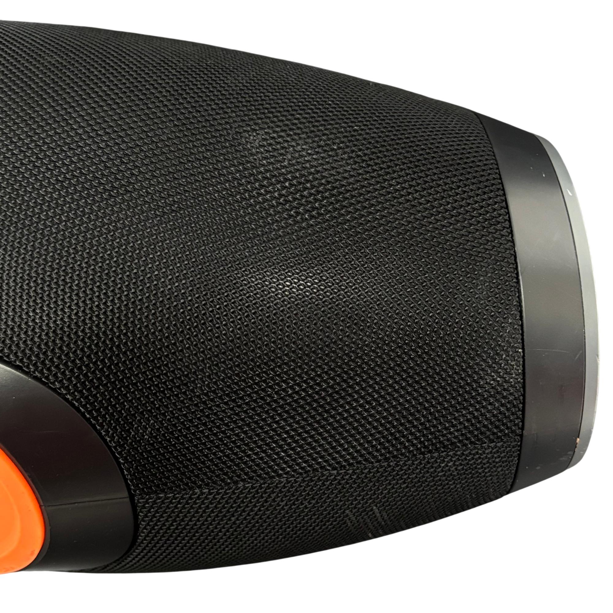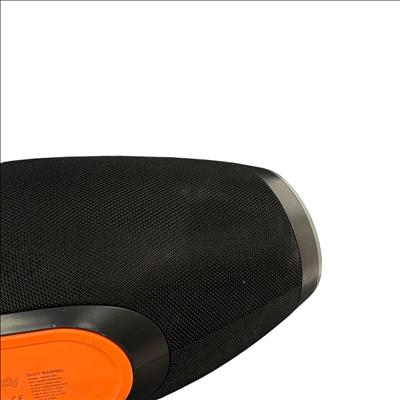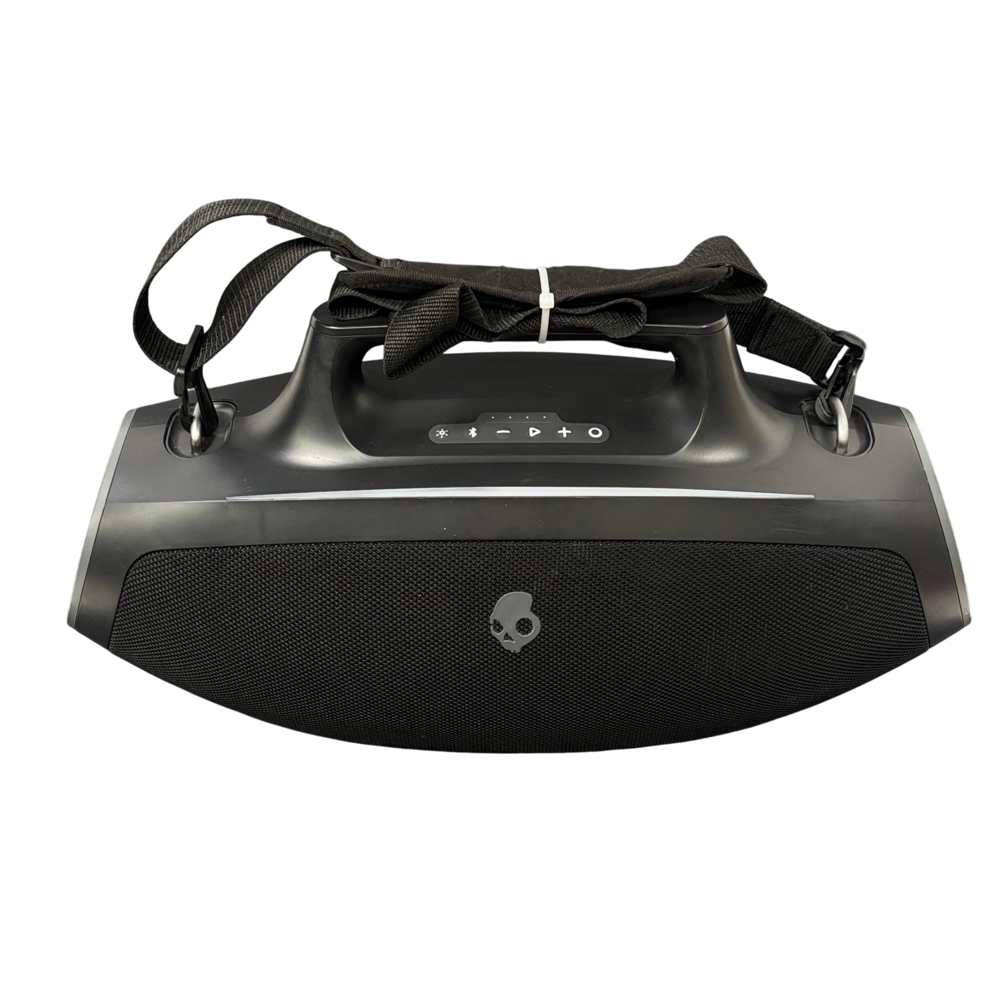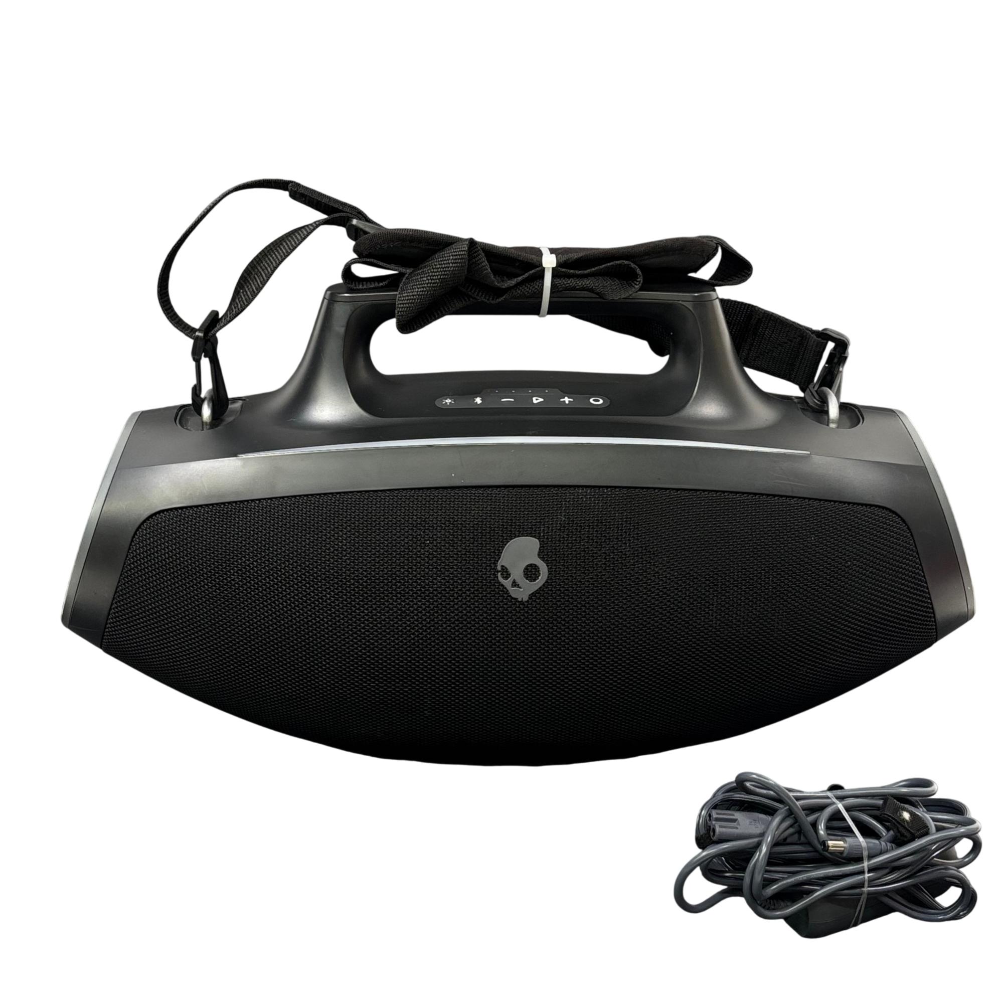 Skullcandy SKDY Barrel IPX5 Bluetooth Portable Boombox Speaker offers powerful wireless audio with a robust black and orange design featuring a convenient strap for easy portability. This speaker supports multiple USB outputs and water-resistant construction, making it ideal for outdoor use and extended playback in various environments.