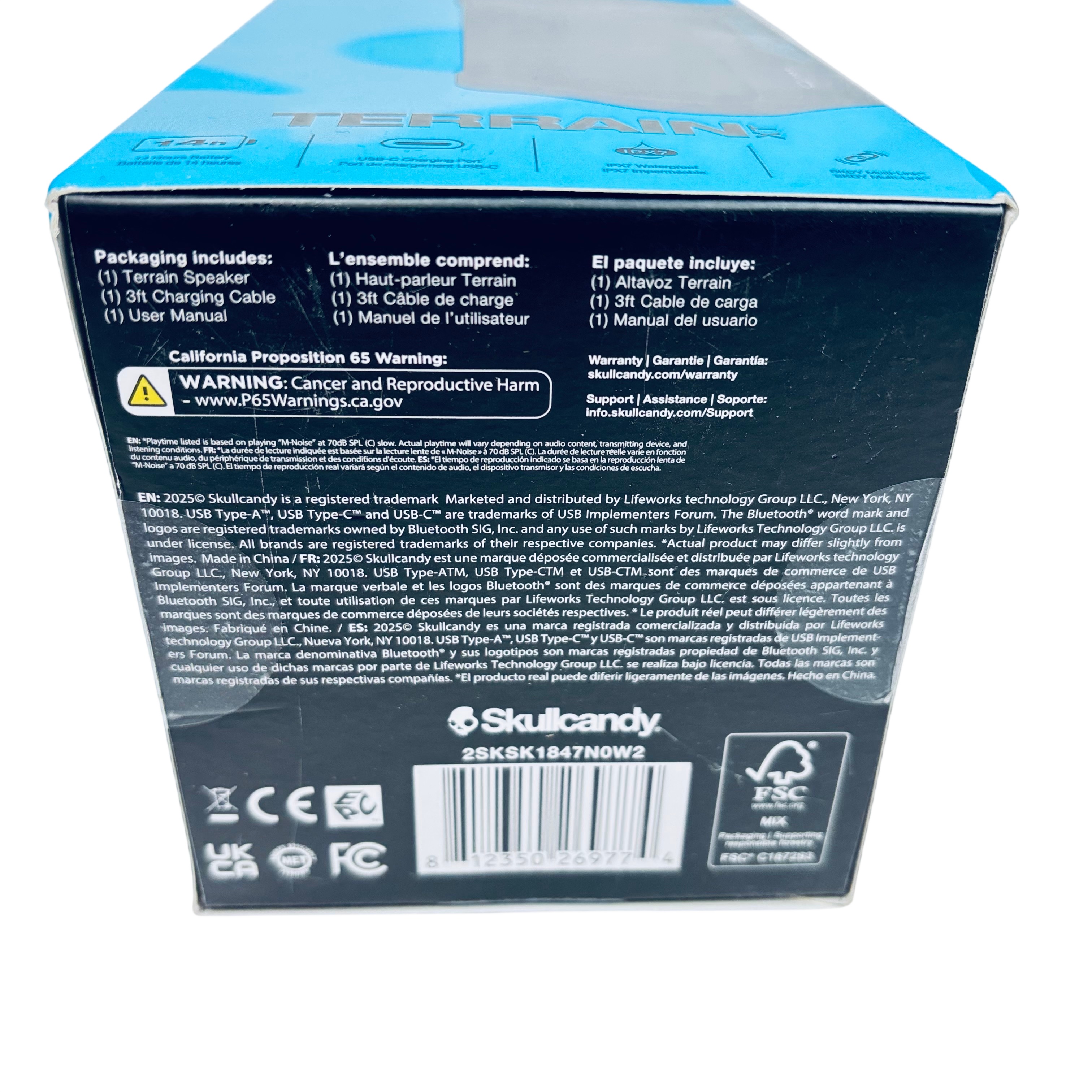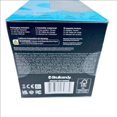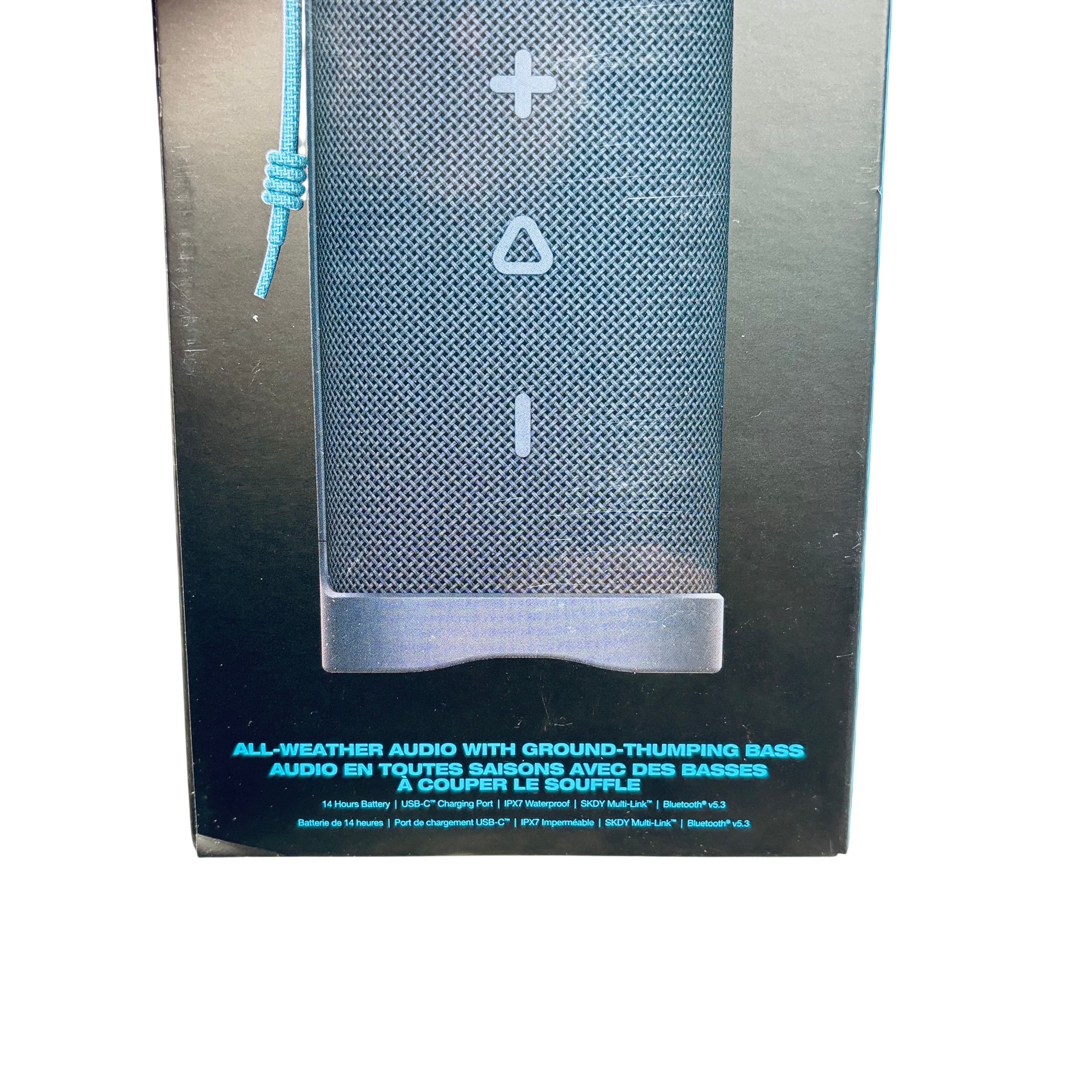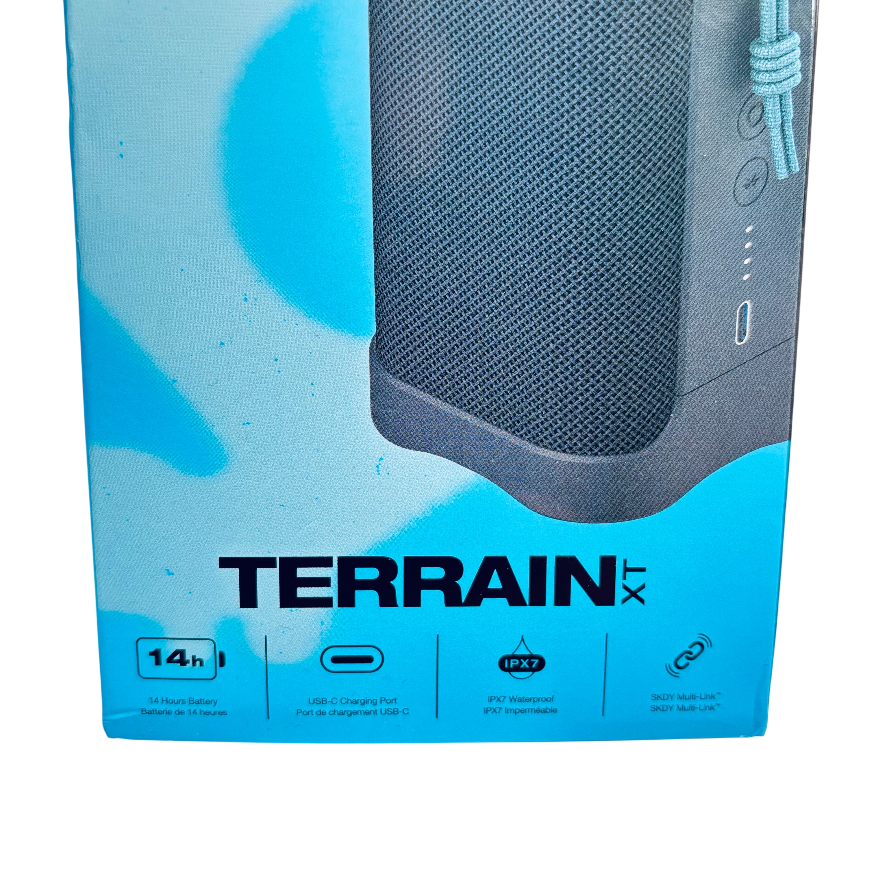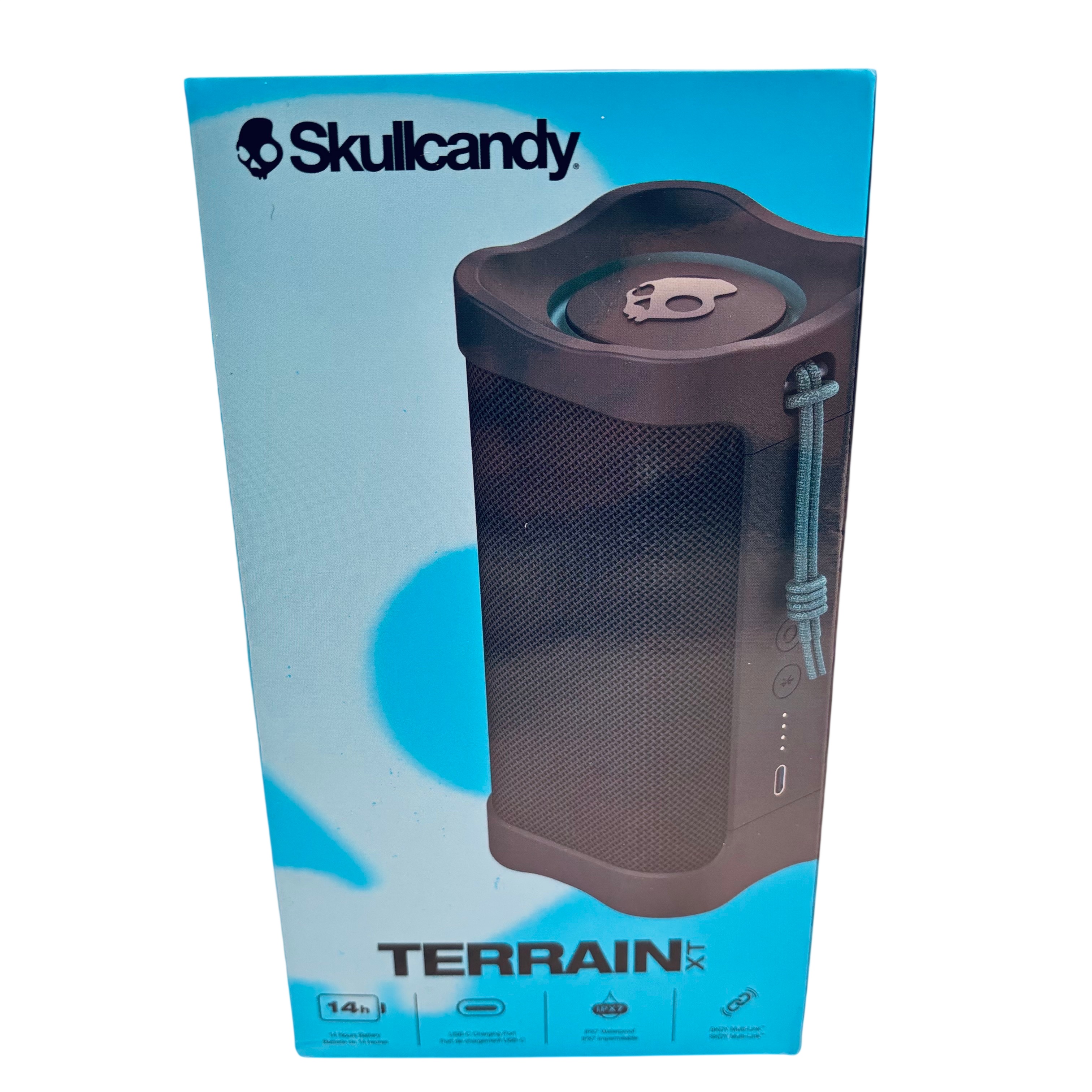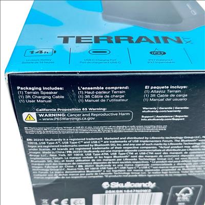 The Skullcandy Terrain XT Bluetooth Speaker offers robust sound with a durable design, perfect for outdoor and indoor use. Featuring a 14-hour battery life and USB-C charging port, this speaker ensures long-lasting playtime and convenient recharging. Its IPX7 waterproof rating protects against water immersion, making it ideal for rugged environments. The SKDY Multi-Link Bluetooth technology allows seamless connectivity to multiple devices, enhancing your listening experience. The package includes the Terrain Speaker, a 3-foot charging cable, and a user manual.