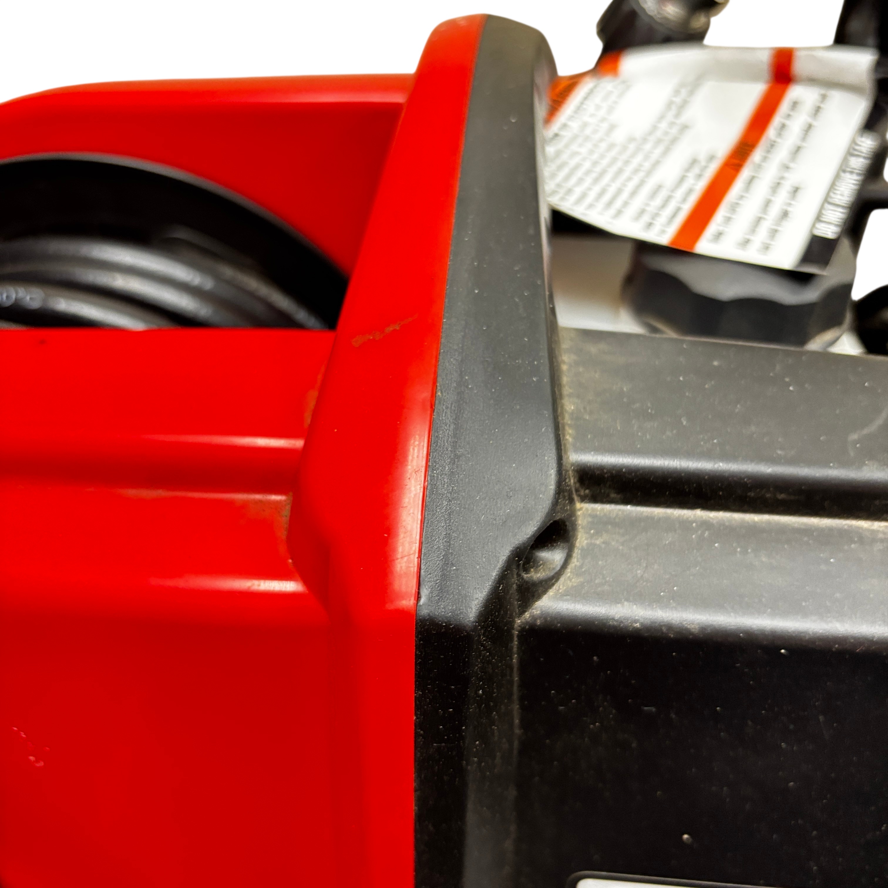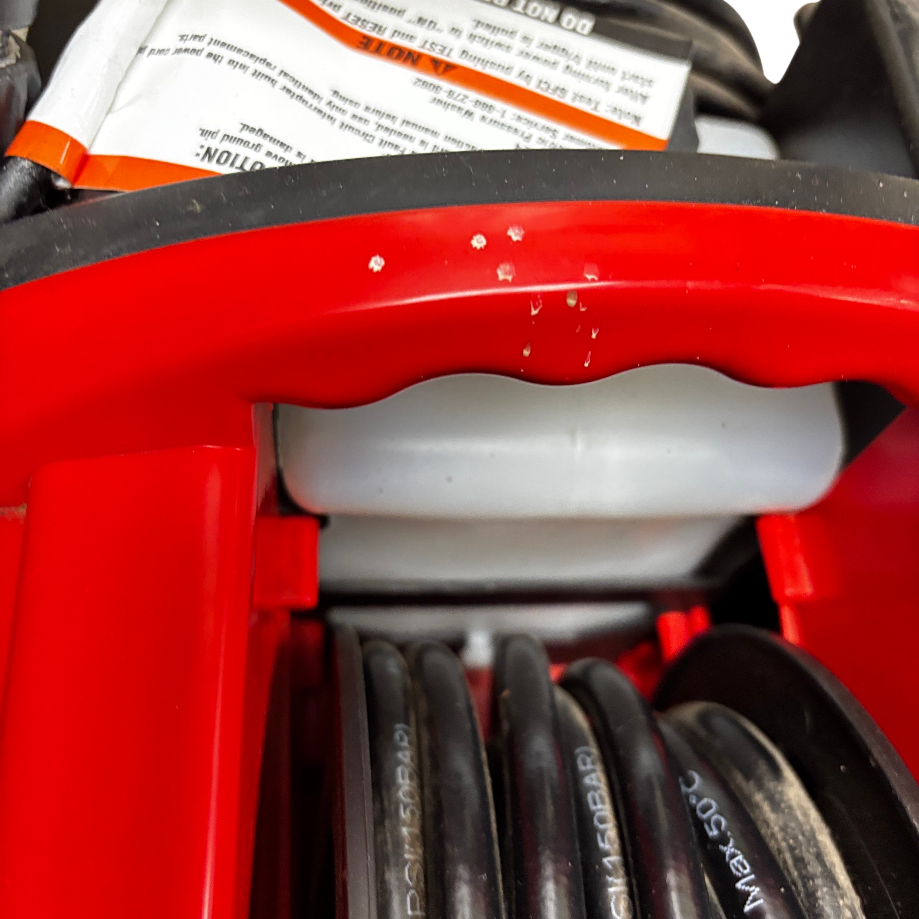 Previously owned. This Pressure washer has been tested and works well and is in pretty good condition that has tiny specks, light dirt staining and slight wear on the wheels. See photos for details.