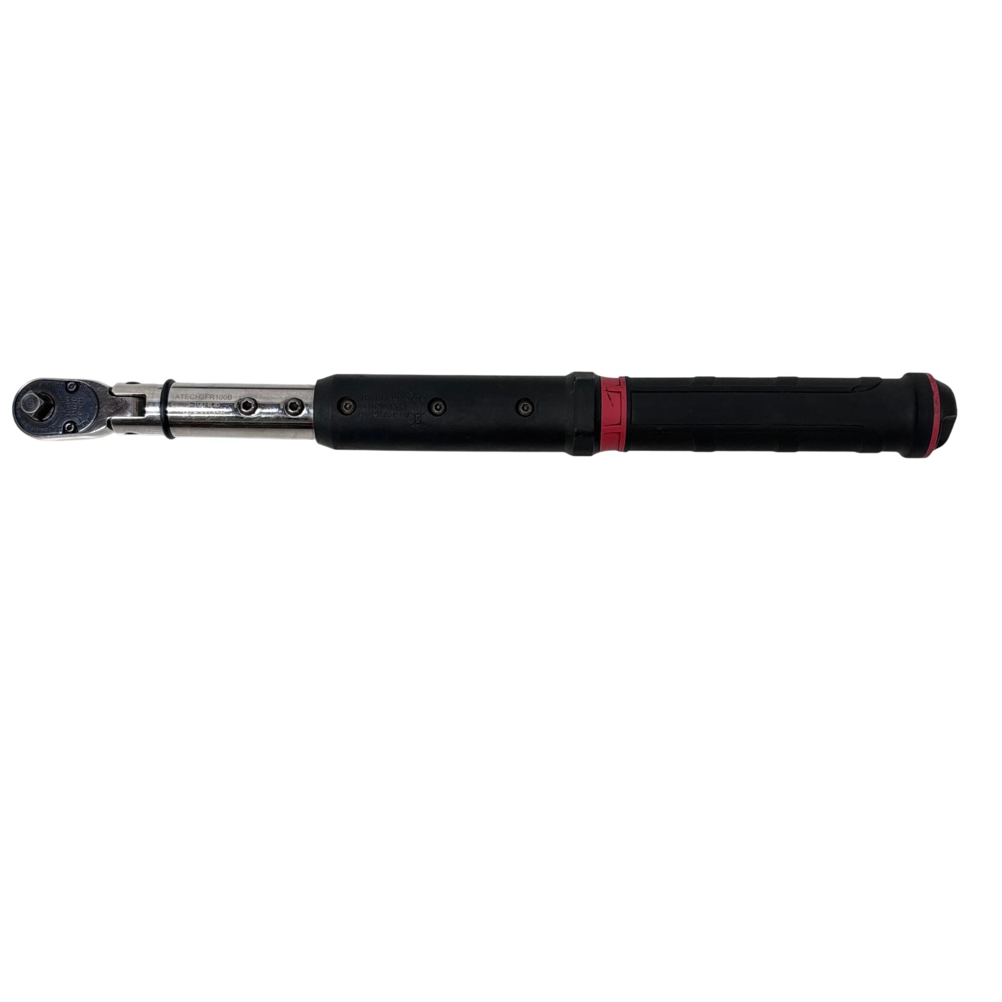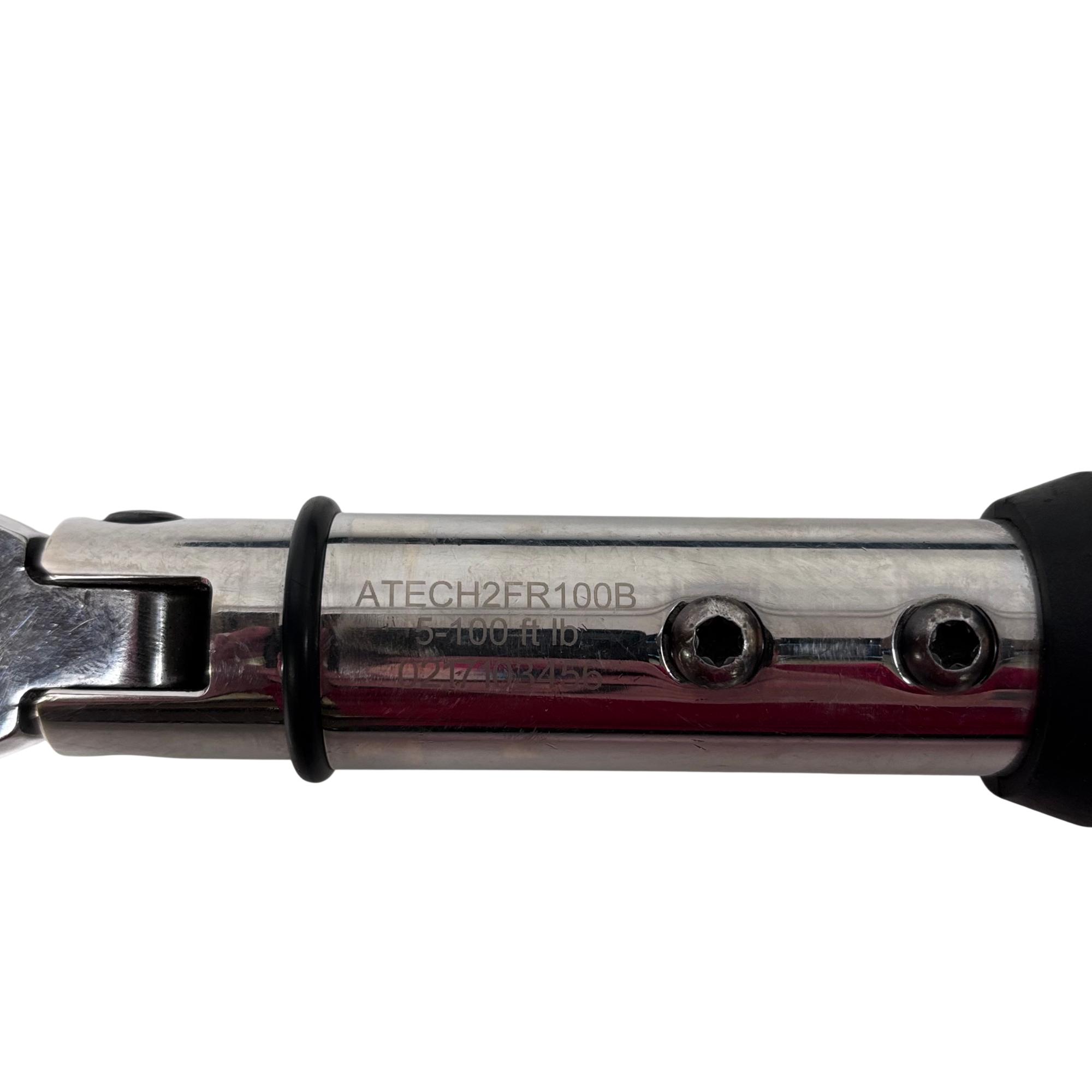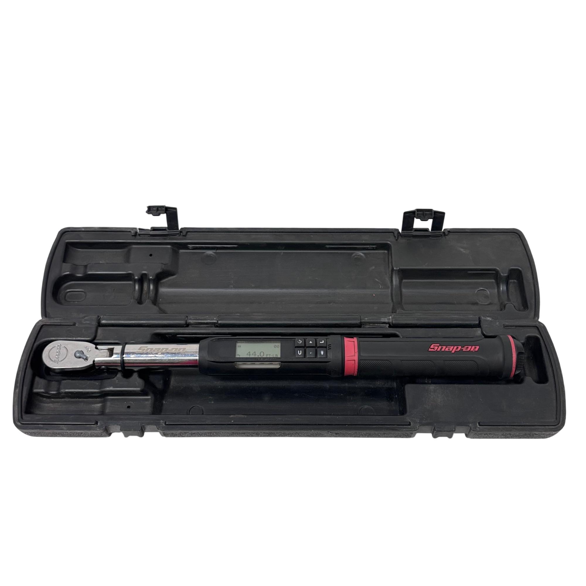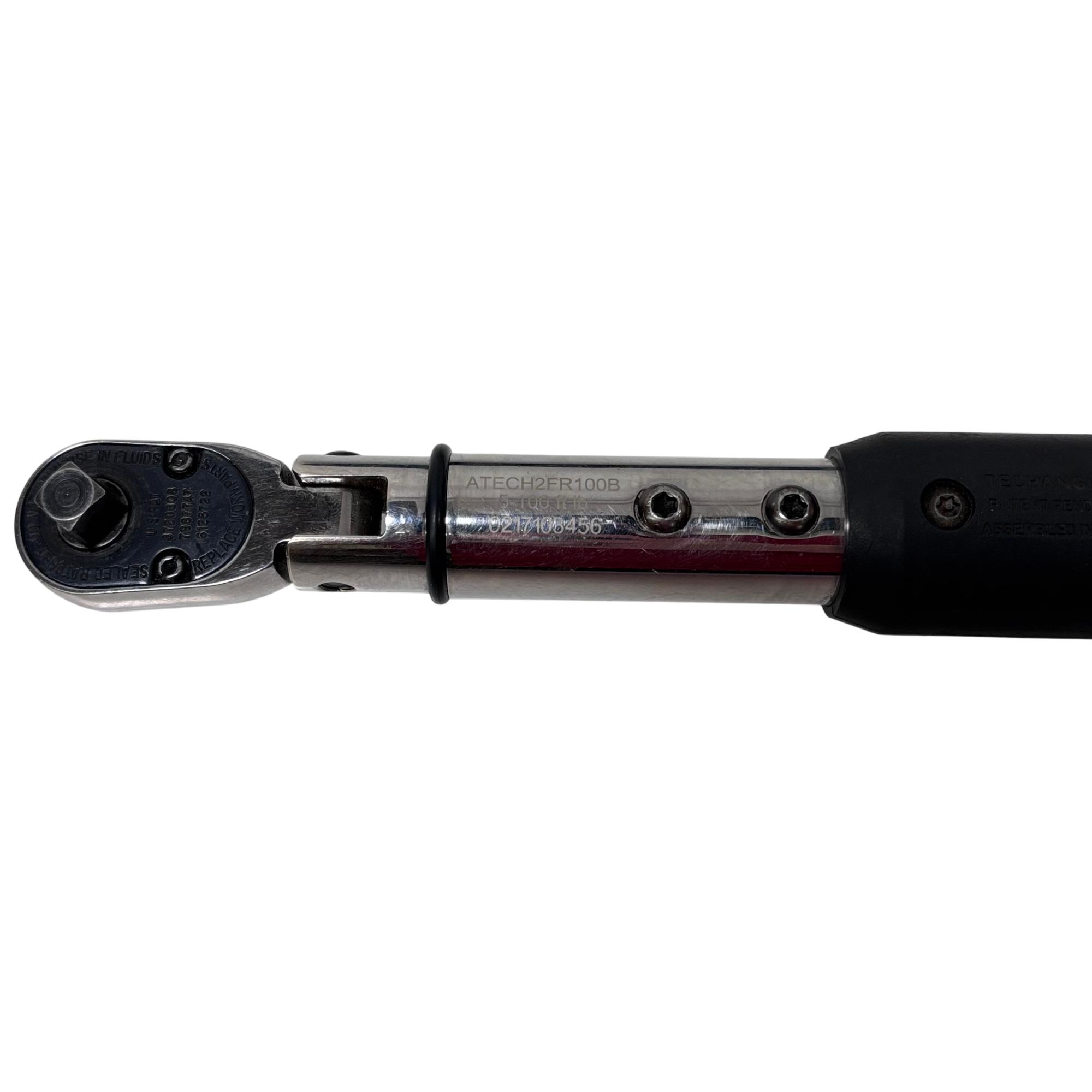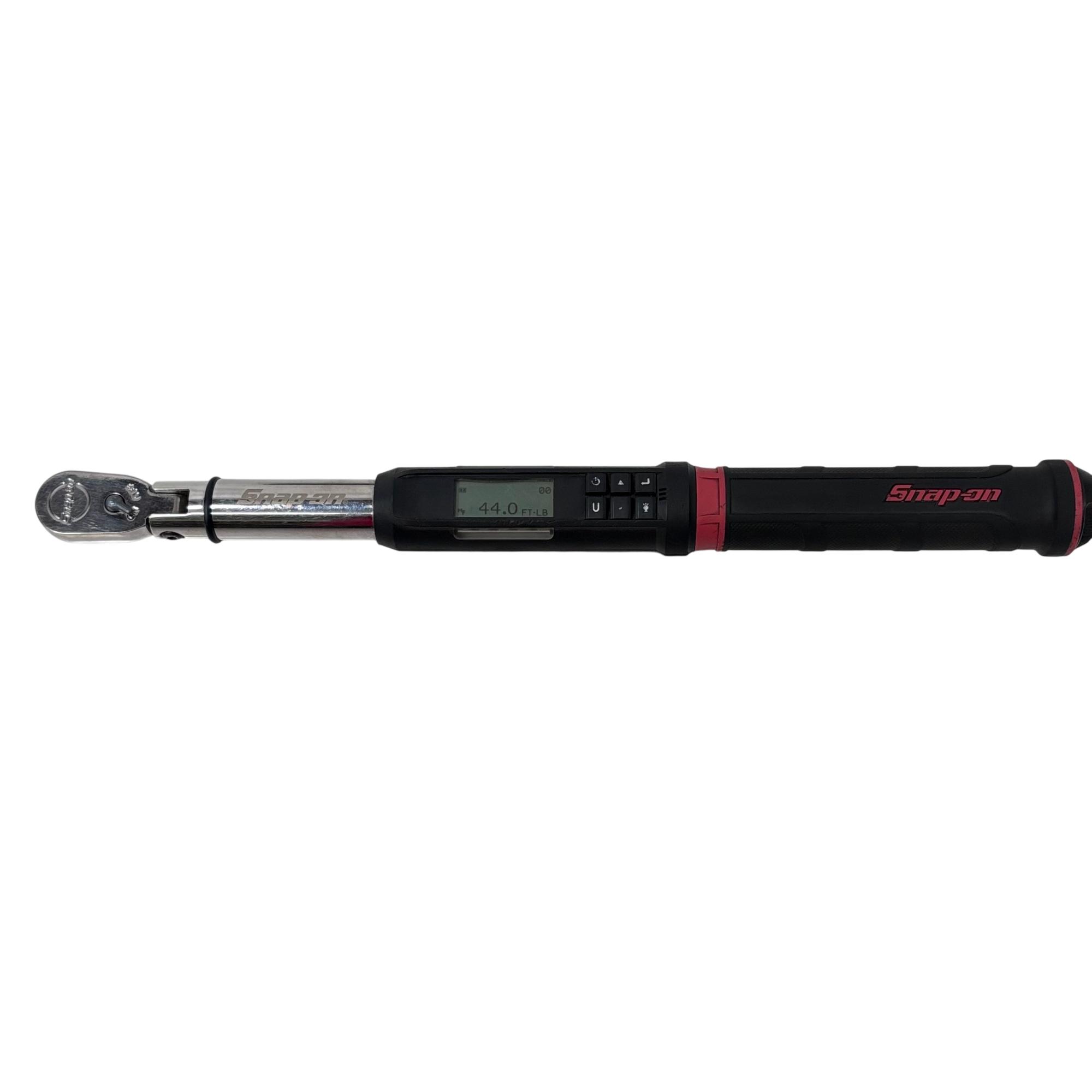 Snap-on ATECH2FR100B 3/8" Drive Flex-Head TechAngle Digital Torque Wrench offers precise torque control with a flexible head design for improved access in tight spaces. Featuring a digital display for accurate readings and an ergonomic handle, this wrench delivers torque settings from 5 to 125 ft-lb, making it ideal for professional automotive and mechanical applications.