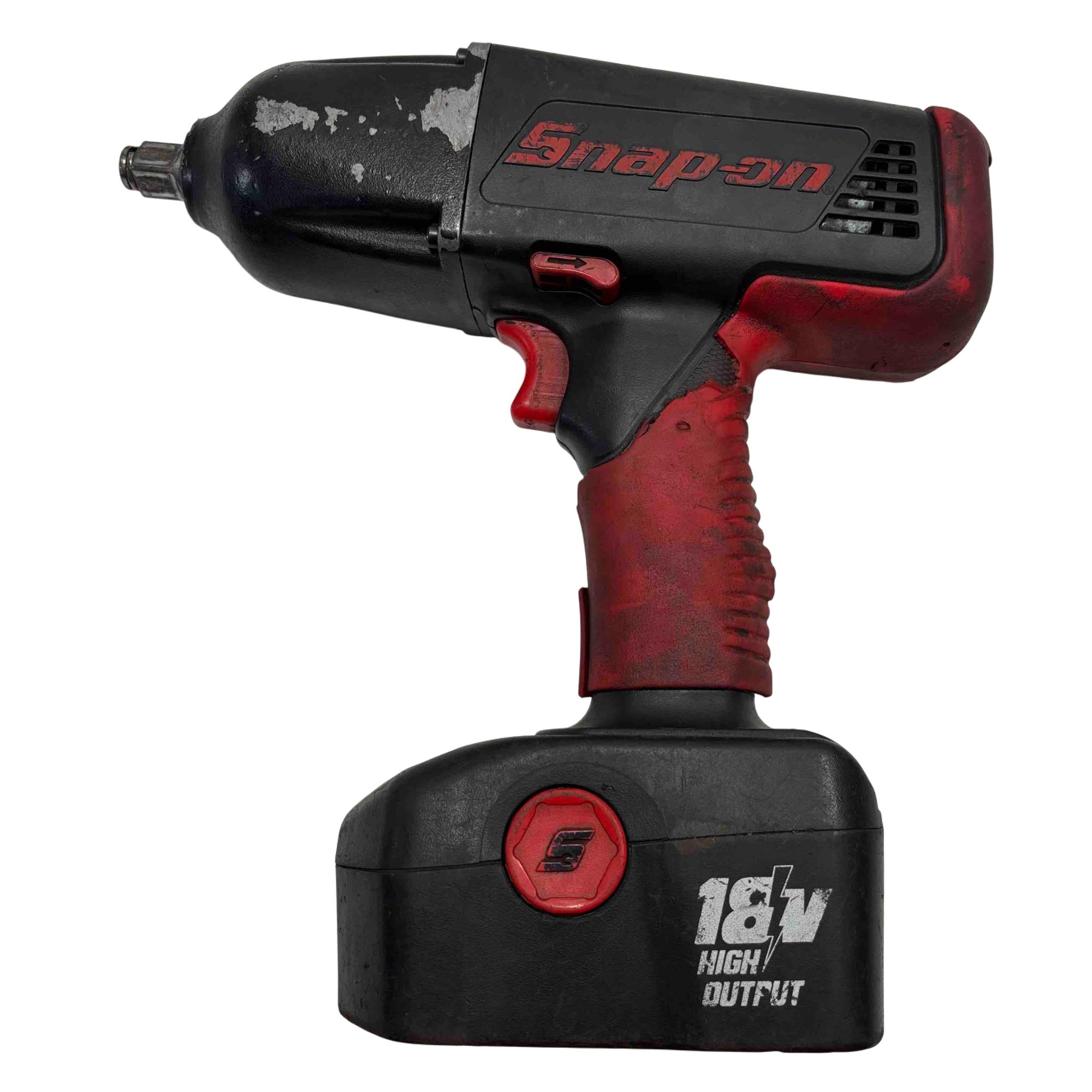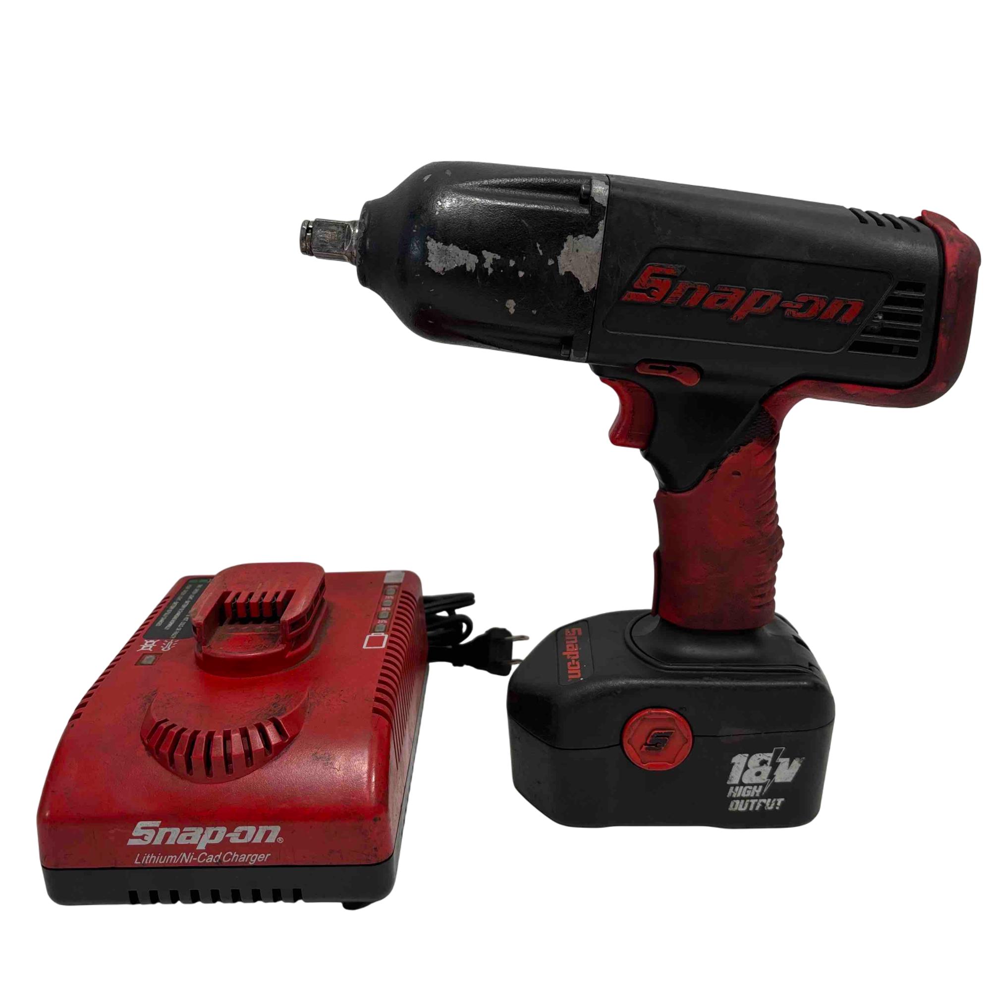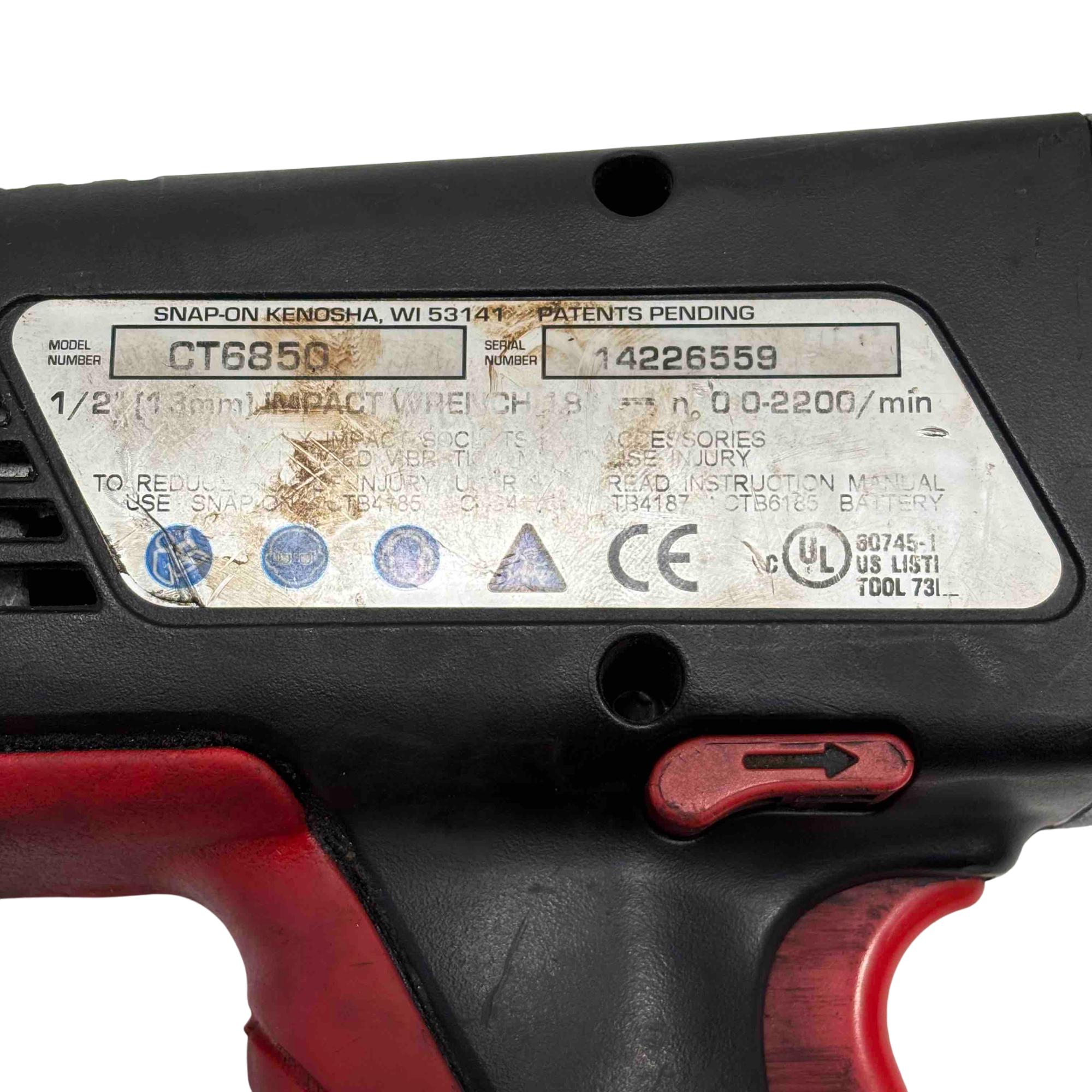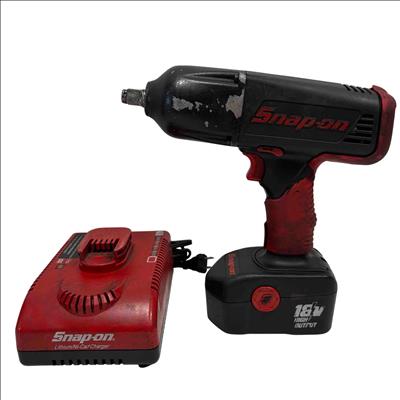 The Snap-on CT6850 18V Cordless 1/2" Impact Wrench features a powerful cordless design ideal for heavy-duty fastening and loosening tasks. This red and black impact wrench delivers high torque and durability, paired with a charger and battery for versatile power management.