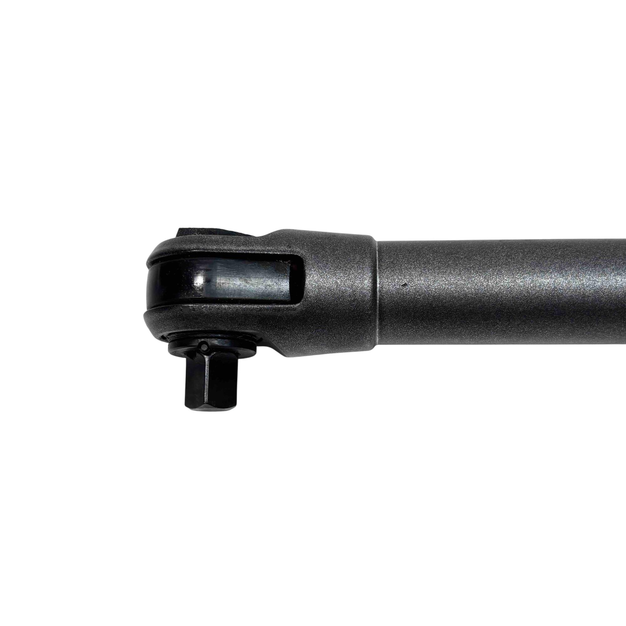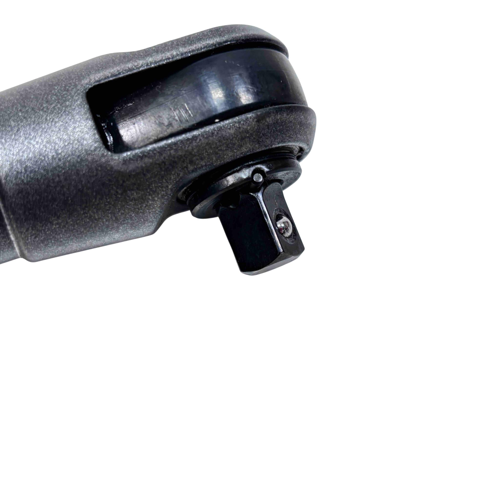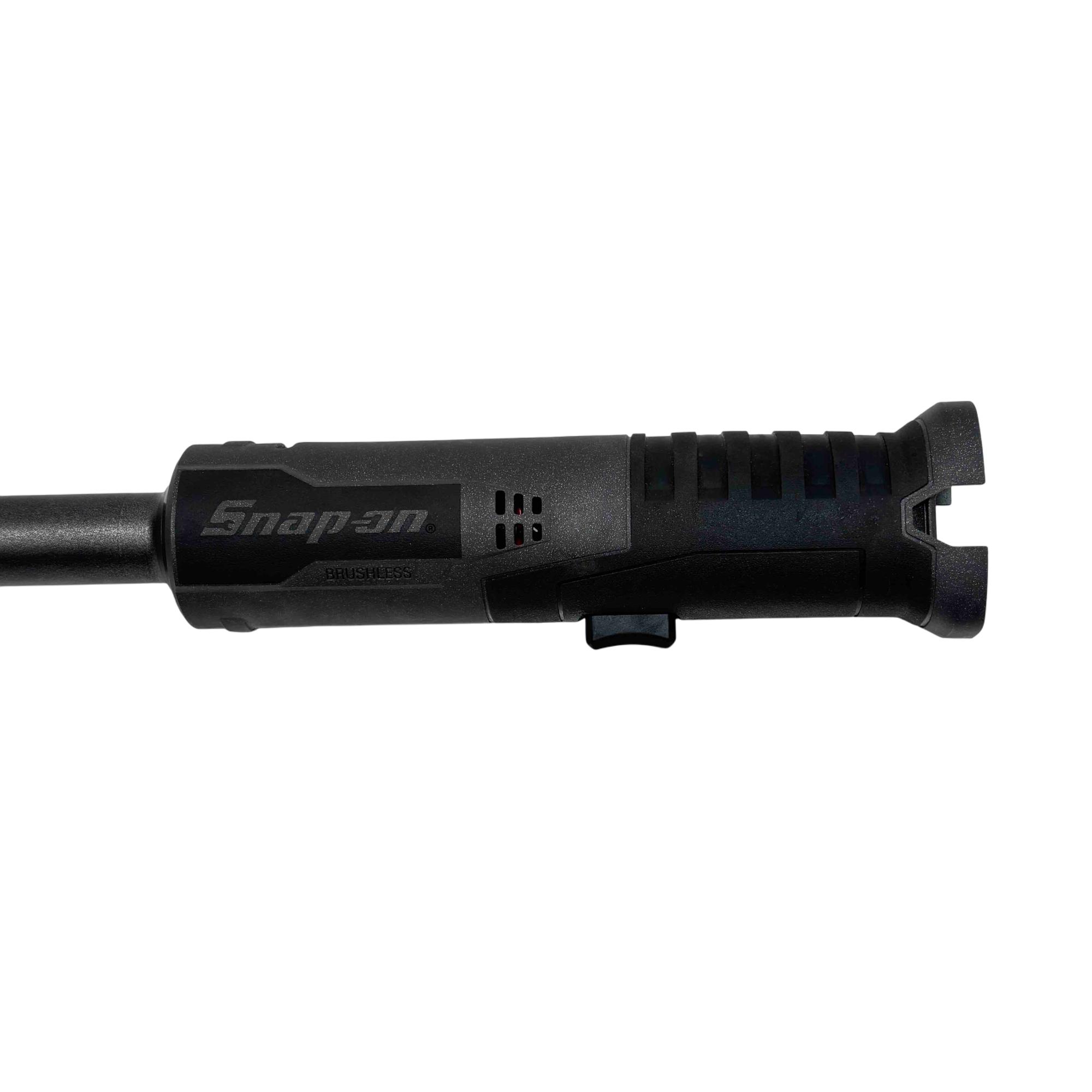A 14.4V 3/8" lithium-ion cordless long-neck ratchet designed for improved access and efficiency. Its 6" extended neck allows for reaching tight spaces, and it delivers 60 ft-lb of torque to remove stubborn fasteners. It also provides up to 158 ft-lb of manual torque for loosening rusty bolts. With a free speed of 275 RPM and a variable-speed trigger, the tool offers precise control and fast performance. The cushioned grip handle minimizes user fatigue, while the large, greased forward/reverse knob helps lubricate the head. Additional features include an integrated LED headlight for better visibility and a brushless motor for enhanced durability.