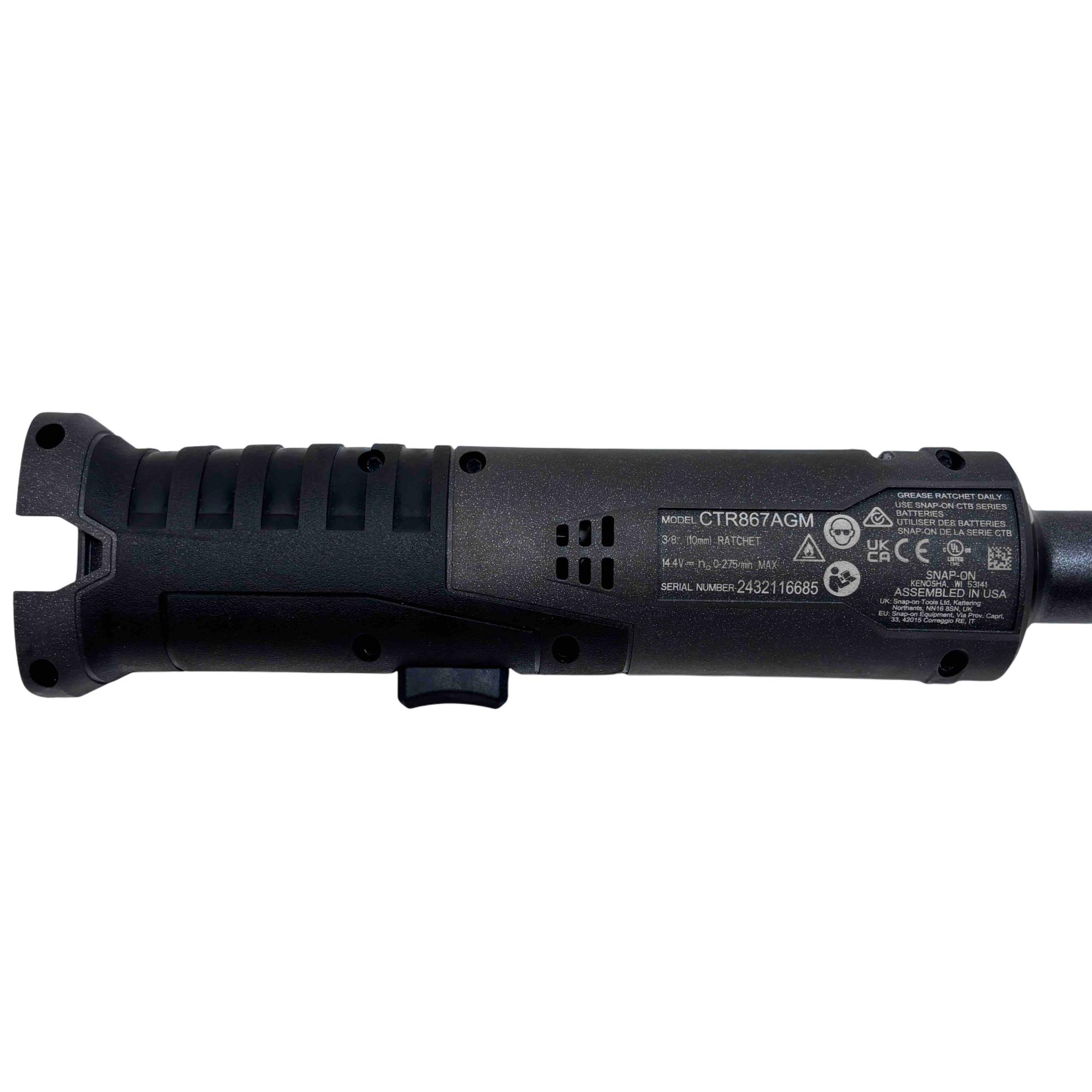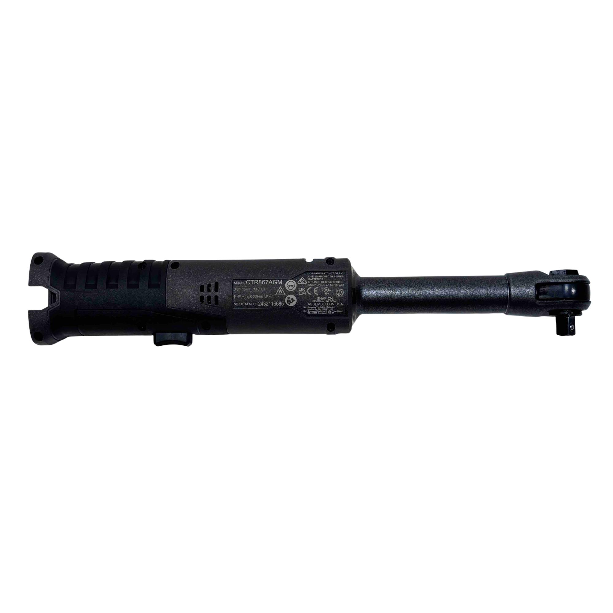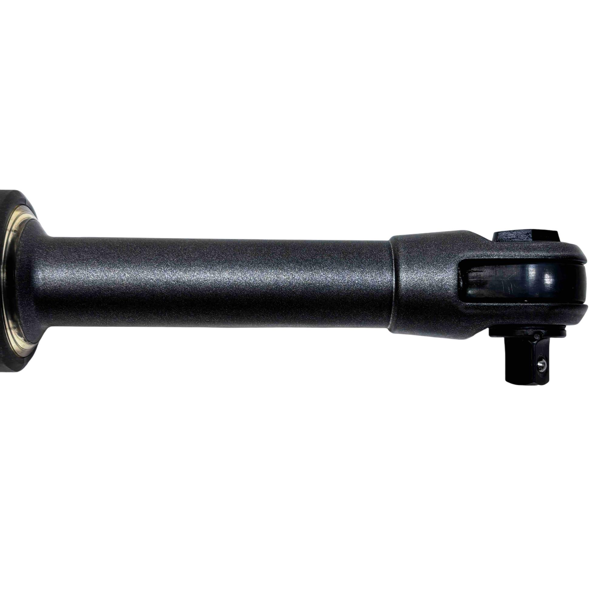 A 14.4V 3/8" lithium-ion cordless long-neck ratchet designed for improved access and efficiency. Its 6" extended neck allows for reaching tight spaces, and it delivers 60 ft-lb of torque to remove stubborn fasteners. It also provides up to 158 ft-lb of manual torque for loosening rusty bolts. With a free speed of 275 RPM and a variable-speed trigger, the tool offers precise control and fast performance. The cushioned grip handle minimizes user fatigue, while the large, greased forward/reverse knob helps lubricate the head. Additional features include an integrated LED headlight for better visibility and a brushless motor for enhanced durability.