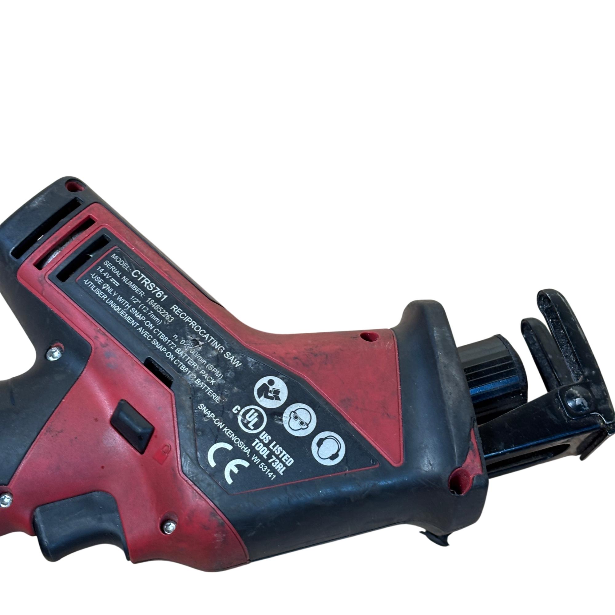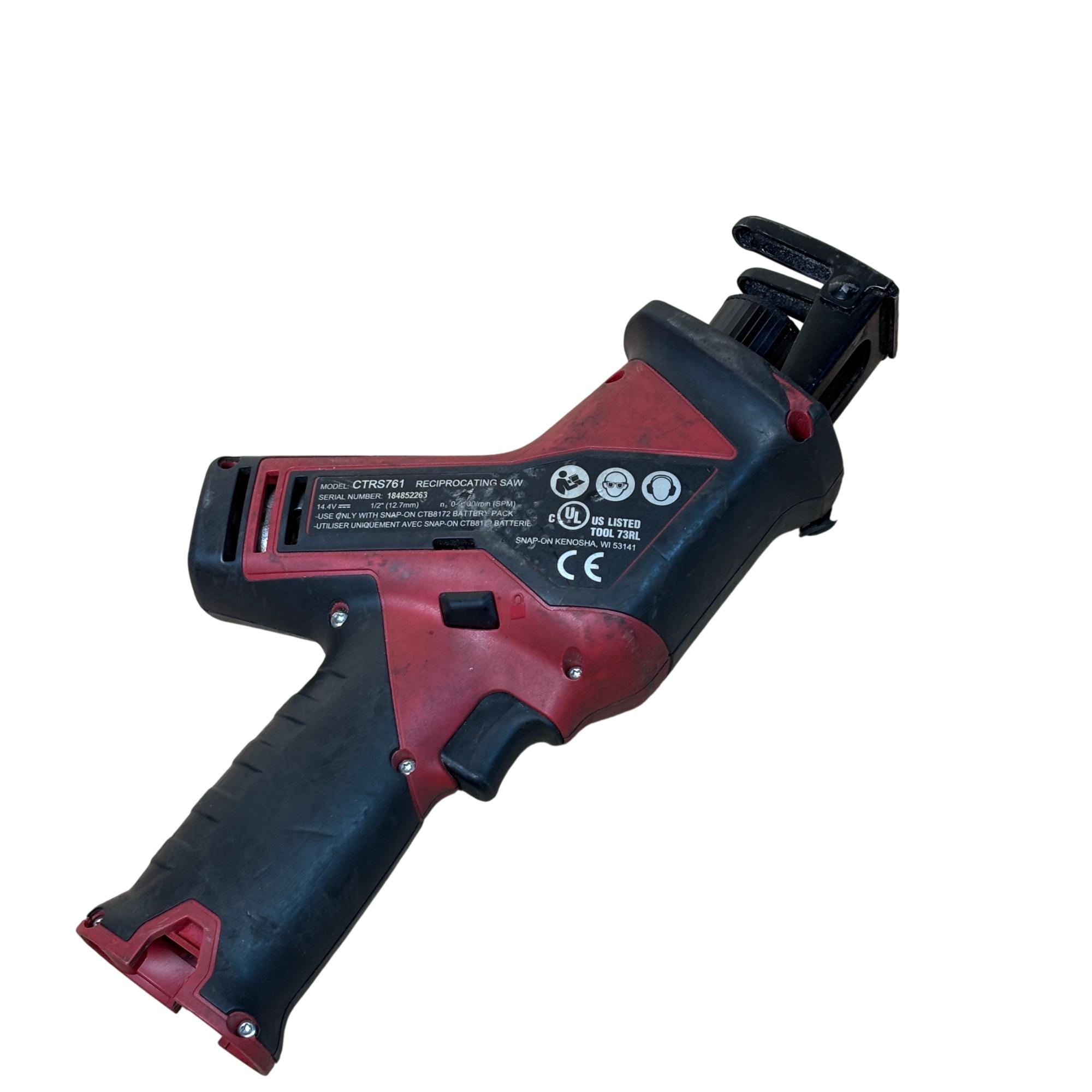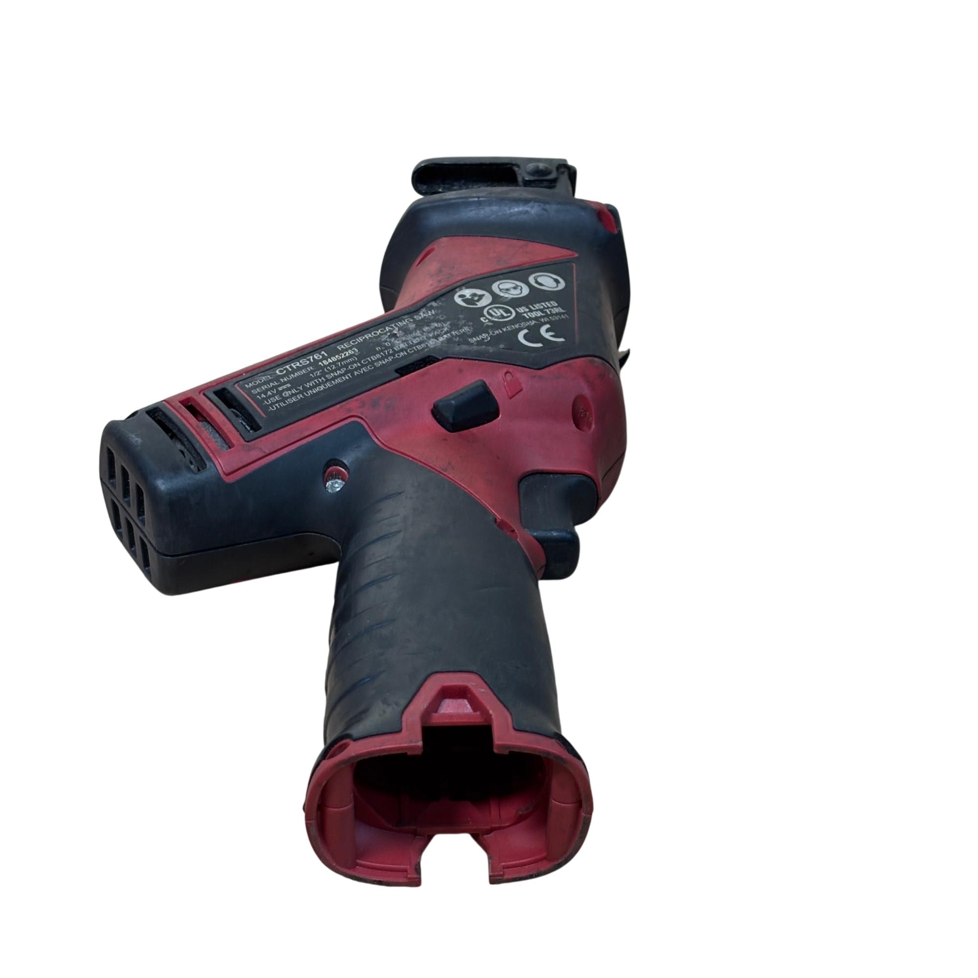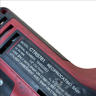Snap-on CTRS761 14.4V cordless reciprocating saw offers powerful performance with a 1/2 inch (12.7mm) stroke length and variable speed up to 200 strokes per minute. Designed for efficient cutting tasks, this durable tool features ergonomic red and black housing and operates with a 14.4-volt battery system. Its compact design and robust build make it ideal for professional use in various applications requiring precise and reliable cutting power.