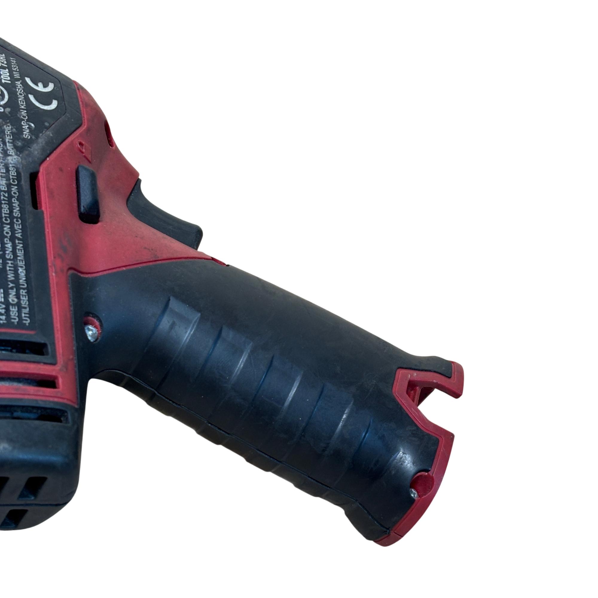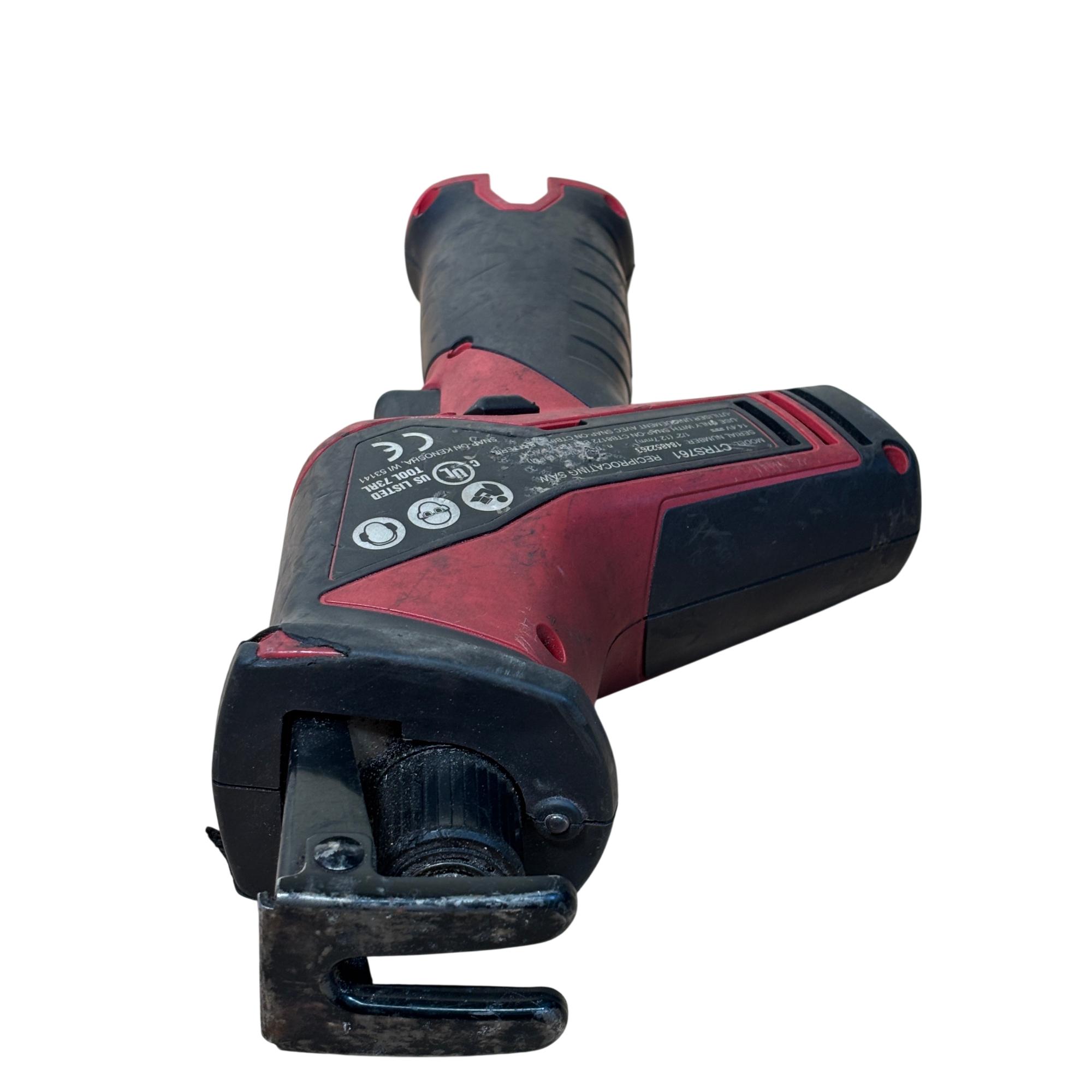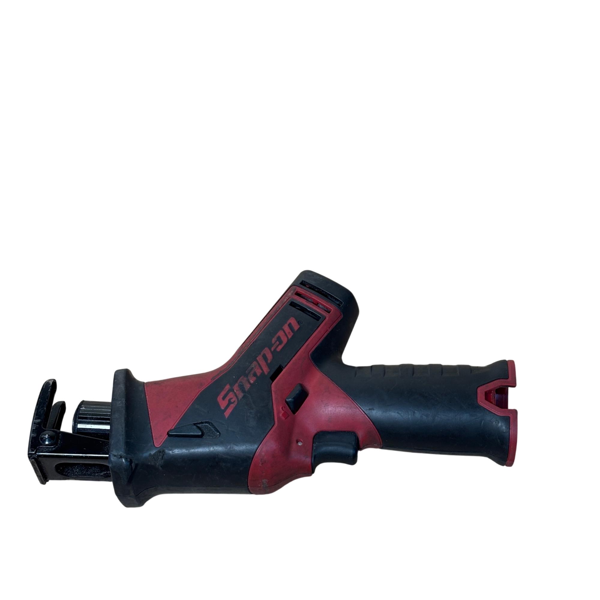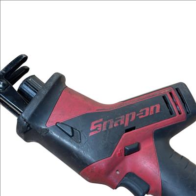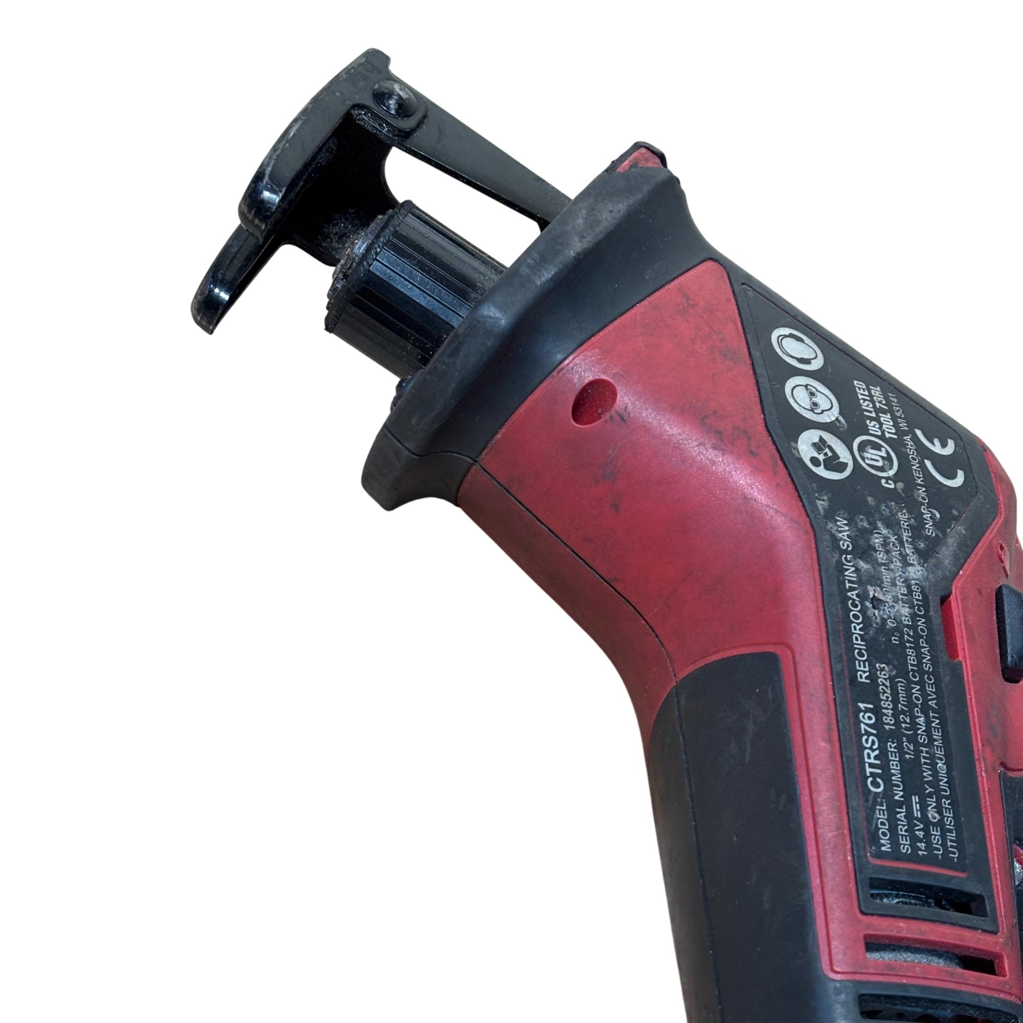 Snap-on CTRS761 14.4V cordless reciprocating saw offers powerful performance with a 1/2 inch (12.7mm) stroke length and variable speed up to 200 strokes per minute. Designed for efficient cutting tasks, this durable tool features ergonomic red and black housing and operates with a 14.4-volt battery system. Its compact design and robust build make it ideal for professional use in various applications requiring precise and reliable cutting power.