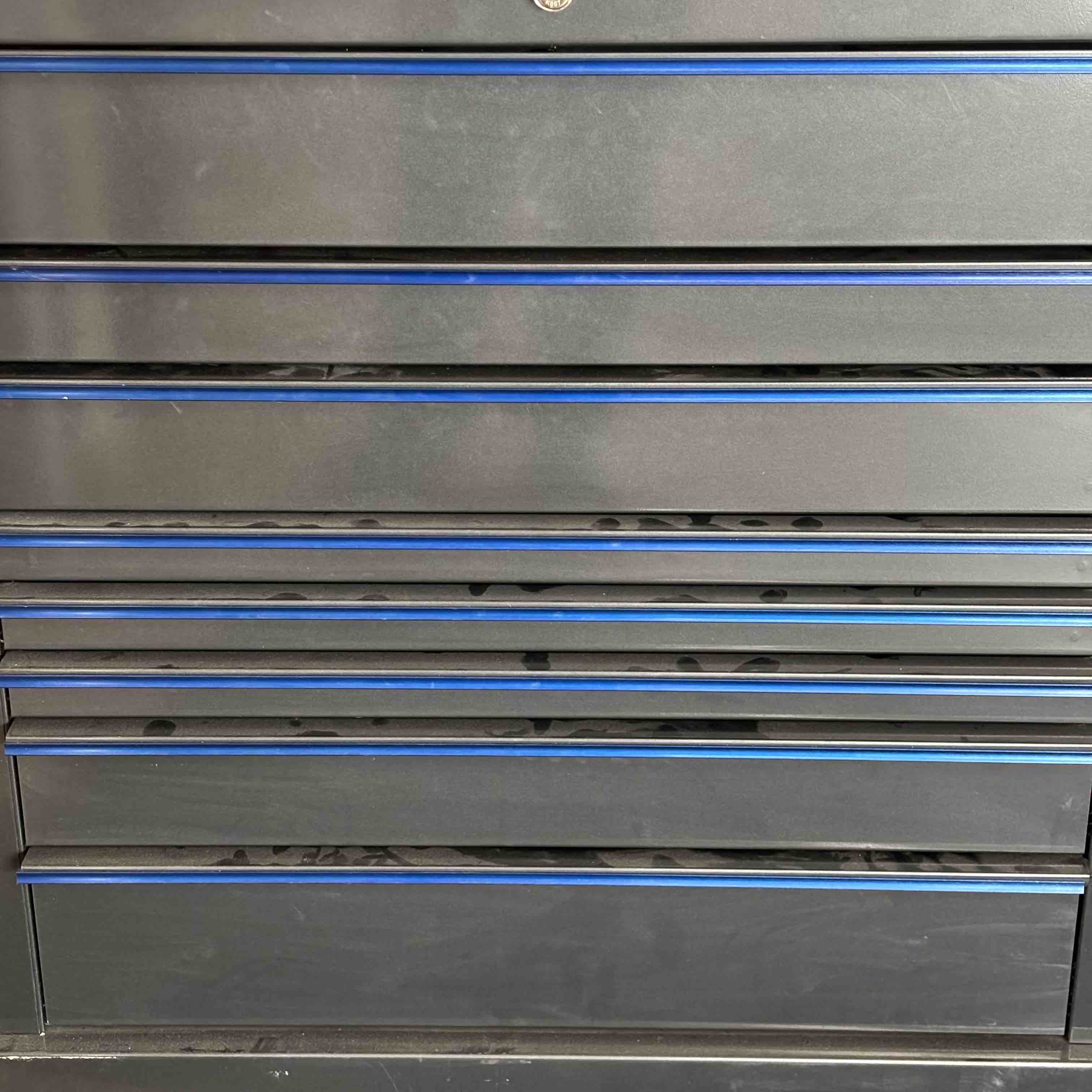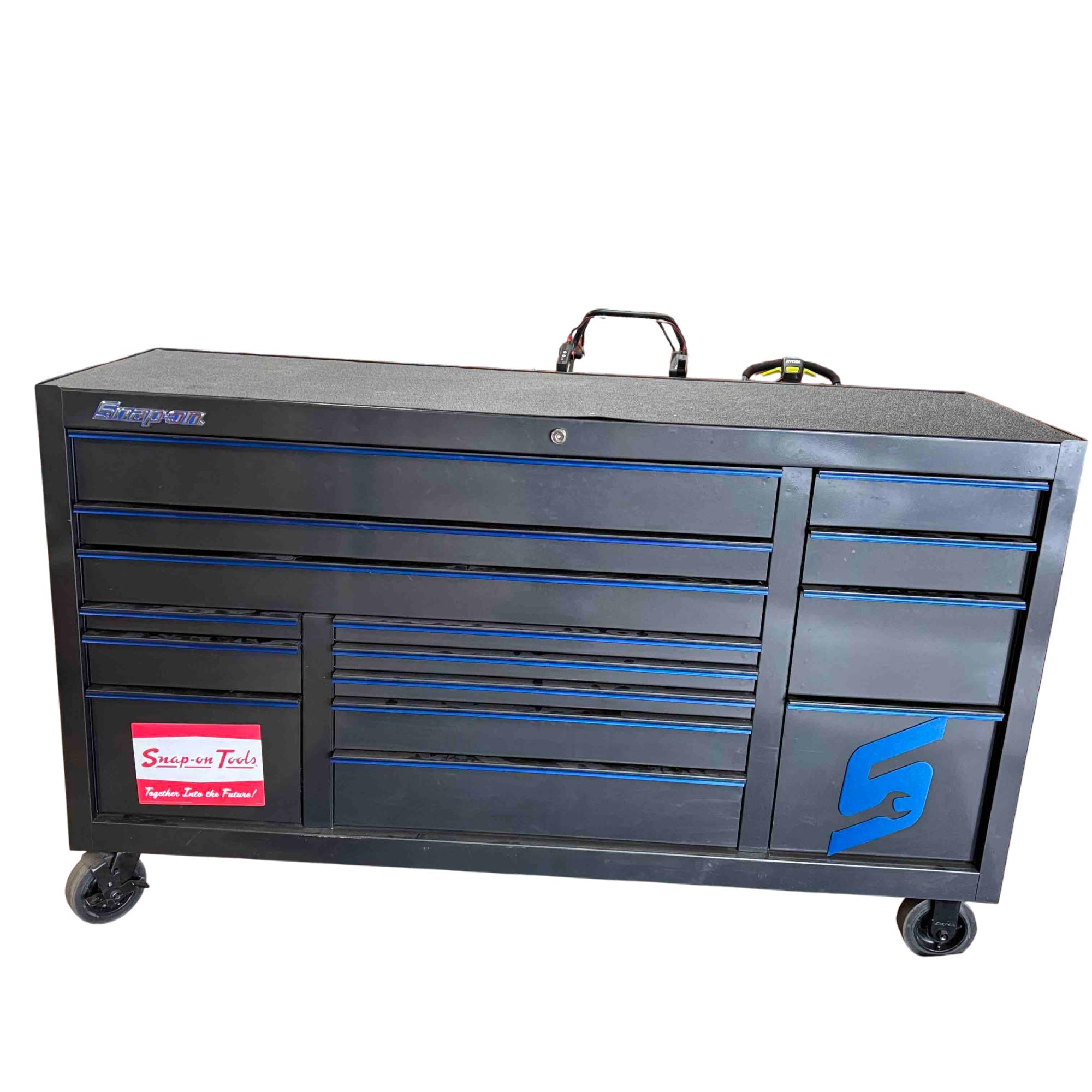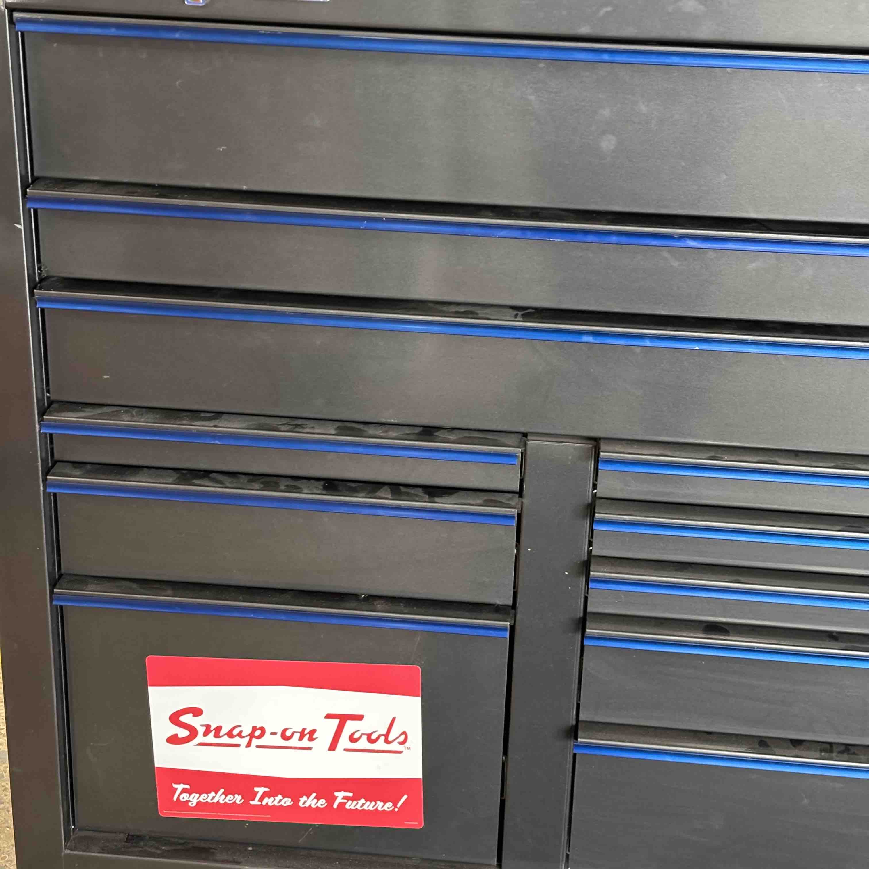 Upgrade your workshop with the Snap-on Tools KCP1423WFV Dark Titanium rolling toolbox. Featuring a rugged black and blue steel frame, multiple spacious drawers, and high-quality wheels, this premium tool storage solution combines durability with convenience. Ideal for professionals seeking secure, mobile, and stylish storage for their valuable tools.