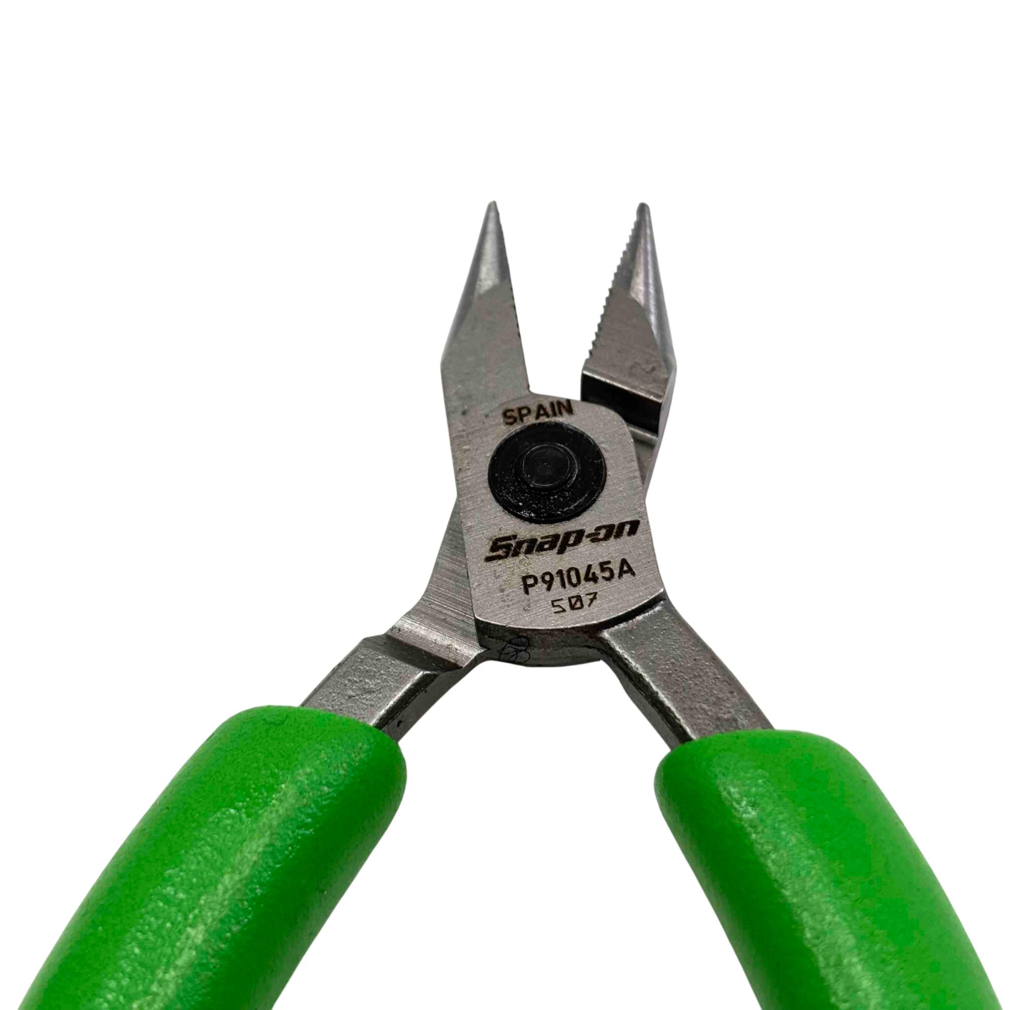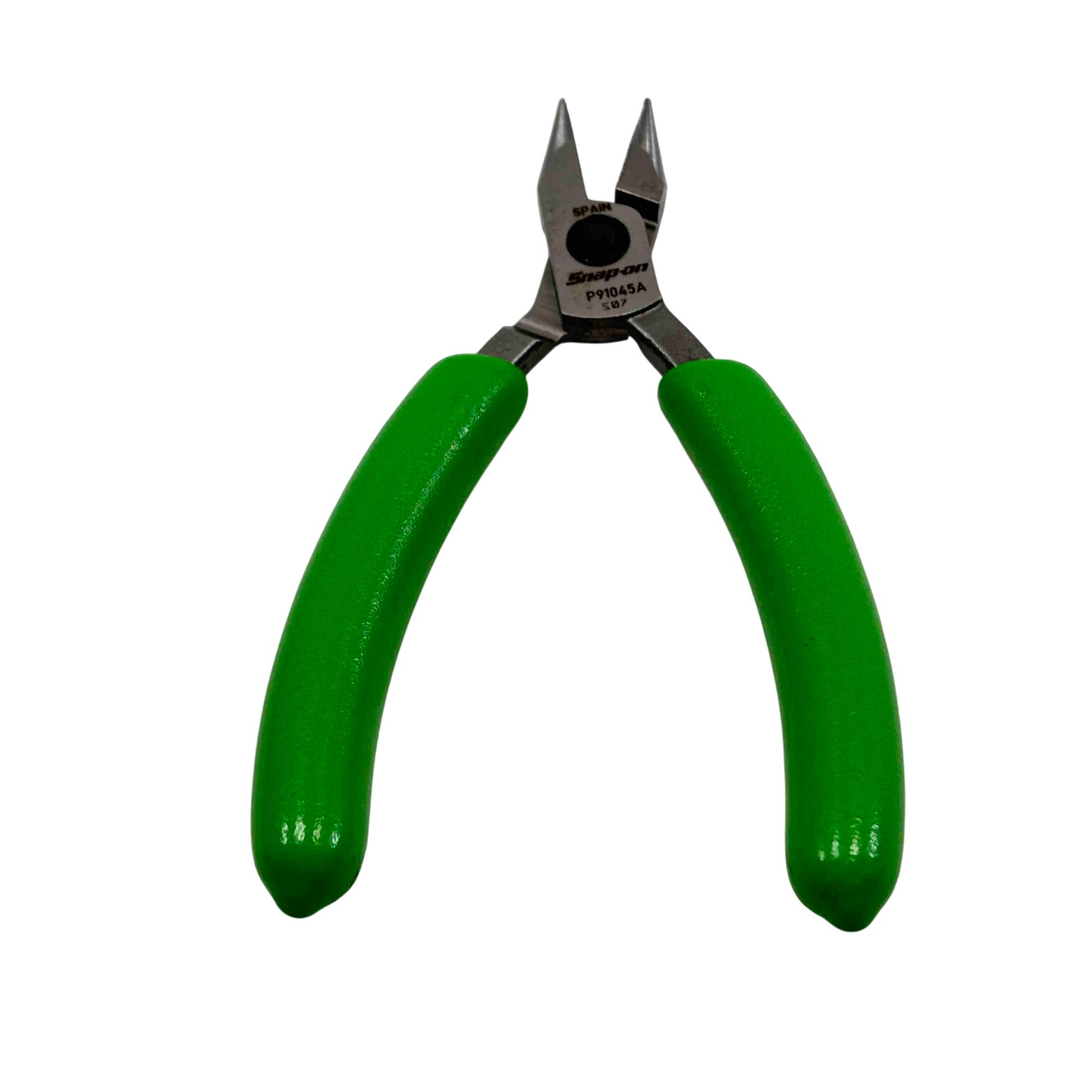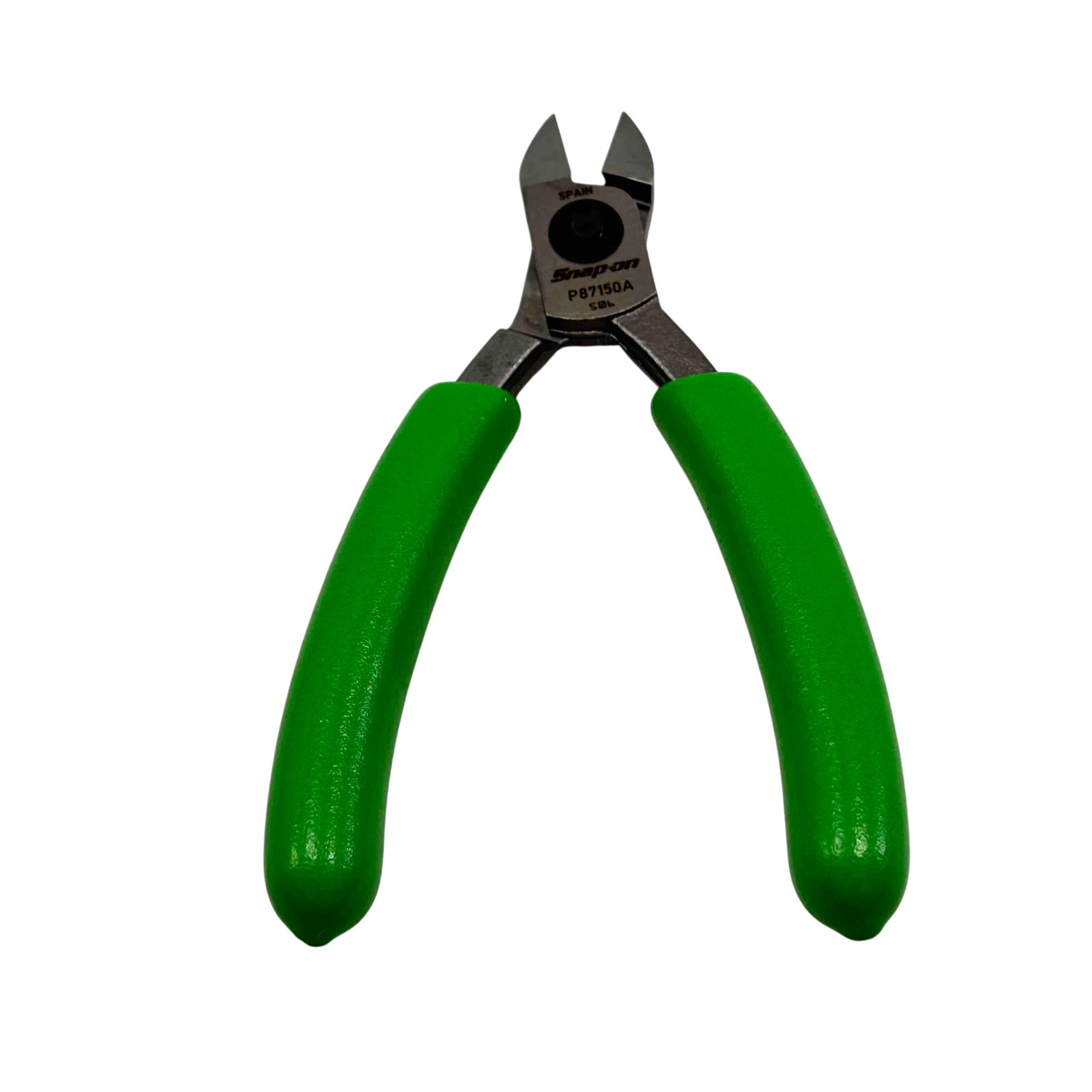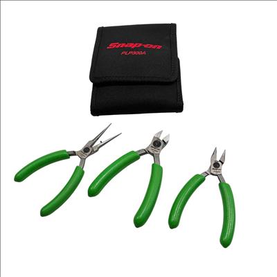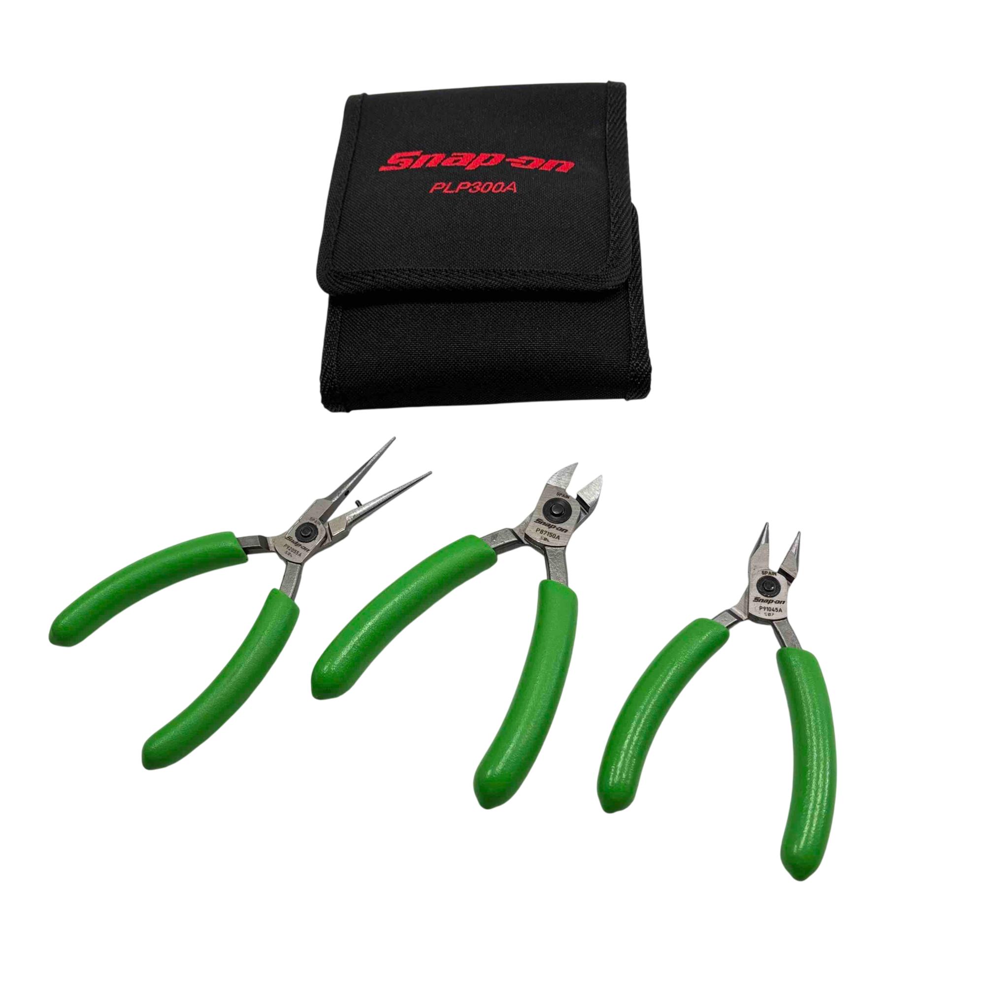 This Snap-on PLP300A set features three precision pliers with comfortable green soft-grip handles, perfect for professional and hobbyist work. The kit includes a needle-nose plier, diagonal cutter, and a combination plier, all stored in a durable branded Snap-on cloth case. Renowned for their high quality and reliability, Snap-on tools deliver exceptional performance for intricate tasks and long-lasting durability.