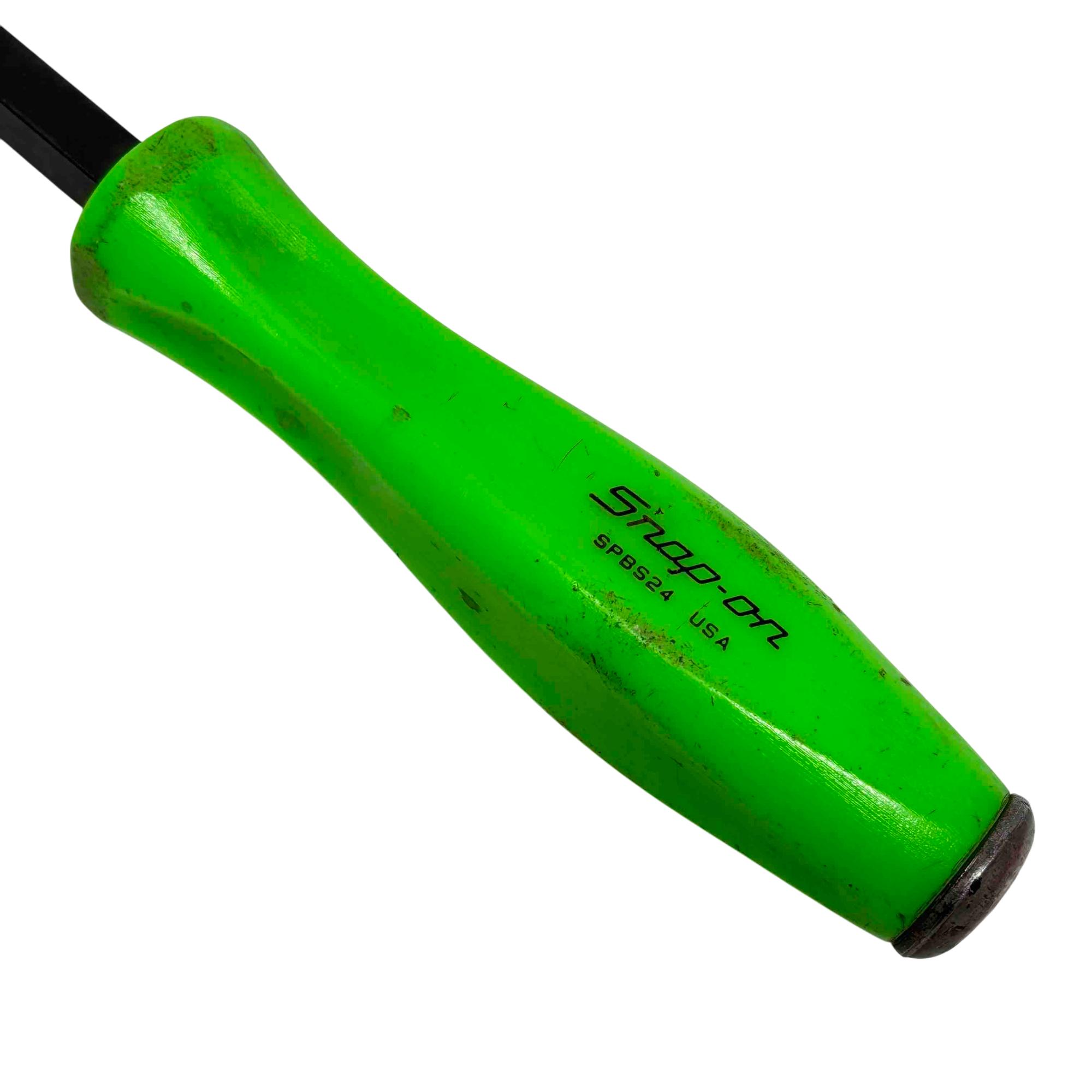 Snap-on SPBS824 4-Piece Green Handle Pry Bar Set (Models: SPBS8, SPBS12, SPBS18, SPBS24, USA) features four durable pry bars with neon green PVC square handles in sizes 8", 12", 18", and 24". Made in the USA, these rigid carbon steel bars are designed for mechanic, automotive, and general purpose use, offering excellent leverage and grip for prying tasks.