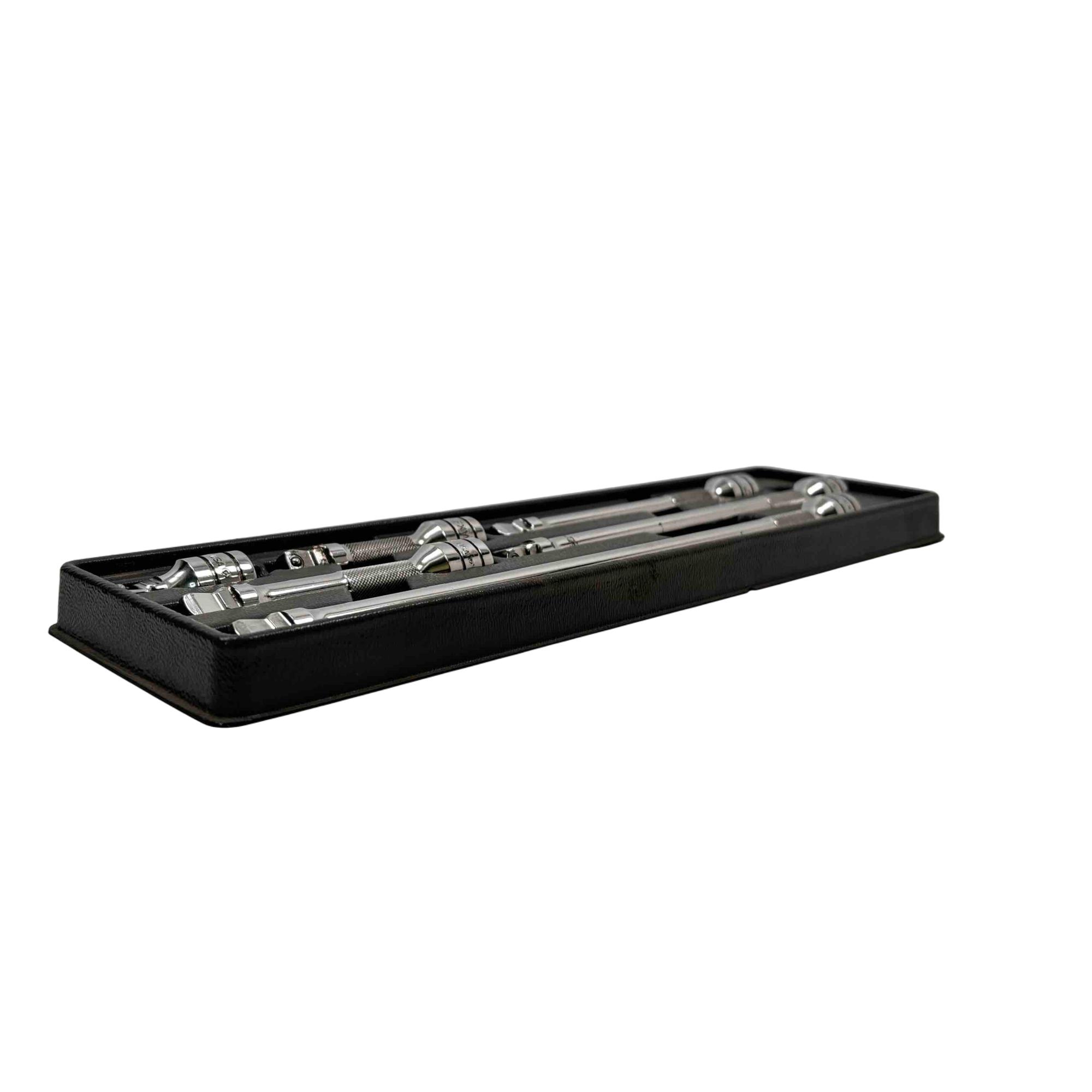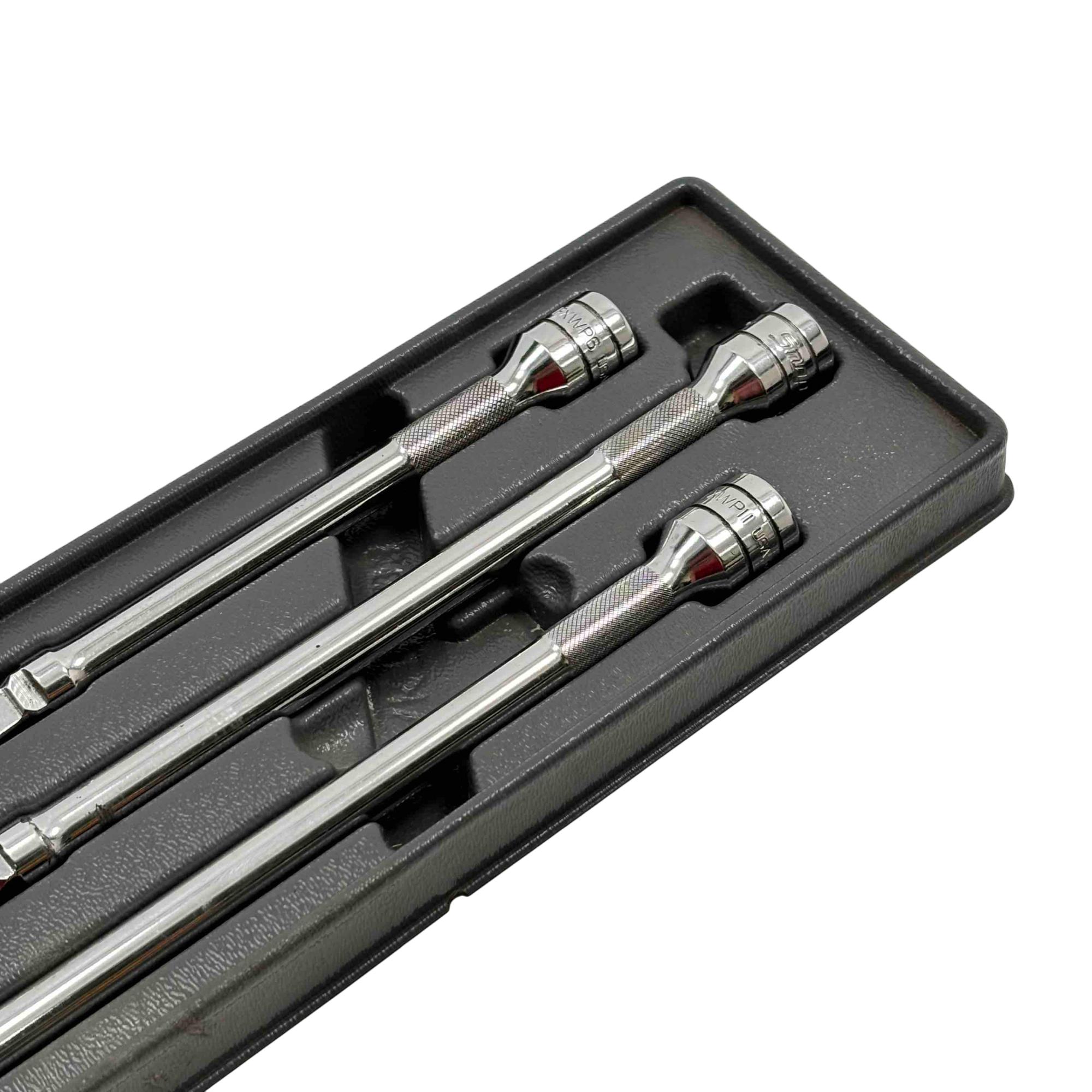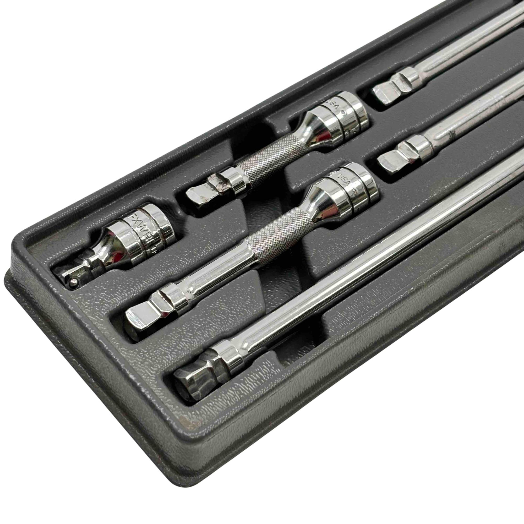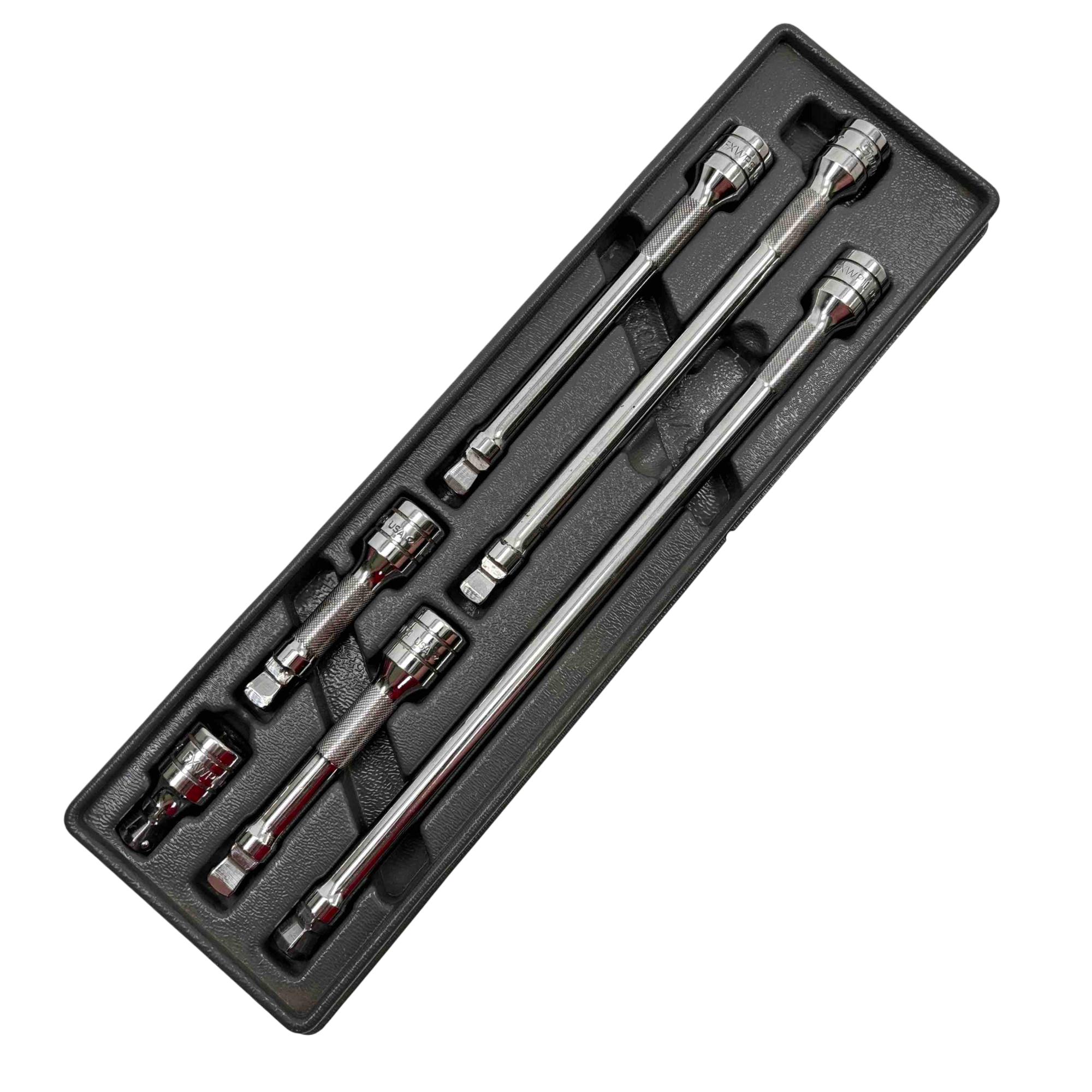 Includes six extensions in lengths of 1-1/2, 3, 4, 6, 8, and 11 inches. Each extension in the set is designed with dual functionality, allowing for both wobble and rigid use depending on the application. This set is intended to provide added flexibility in reaching fasteners at various angles and depths in tight or awkward spaces.