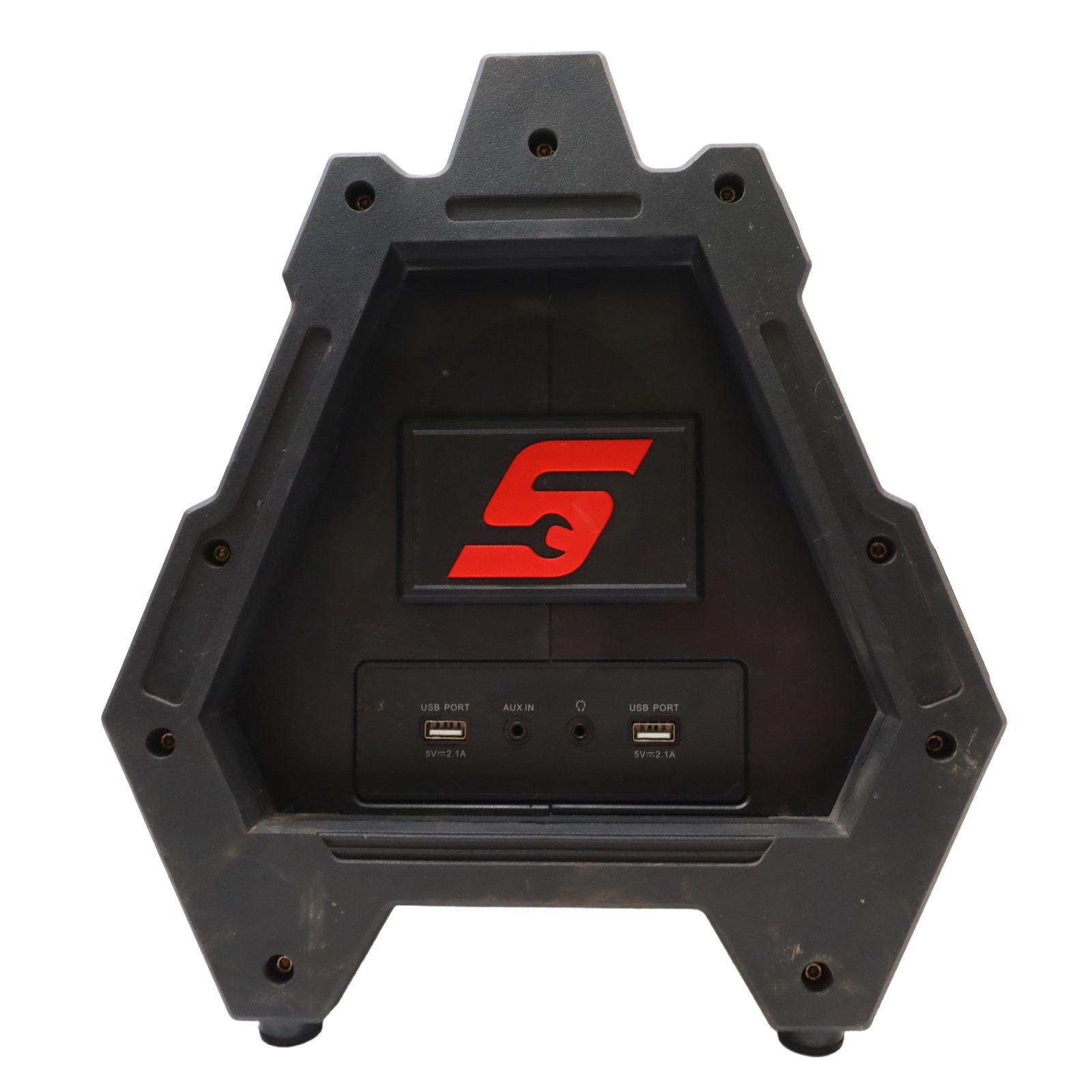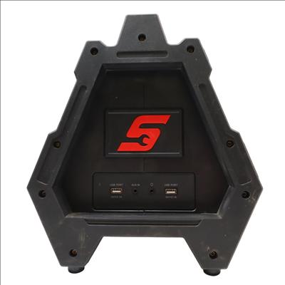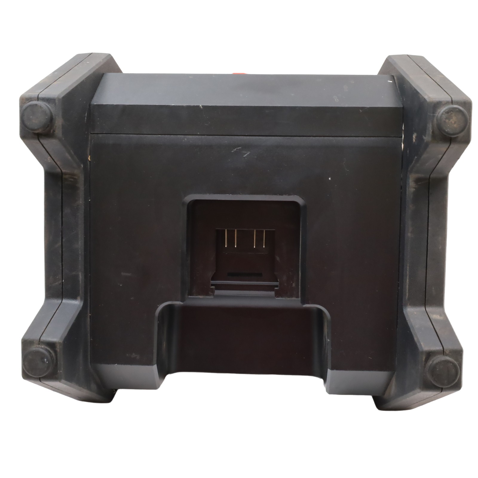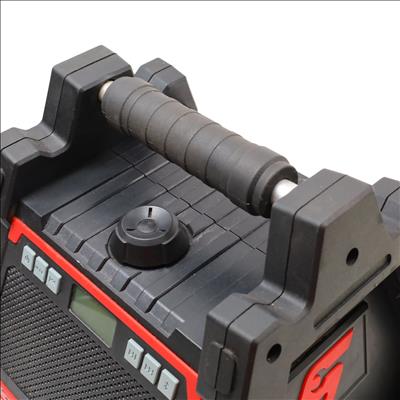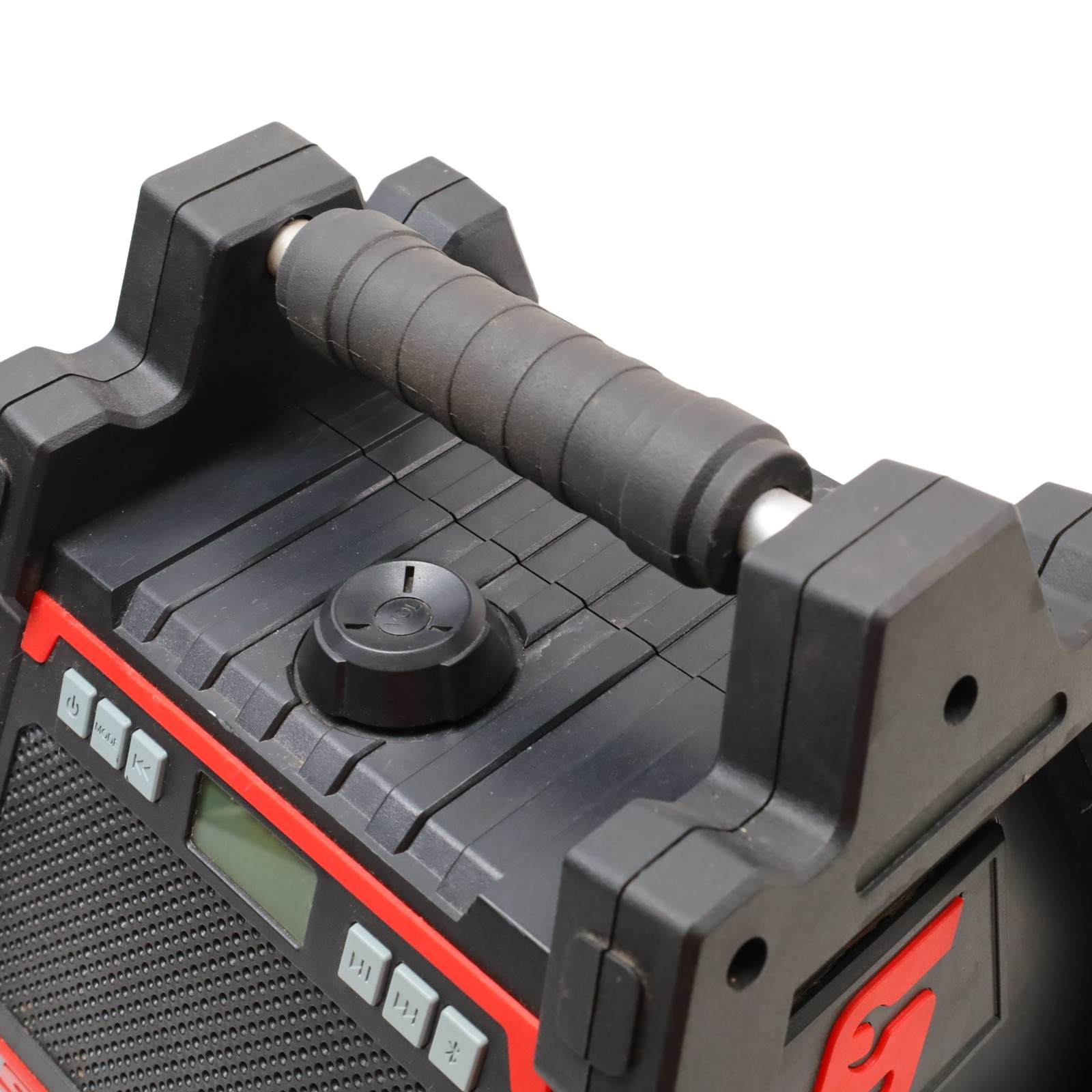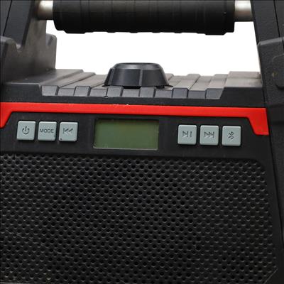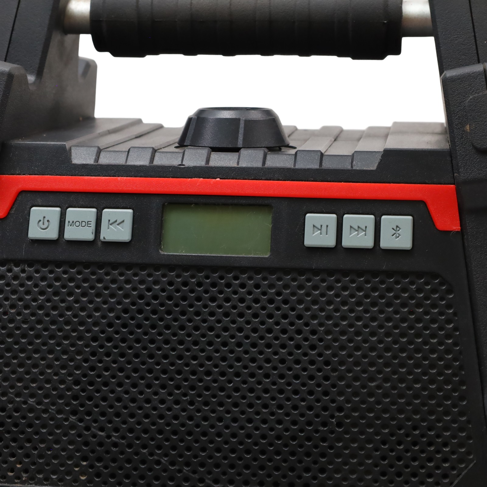 A portable Bluetooth speaker designed for use with 18V batteries, featuring two 2.1A USB ports for device charging, an auxiliary input for non-Bluetooth devices, and an integrated headphone jack for private listening. Its rugged roll cage frame provides durability for jobsite environments, while the large carry handle with textured grip ensures portability. Bluetooth connectivity supports pairing up to 100 feet, and the device includes controls for straightforward operation. The incoming call function pauses audio playback when a call is accepted, allowing hands-free use.