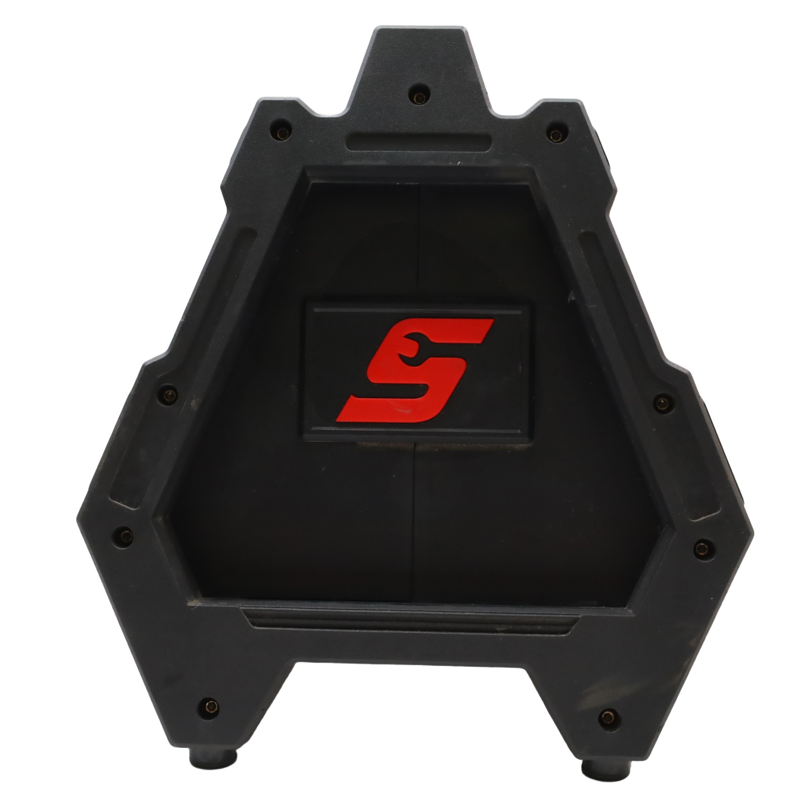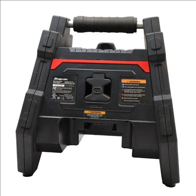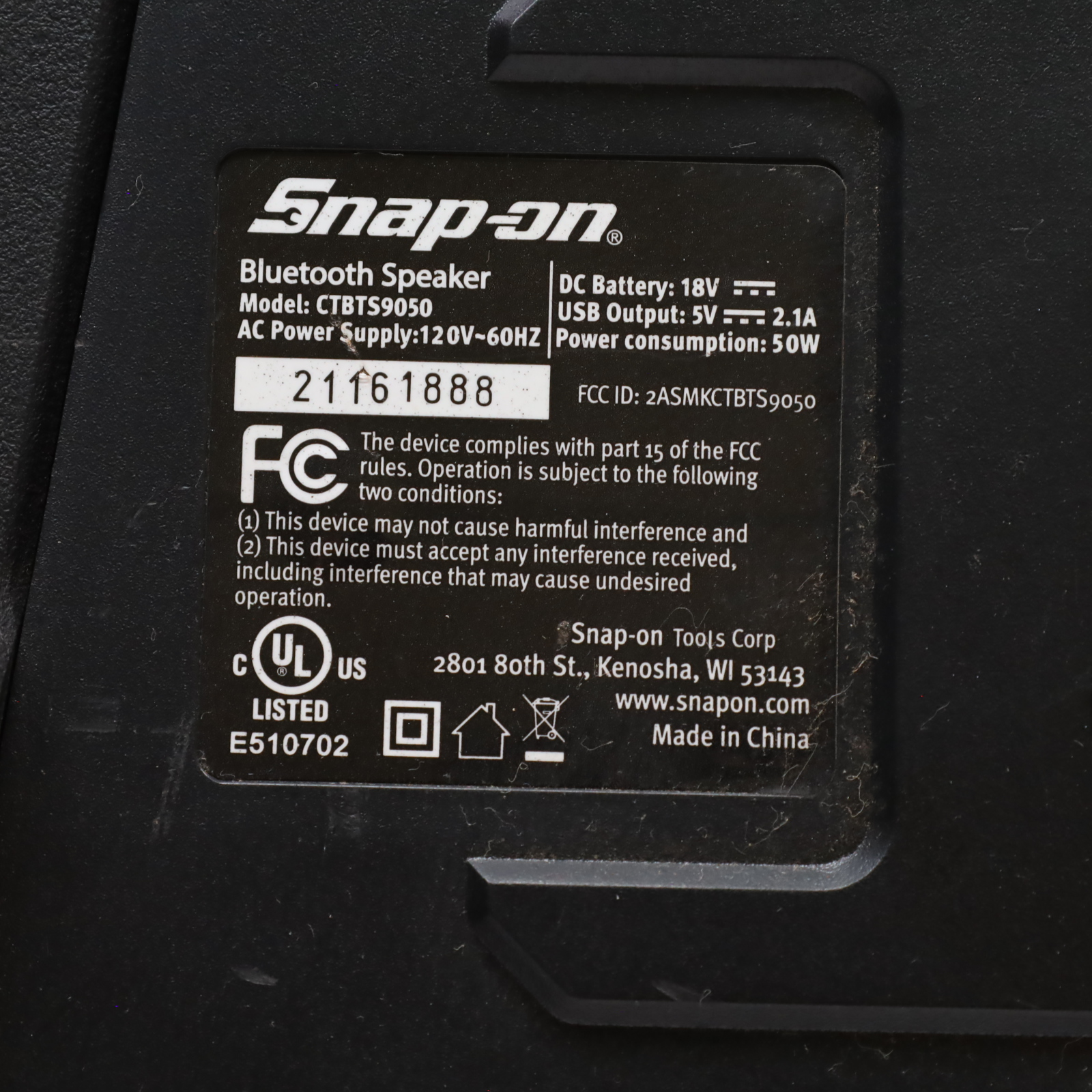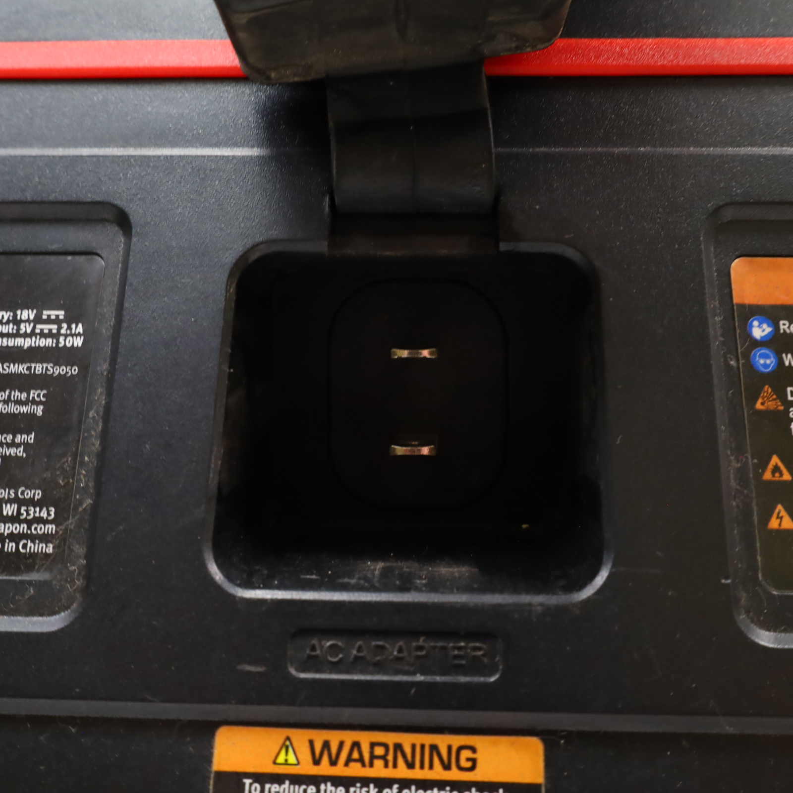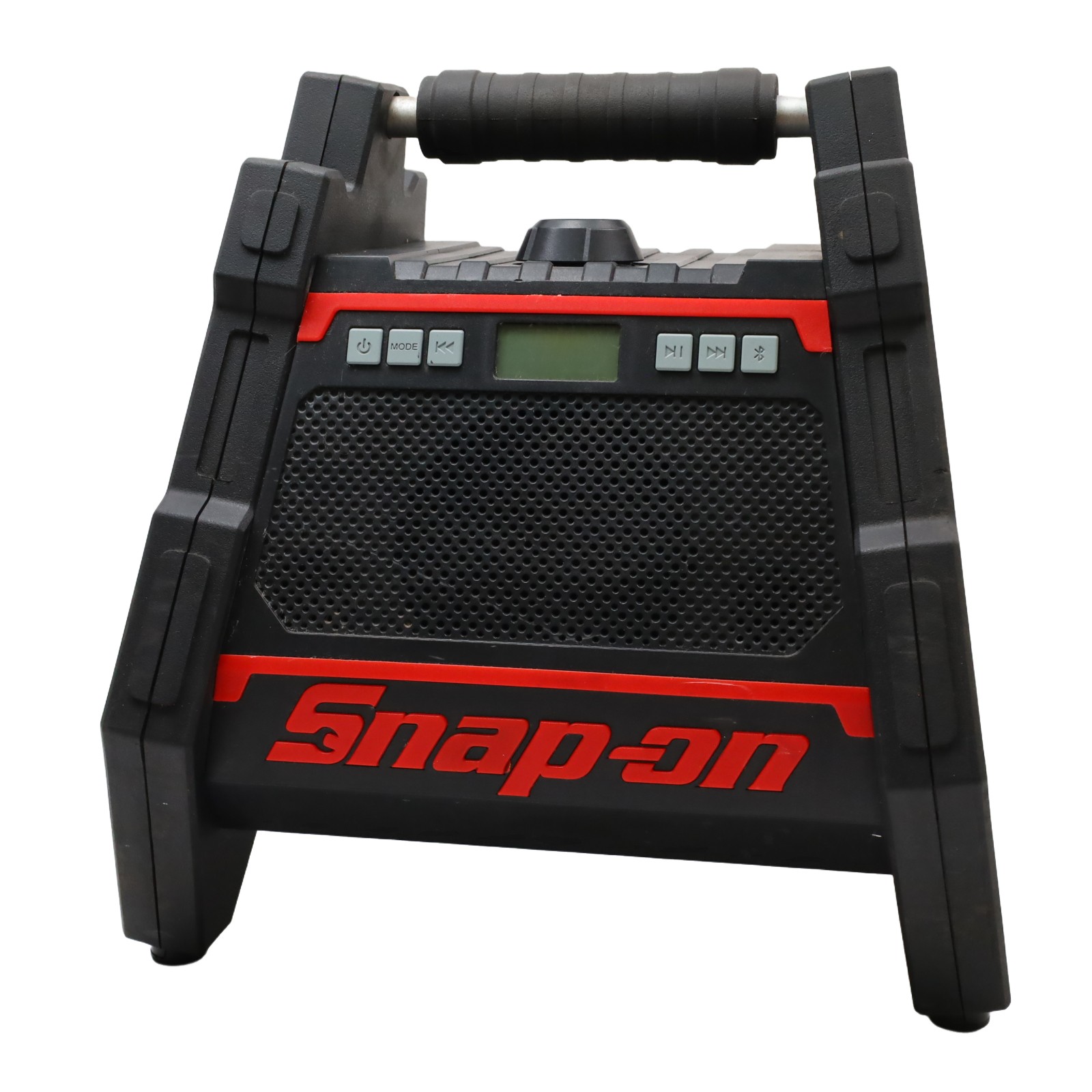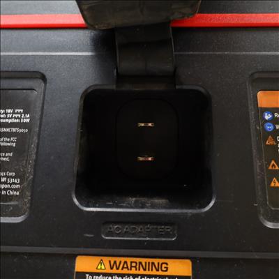 A portable Bluetooth speaker designed for use with 18V batteries, featuring two 2.1A USB ports for device charging, an auxiliary input for non-Bluetooth devices, and an integrated headphone jack for private listening. Its rugged roll cage frame provides durability for jobsite environments, while the large carry handle with textured grip ensures portability. Bluetooth connectivity supports pairing up to 100 feet, and the device includes controls for straightforward operation. The incoming call function pauses audio playback when a call is accepted, allowing hands-free use.