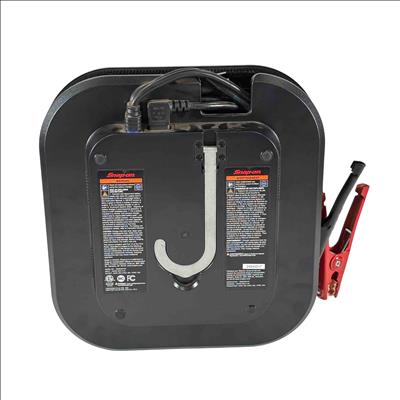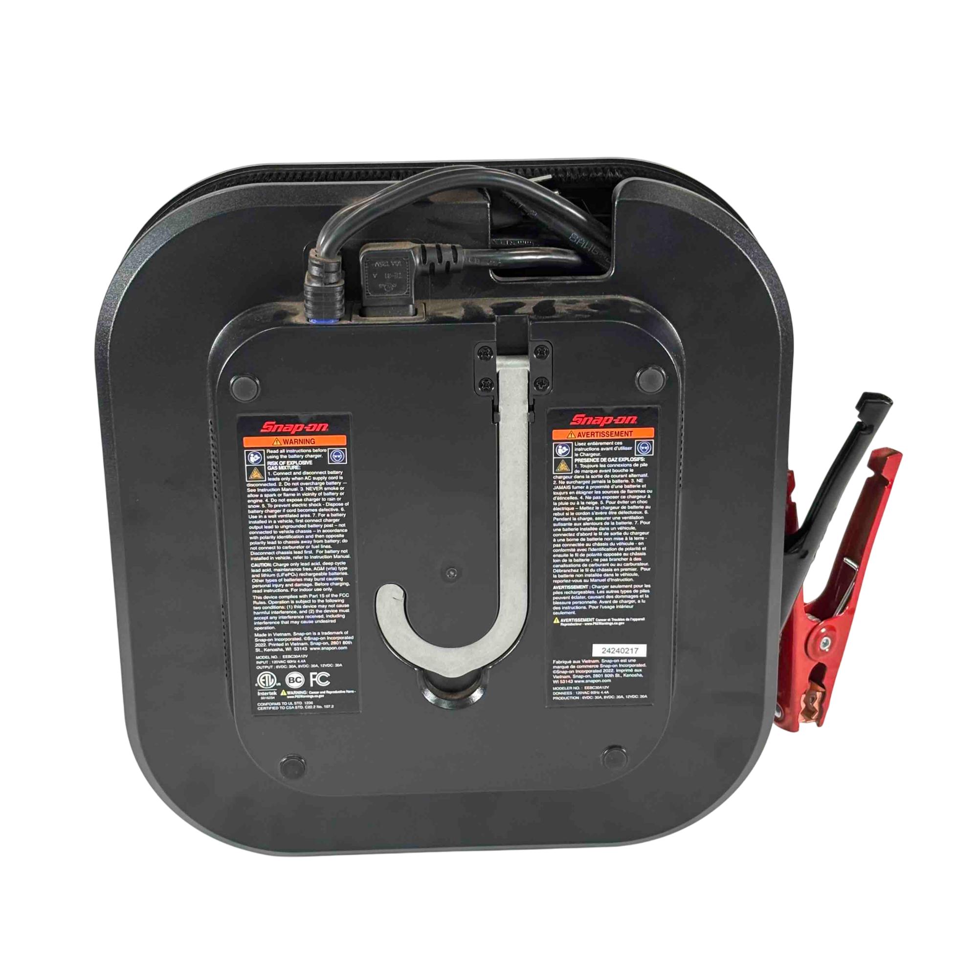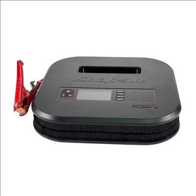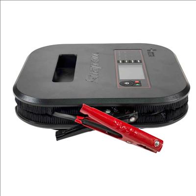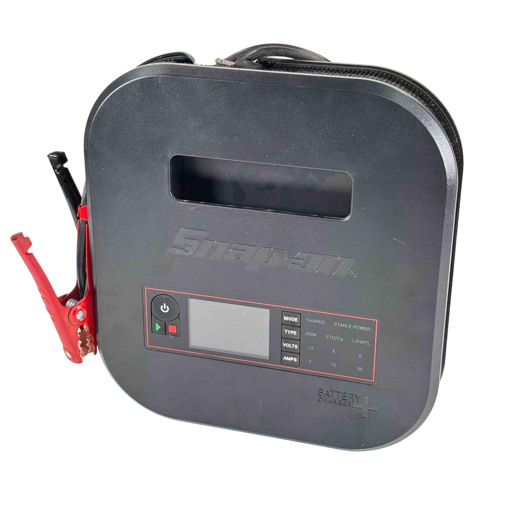 Snap-on Tools EEBC30A12V Bench Top Battery Charger Plus. Charges 6 8 12V AGM STD/Ca lead-acid and 12V LiFePO4 batteries with selectable 2 15 or 30A rates (LiFePO4 at 2 or 10A). Features a multi-stage charge cycle and a large sunlight-readable color display with charge status and diagnostics in six languages. Includes Stable Power Mode to maintain vehicle battery voltage during repairs. Equipped with 82 inch copper-aluminum 8-gauge flex cables and 300A steel clamps for durability. Offers reverse polarity identification automatic operation and overcharge protection. Cable management system and retractable hook enhance usability. Compact design with finger access handle fits in a 4 inch toolbox drawer ideal for shop use.