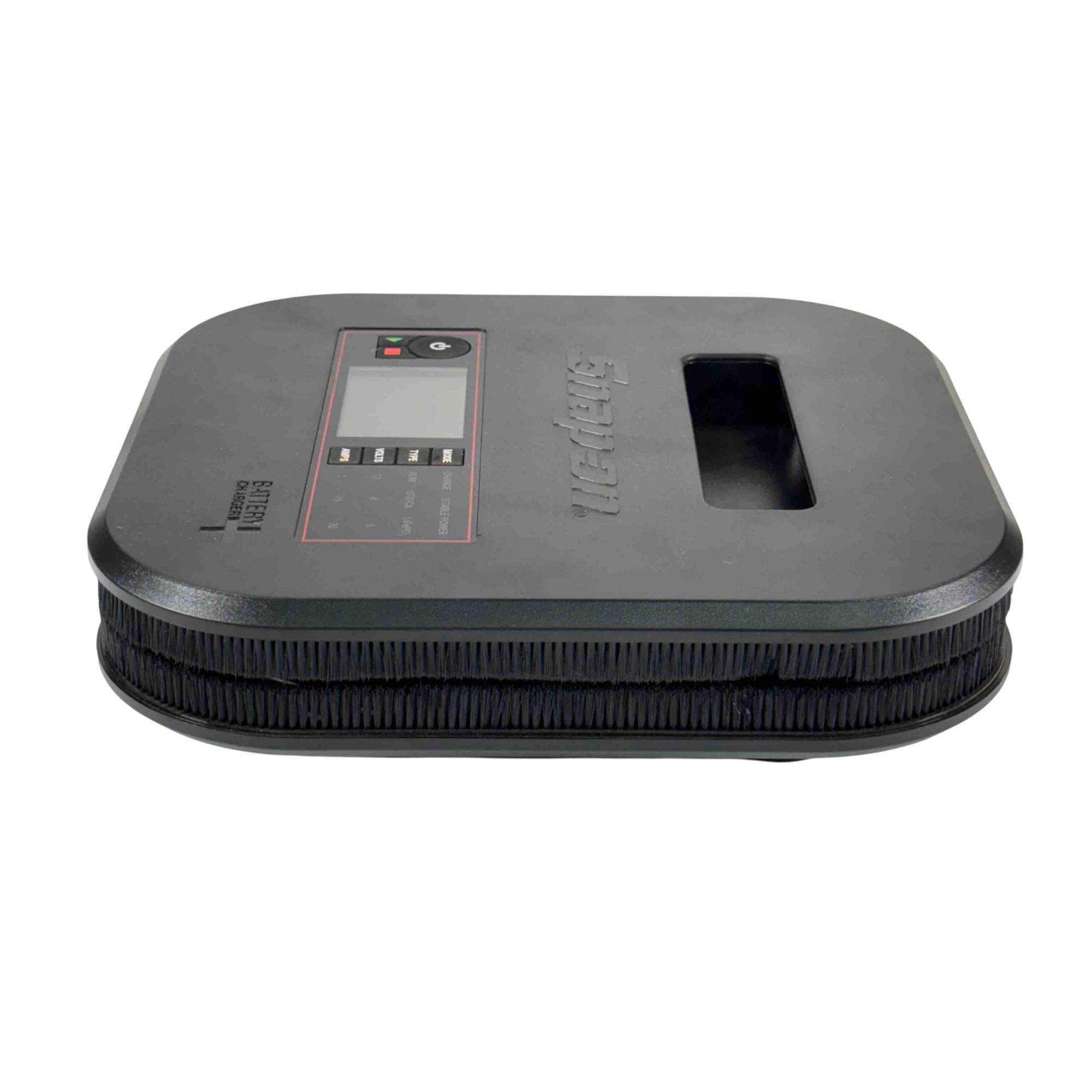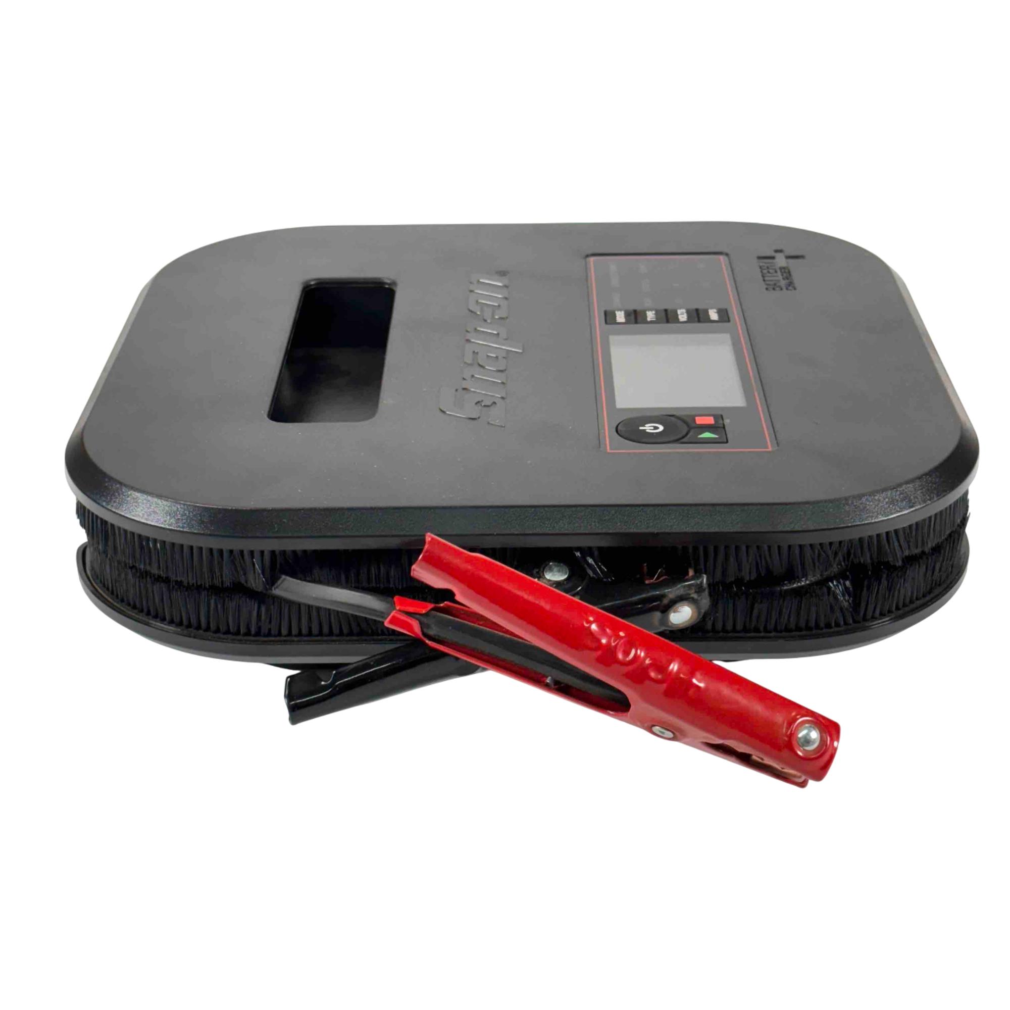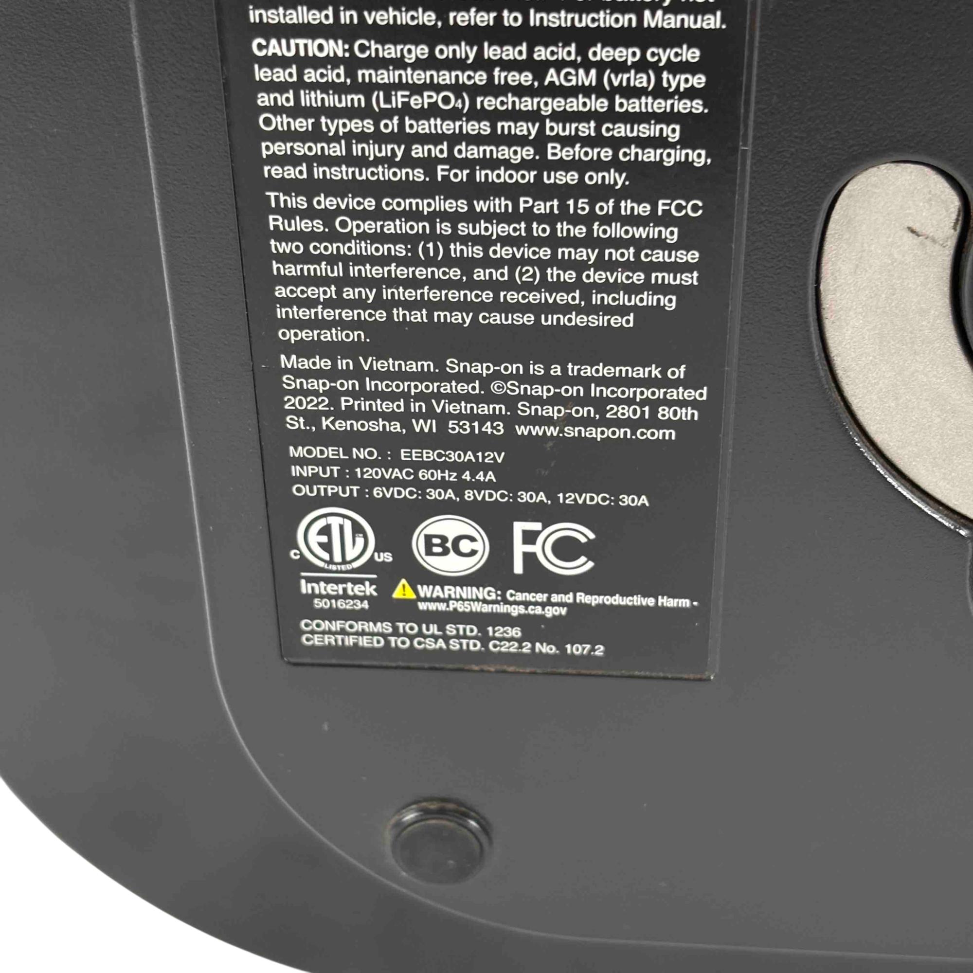 Snap-on Tools EEBC30A12V Bench Top Battery Charger Plus. Charges 6 8 12V AGM STD/Ca lead-acid and 12V LiFePO4 batteries with selectable 2 15 or 30A rates (LiFePO4 at 2 or 10A). Features a multi-stage charge cycle and a large sunlight-readable color display with charge status and diagnostics in six languages. Includes Stable Power Mode to maintain vehicle battery voltage during repairs. Equipped with 82 inch copper-aluminum 8-gauge flex cables and 300A steel clamps for durability. Offers reverse polarity identification automatic operation and overcharge protection. Cable management system and retractable hook enhance usability. Compact design with finger access handle fits in a 4 inch toolbox drawer ideal for shop use.