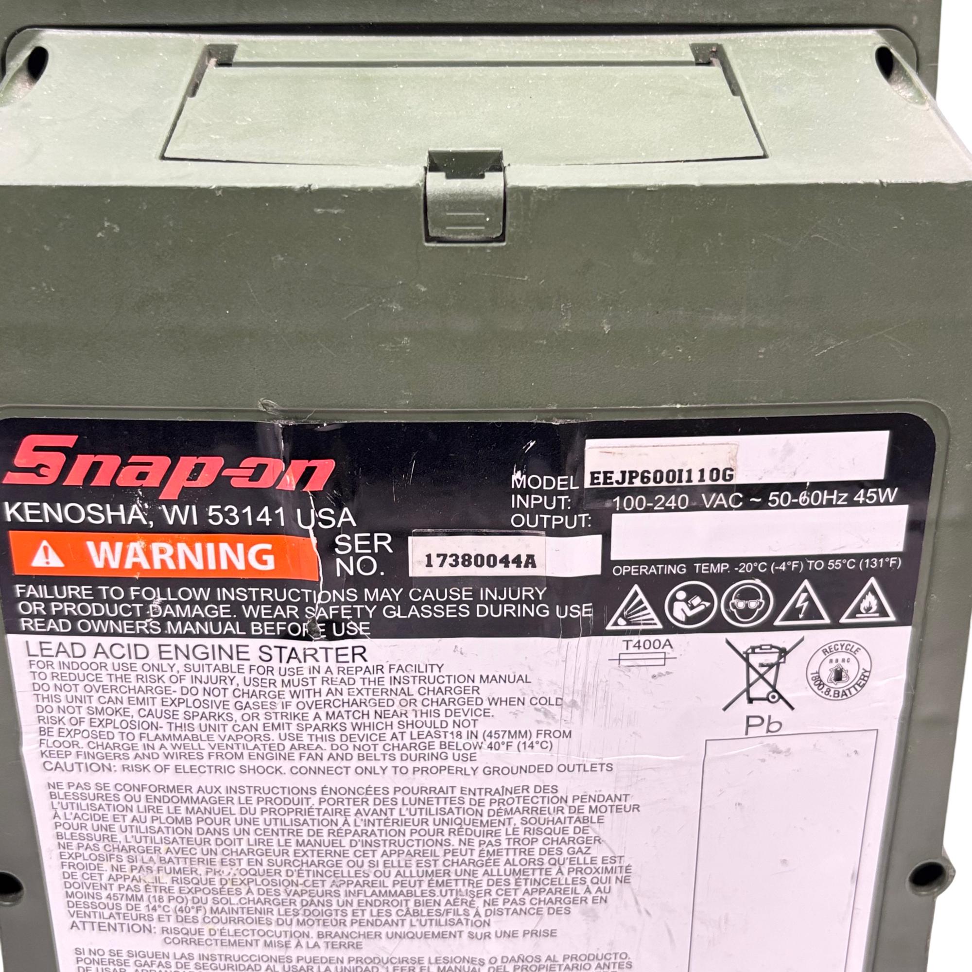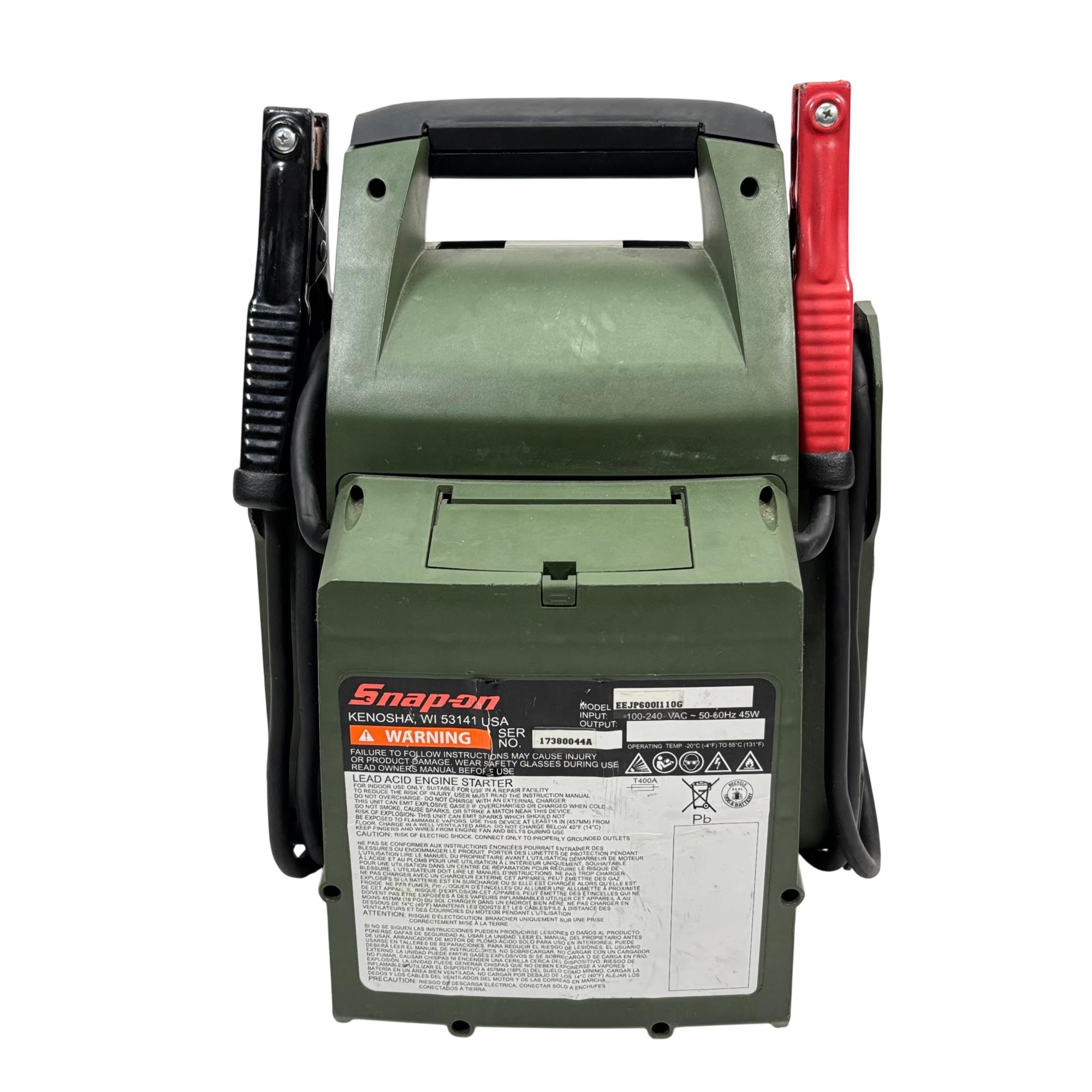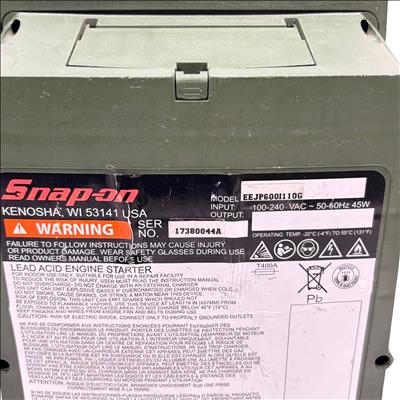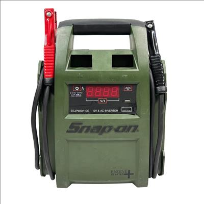 Snap-on EEJP600I110G 12V & AC Inverter Engine Starter is a heavy-duty lead acid battery jump starter designed for reliable engine starting and power inverter functionality. This compact and portable device features a digital display and robust clamps, making it suitable for automotive and outdoor use requiring 12V power delivery and AC inverter output. Its durable construction and integrated cables ensure efficient jump-starting and power support in demanding conditions.