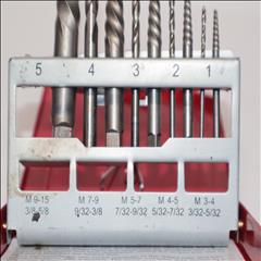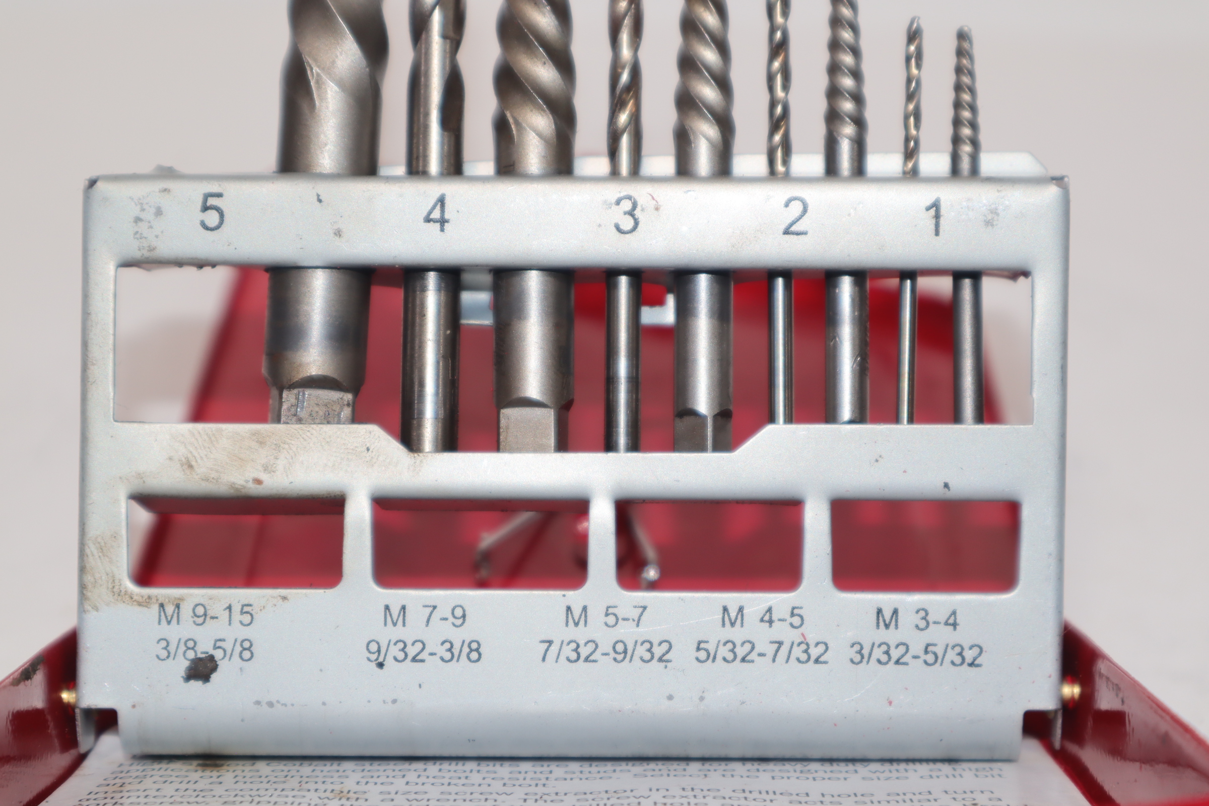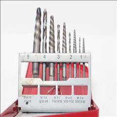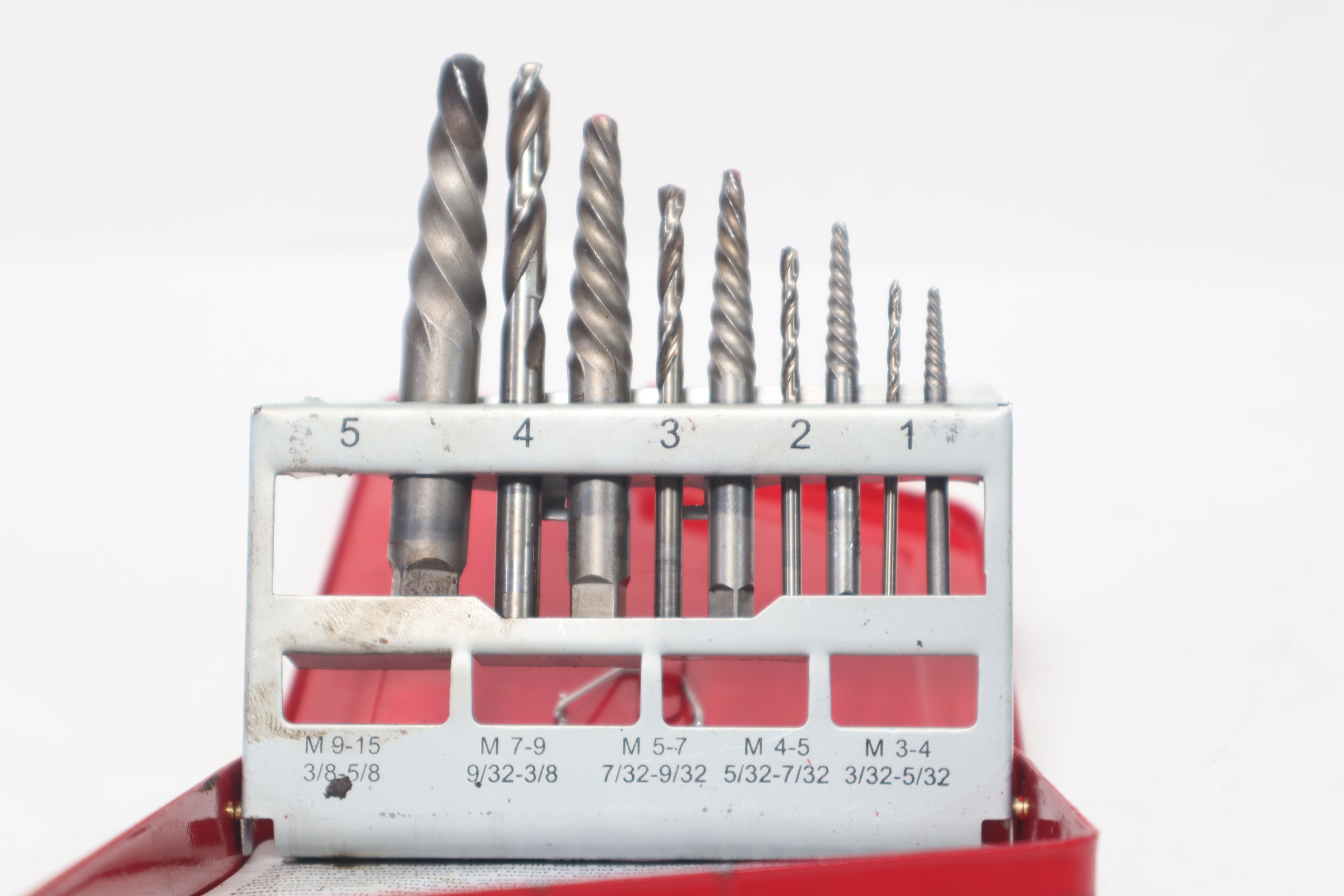 This extractor/drill bit set was previously owned. It shows signs of normal use. It is in good condition. It has been tested and works. There are scuff marks and scratches on the bits.