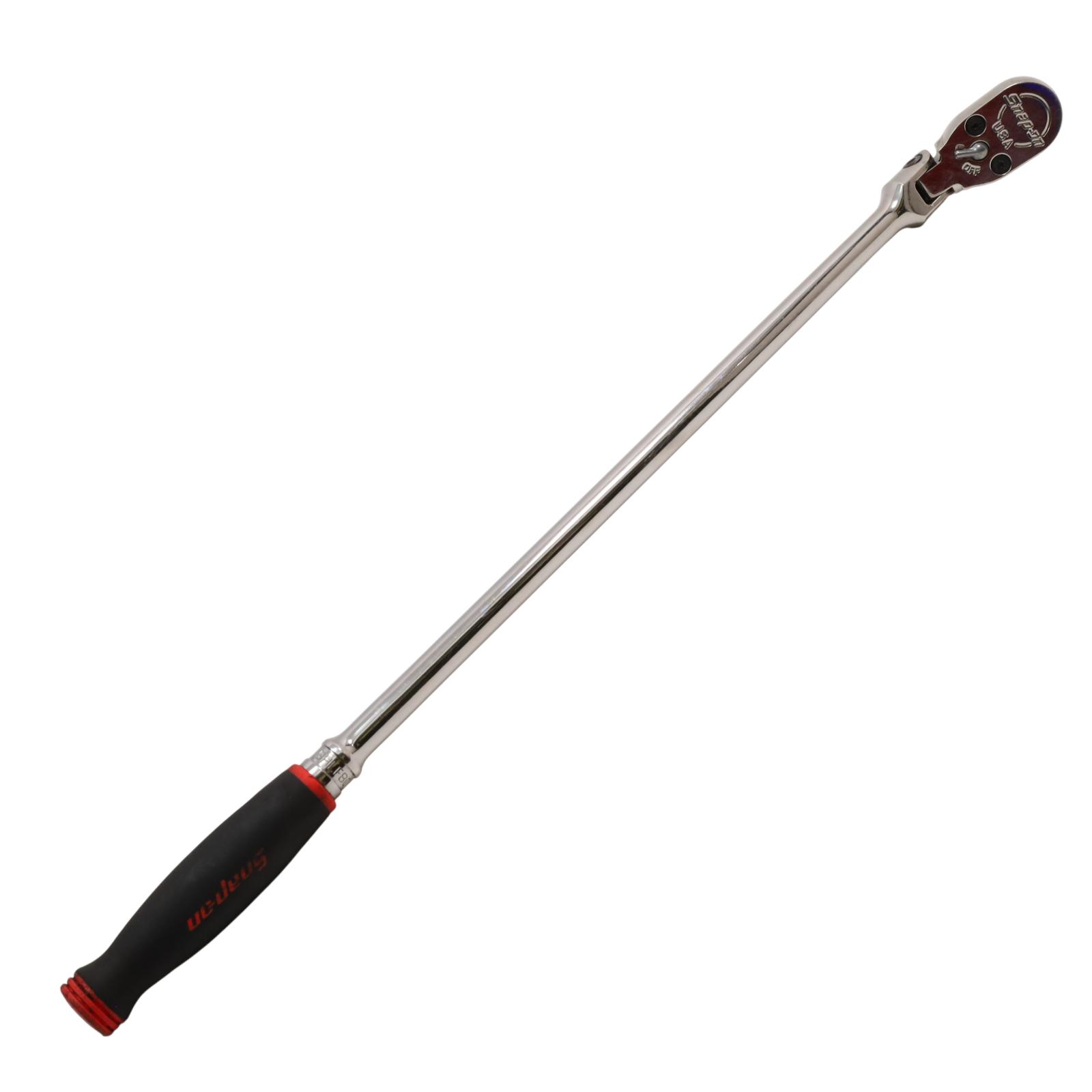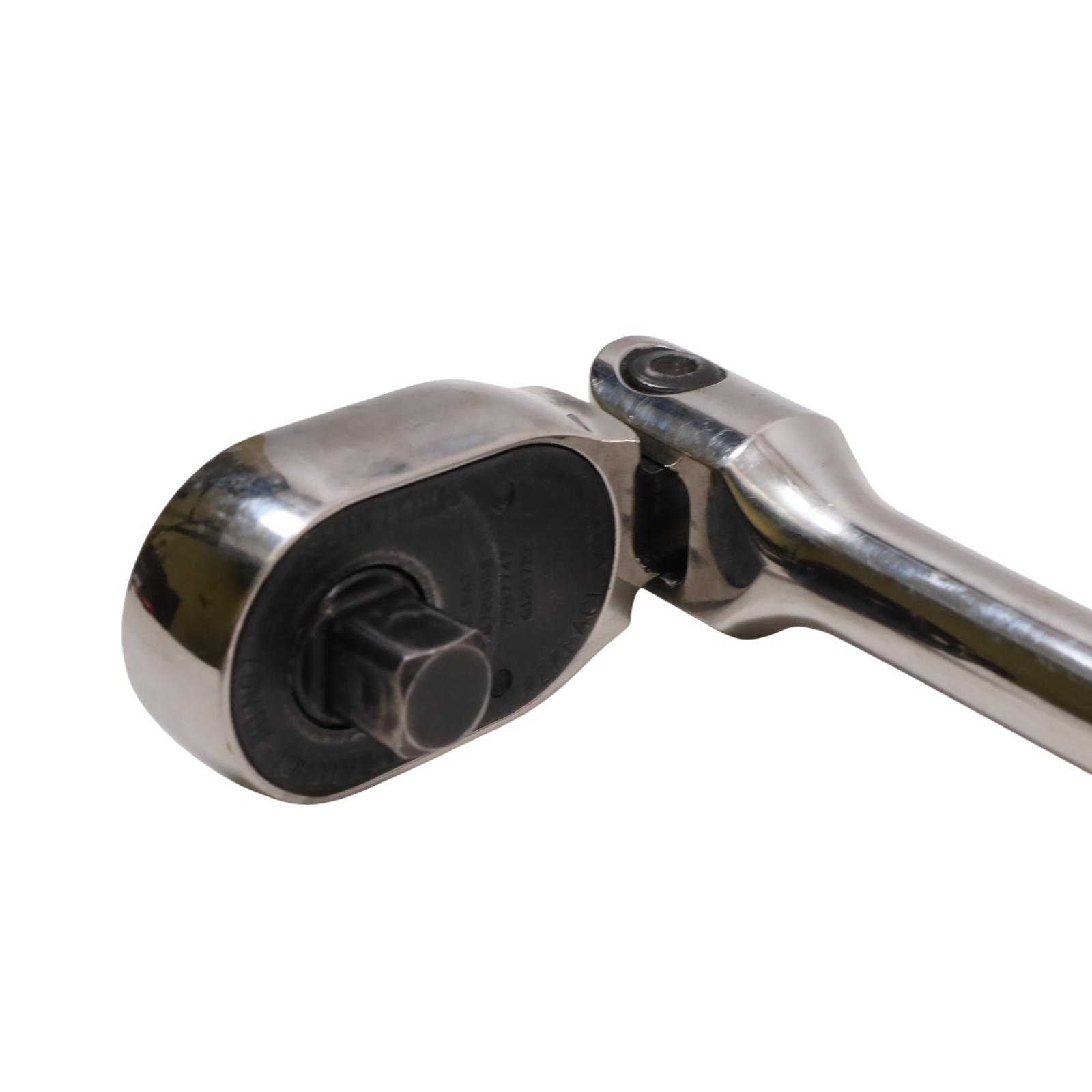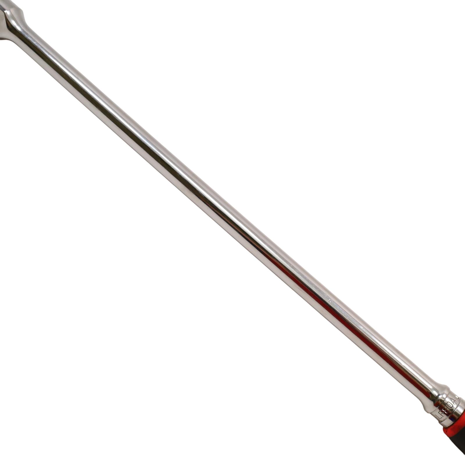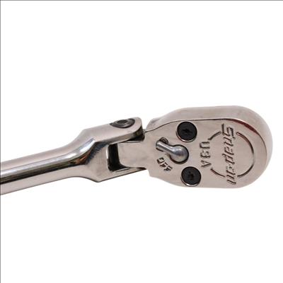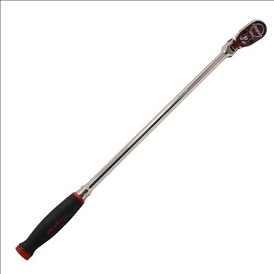 A 1/2" drive long handle flex-head ratchet designed with Dual 80 technology, featuring an 80-tooth gear with seven teeth engaged at once for strength and durability. It has a flex-head design that allows a wide range of working angles, while the sealed head helps retain lubrication and block out debris. The soft grip handle offers comfort and resistance to common shop chemicals, and the rugged reverse lever adds to its durability. Finished in chrome for easy cleaning, this ratchet measures 25-5/8 inches in overall length.