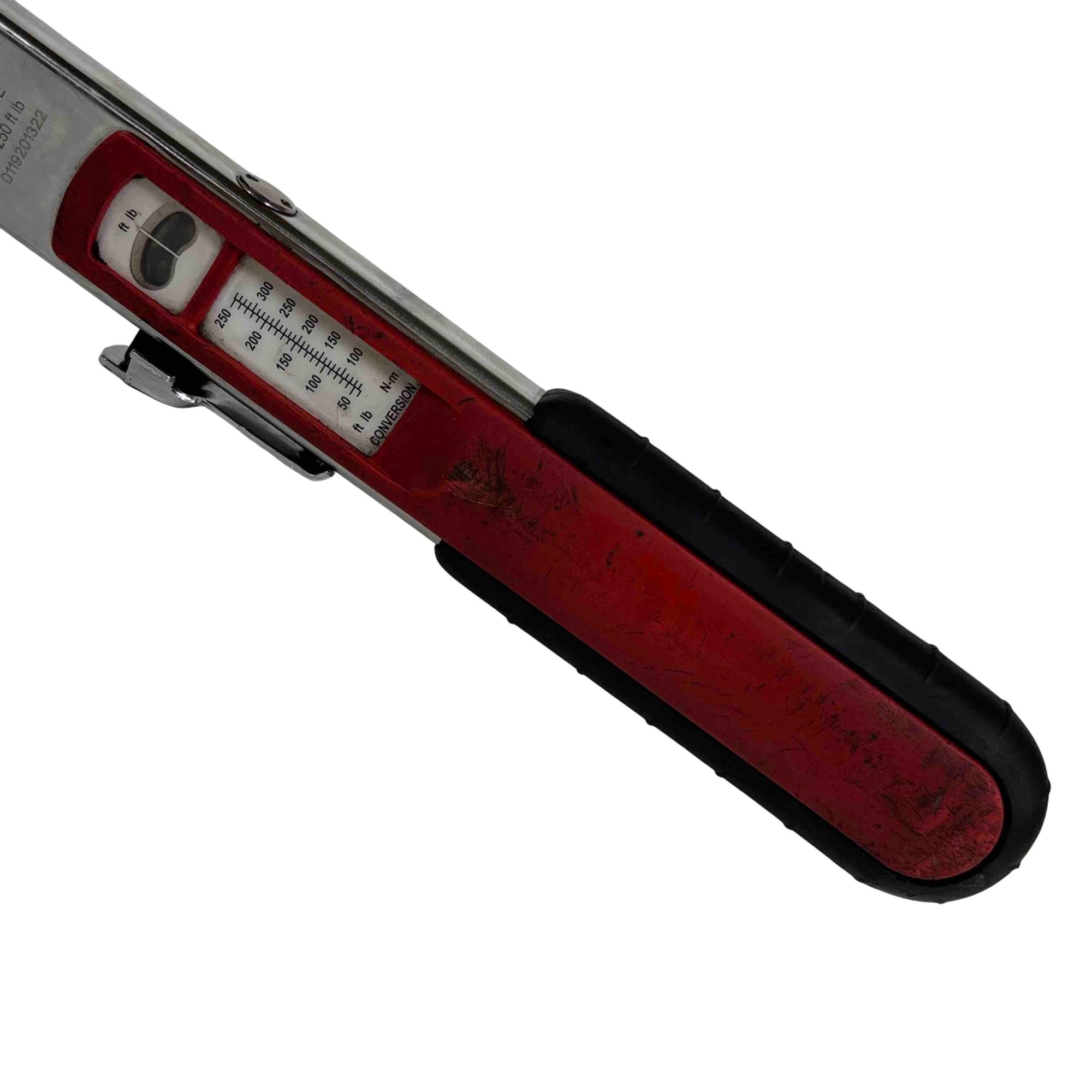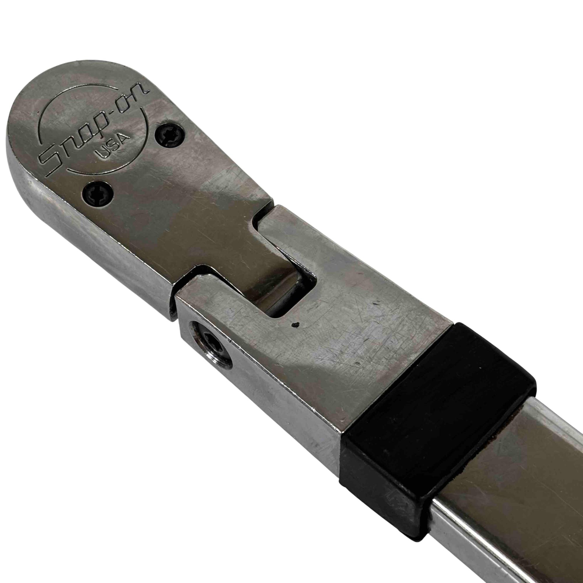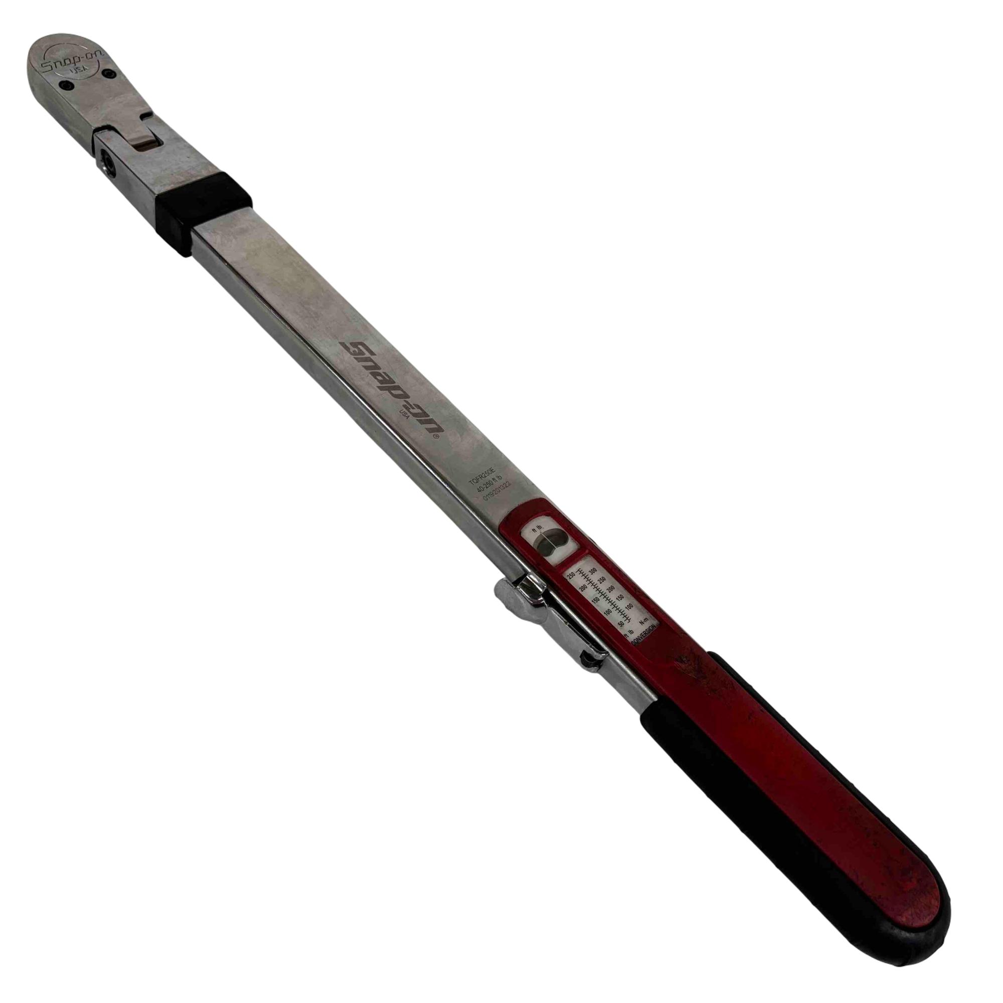 Features a torque range of 40-250 ft-lb and an accuracy of ±4% CW within 20-100% of full scale. It features a flex-head design with durable Snap-on ratchets that can flex up to 15° for better clearance. The wrench is designed for reliability and ease of use, with a 36-tooth sealed ratchet head that requires minimal maintenance and a thumb screw-type adjustment for quick setting changes. Additional features include a sealed neck to keep out debris, a cushion grip handle for comfort, and a unique split-beam measuring element that eliminates the need for a heavy coil spring, reducing wear and friction. The wrench is designed for clockwise torque measurement and includes safety features like a thumb guard and a conversion table displayed on the handle.