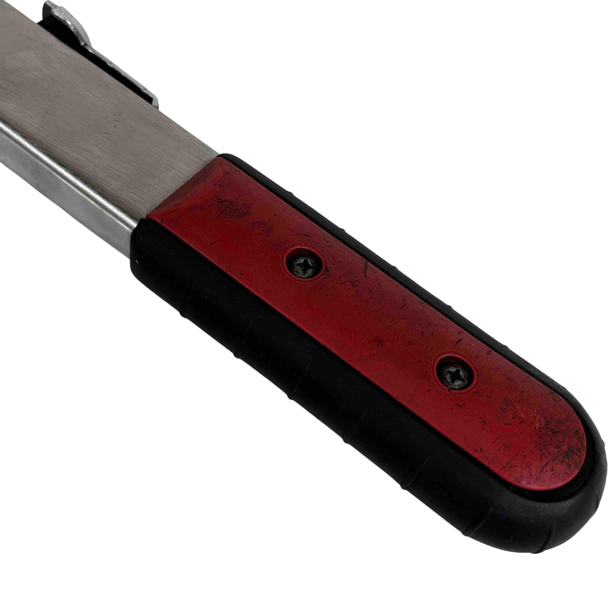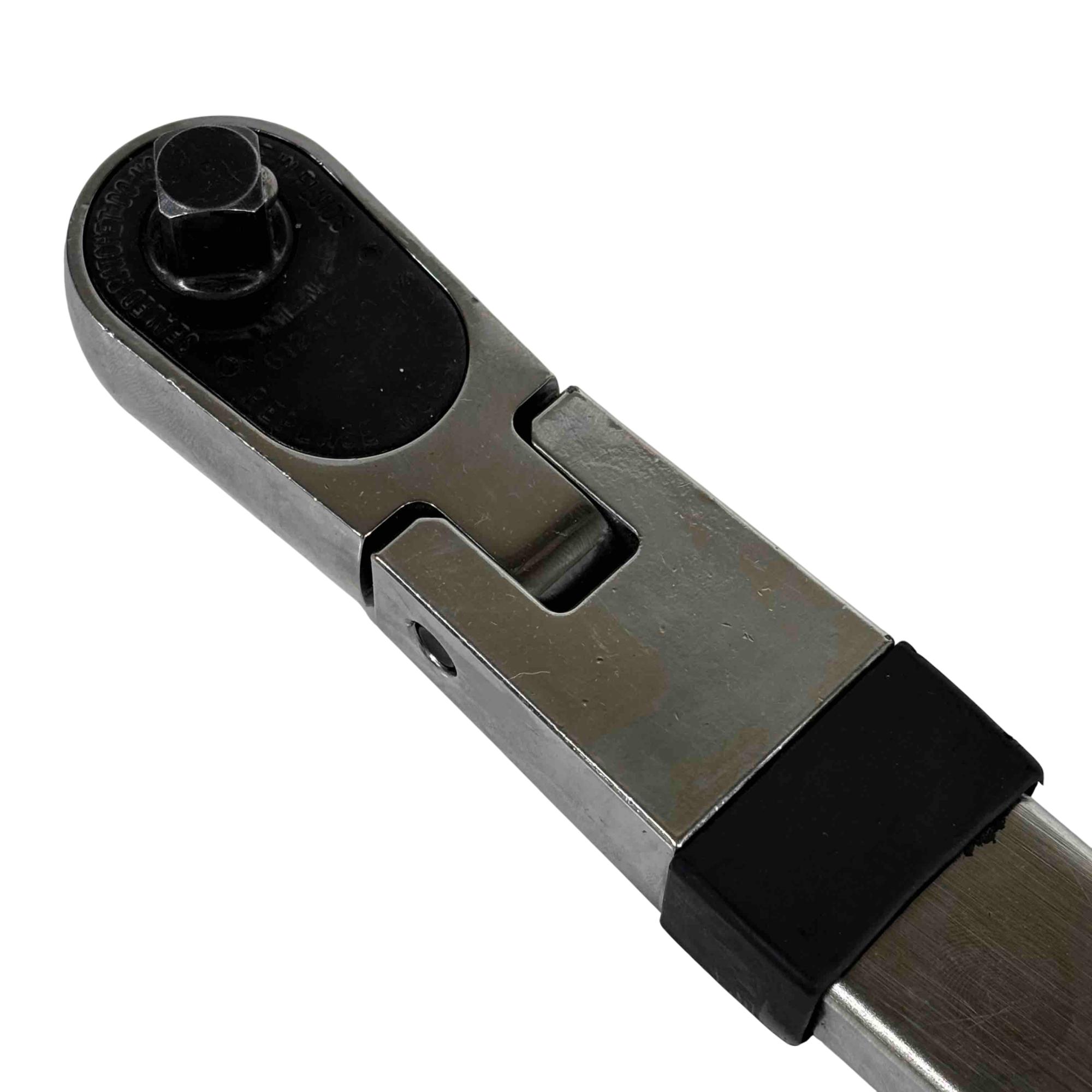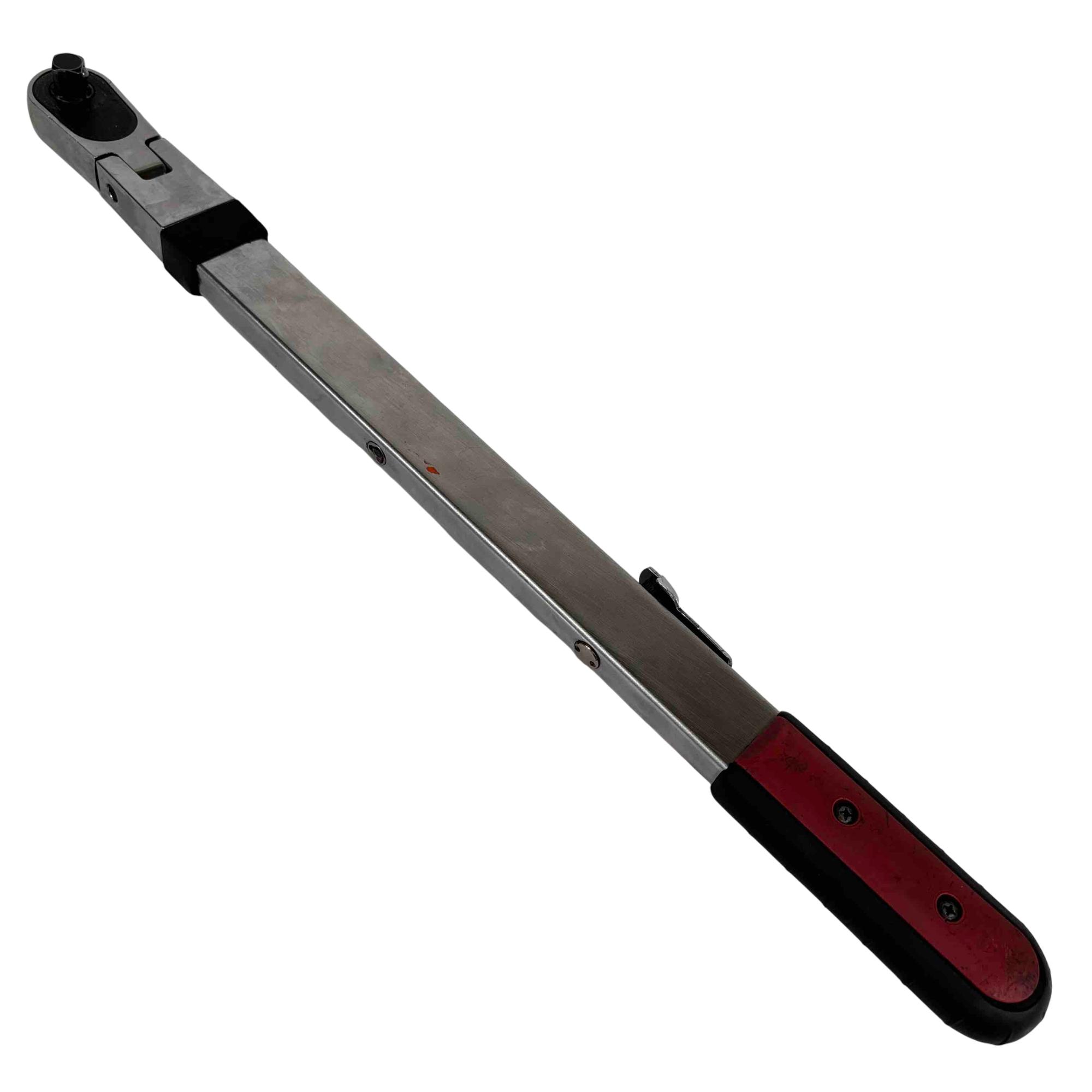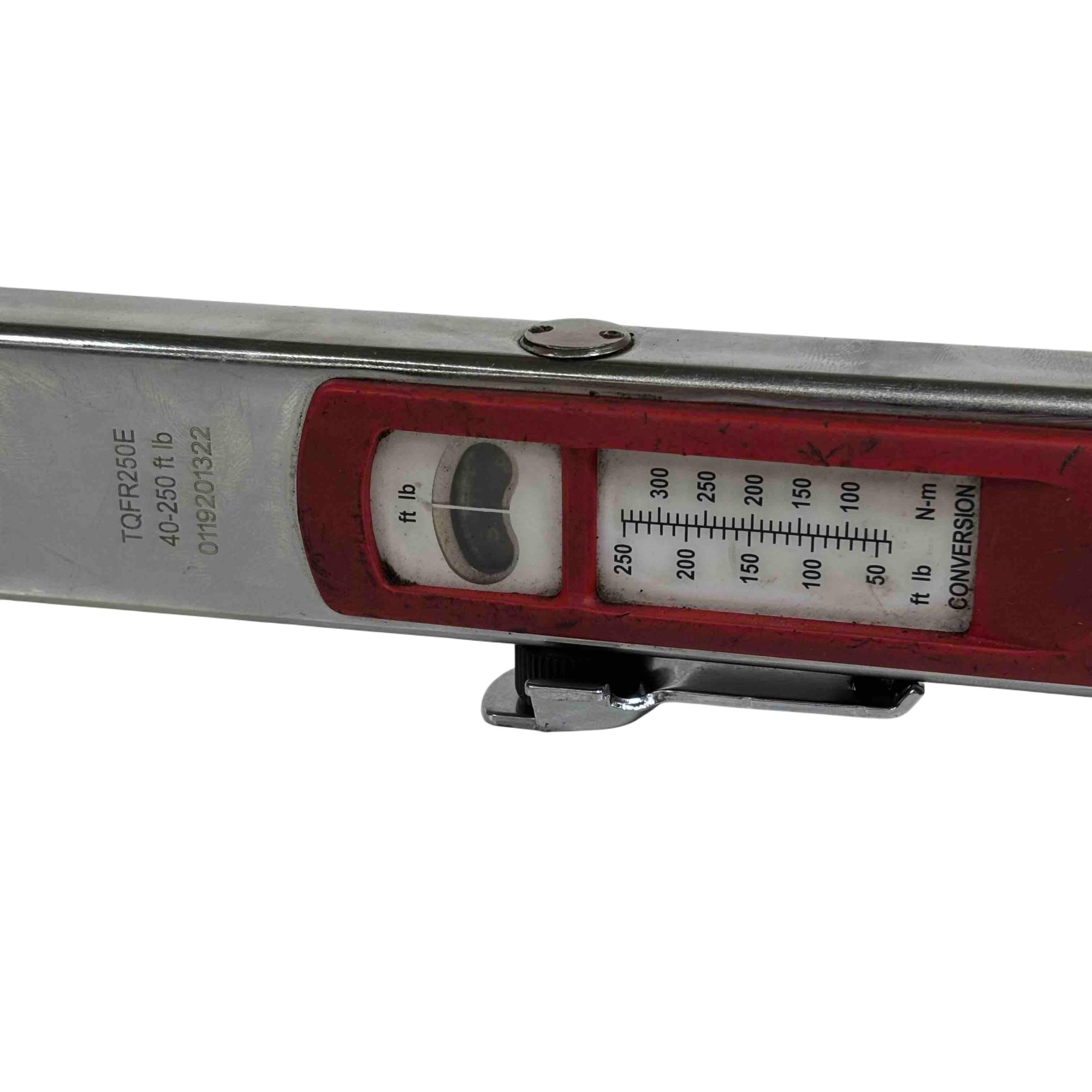 Features a torque range of 40-250 ft-lb and an accuracy of ±4% CW within 20-100% of full scale. It features a flex-head design with durable Snap-on ratchets that can flex up to 15° for better clearance. The wrench is designed for reliability and ease of use, with a 36-tooth sealed ratchet head that requires minimal maintenance and a thumb screw-type adjustment for quick setting changes. Additional features include a sealed neck to keep out debris, a cushion grip handle for comfort, and a unique split-beam measuring element that eliminates the need for a heavy coil spring, reducing wear and friction. The wrench is designed for clockwise torque measurement and includes safety features like a thumb guard and a conversion table displayed on the handle.