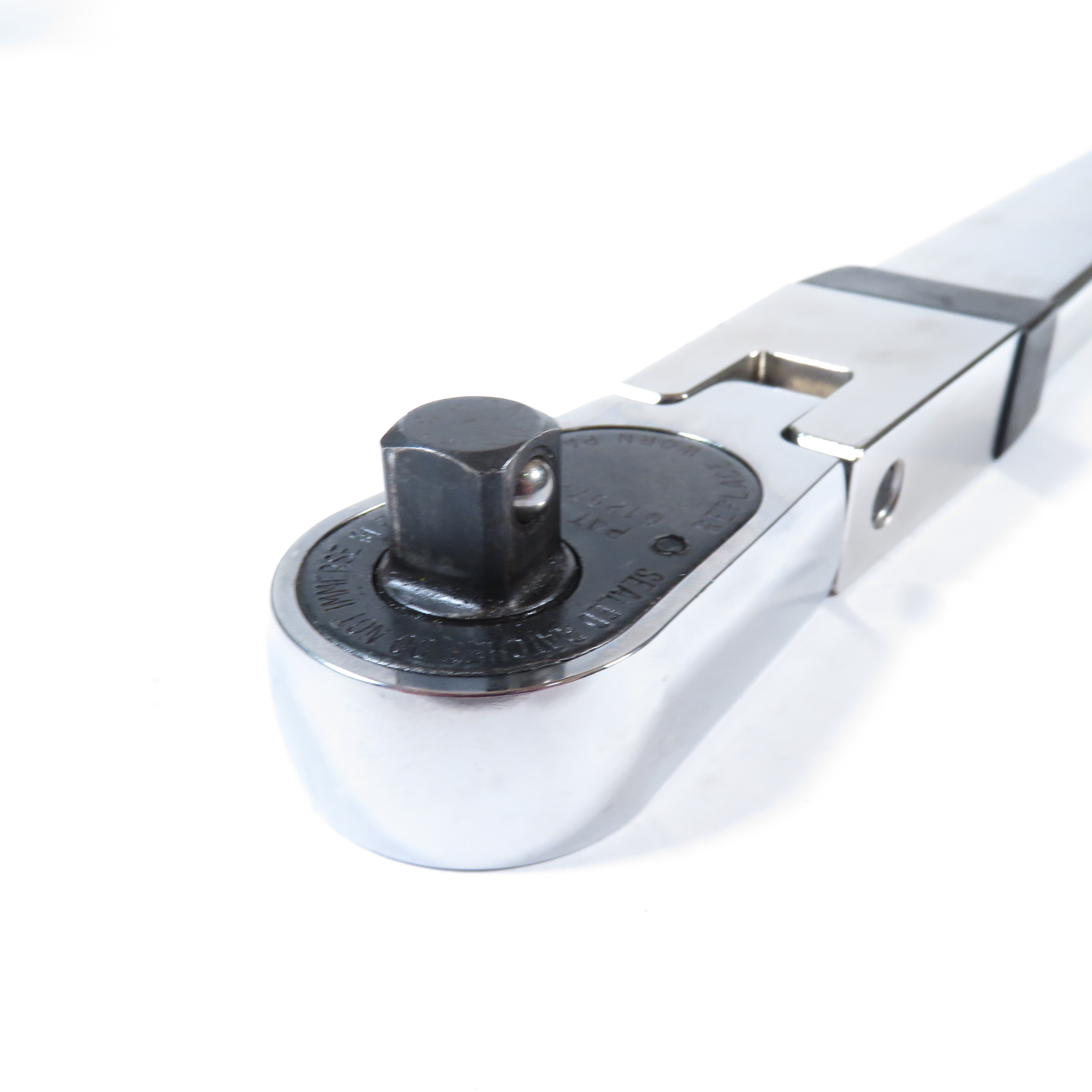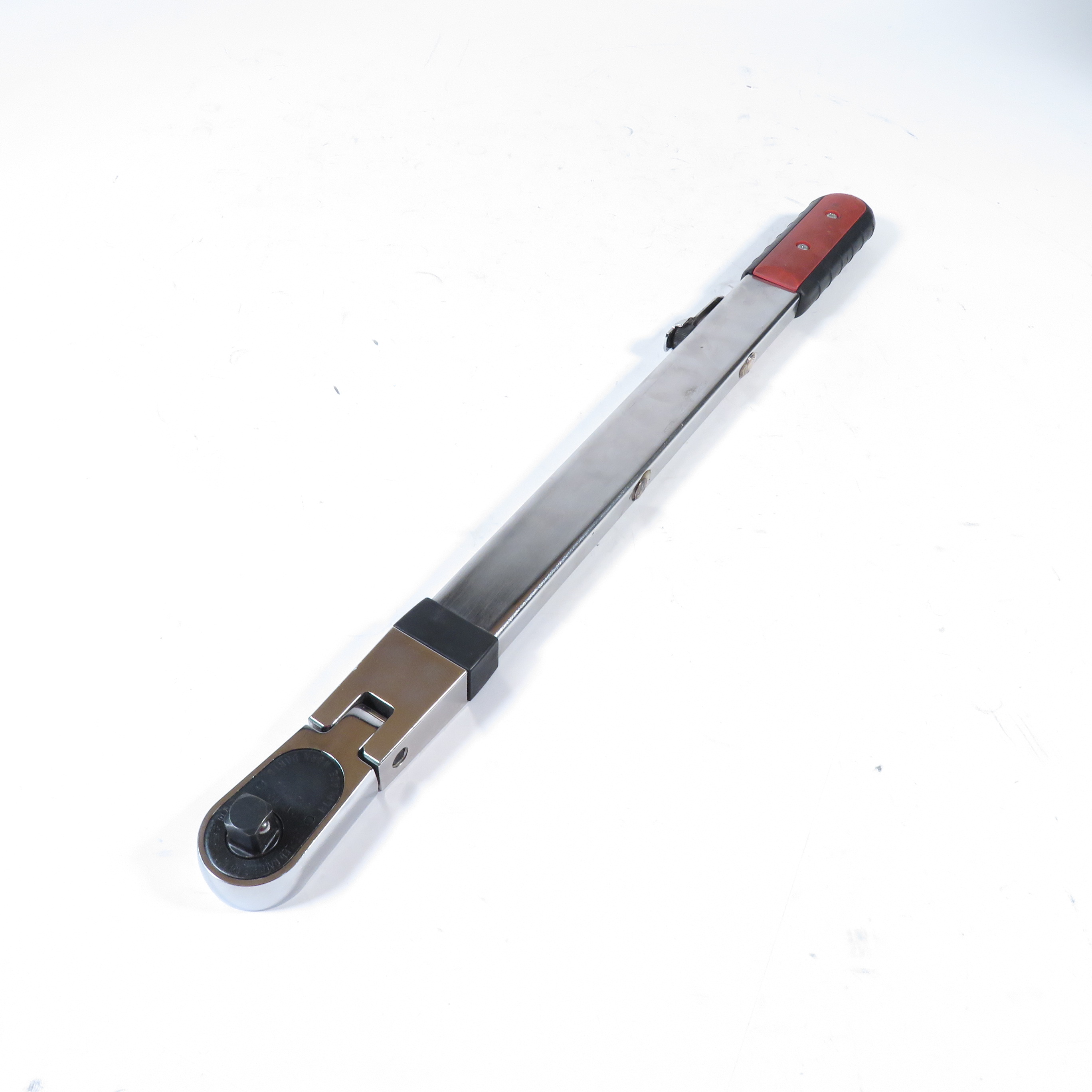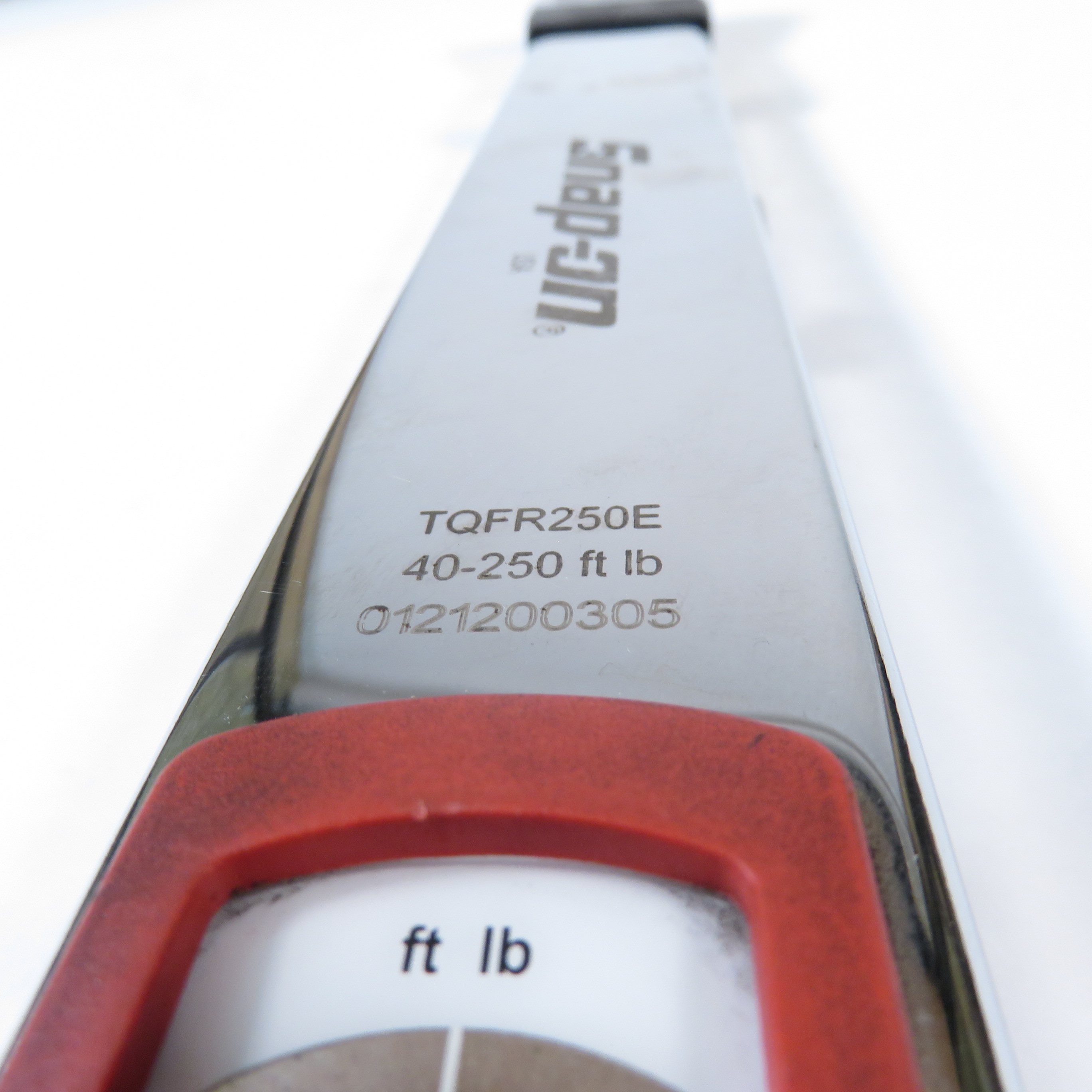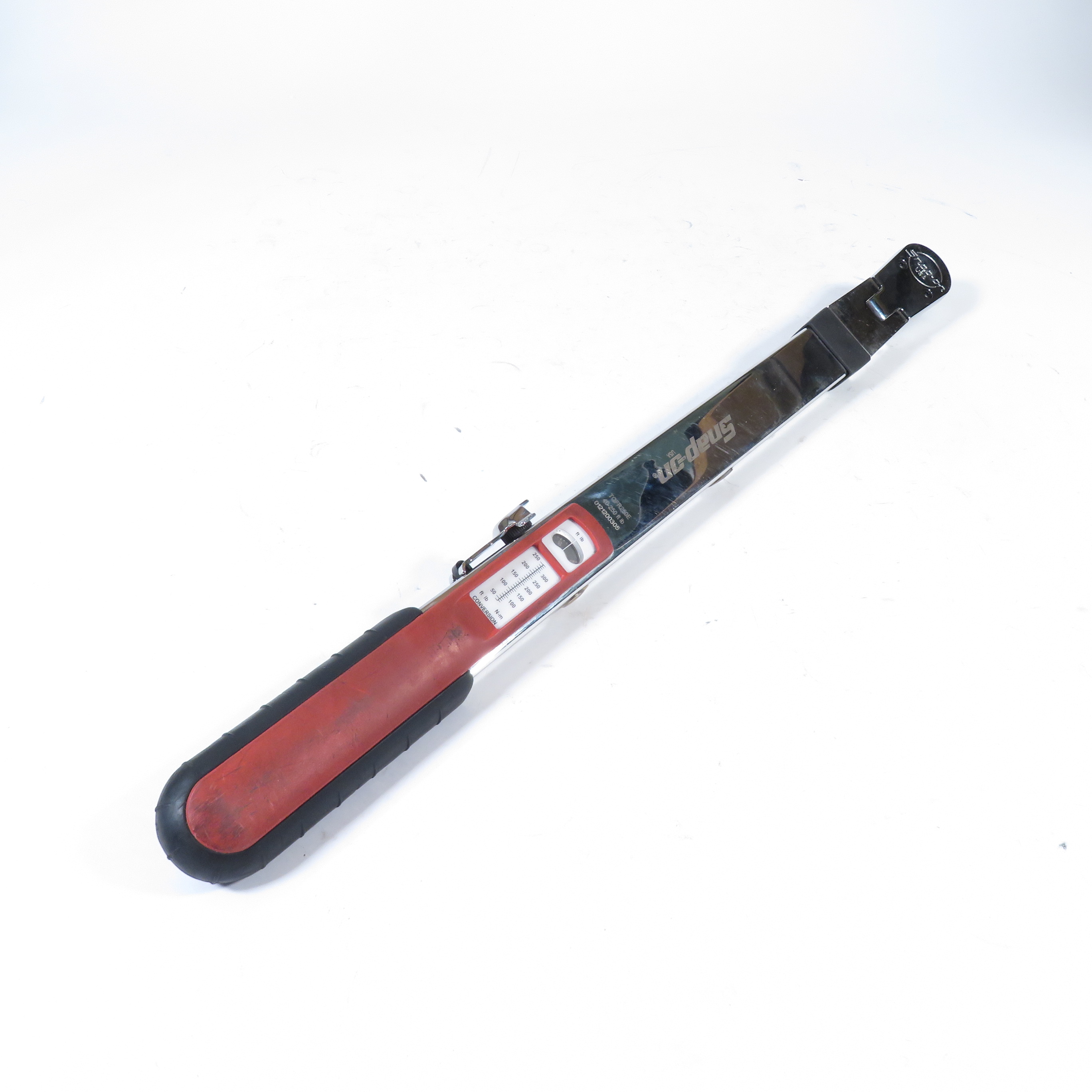 Features a torque range of 40-250 ft-lb and an accuracy of ±4% CW within 20-100% of full scale. It features a flex-head design with durable Snap-on ratchets that can flex up to 15° for better clearance. The wrench is designed for reliability and ease of use, with a 36-tooth sealed ratchet head that requires minimal maintenance and a thumb screw-type adjustment for quick setting changes. Additional features include a sealed neck to keep out debris, a cushion grip handle for comfort, and a unique split-beam measuring element that eliminates the need for a heavy coil spring, reducing wear and friction. The wrench is designed for clockwise torque measurement and includes safety features like a thumb guard and a conversion table displayed on the handle.
