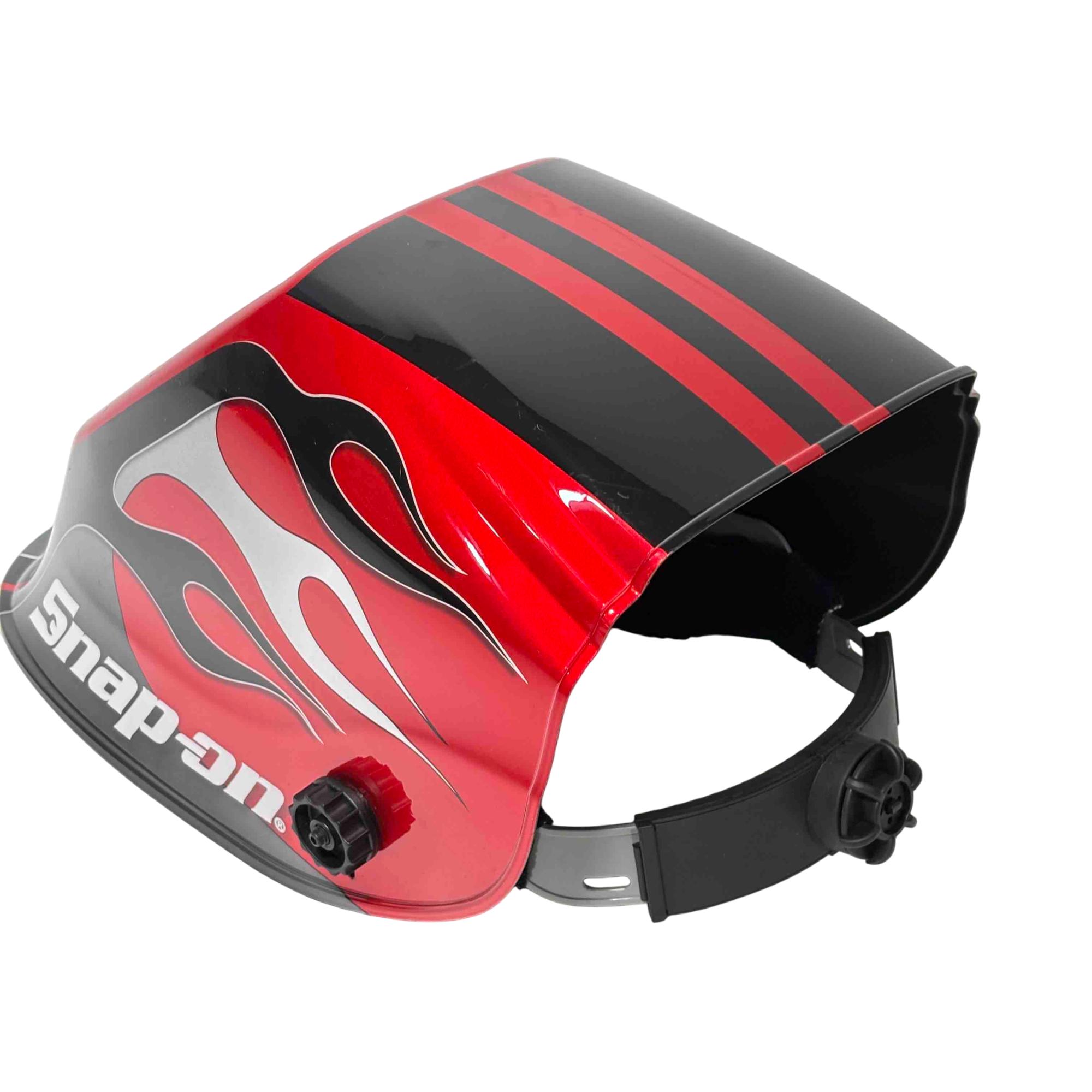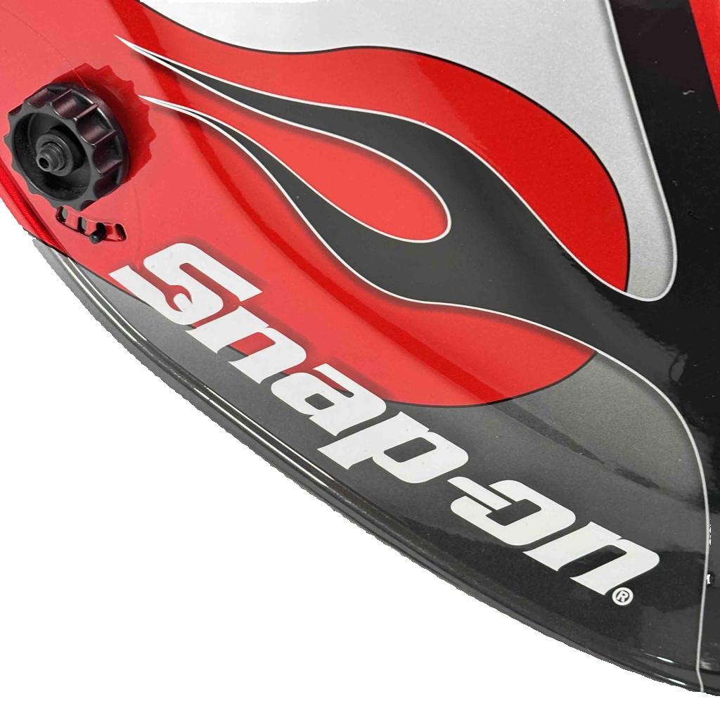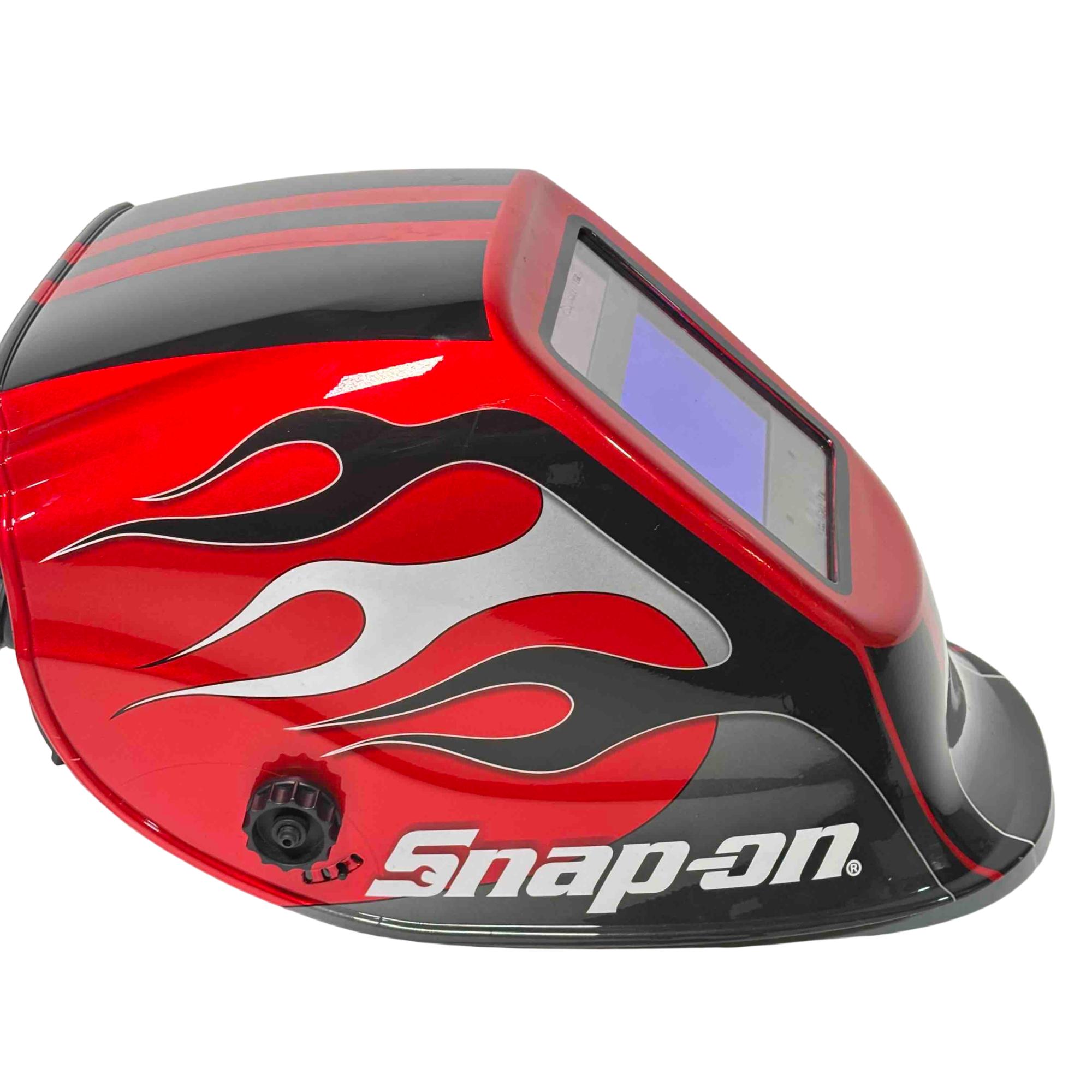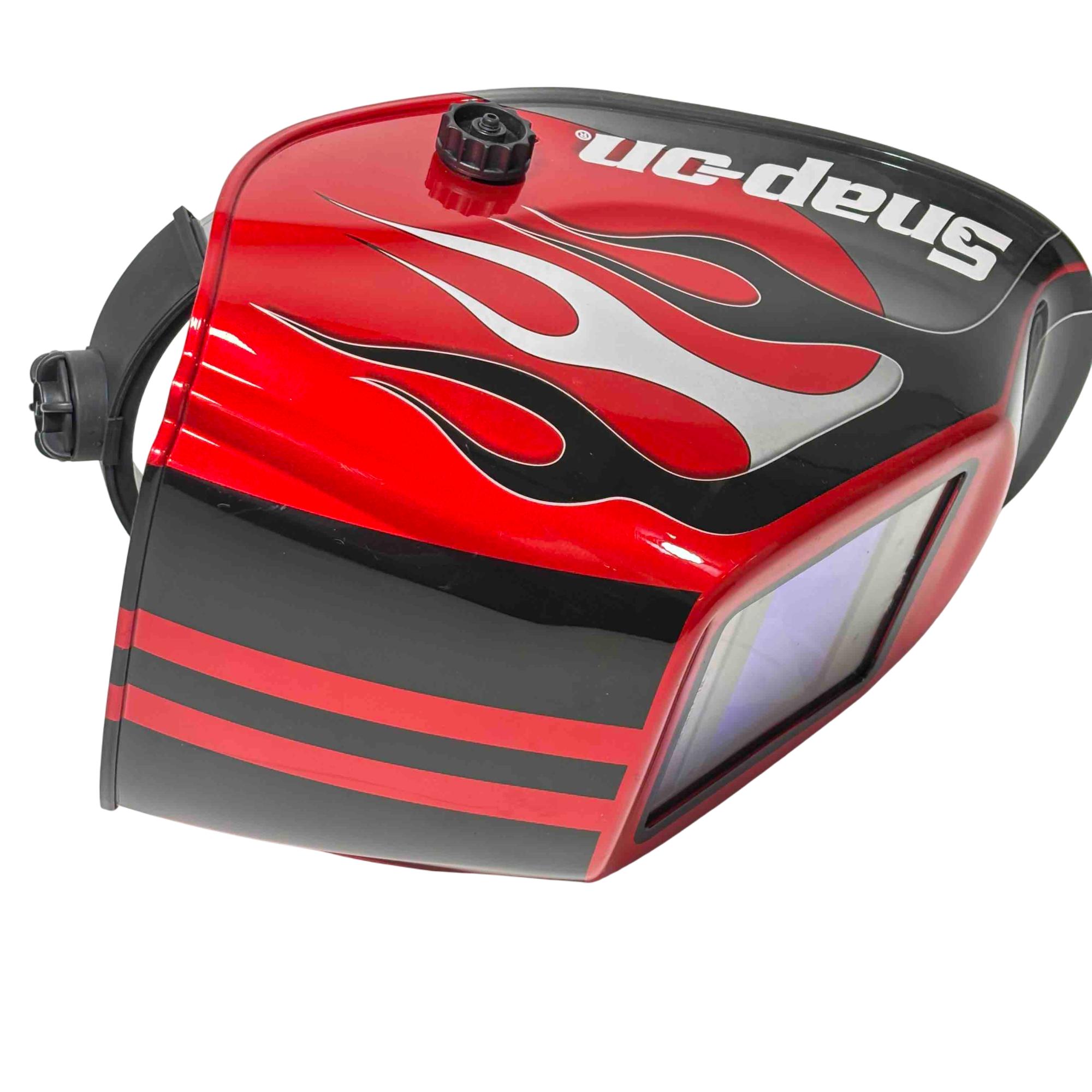 Protect your eyes and face with the Snap-on Tools YA4601 Auto-Darkening Welding Helmet. Featuring a striking red and black flame design, this helmet ensures optimal safety and style for welding enthusiasts. With its reliable auto-darkening feature, you can focus on your welding tasks without compromising on protection.