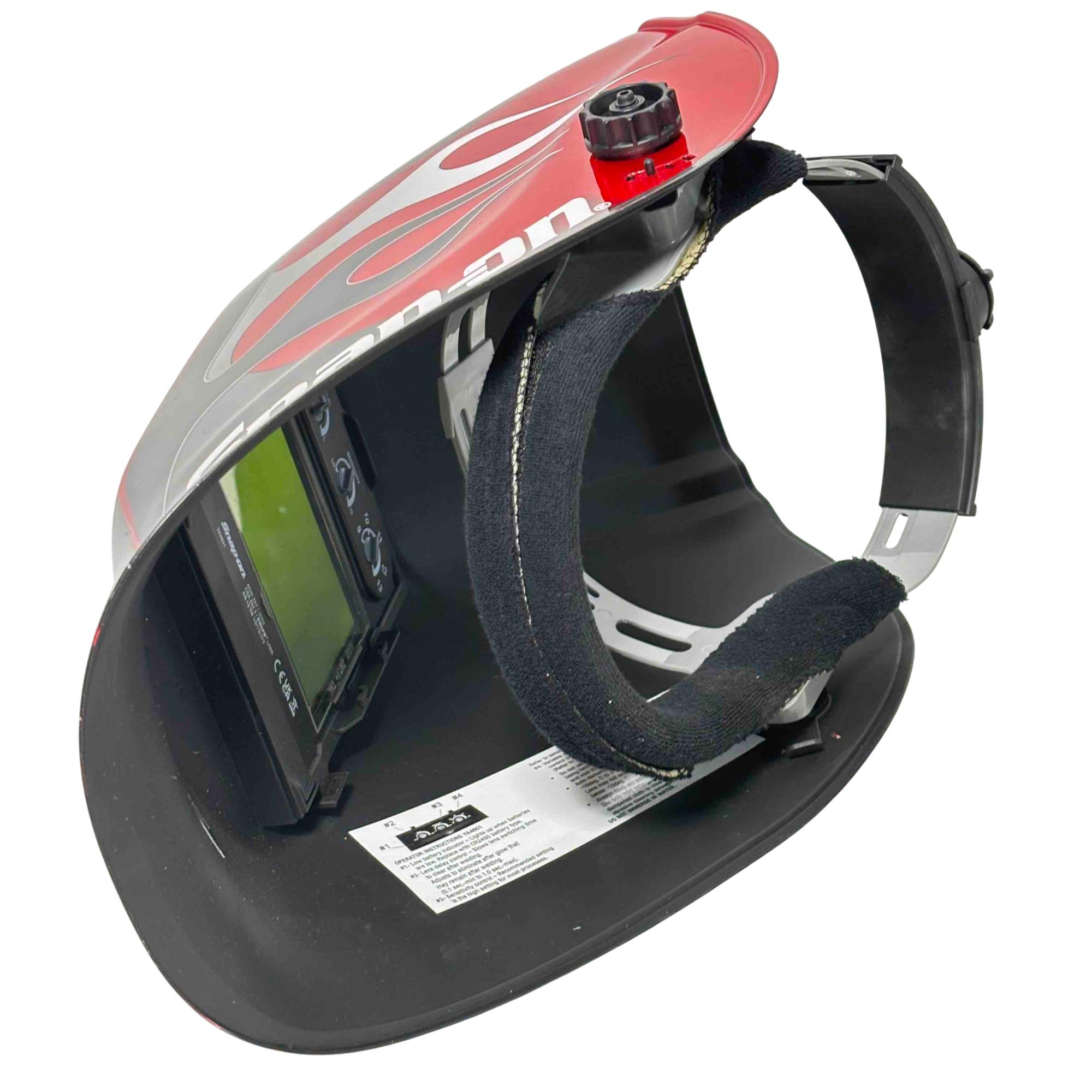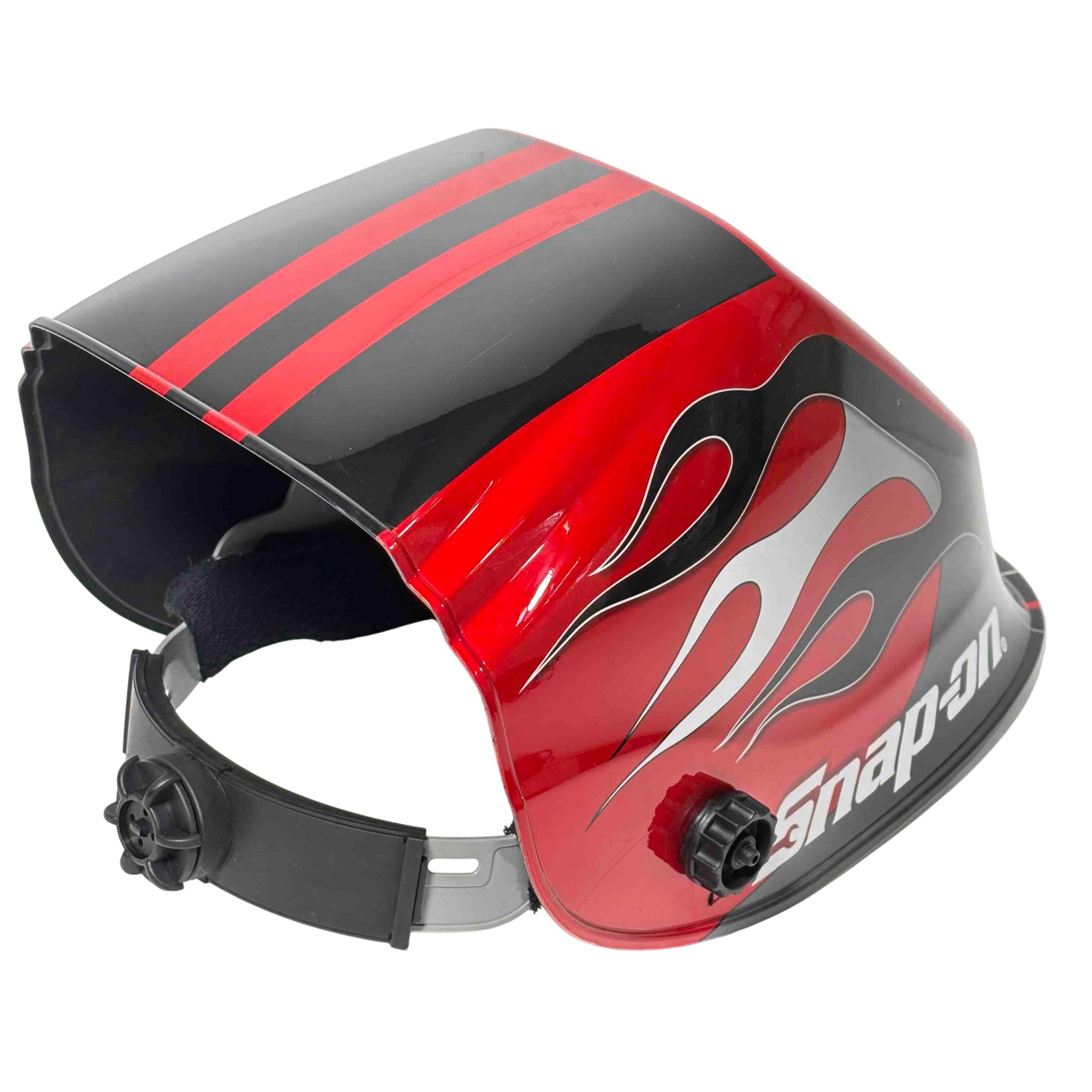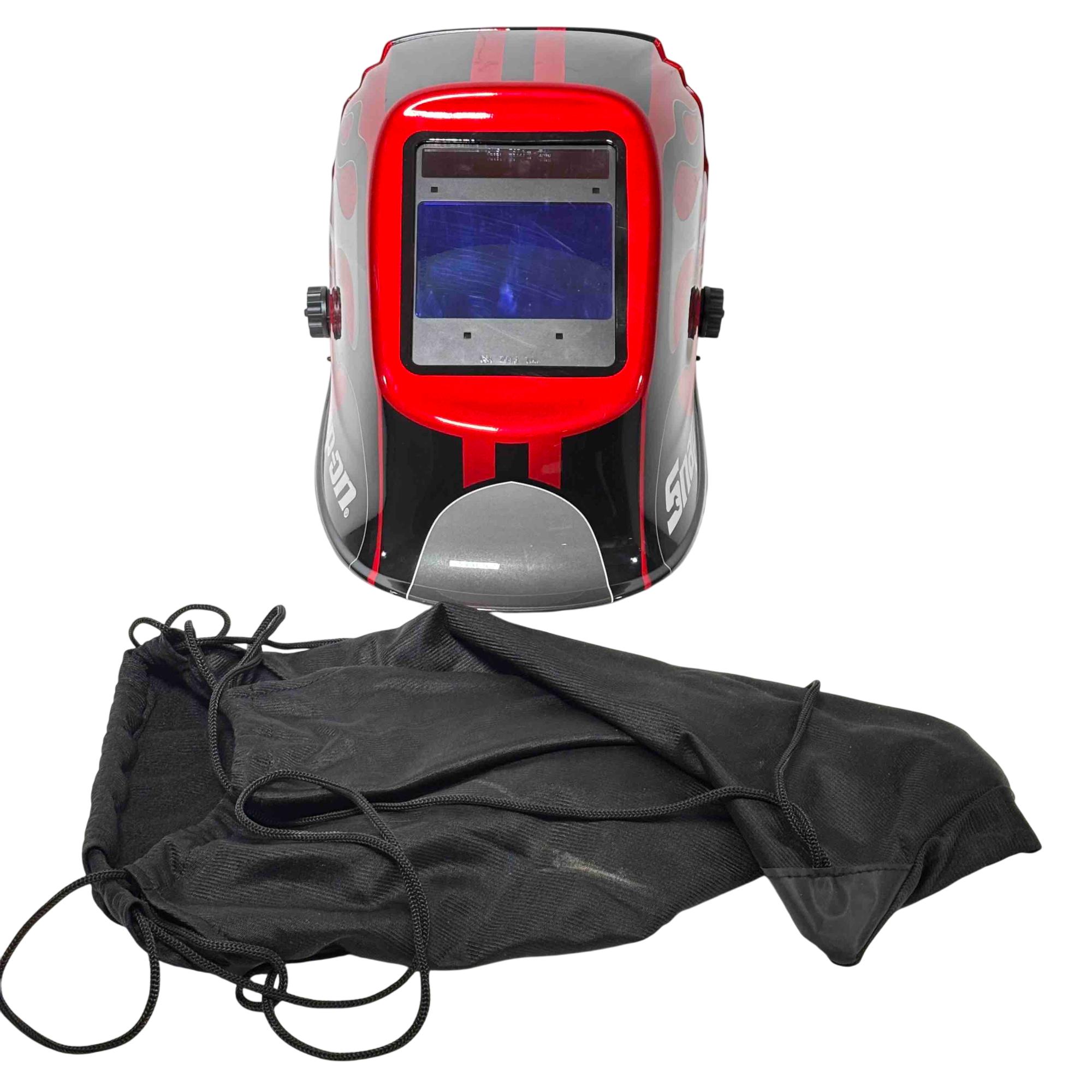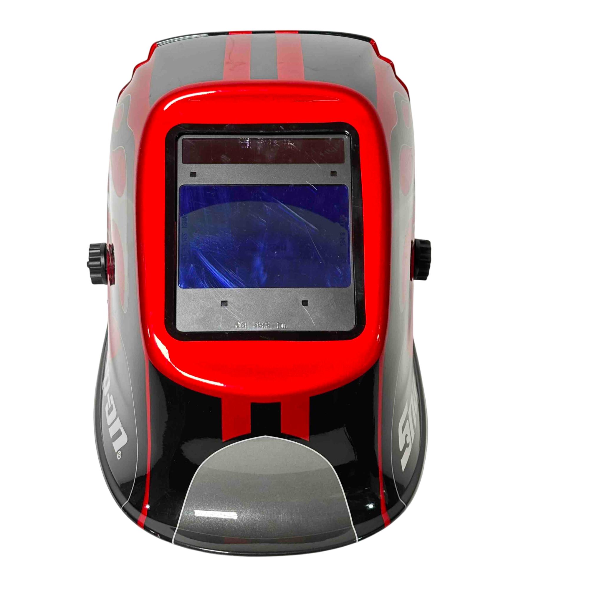 Protect your eyes and face with the Snap-on Tools YA4601 Auto-Darkening Welding Helmet. Featuring a striking red and black flame design, this helmet ensures optimal safety and style for welding enthusiasts. With its reliable auto-darkening feature, you can focus on your welding tasks without compromising on protection.