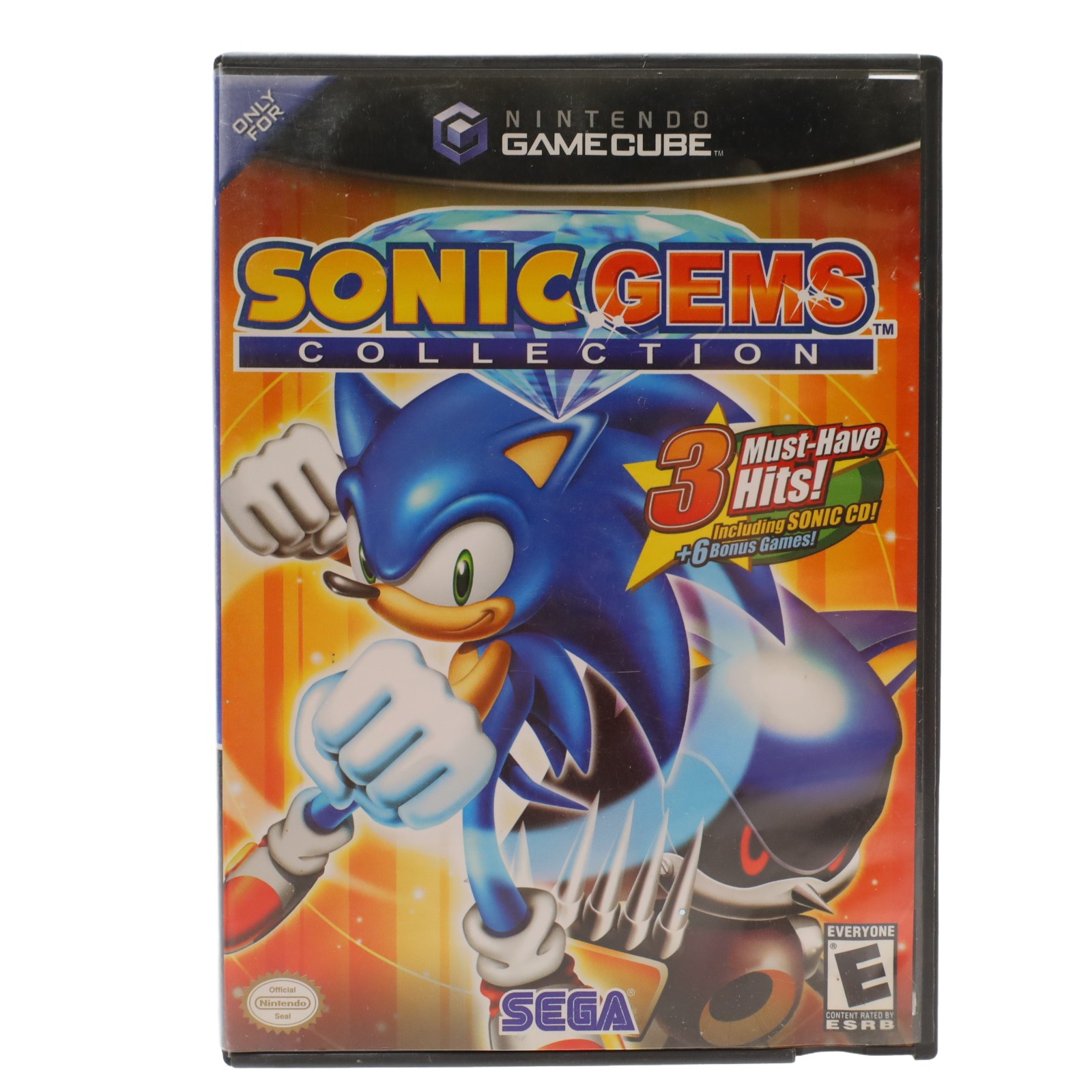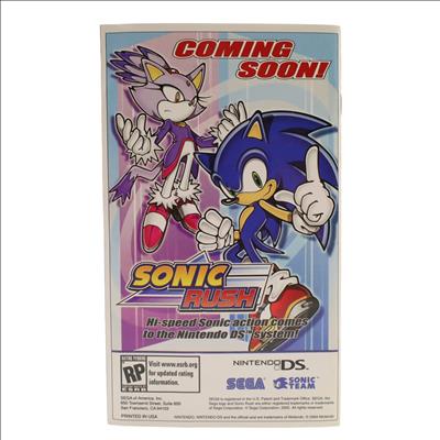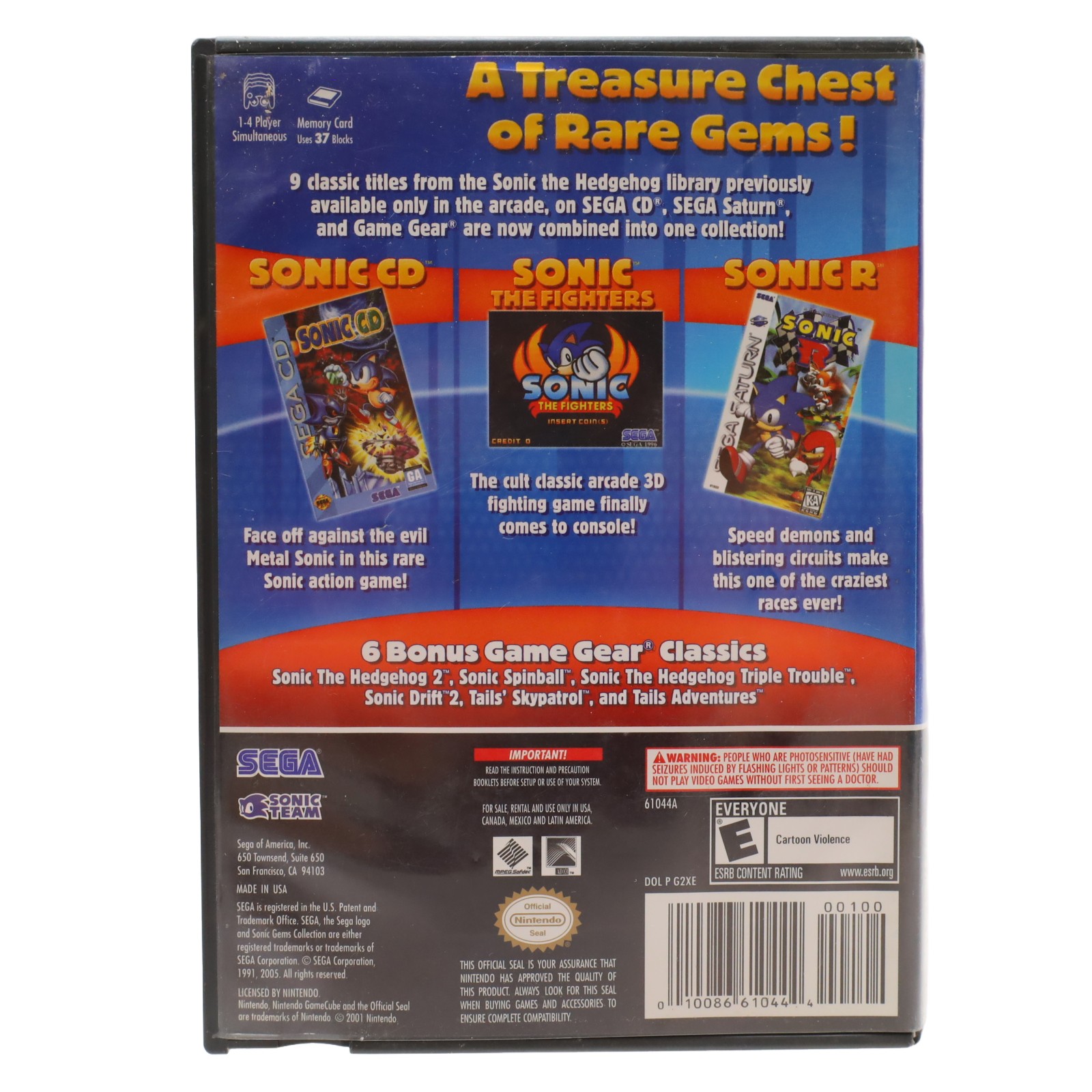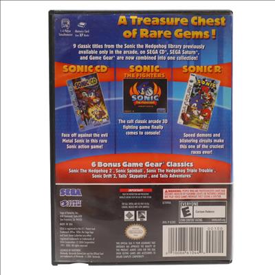 Features a selection of video games originally published by Sega for systems including the Sega CD, Sega Saturn, and Game Gear. The collection primarily includes titles from the Sonic the Hedgehog series such as Sonic CD, Sonic the Fighters, Sonic R, and various Game Gear entries, along with unlockable Vectorman games. Certain titles available only in the Japanese version include Bonanza Bros. and the Streets of Rage trilogy. Users can view scans of the original instruction manuals for each game, along with hints and cheat codes, and some games run at a higher frame rate than the initial release. The package contains content encompassing platforming, fighting, racing, pinball, and puzzle genres.