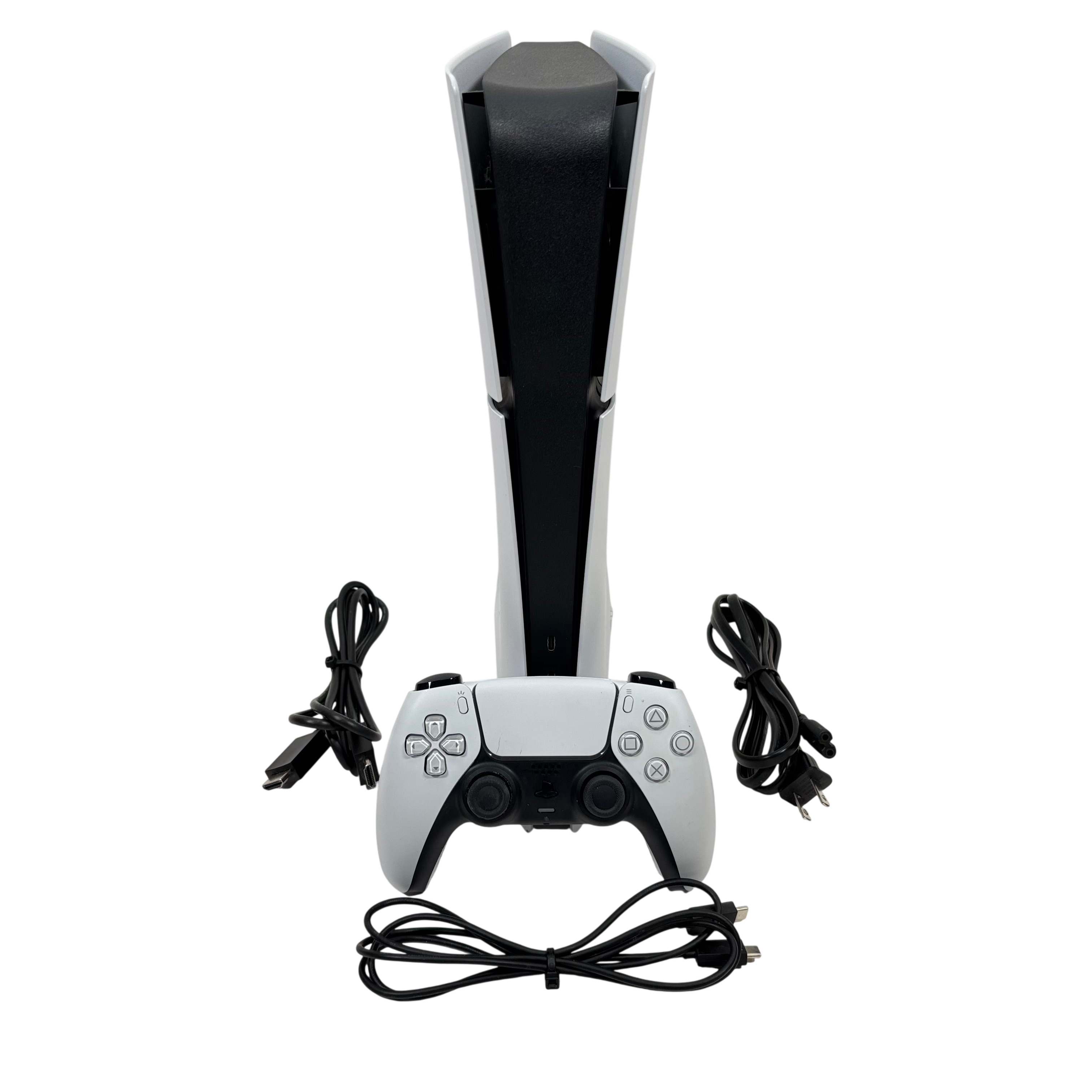 Sony PlayStation 5 Slim Console delivers next-generation gaming performance with support for 4K resolution and fast load times. This set includes the sleek white and black console along with a DualSense wireless controller, power cable, HDMI cable, and USB charging cable. Designed for worldwide use, it operates on 100-240V power and consumes up to 350W. Ideal for gamers seeking immersive gameplay and advanced features in a stylish form factor.