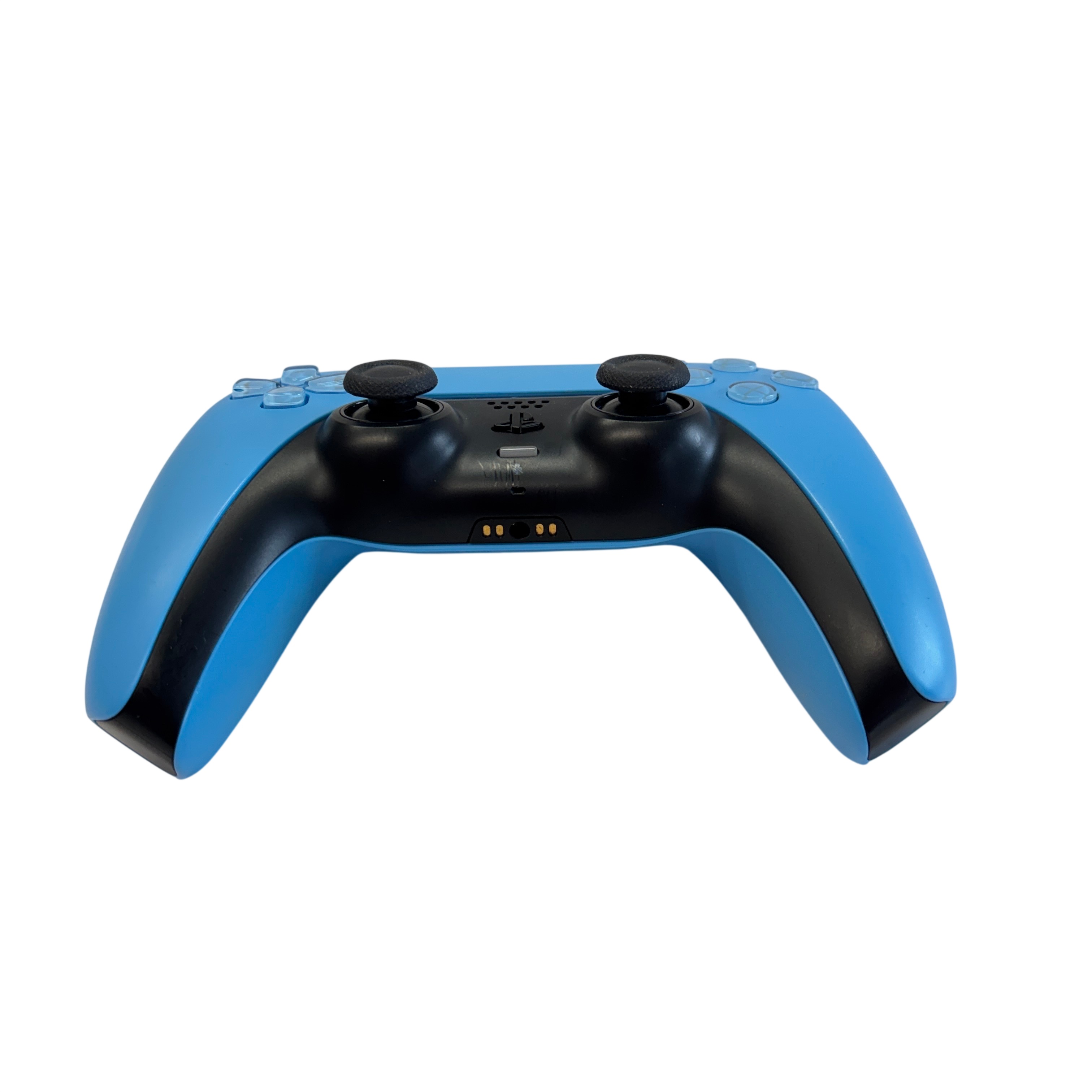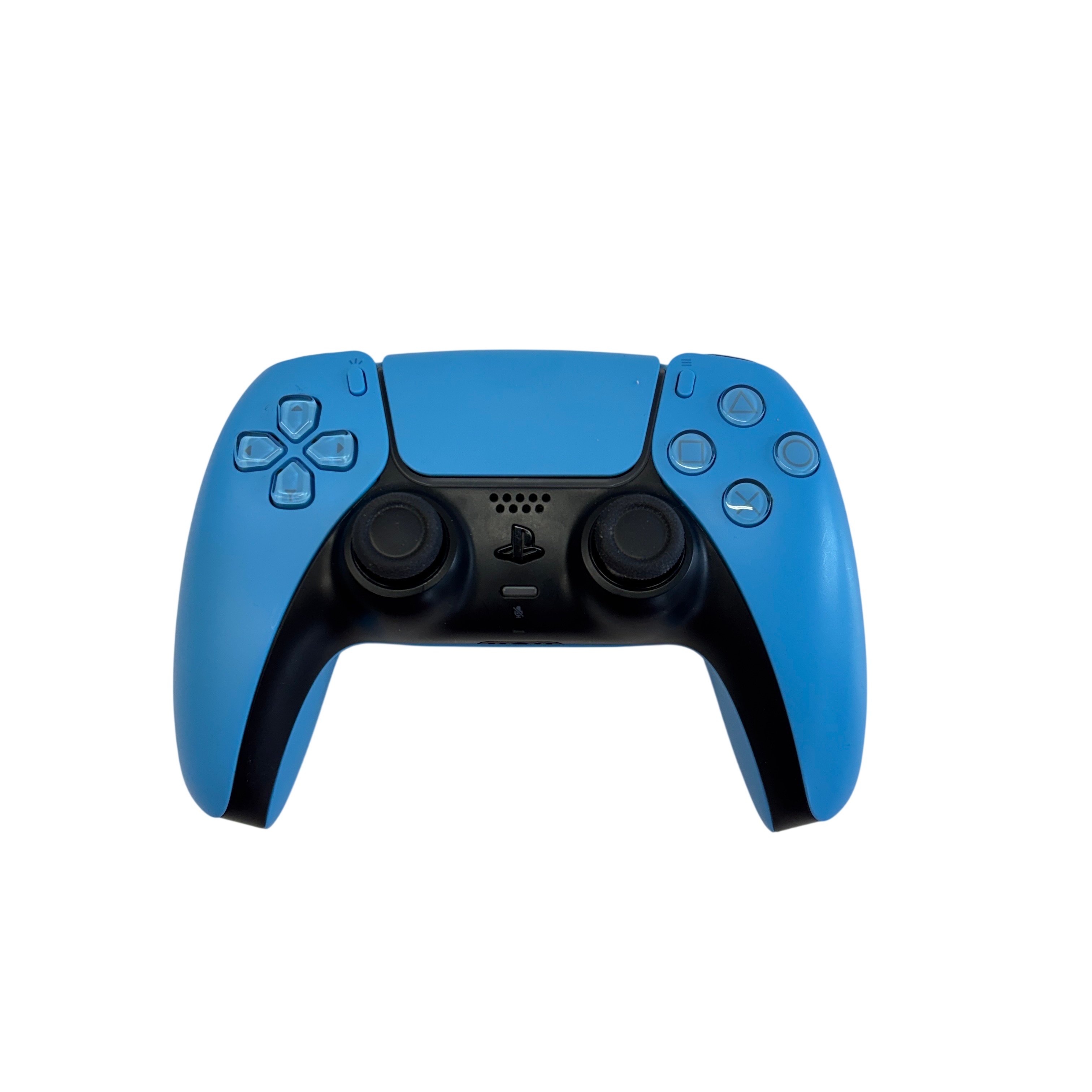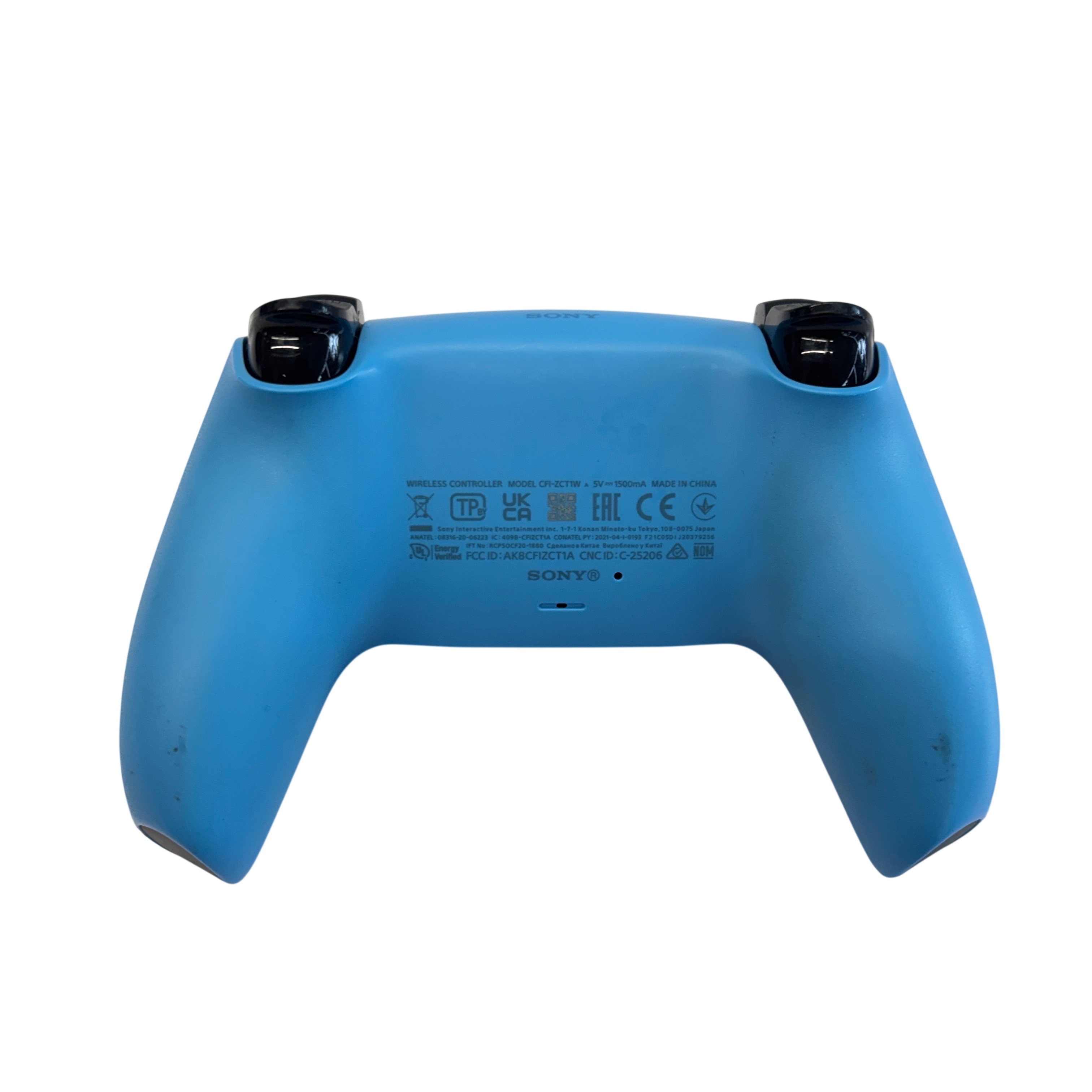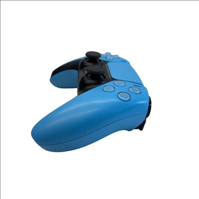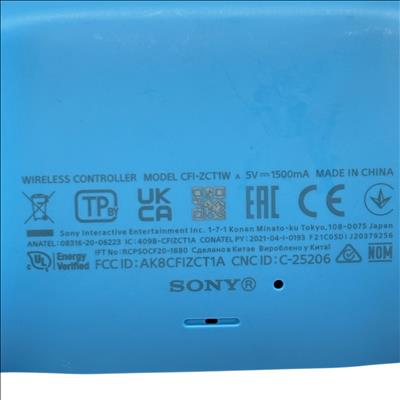 Sony PlayStation 5 DualSense Wireless Controller (Model CFI-ZCT1W) in blue and black offers an immersive gaming experience with wireless connectivity and advanced haptic feedback. Powered via 5V 1500mA input, this ergonomic controller features adaptive triggers, a built-in microphone, and speaker for enhanced gameplay interaction. Compatible with the PlayStation 5 console, it provides precise control and comfort for extended gaming sessions. The controller shows light signs of use but remains fully functional and ready to elevate your gaming setup.